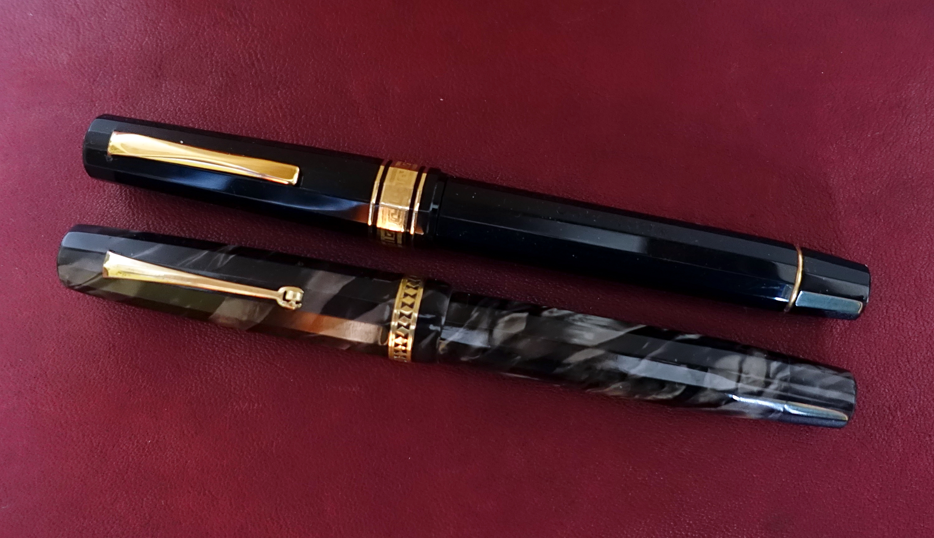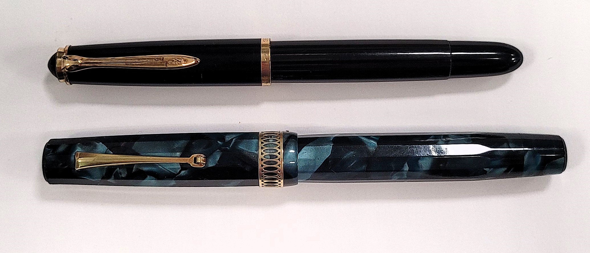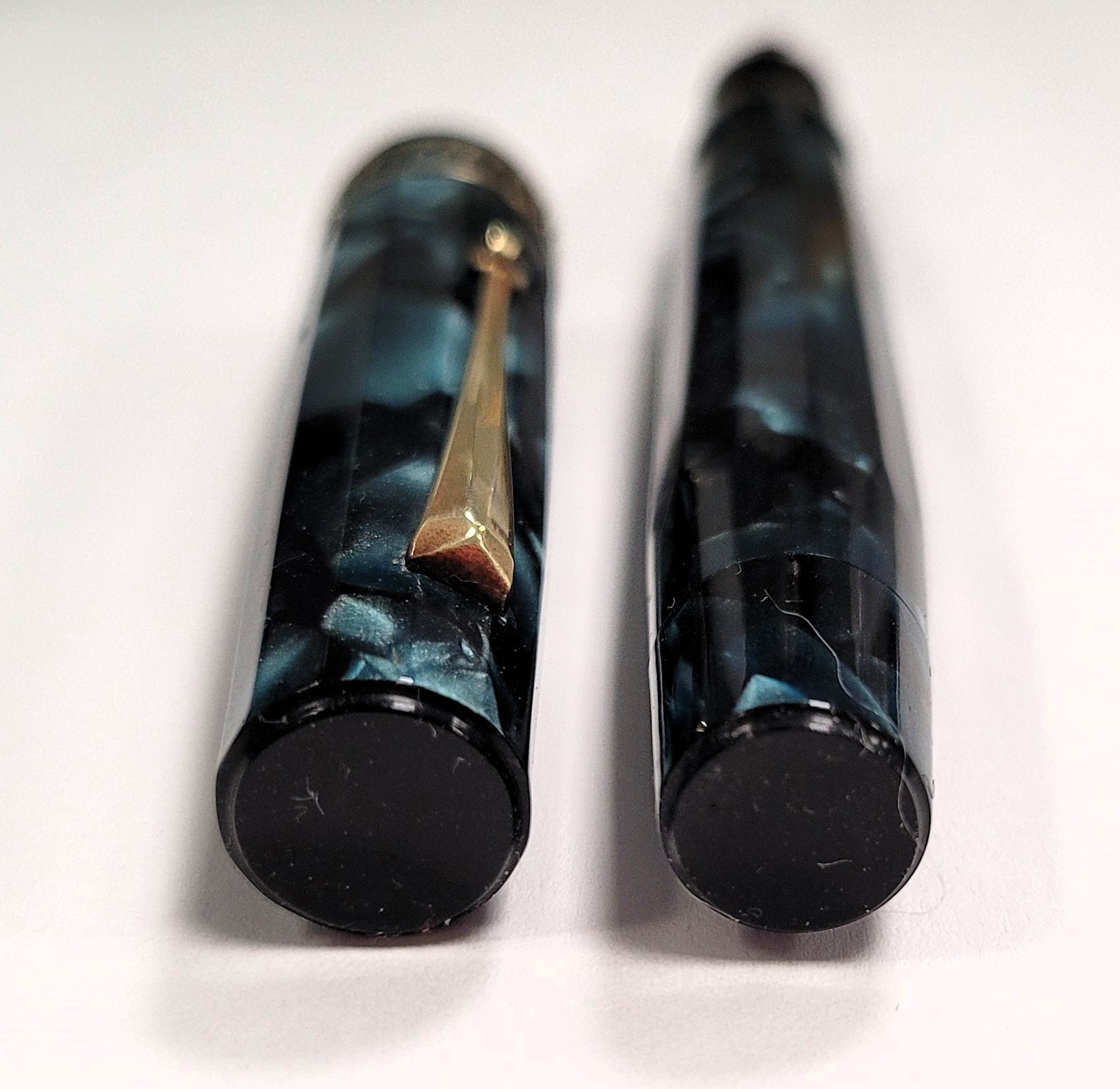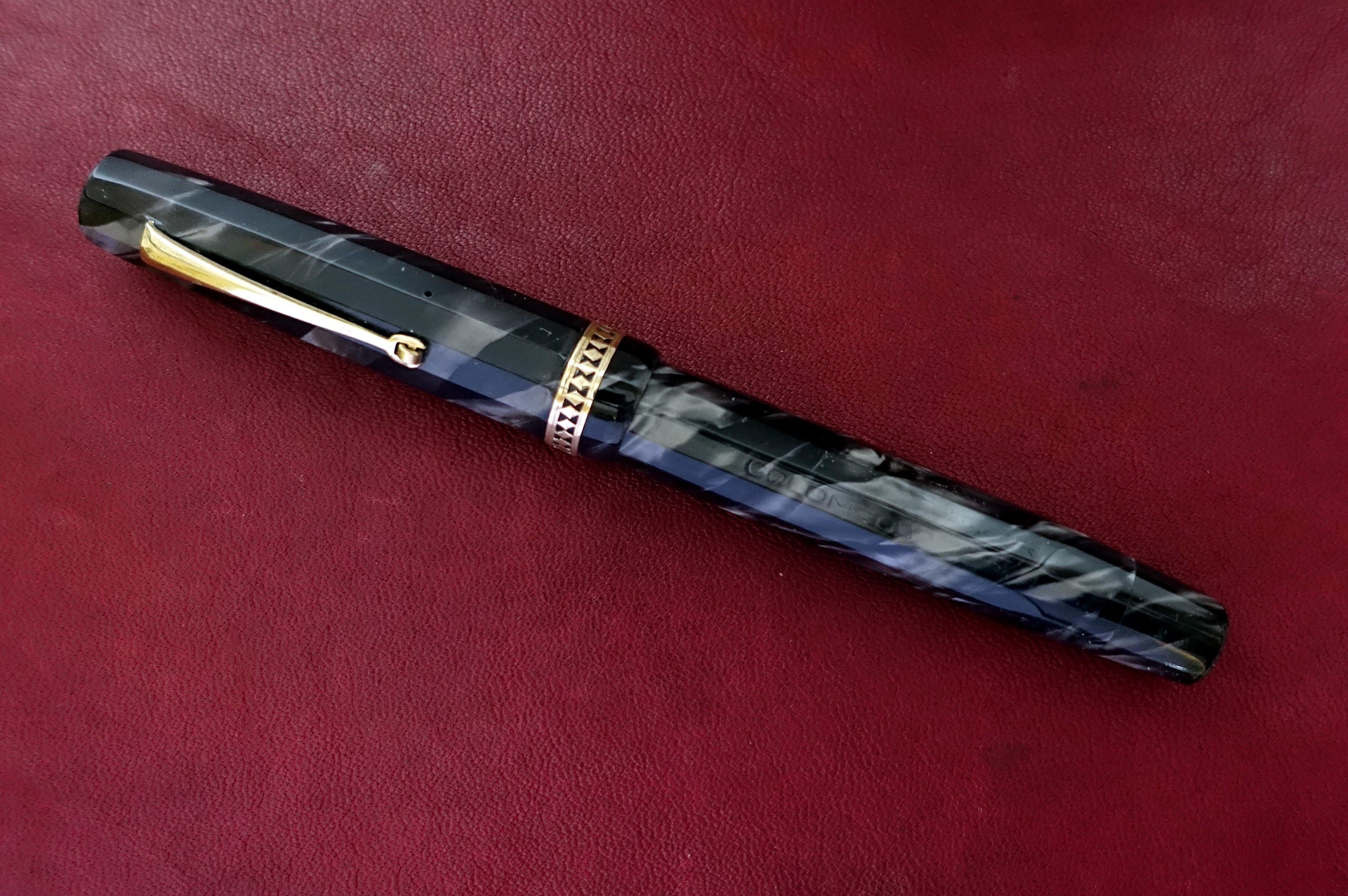vi presento la mia ultima acquisizione, una stilografica di un marchio poco conosciuto: Blach Star Ma come riportato nel titolo è Blach o Black? Con la H o con la K? Ardua sentenza. La cosa strana di questa penna è che sul fusto vi sia incisa la scritta “BLACK STAR” seguita da una stella mentre sul pennino è riportato BLACH STAR, forse a quei tempi avevano un po’ le idee confuse? Dubito siano due marche distinte e che il pennino sia stato sostituito per “assonanza” o pensando fossero della stessa marca. BLACH STAR è stato sicuramente un produttore “minore” italiano di penne stilografiche di fascia medio bassa che, forse, in qualche sporadico caso si concedeva qualche velleità realizzando modelli più curati. Questo in particolare potrebbe essere datato intorno agli anni ’30 tenendo in considerazione la forma “flat-top”, il sistema di caricamento a pulsante e l’alimentatore bombato liscio. Penna di taglia Senior è lunga 14 cm chiusa e 12 cm senza cappuccio è in celluloide sfaccettata dodecagonale ricavata da fogli sovrapposti molto bella, marmorizzata azzurro/blu scuro con le due estremità, cappuccio e tappino che nasconde il pulsante di carica, che terminano a sezione circolare chiuse da due tappini sottili in ebanite nera. Molto elegante la veretta del cappuccio di forma circolare, non dodecagonale, e di generose dimensioni realizzata con un motivo ellittico in stile art-decò sicuramente copiato da altri modelli dell’epoca. La clip invece è liscia a ruzzolina.