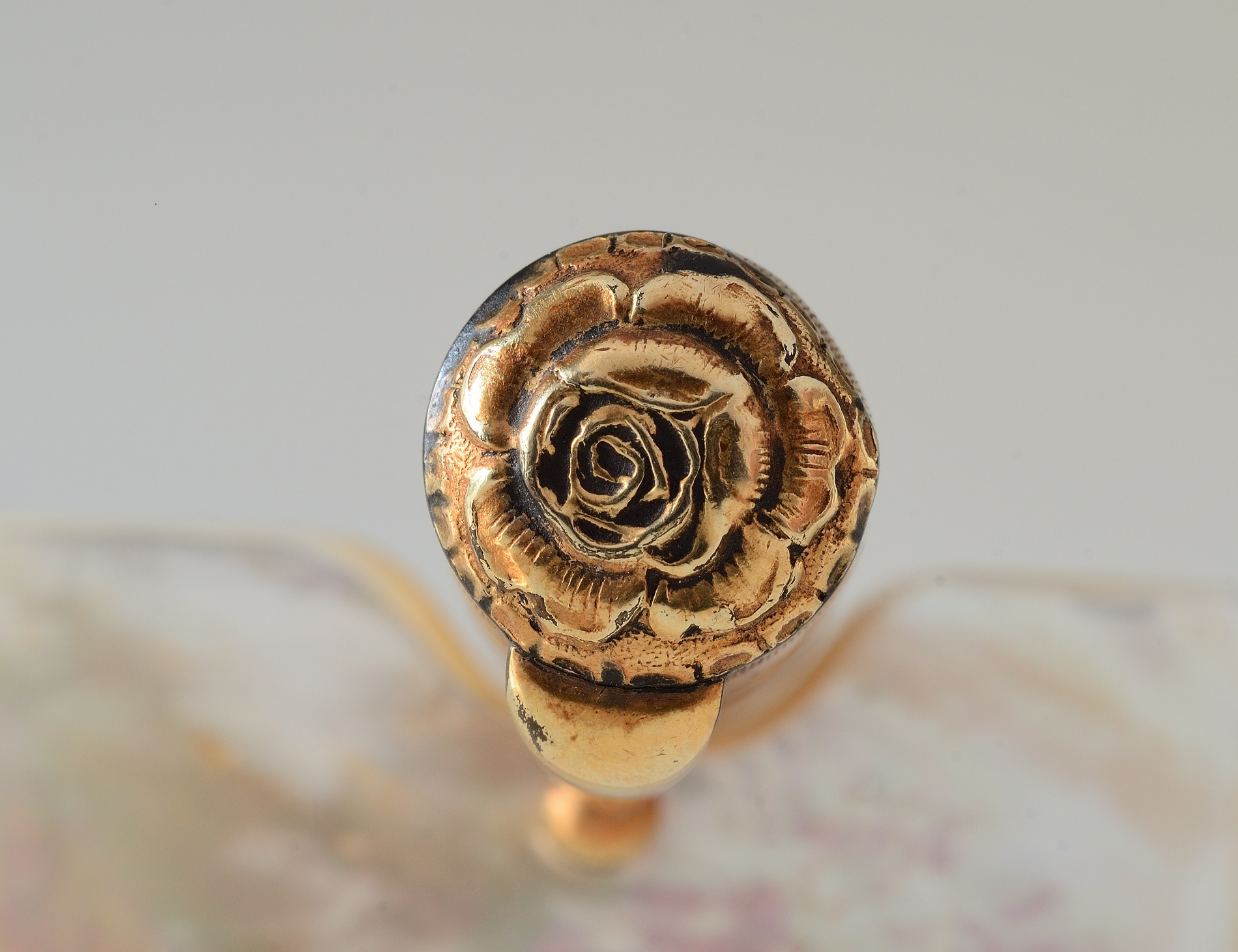 Le parti dorate hanno un motivo guilloché alternato a fasce traforate a trifogli con due fasce in argento incise a scacchi, ma lascio
