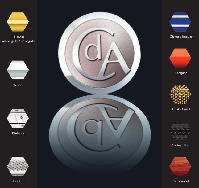 La finitura gold plated di questo esemplare è particolare, non so identificarla esattamente: il fusto, dalle foto, sembra avere parti in lacca nera (c'è una versione in lacca cinese nera) e c'è abbondanza del monogramma CdA... Boh. Che sia una versione aziendale???