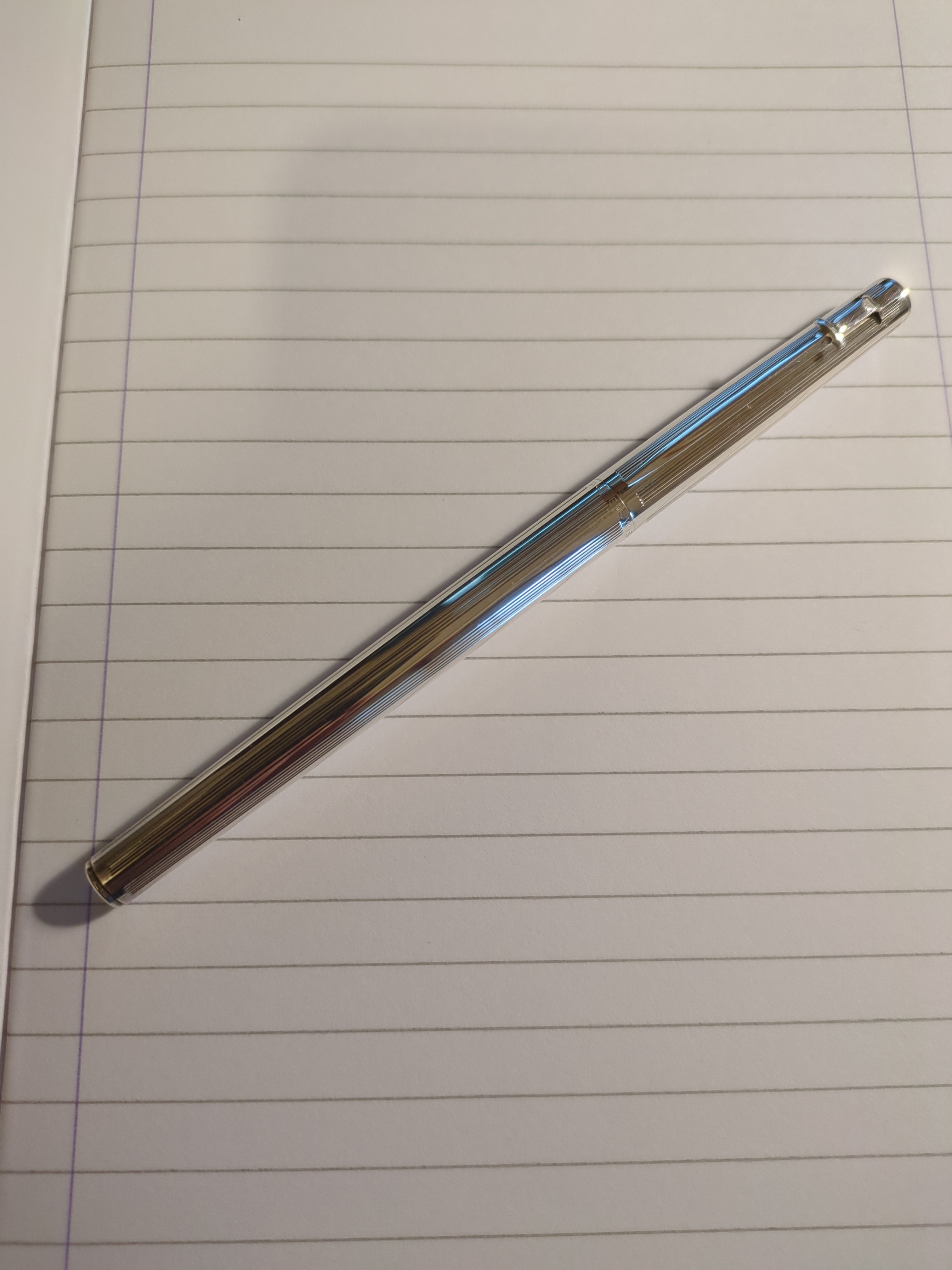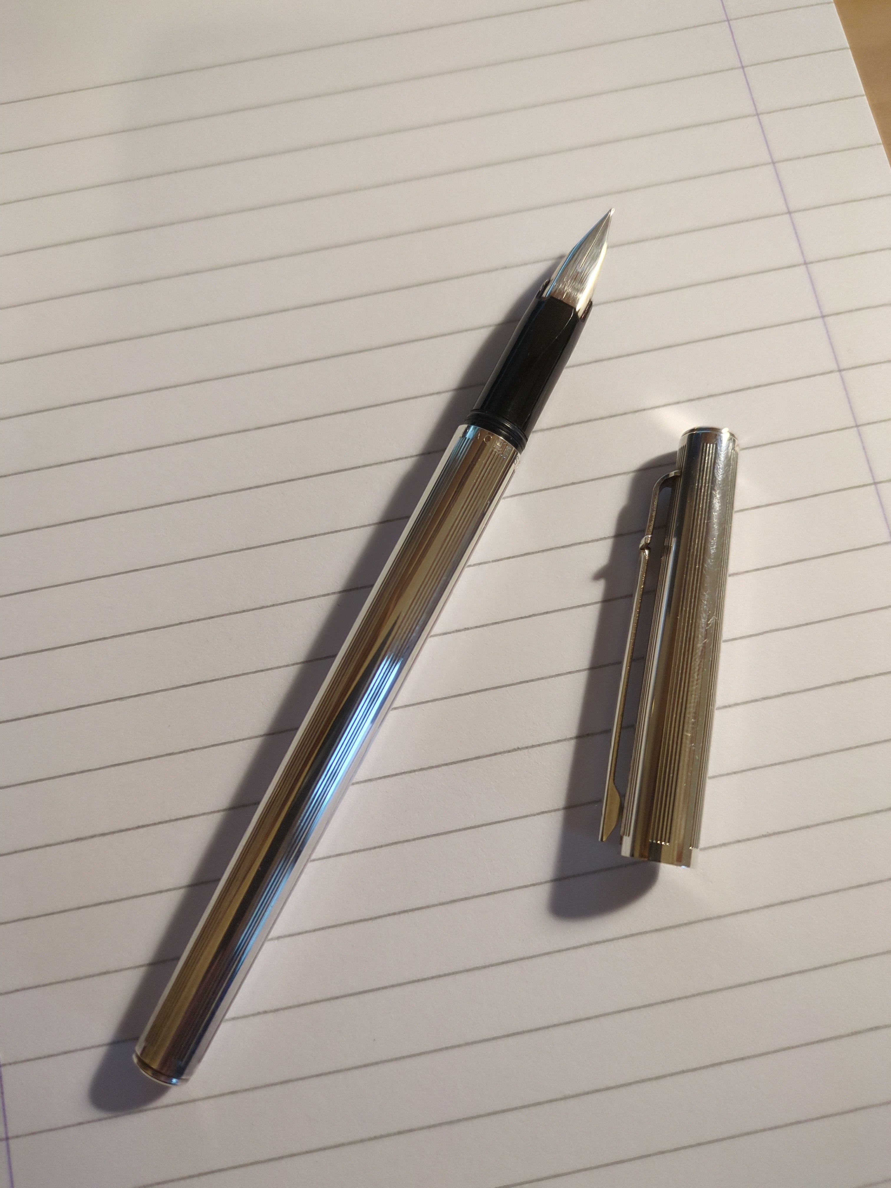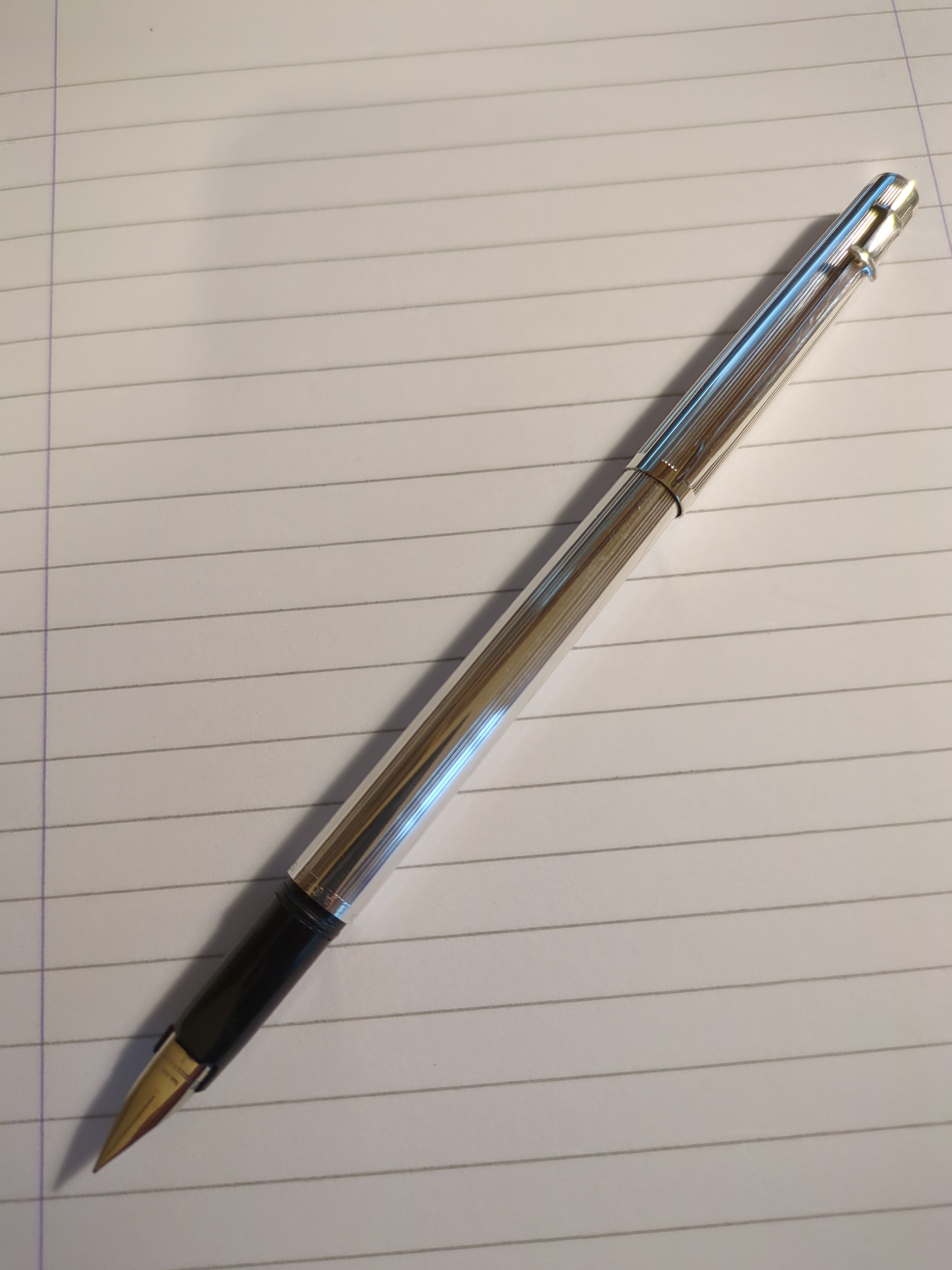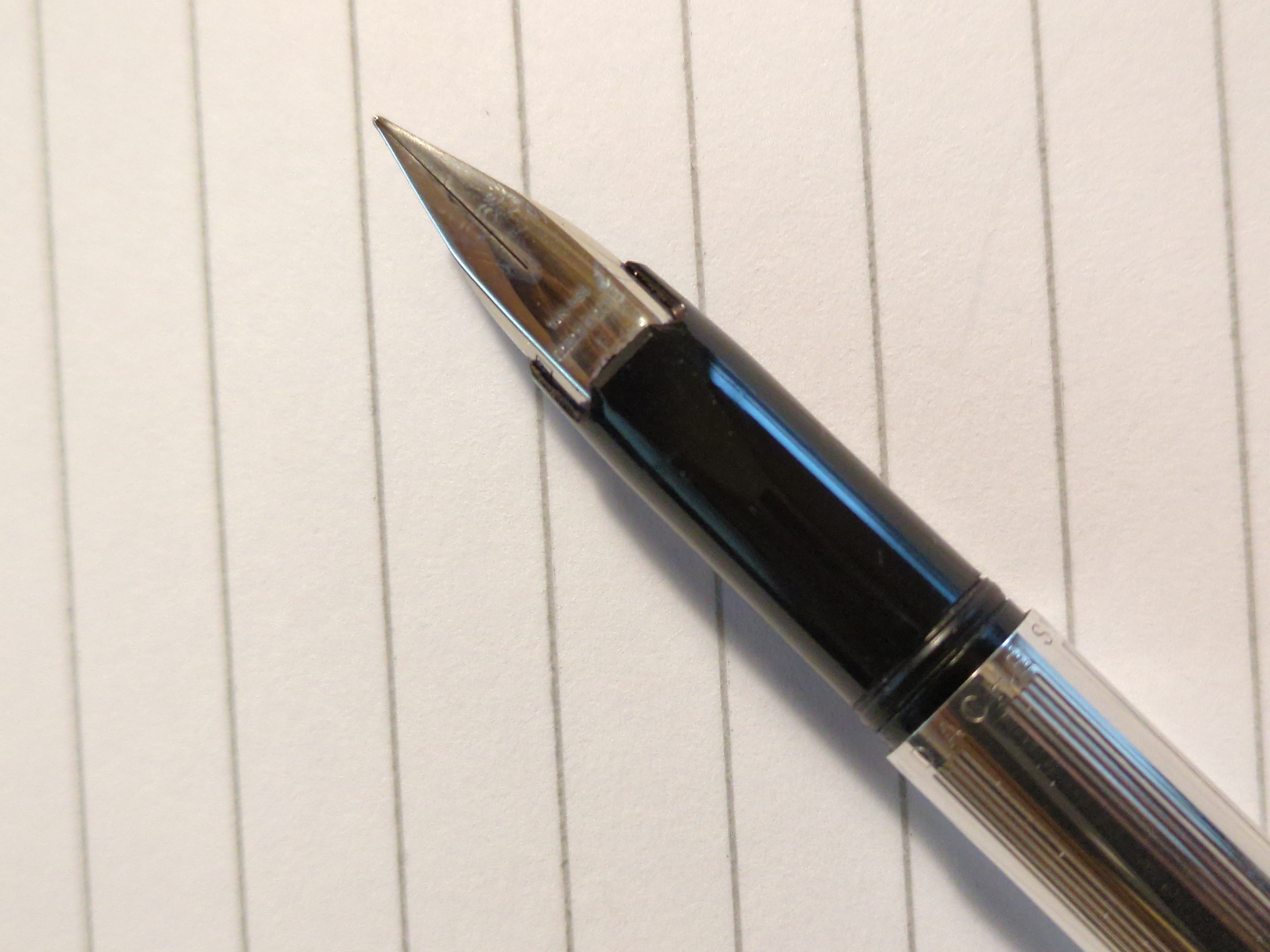 Il pennino è notevole: buona scorrevolezza, tratto corrispondente a quallo nominale (F) e senza incertezze, molleggiato (direi quasi un semi-flex) che permette di ottenere una gradevole variazione di tratto applicando una pressione "normale" (cioé senza dover premere troppo).