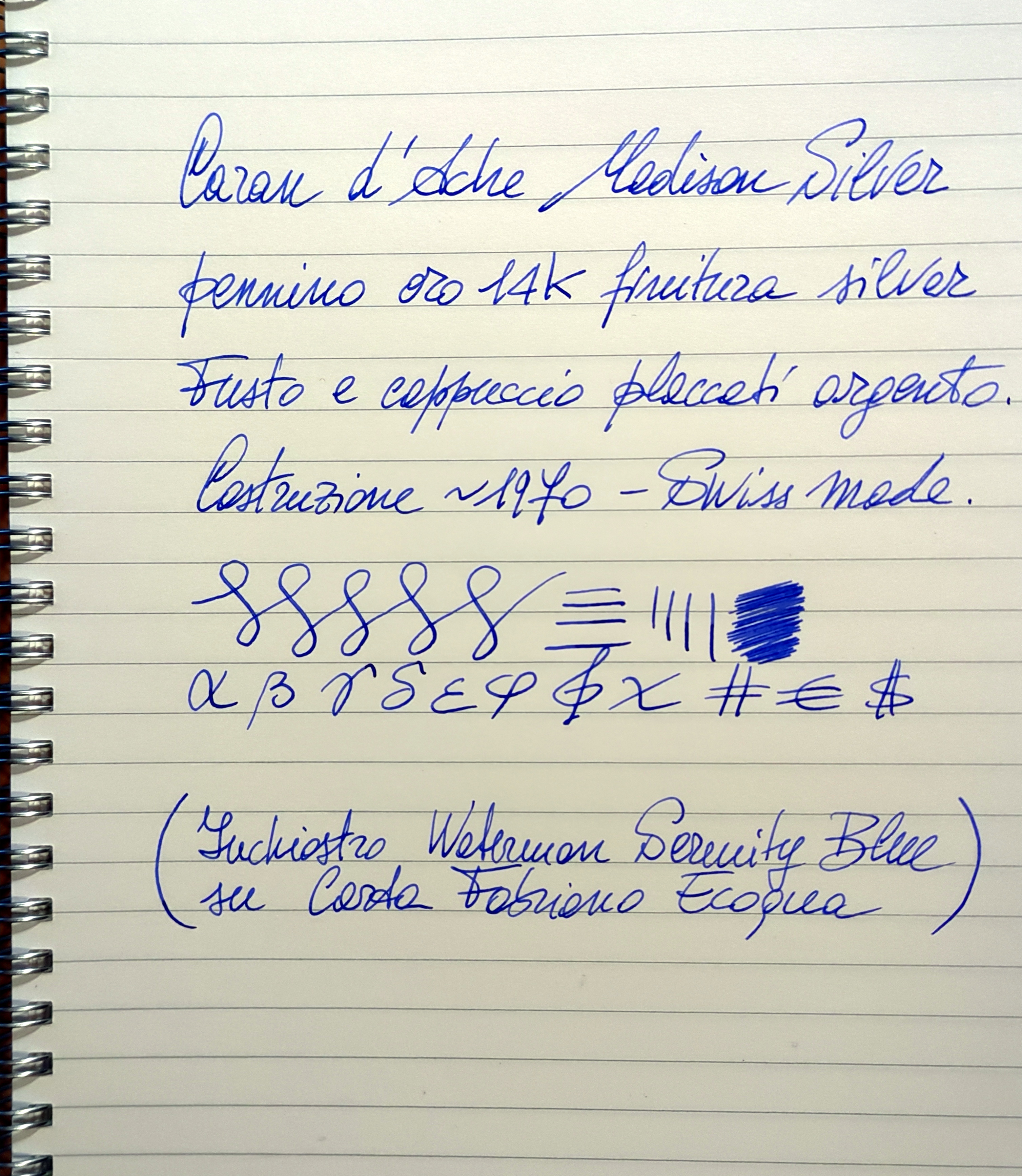 Ho una Caran d'Ache Madison Silver, pennino in oro 14K (585) con finitura silver, F, 1970 ca. (seguono foto), accompagata dalla "sorella" Caran d'Ache Madison Silver Mechanical Pencil dello stesso periodo, entrambe in condizioni ottime.