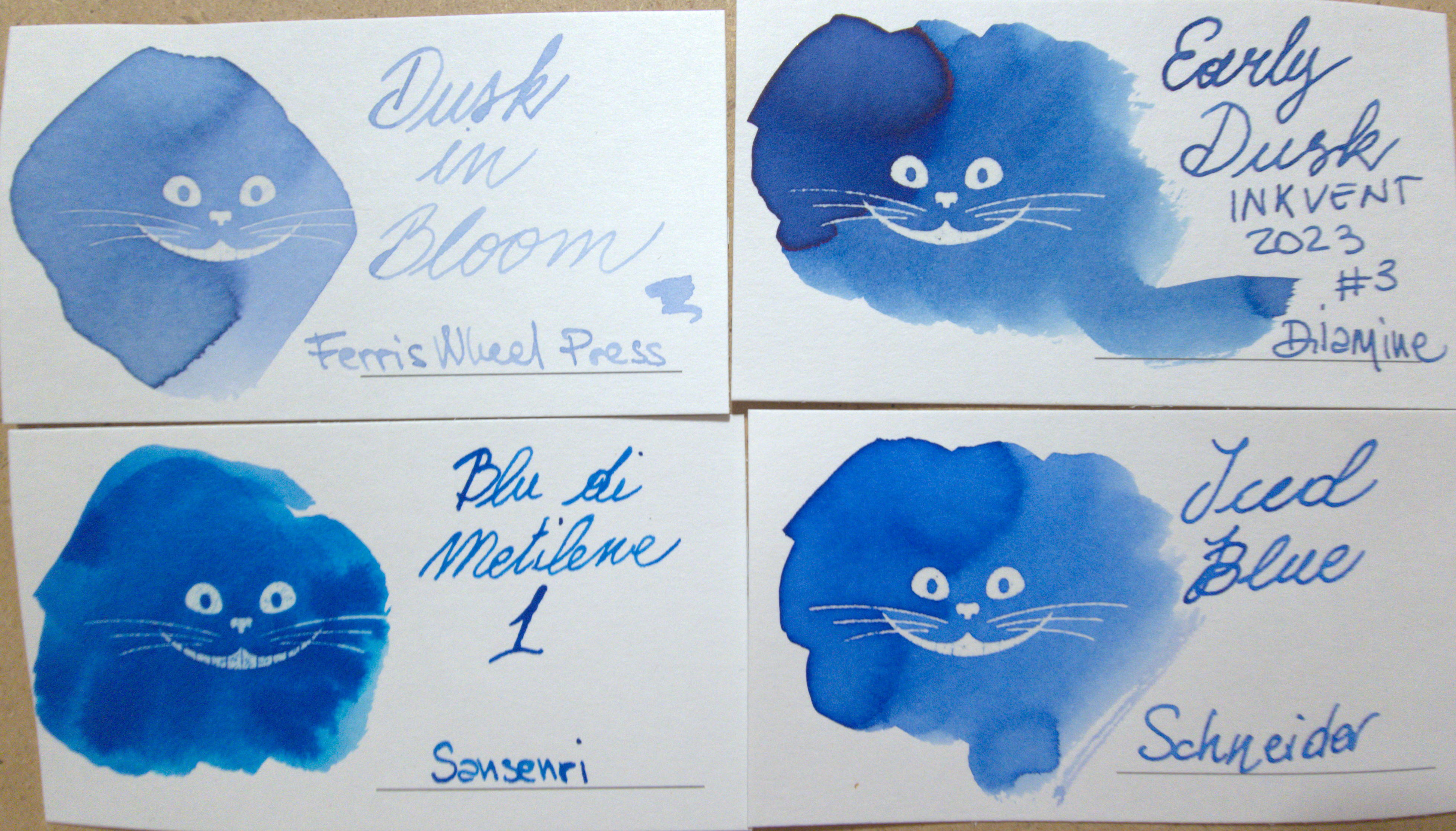 Proprio perché non amo i blu freddi, tendo a non averne molti con cui fare confronti. Se non altro, da questi si vede come sieda molto sul confine della tonalità neutra. Dusk in Bloom di Ferris Wheel Press è un blu neutro ma accanto a Early Dusk risulta decisamente più caldo. Al contempo, messo accanto a blu più freddi come quello al blu di metilene di Sansenri e ad Ice Blue di Schneider sembra quasi caldo.