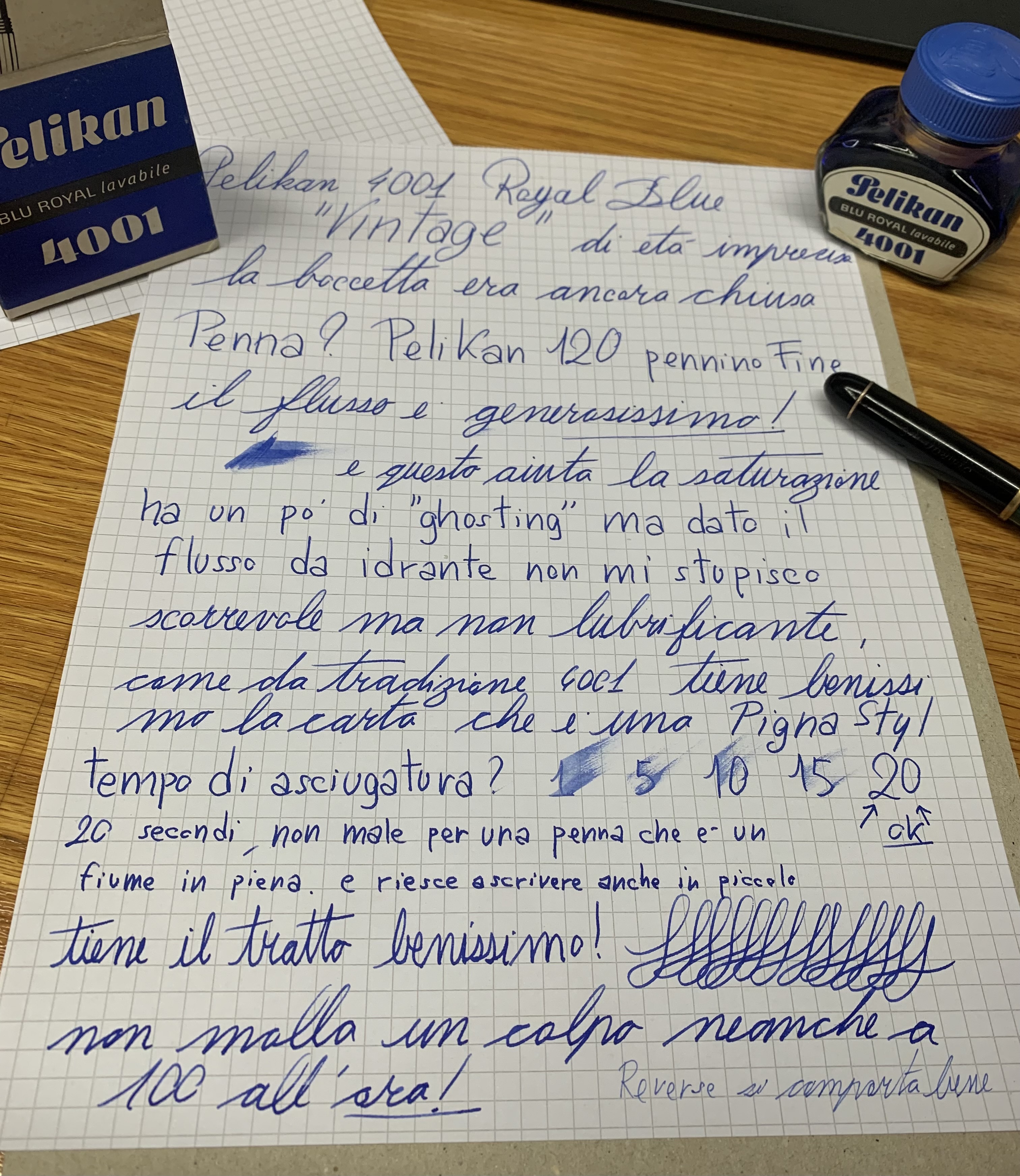 Inchiostro caposaldo della produzione Pelikan "popolare " , facilissimo da trovare, se entrate in una qualsiasi cartoleria, anche dei più disparati e disagiati paesini della penisola e chiedete dell'inchiostro per stilografiche vi verrà messo sul bancone un pacchetto da 6 di cartucce Pelikan 4001 Royal Blue, di età spesso imprecisabile a volte pure mezze secche.