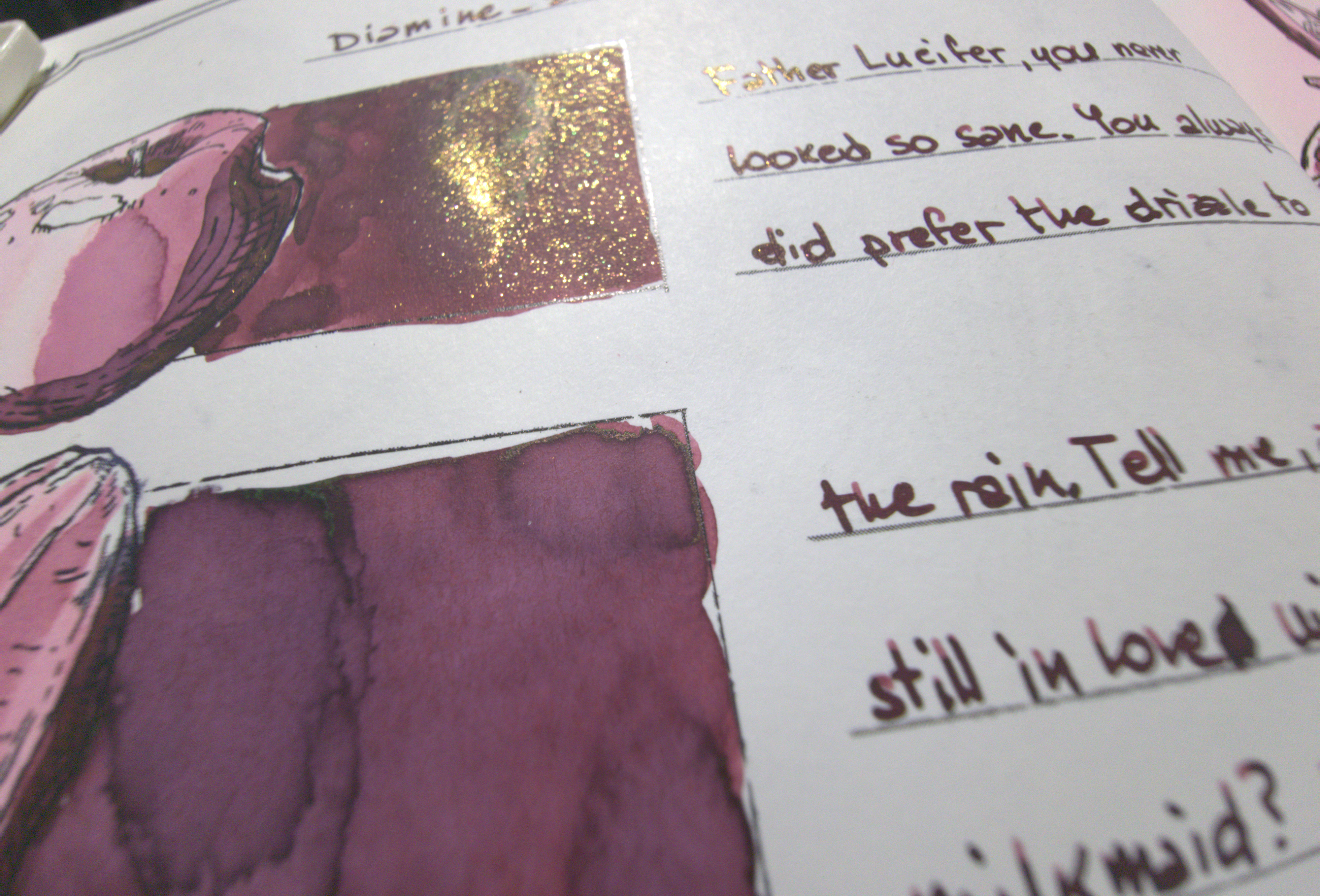 Il comportamento è molto buono. Non sbrodola e, al contempo, non è secco. Il glitter ha un po' il solito effetto: scende subito, poi serve agitare la penna per farlo tornare.