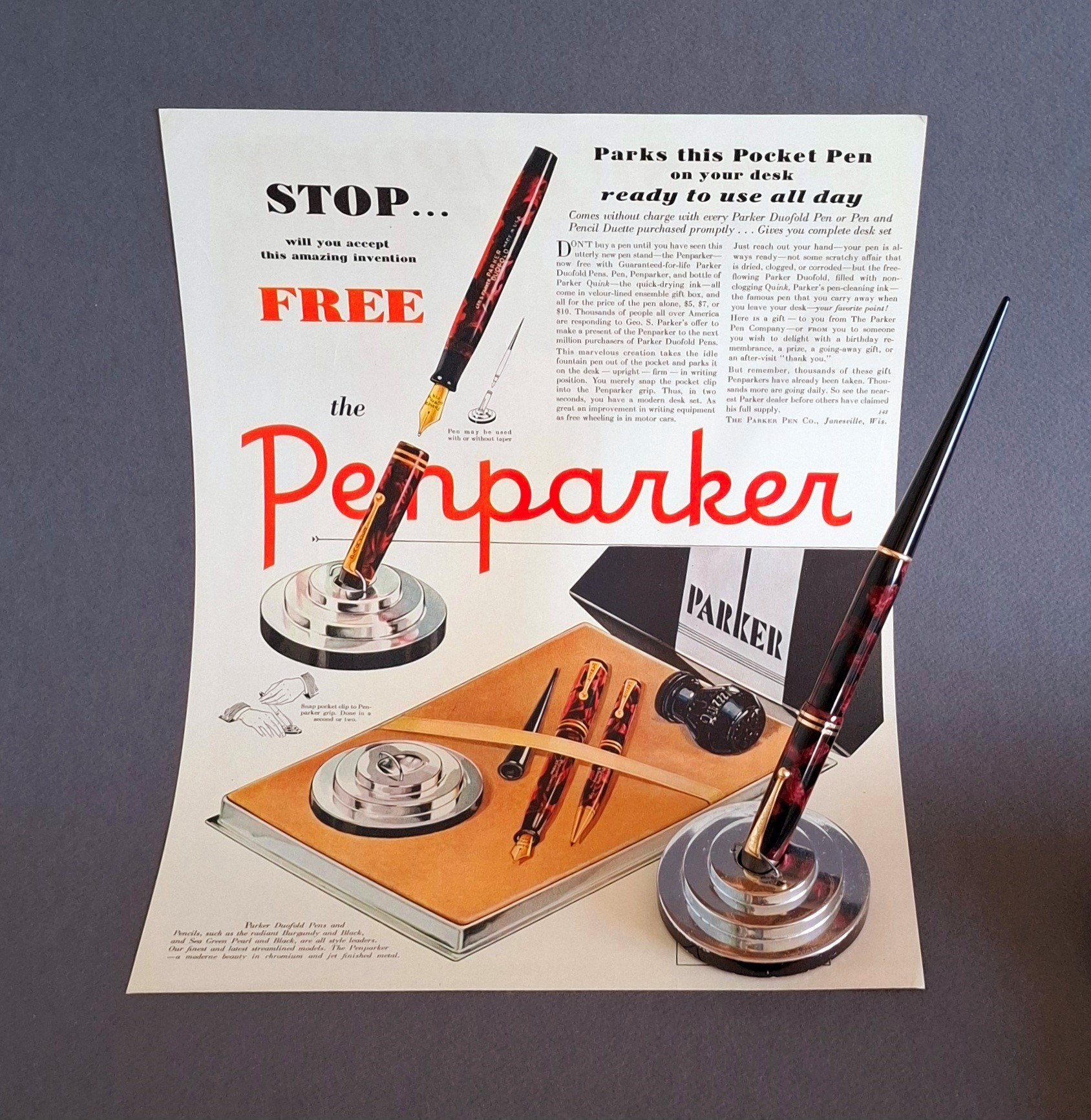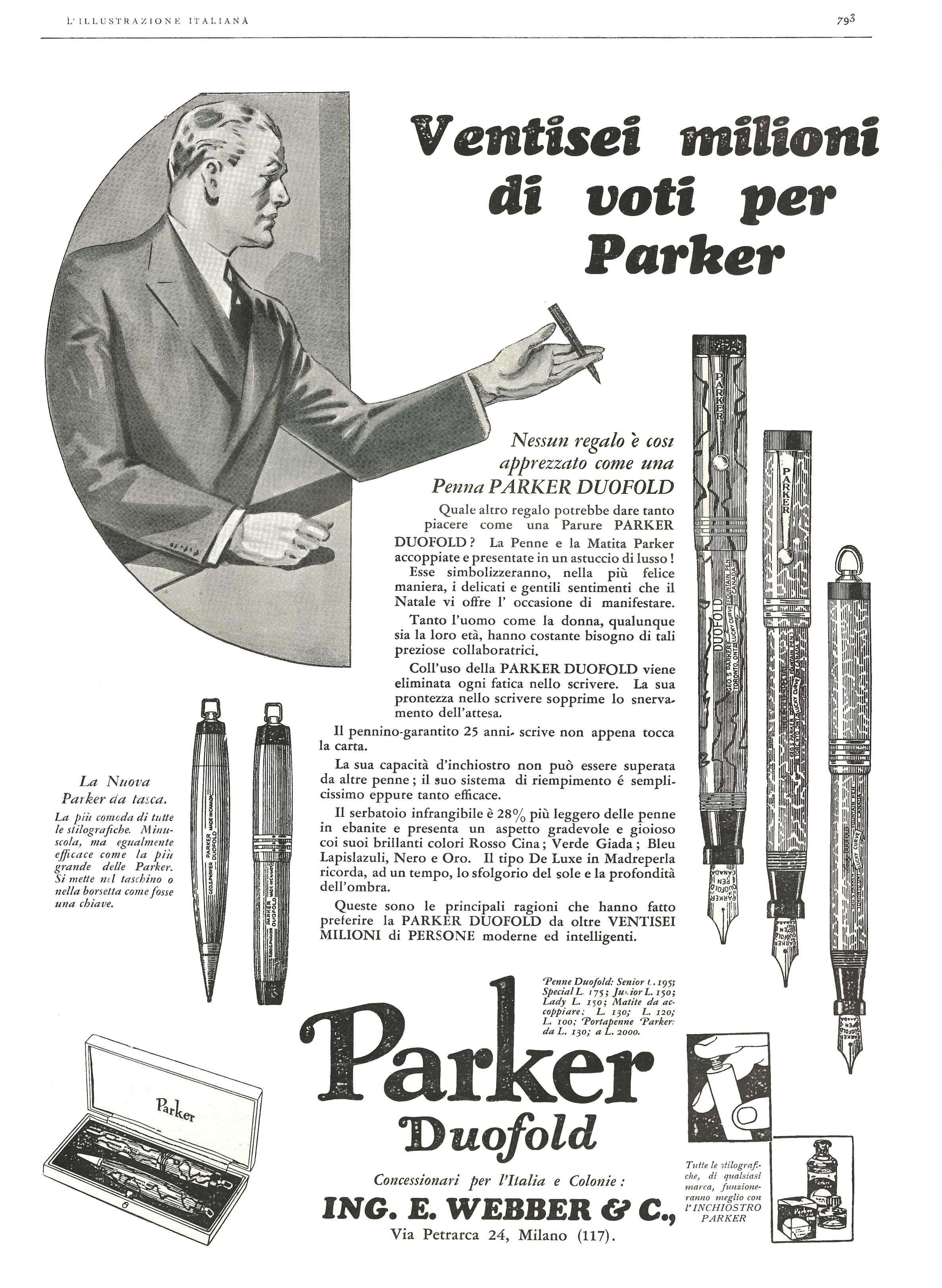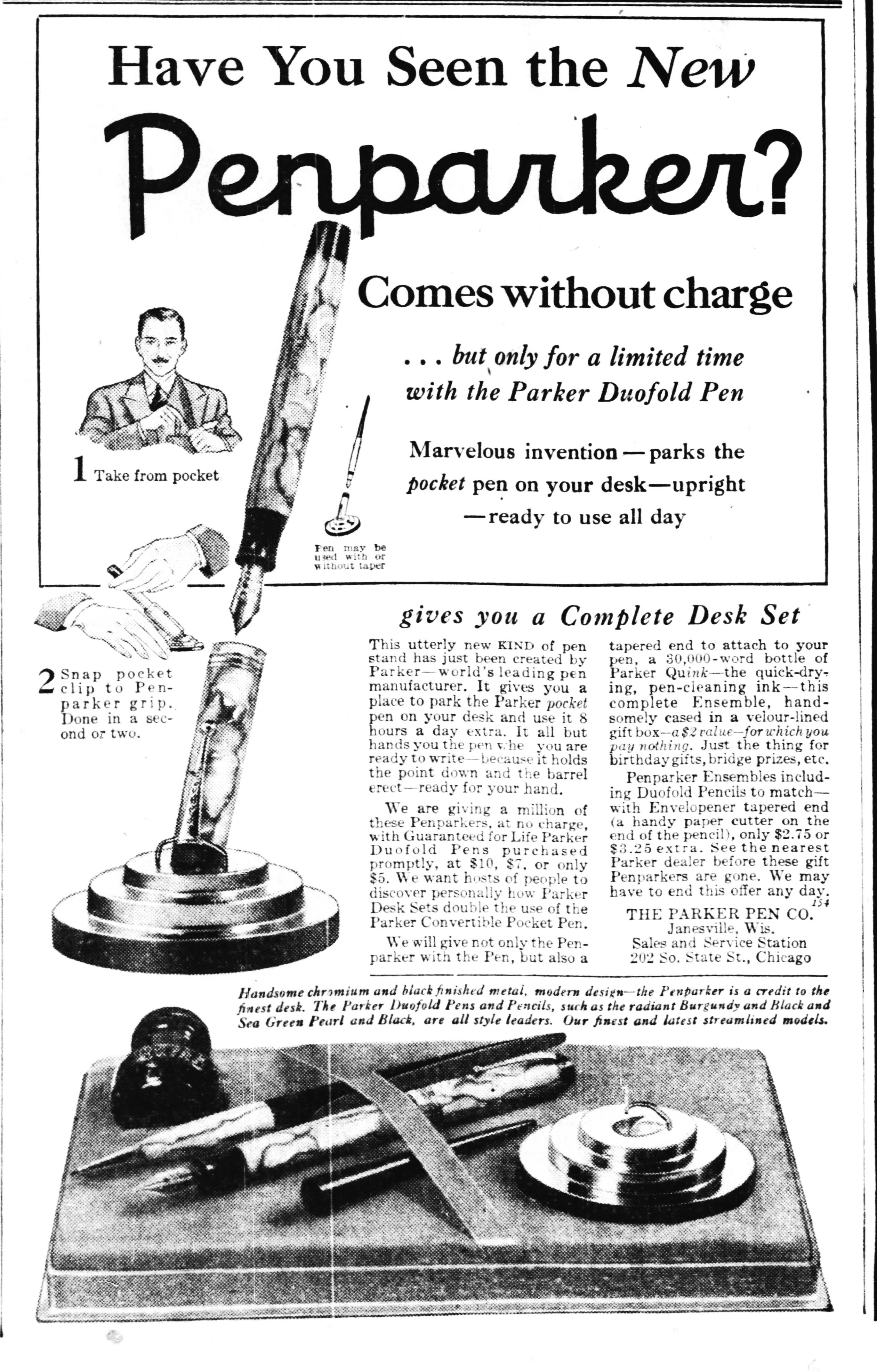 Nel citato sito parkersheaffer.com, l’ottimo Dan Zazove firma un articolo che introduce dal punto di vista storico il «Penparker» (https://parkersheaffer.com/penparker-a- ... desk-base/) ricordando come proprio nel 1932, al culmine degli effetti negativi della Grande Depressione, la Parker avrebbe visto il proprio fatturato ridursi ad un terzo rispetto a quello degli anni precedenti (!), e che avrebbe patito per la prima volta nella sua quarantennale storia il primo esercizio in perdita… La risposta della dirigenza, in attesa del lancio del nuovo prodotto che avrebbe rivoluzionato il mercato (la prima Vacuum-filler/Vacumatic trasparente è proprio dell’autunno di quell’anno), fu quella di prendere tempo, resistere senza abbassare i prezzi, e cercare di smaltire gli stock di Duofold invenduti, proponendo con campagne pubblicitarie di grande impatto le penne e le matite in abbinamento ad accessori utili ma con bassissimi costi di produzione.