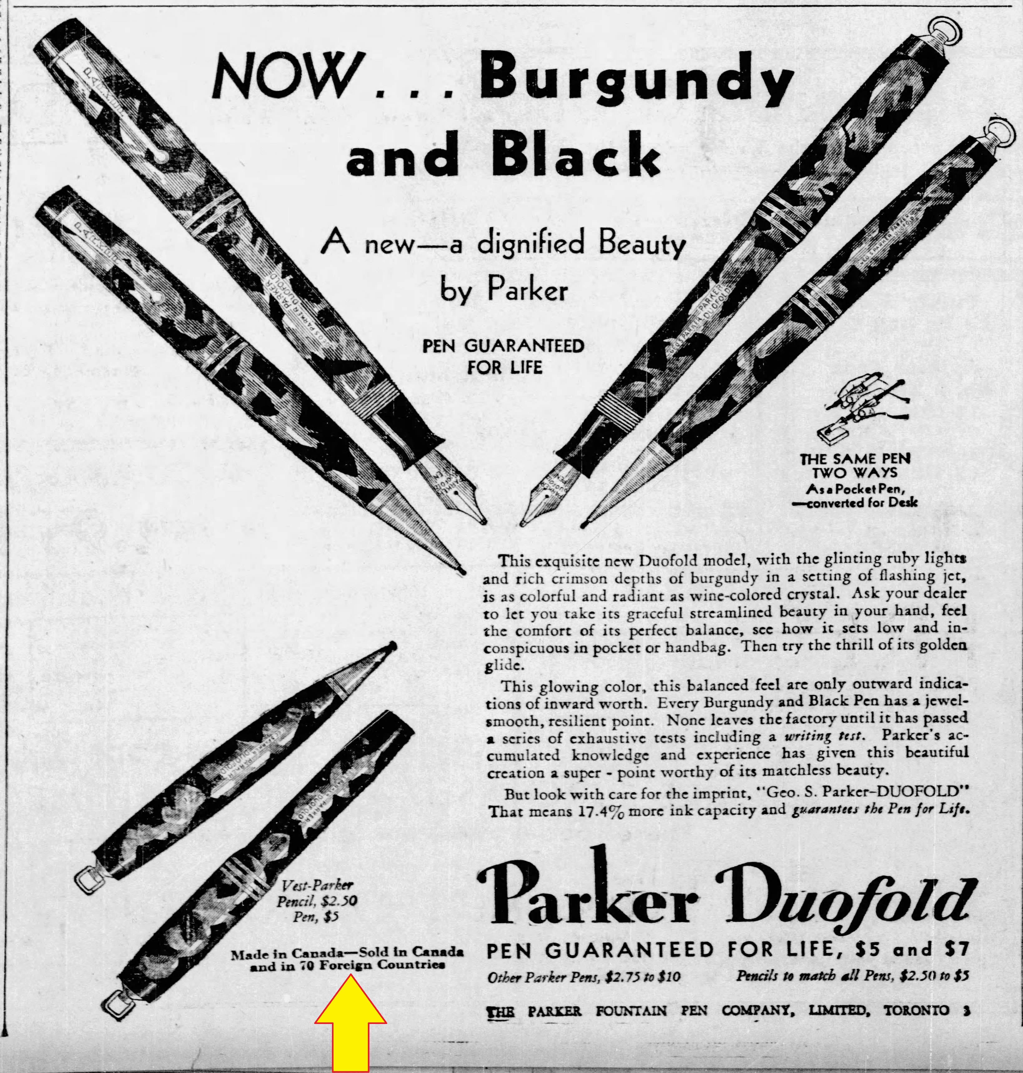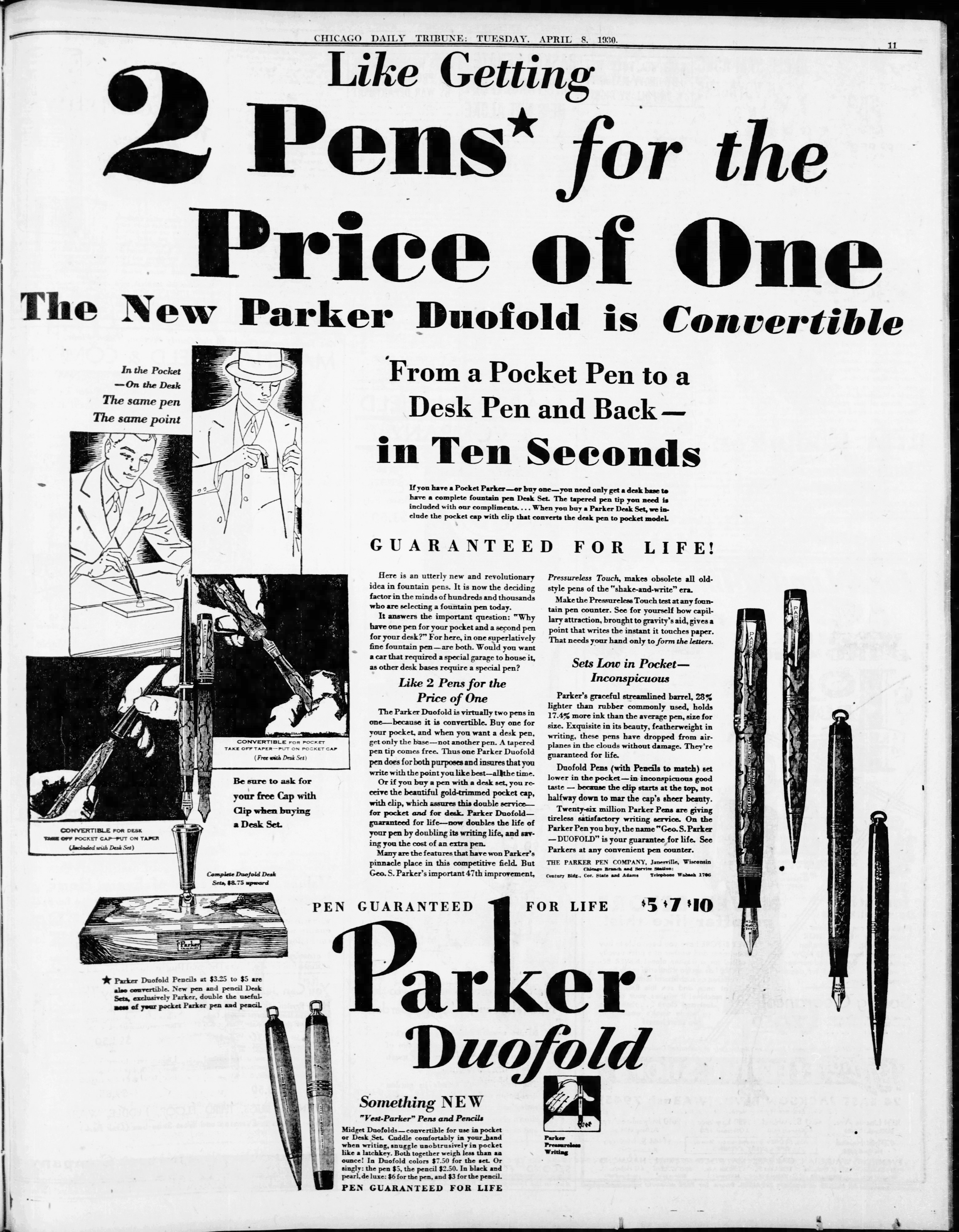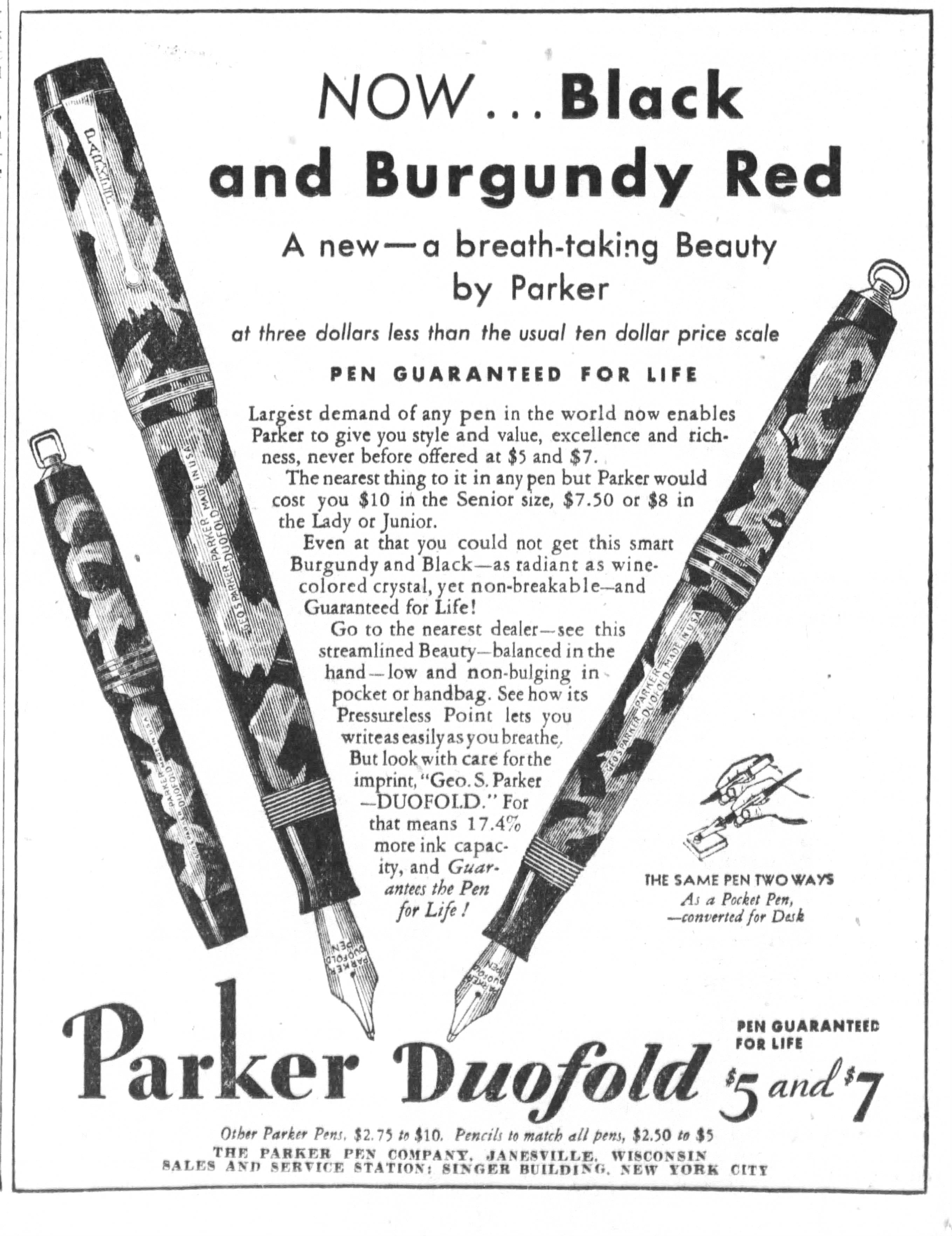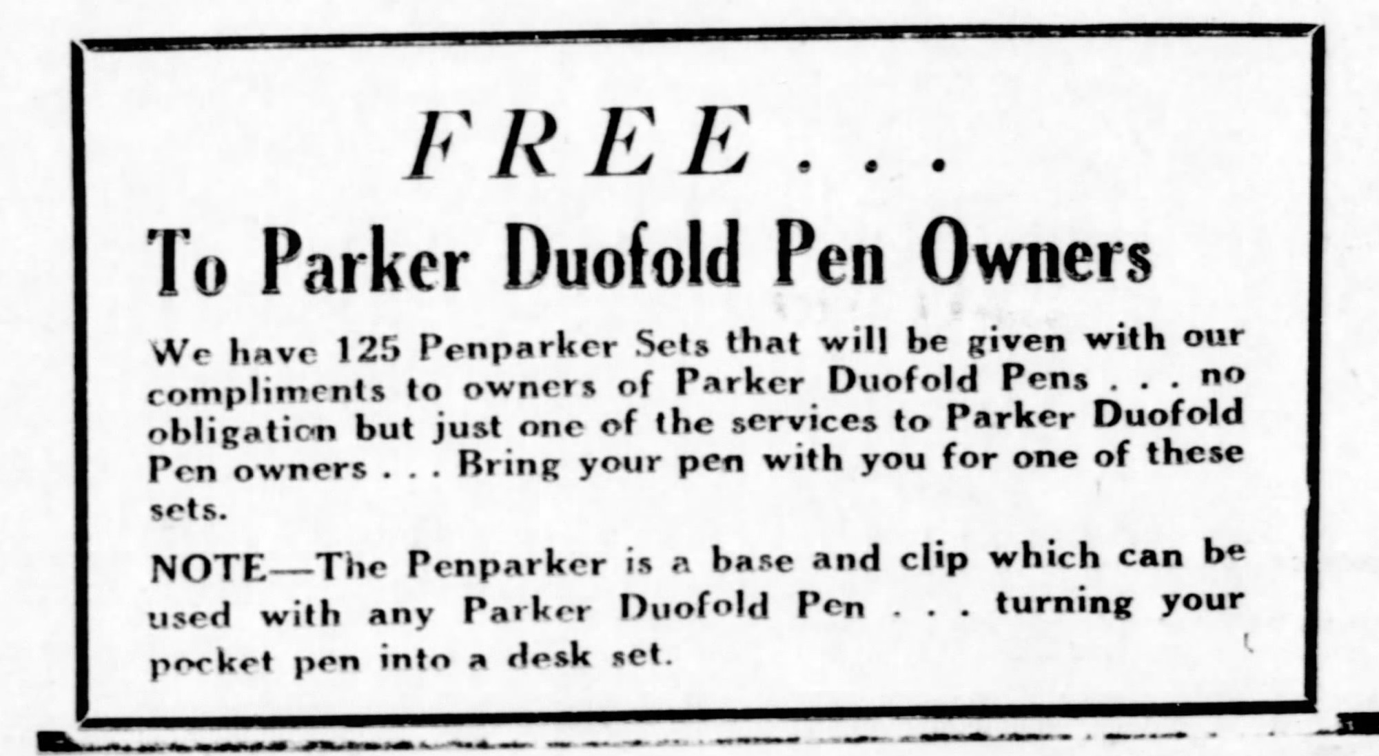 Nel citato sito parkersheaffer.com, l’ottimo Dan Zazove firma un articolo che introduce dal punto di vista storico il «Penparker» (https://parkersheaffer.com/penparker-a- ... desk-base/) ricordando come proprio nel 1932, al culmine degli effetti negativi della Grande Depressione, la Parker avrebbe visto il proprio fatturato ridursi ad un terzo rispetto a quello degli anni precedenti (!), e che avrebbe patito per la prima volta nella sua quarantennale storia il primo esercizio in perdita… La risposta della dirigenza, in attesa del lancio del nuovo prodotto che avrebbe rivoluzionato il mercato (la prima Vacuum-filler/Vacumatic trasparente è proprio dell’autunno di quell’anno), fu quella di prendere tempo, resistere senza abbassare i prezzi, e cercare di smaltire gli stock di Duofold invenduti, proponendo con campagne pubblicitarie di grande impatto le penne e le matite in abbinamento ad accessori utili ma con bassissimi costi di produzione.