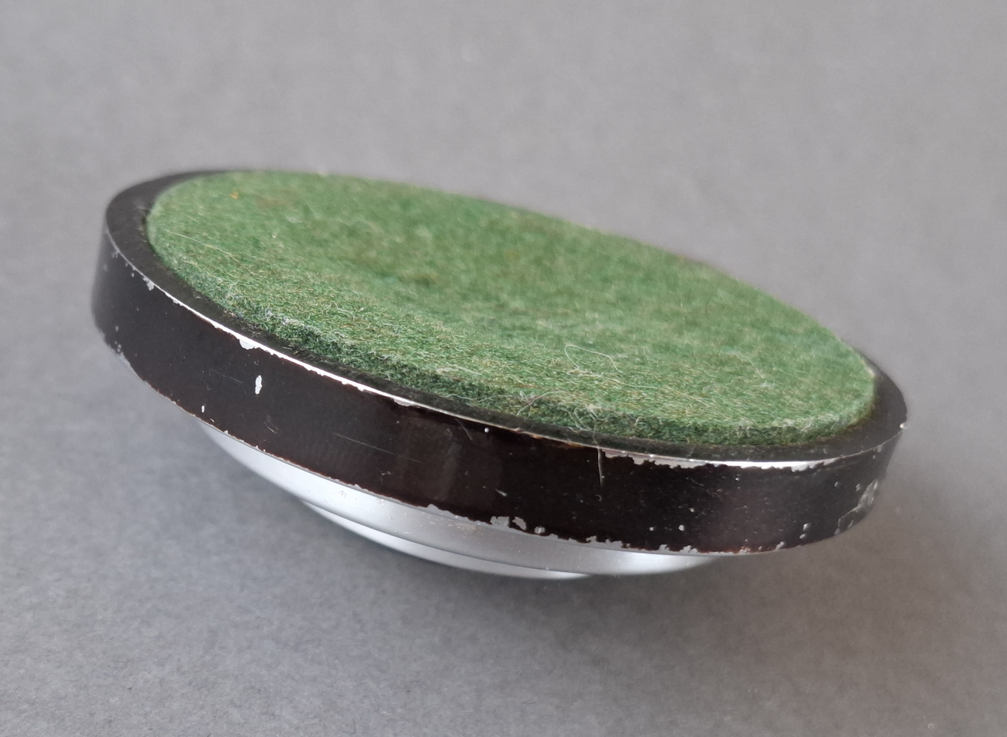 Definito in una Ad «a moderne beauty in chromium and jet finished metal» (feb. 20, 1932), mostra una superficie cromata (una cromatura, senza dubbio, di qualità) con l’eccezione del disco che funge da base, che è invece verniciato di nero a contrasto (direttamente sulla cromatura): sul mio esemplare la vernice nera non si è rivelata altrettanto efficace nel resistere alle ingiurie del tempo. La superficie inferiore è ricoperta dal feltro verde originale.