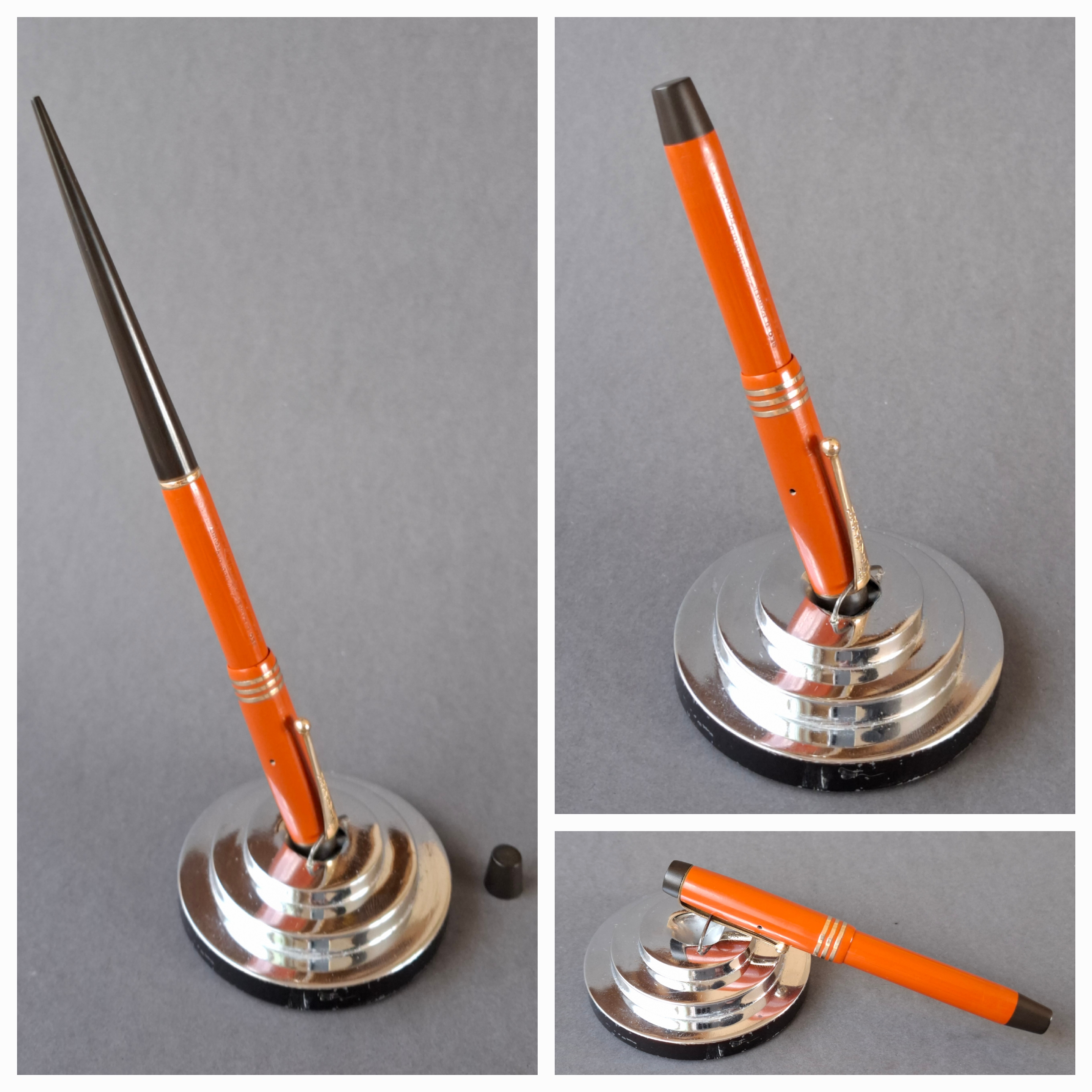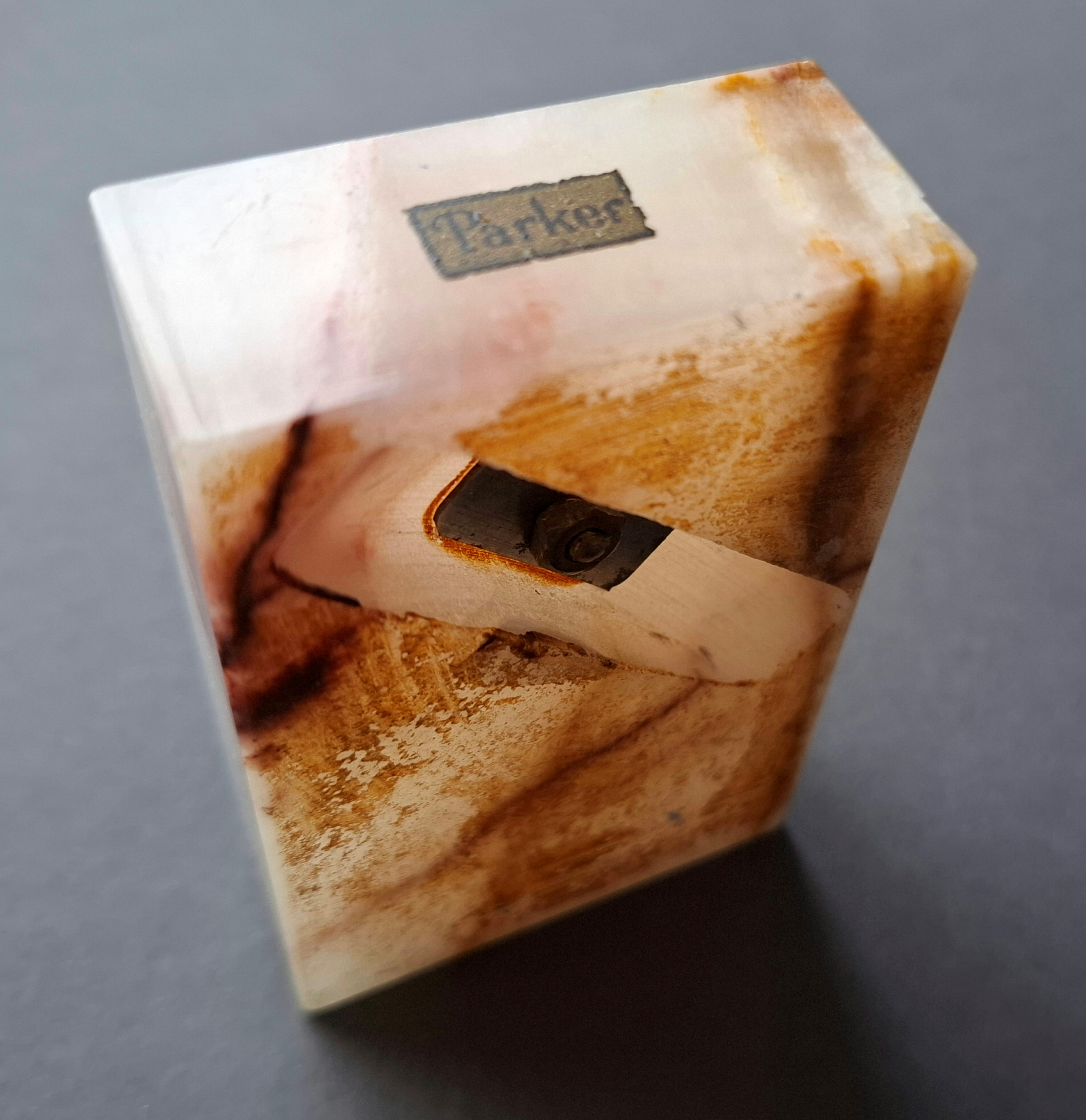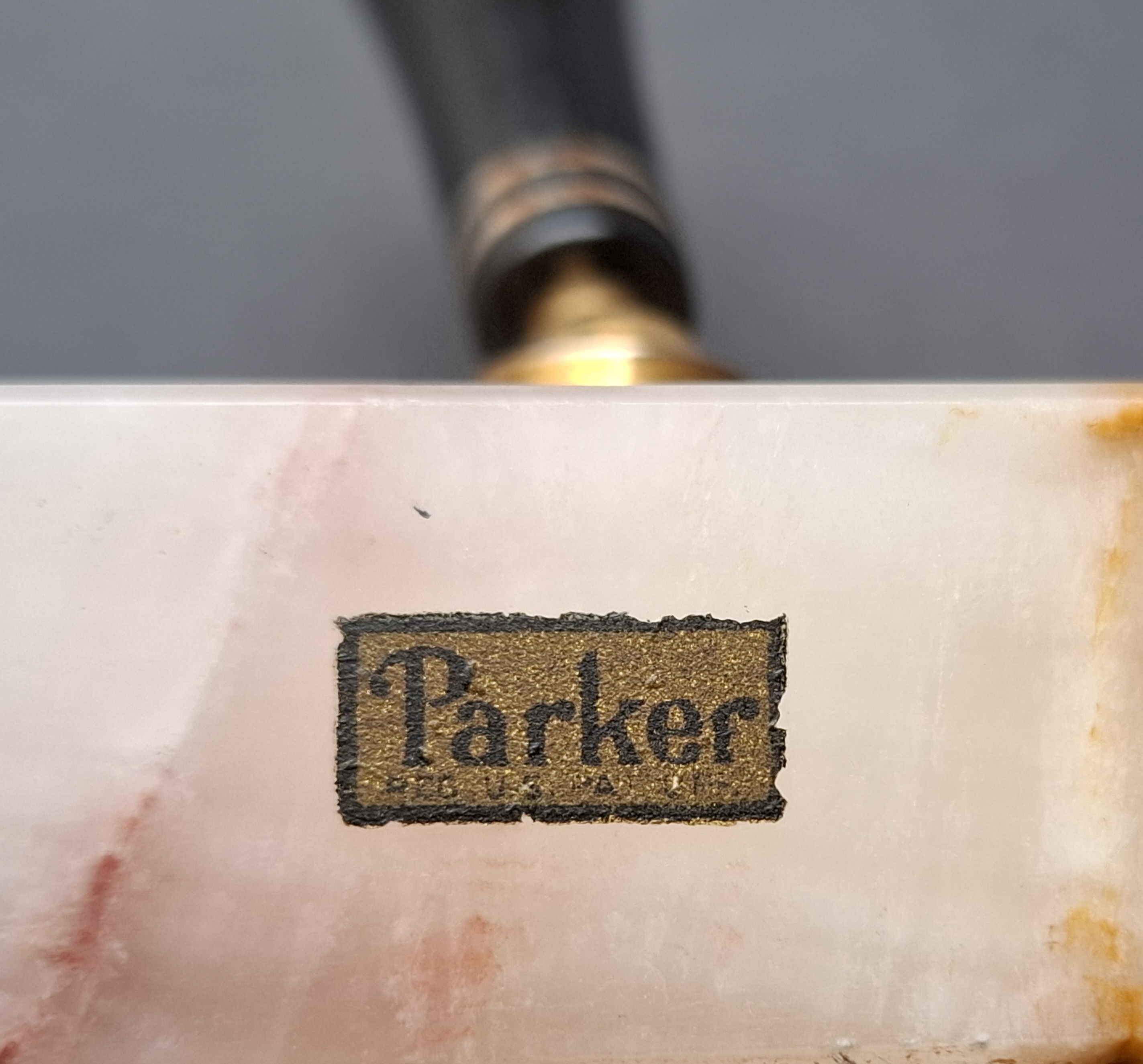 Il Penparker è in buona sostanza una lucente “base da tavolo” in stile Déco caratterizzata da tre dischi concentrici, impilati uno sull’altro con diametri decrescenti (di ca. 0,5 cm). Al centro della superficie del disco superiore è stato ricavato un incavo asimmetrico, che parrebbe penetrare per più dell’altezza dell’ultimo disco: per questo motivo, il manufatto potrebbe anche essere soltanto un “blocco unico”, e non il risultato dell’assemblaggio di tre parti distinte.