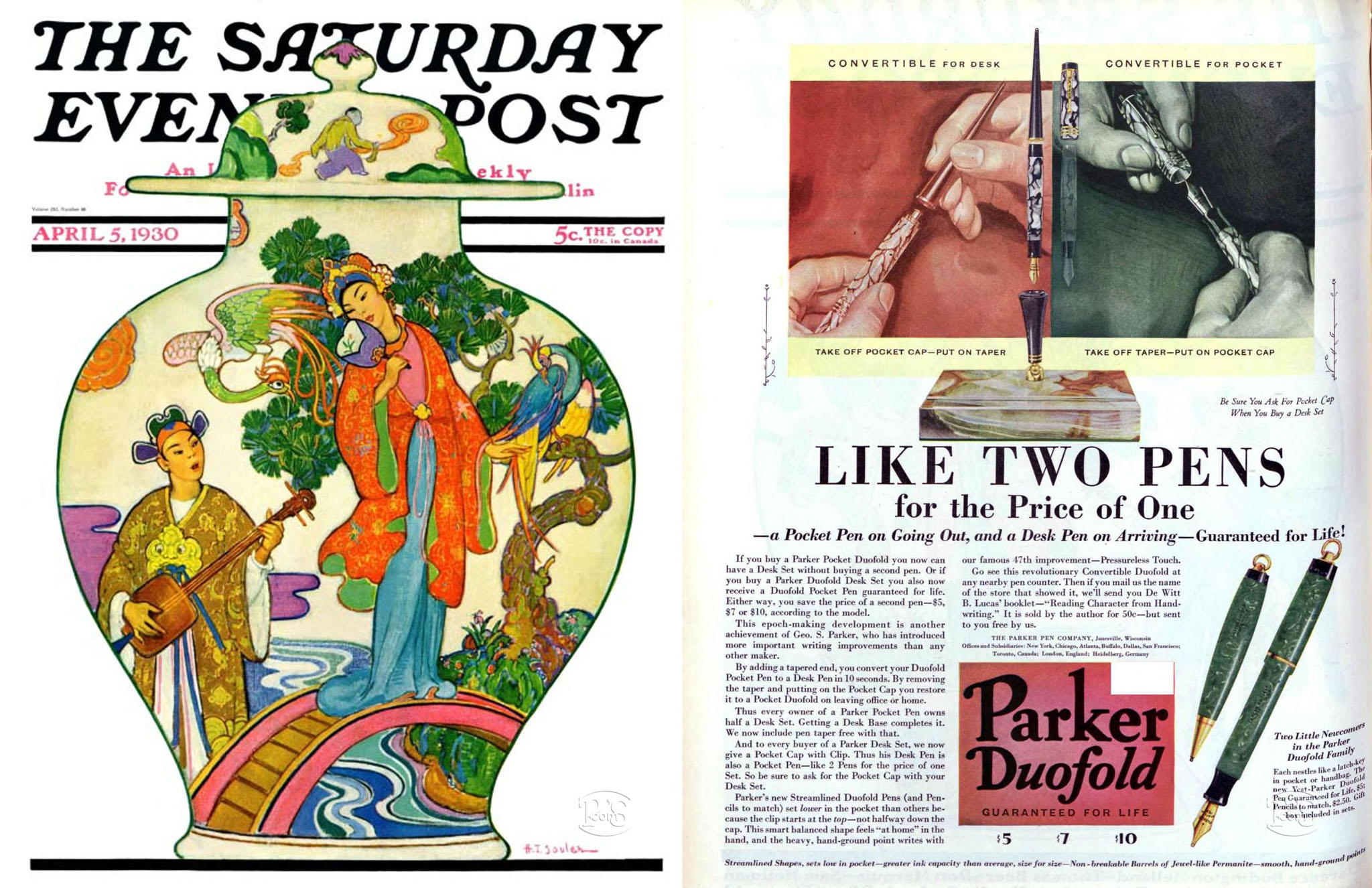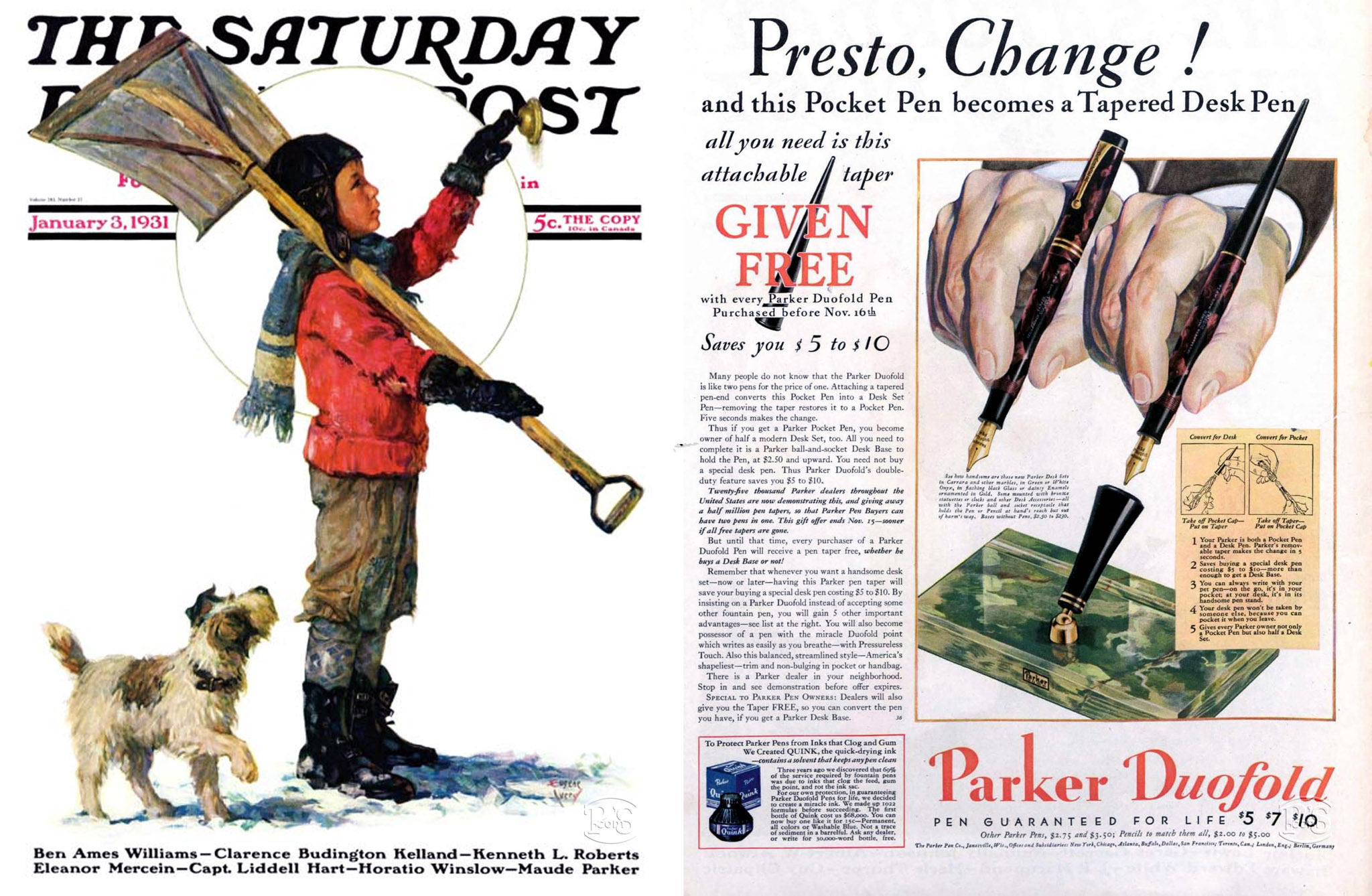 Sulle riviste a diffusione nazionale la prima apparizione da me rinvenuta è di due settimane dopo, sul Saturday Evening Post del 20 febbraio 1932, ma è in bianco e nero e corrisponde alla pubblicità della stampa quotidiana che allegherò più sotto; personalmente, ho voluto acquistare dagli USA una pubblicità originale a colori del Penparker in cui comparisse anche la penna con cui lo presento, e volentieri conferisco il mio primo contributo odierno al Wiki: PARKER – 1932.04. The Penparker - The Saturday Evening Post – Vol.204, No. 44, pag.1 (seconda di copertina)