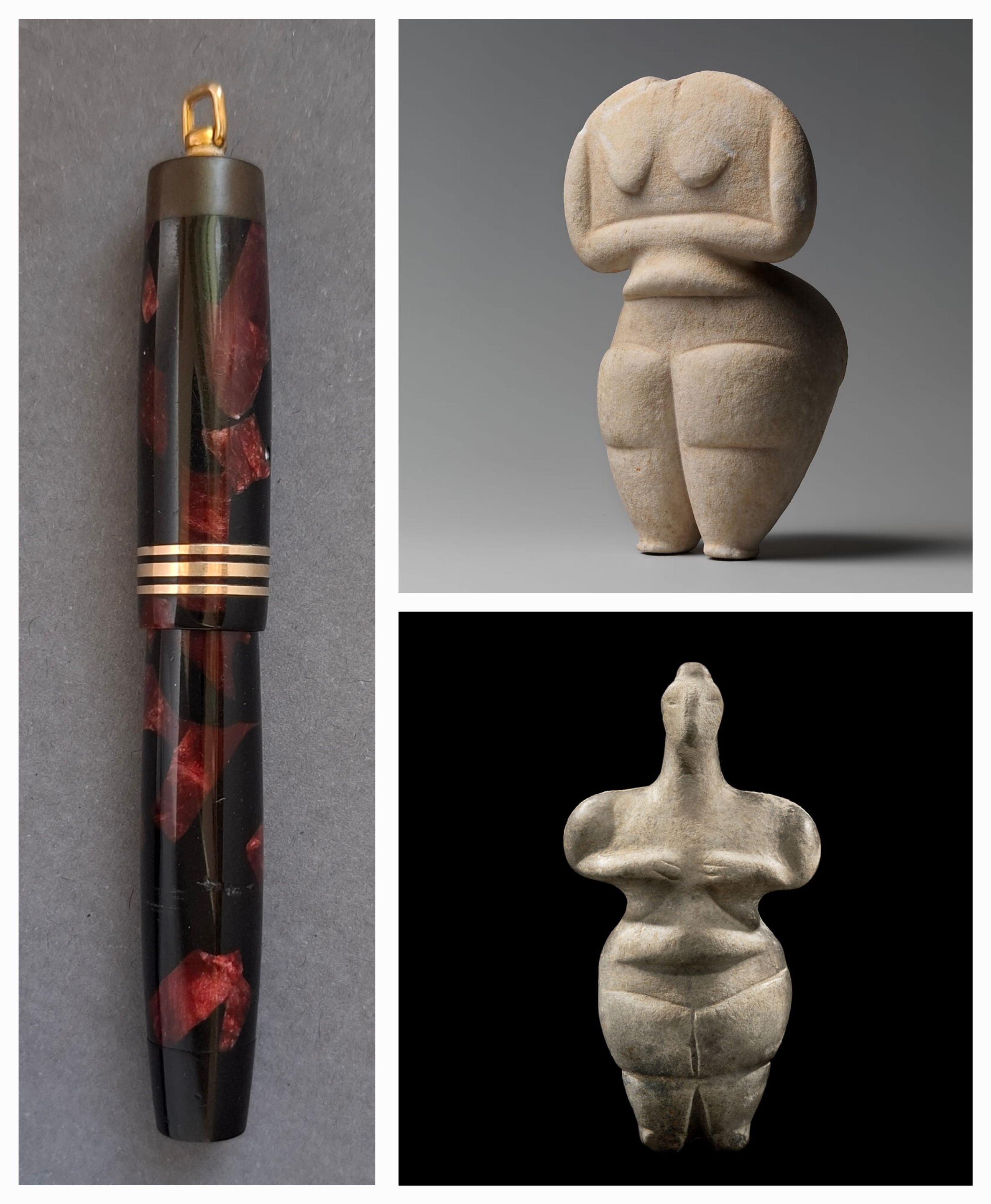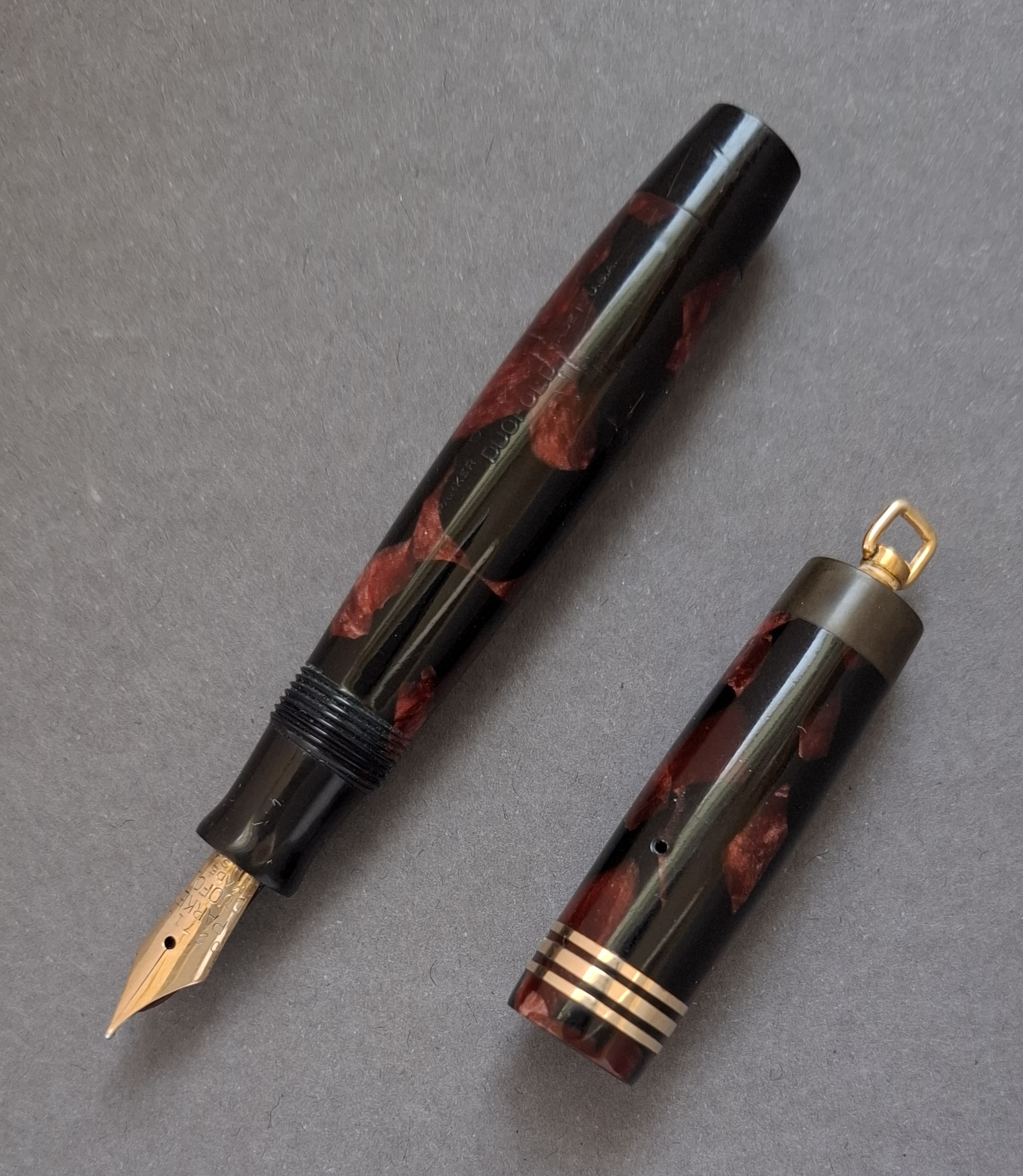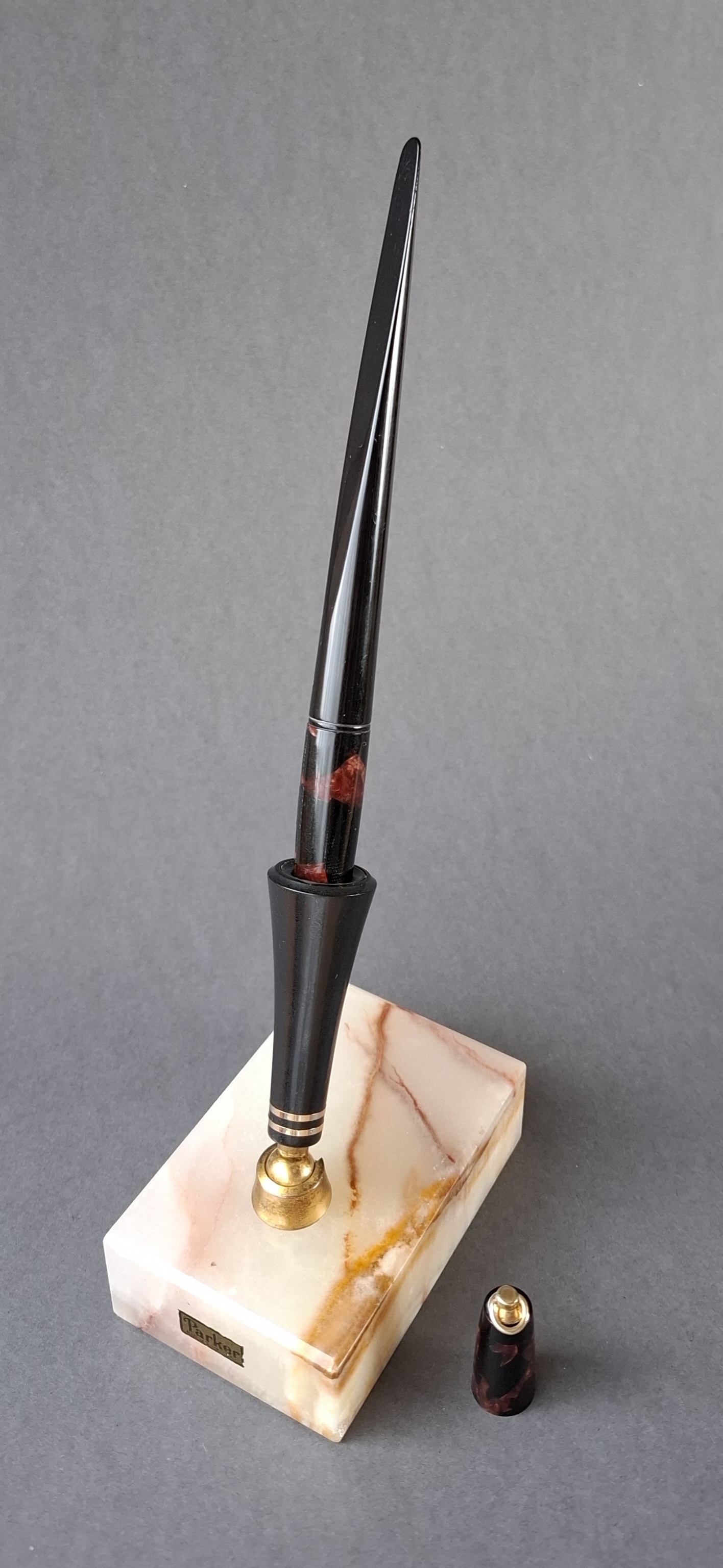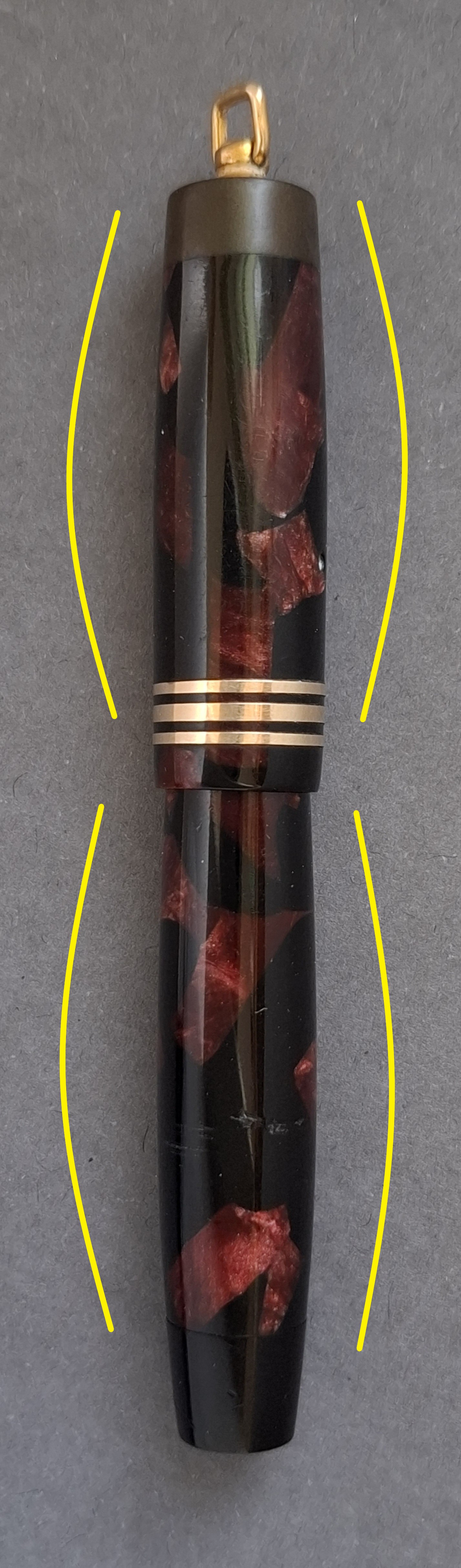 L’incavo a cui ho accennato ha una forma esterna ellissoidale, che presenta all’interno una sezione smussata/concava (che permette lo scivolamento della testina della penna verso il basso) e una sezione piatta incidente, perfettamente circolare, che accoglie in posizione di riposo la testina anch’essa piatta (flat-top, anche nella nuova versione streamlined delle Duofold) e costituisce il fine corsa della rotazione della penna.