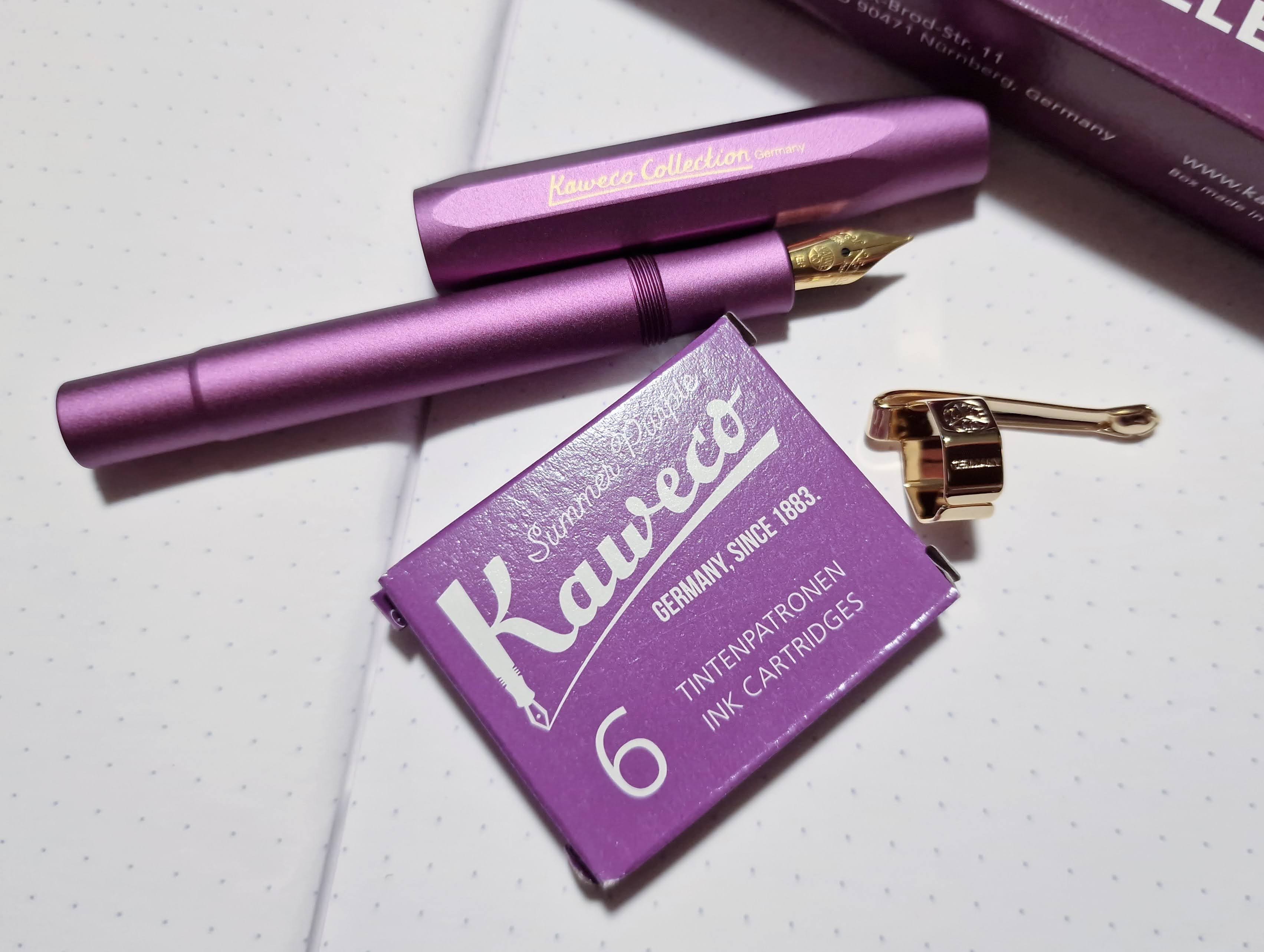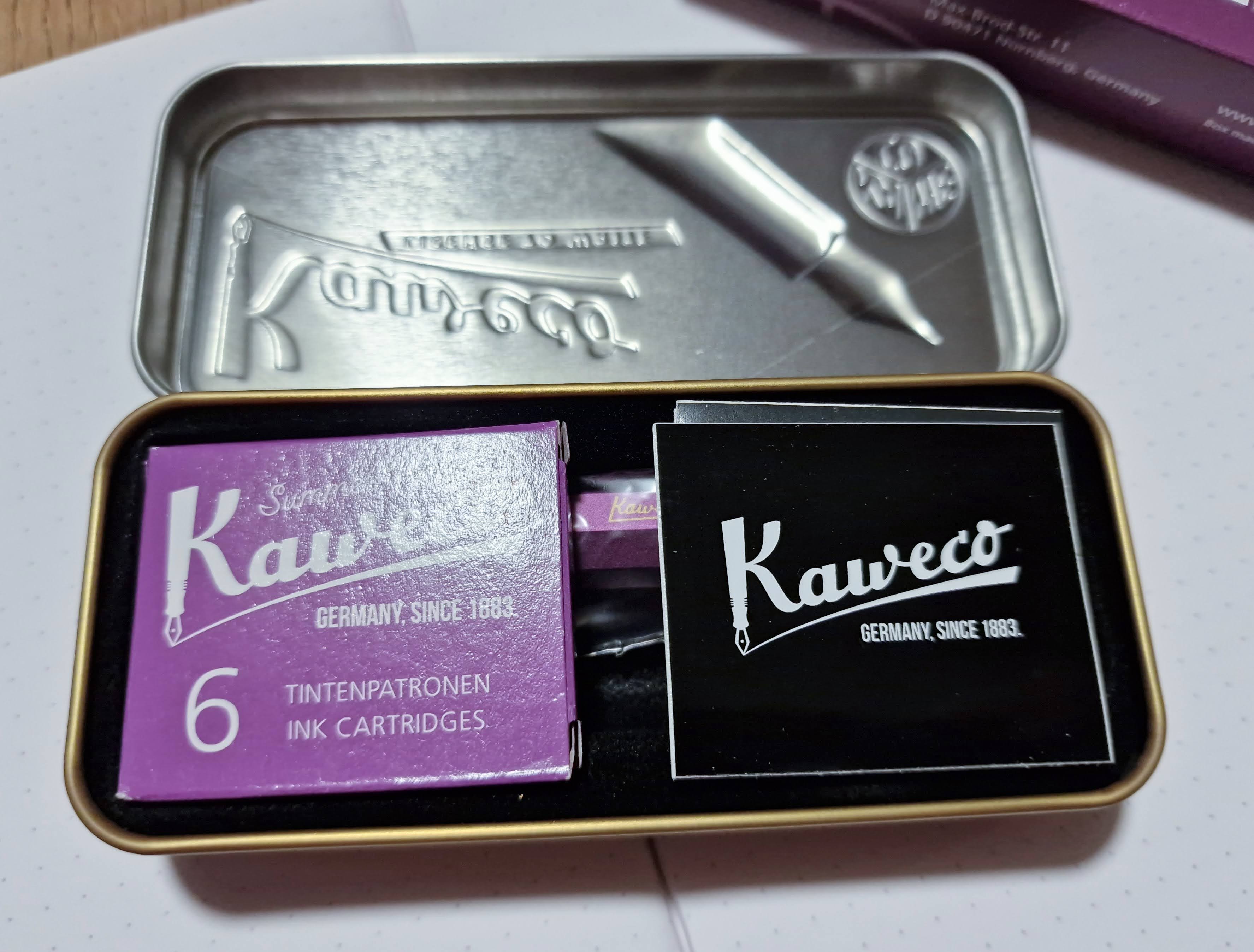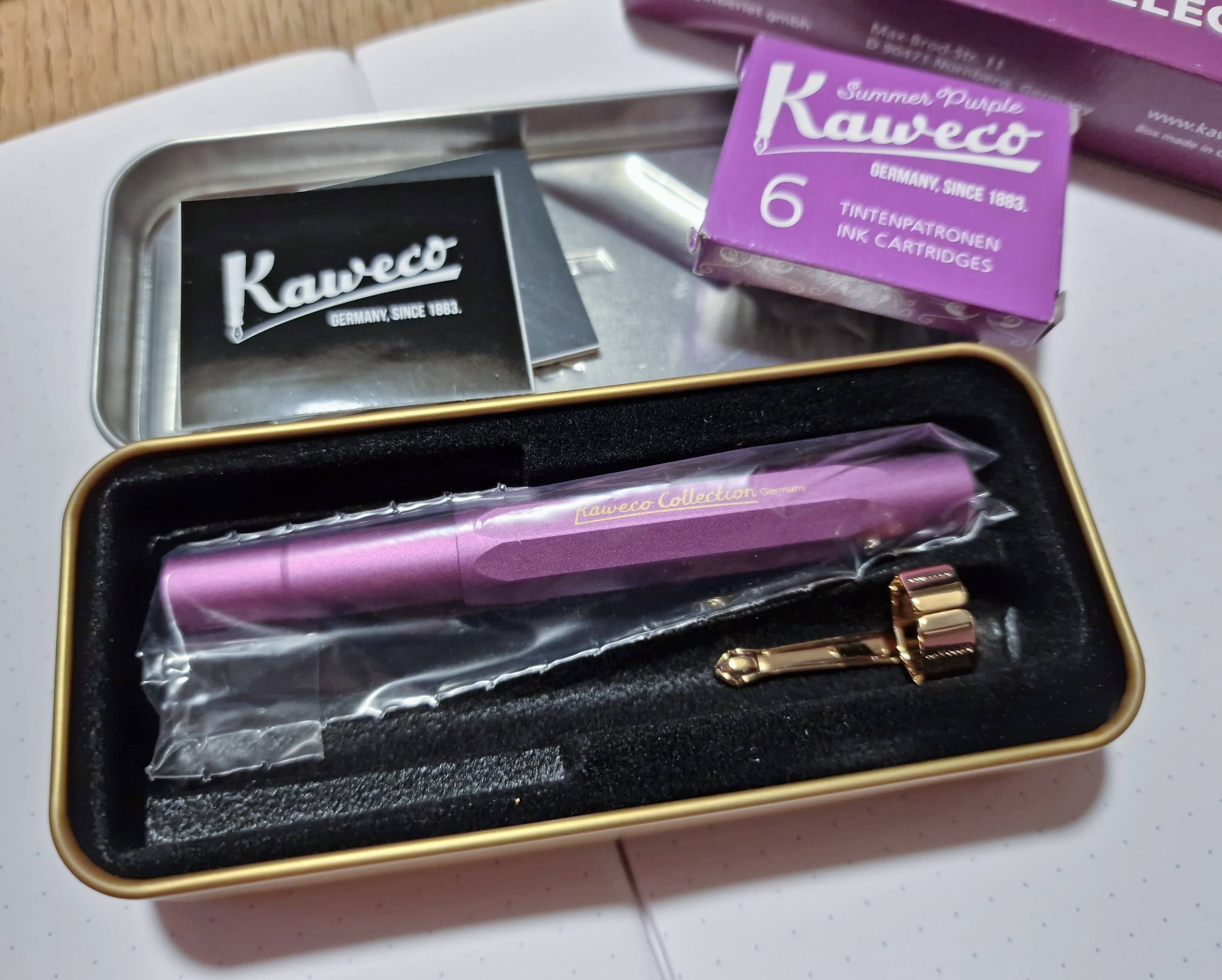 Nella scatola si trova - oltre all'ovvia penna: una confezione di cartucce Kaweco in tinta con la penna, con il bellissimo inchiostro Summer Purple; all'interno della penna si ha una cartuccia di cortesia di inchiostro scuro (nero? blu? blu-nero? non lo so, non ho verificato); la clip in tonalità oro come i trim, nella sua versione "Nostalgic". E le varie carte associate.