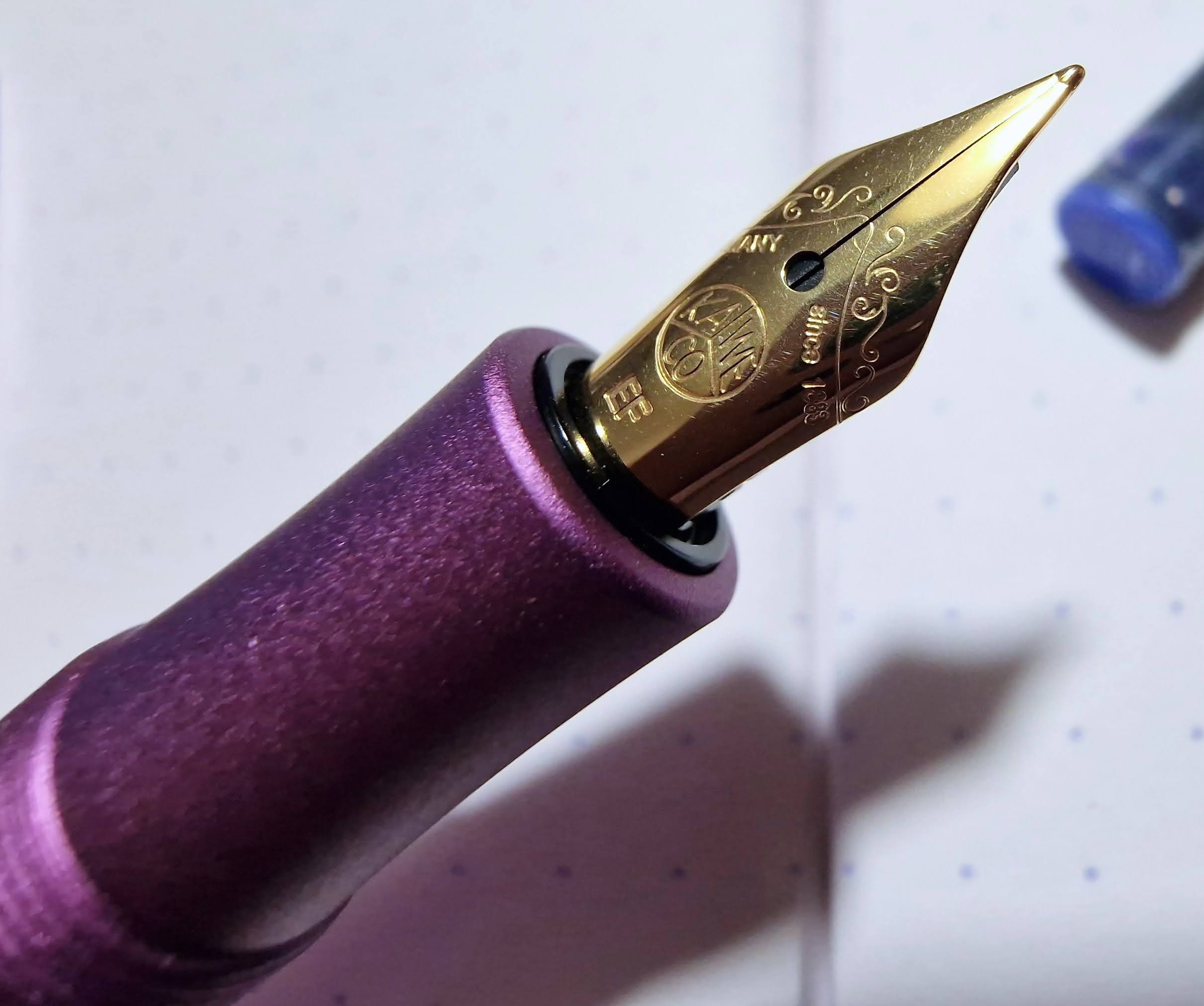 Devo dire che a me è andata bene 2 volte su 2. Questo pennino dorato è estremamente liscio, perfino troppo per i miei gusti. Mi ricorda tantissimo i pennini F di Pilot, scivolosi come saponette. Con la Iridescent ho beccato un pennino meno saponetta... od ho usato inchiostri meno lubrificati. Lo intingerò nello stesso della Violet e verificherò se è l'inchiostro a essere saponato.