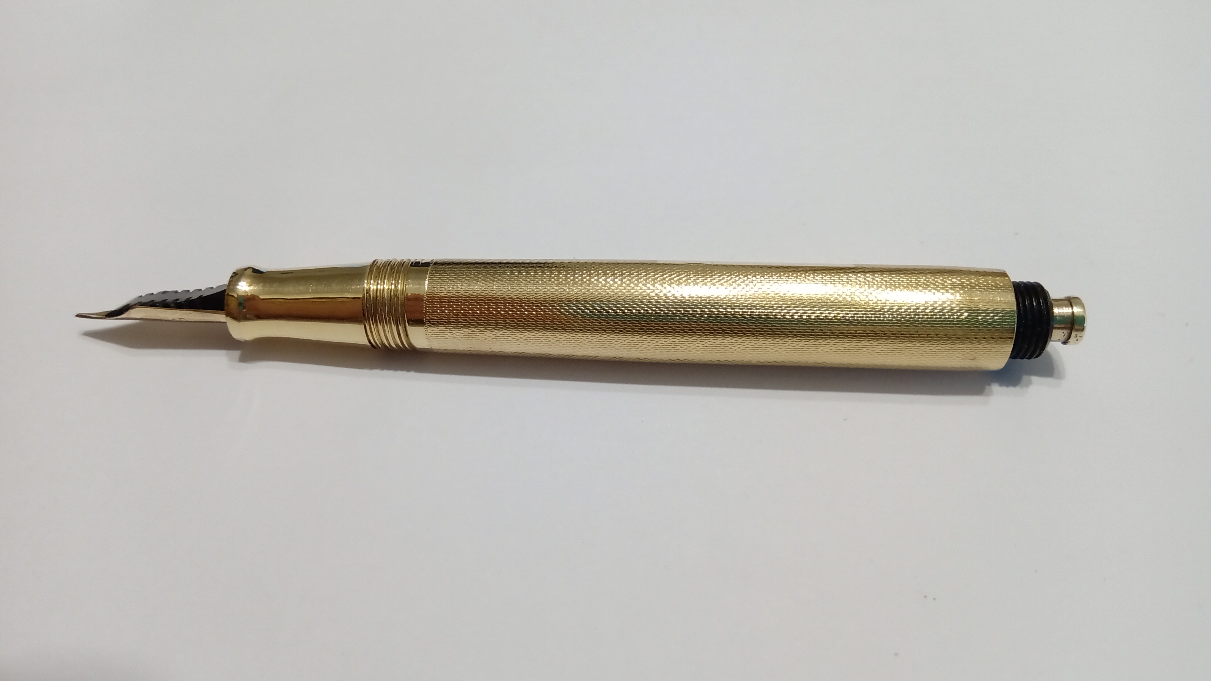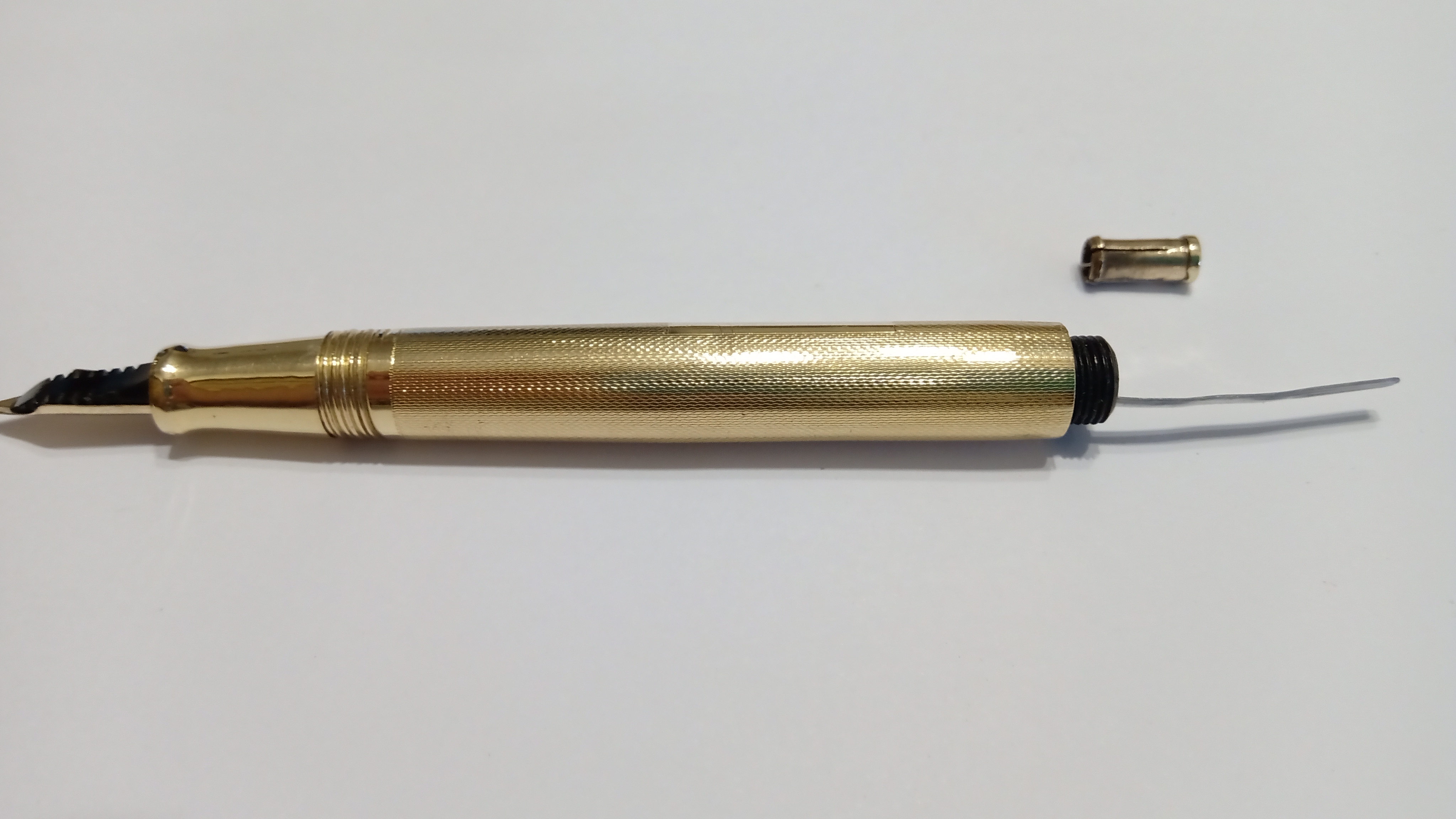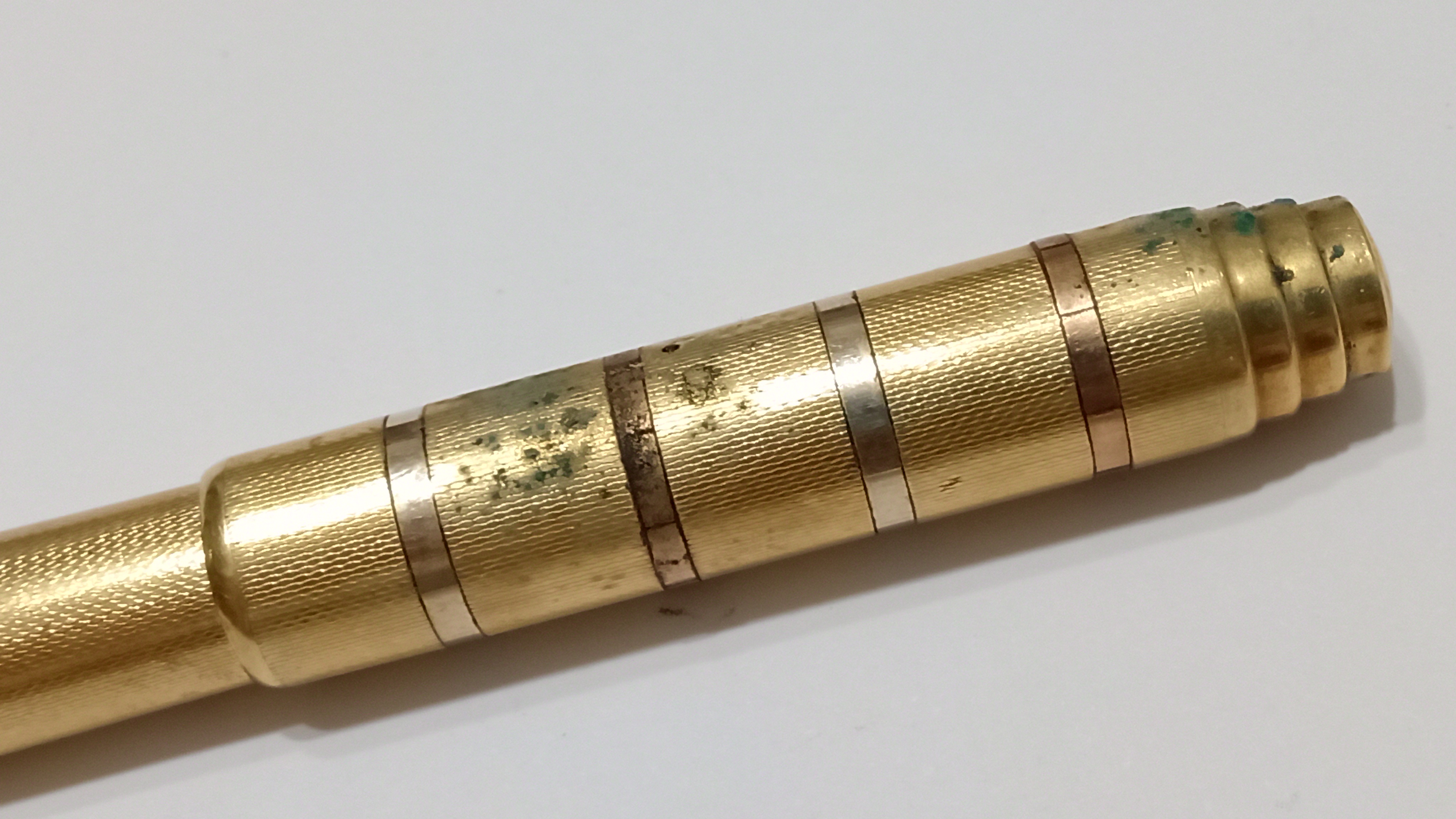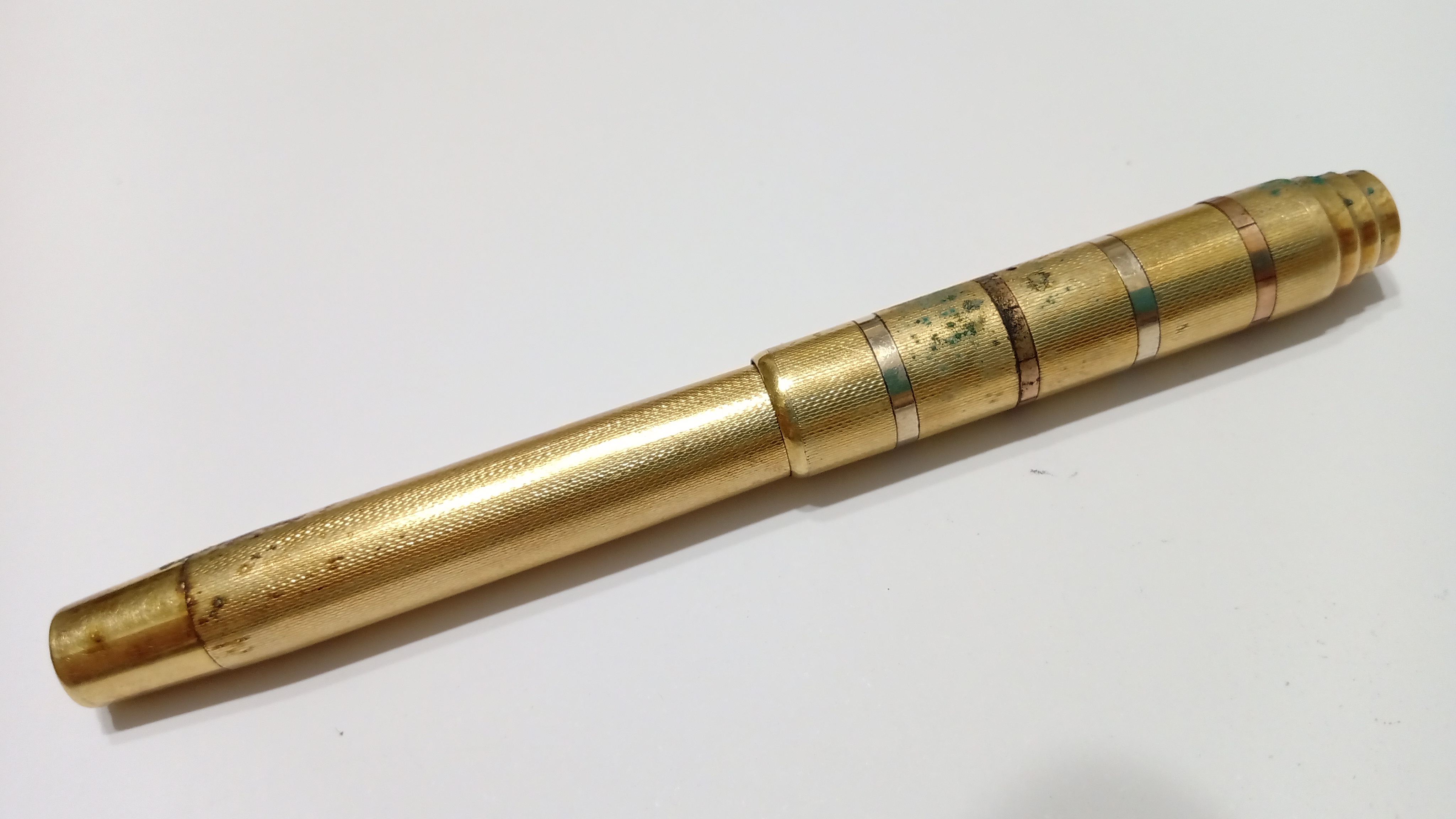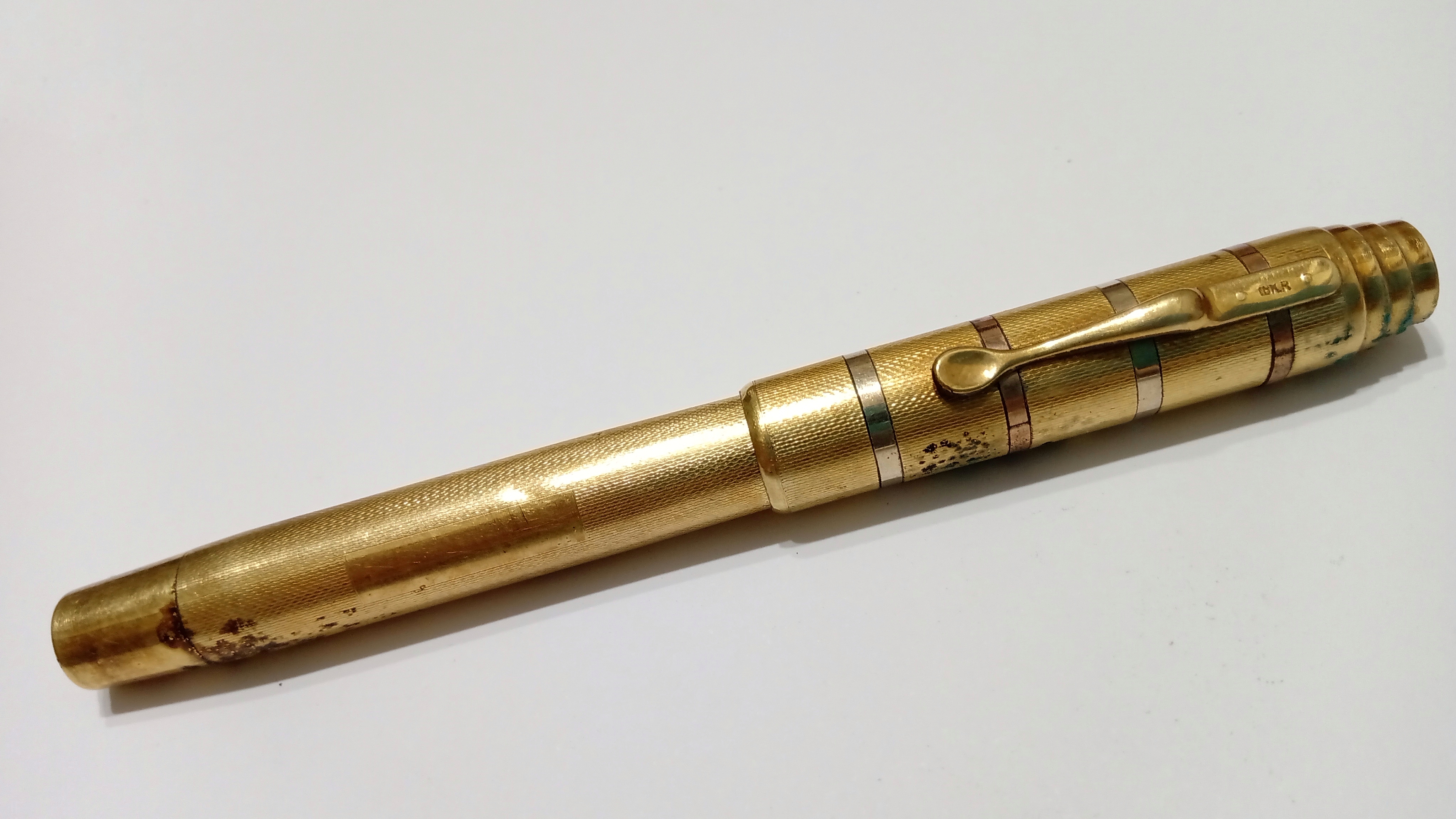 Ho quindi iniziato con un'interessante penna probabilmente realizzata artigianalmente su richiesta, più di settant'anni fa, del tipo All Metal, con caricamento a pulsante, interamente placcata in oro, con clip 18k rivettata del tipo a cucchiaio e cappuccio a vite con intarsi in rame e nichel...