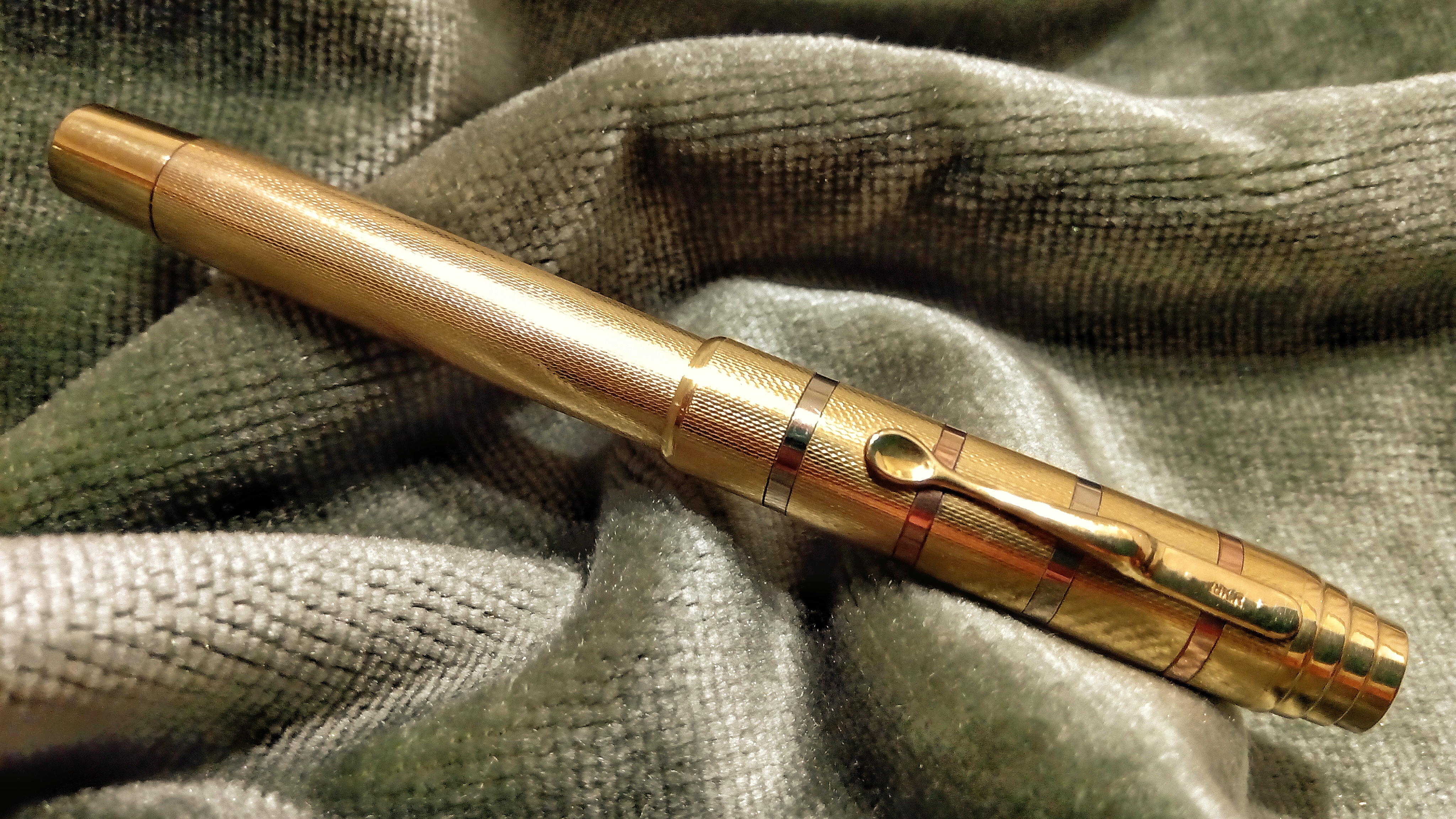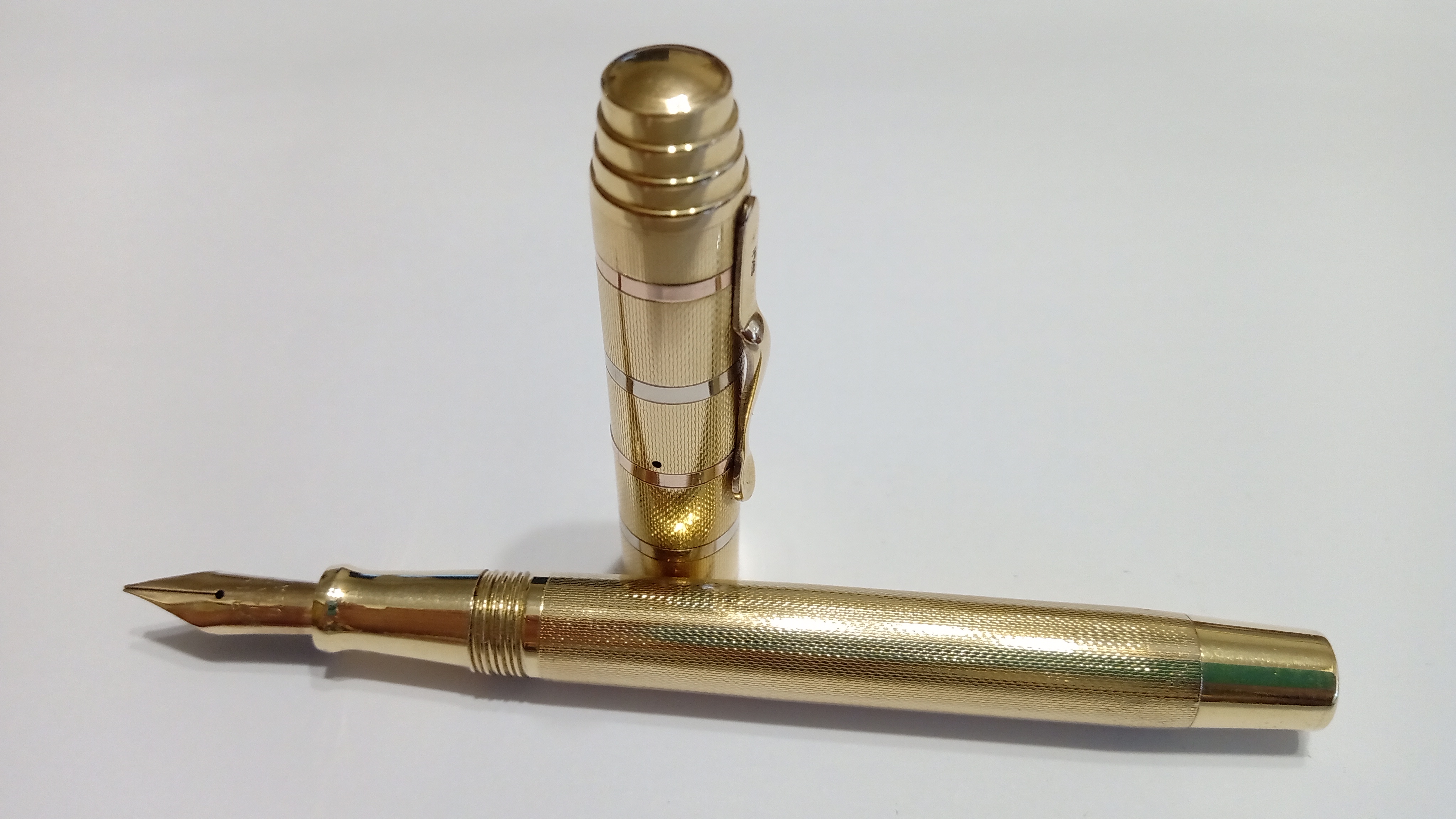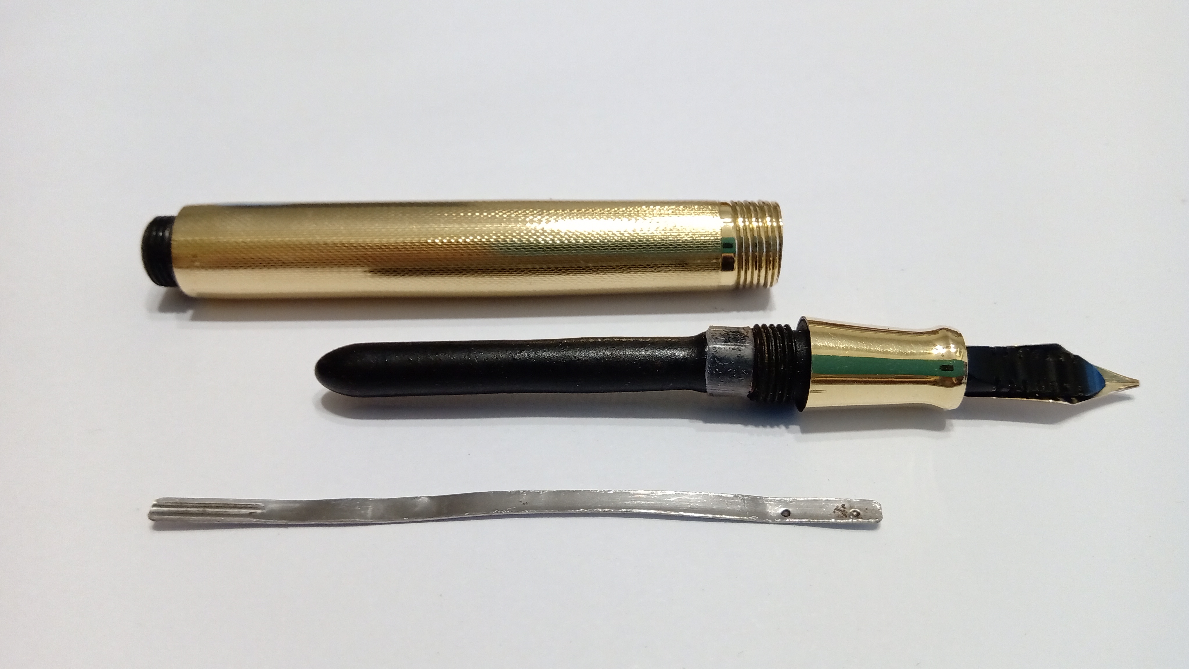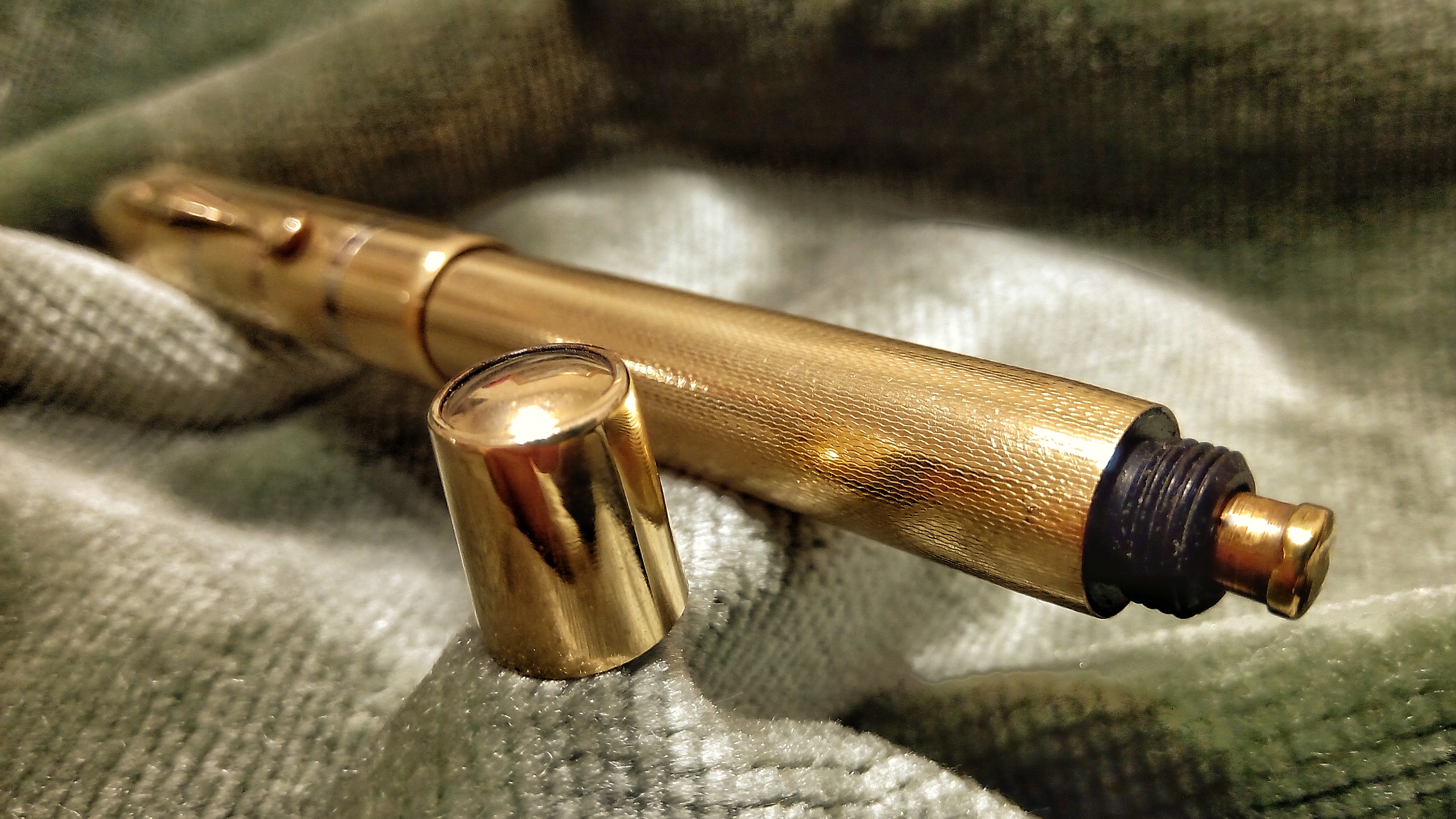 Ho quindi iniziato con un'interessante penna probabilmente realizzata artigianalmente su richiesta, più di settant'anni fa, del tipo All Metal, con caricamento a pulsante, interamente placcata in oro, con clip 18k rivettata del tipo a cucchiaio e cappuccio a vite con intarsi in rame e nichel...
