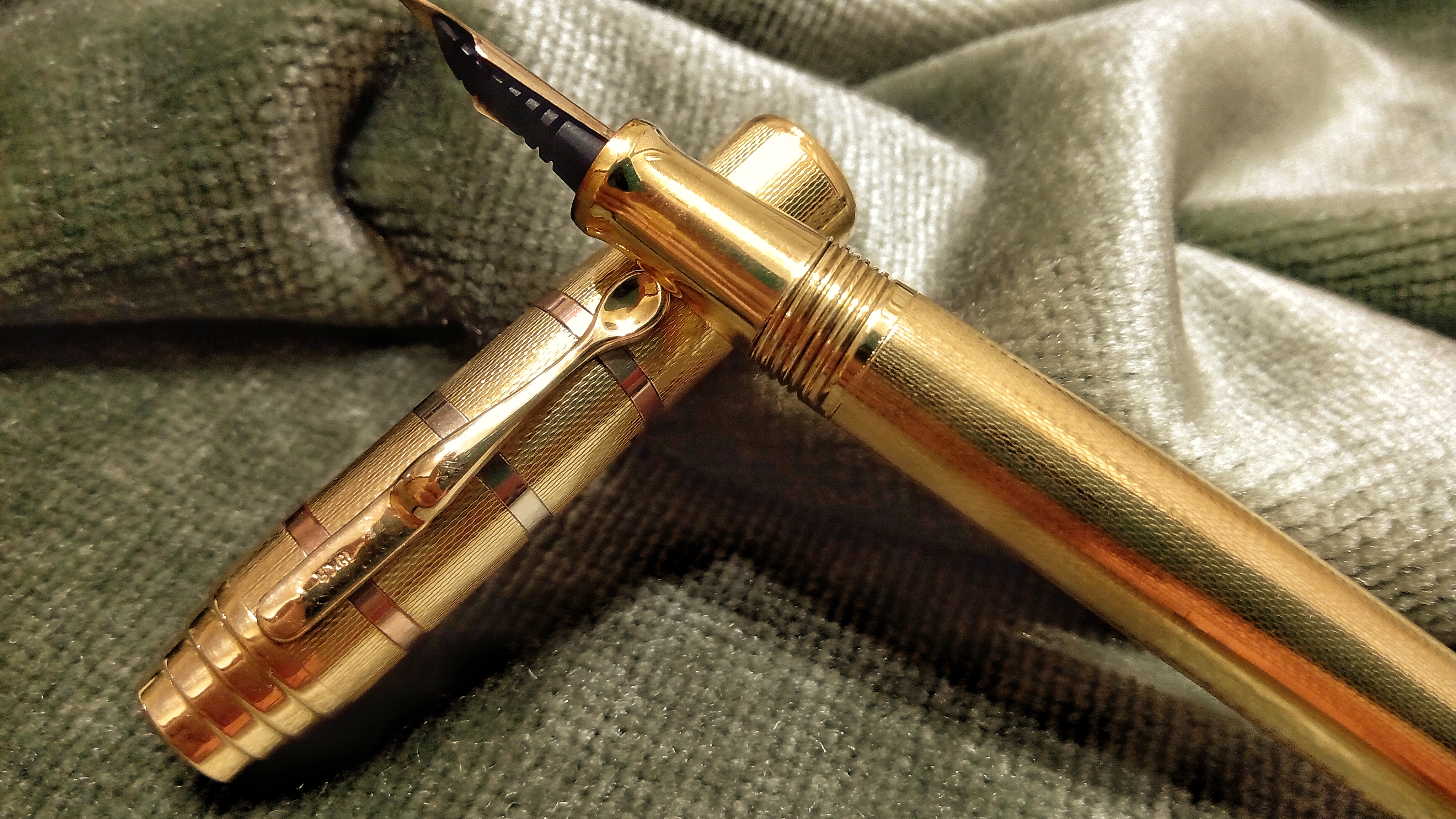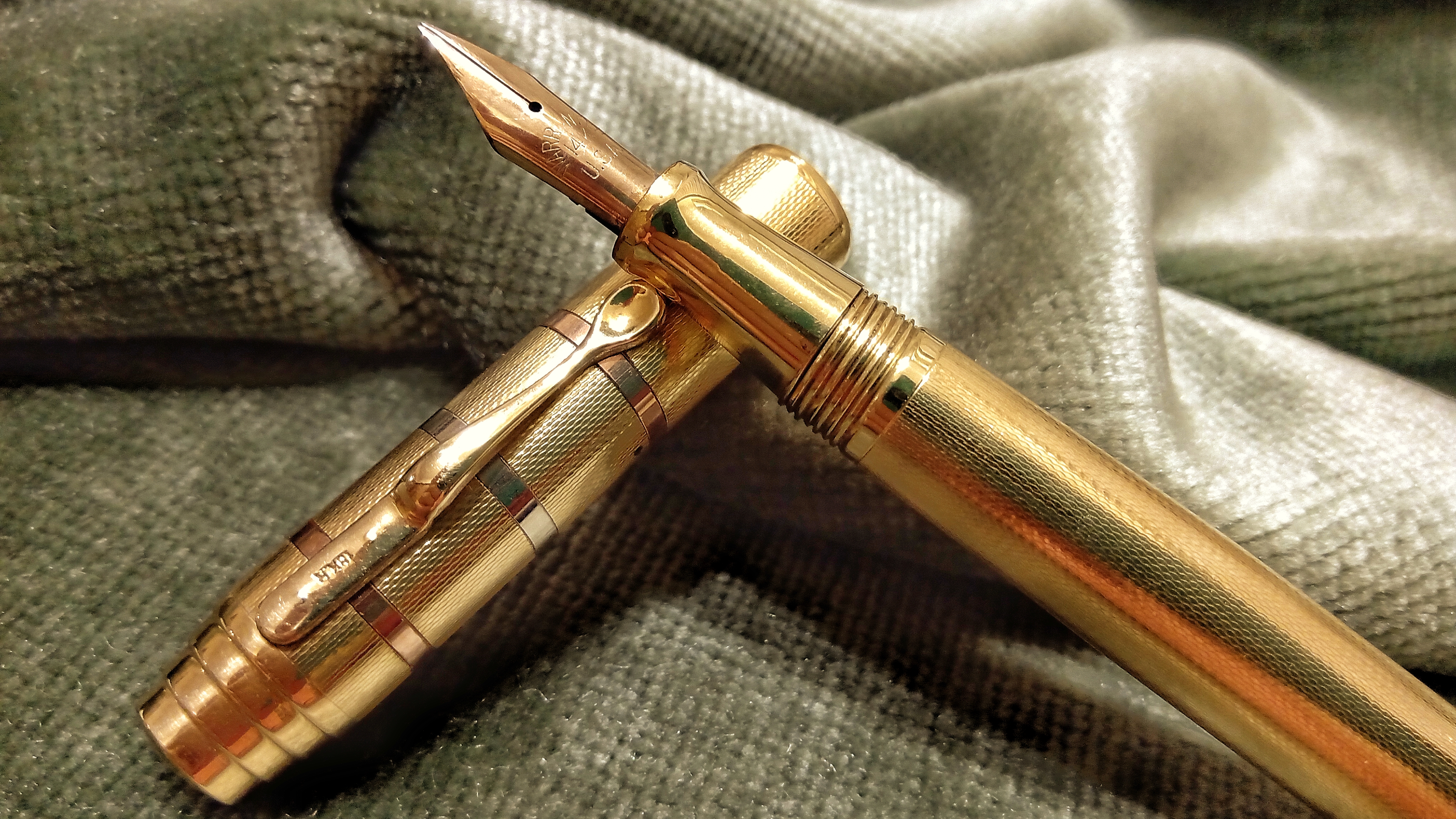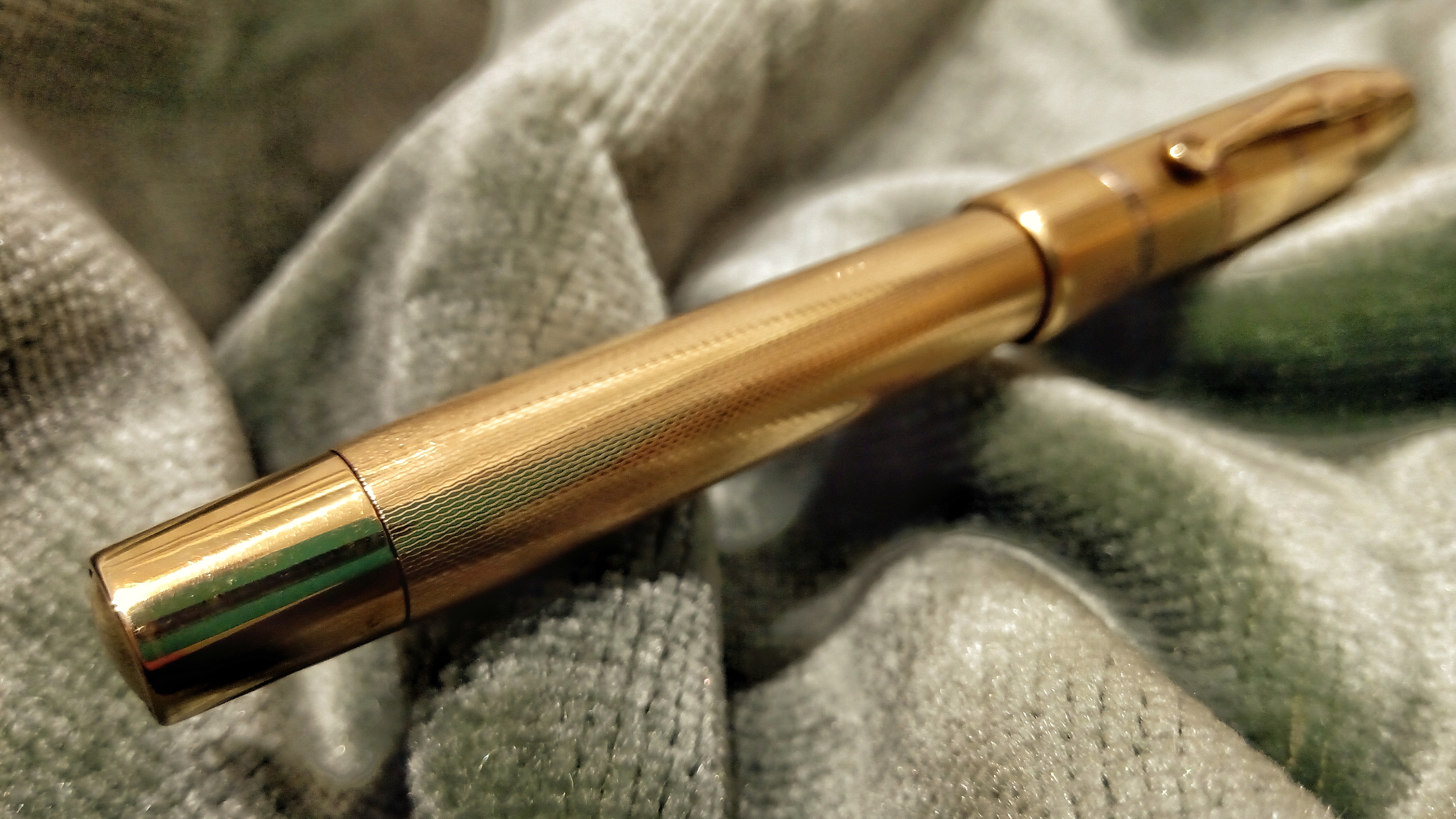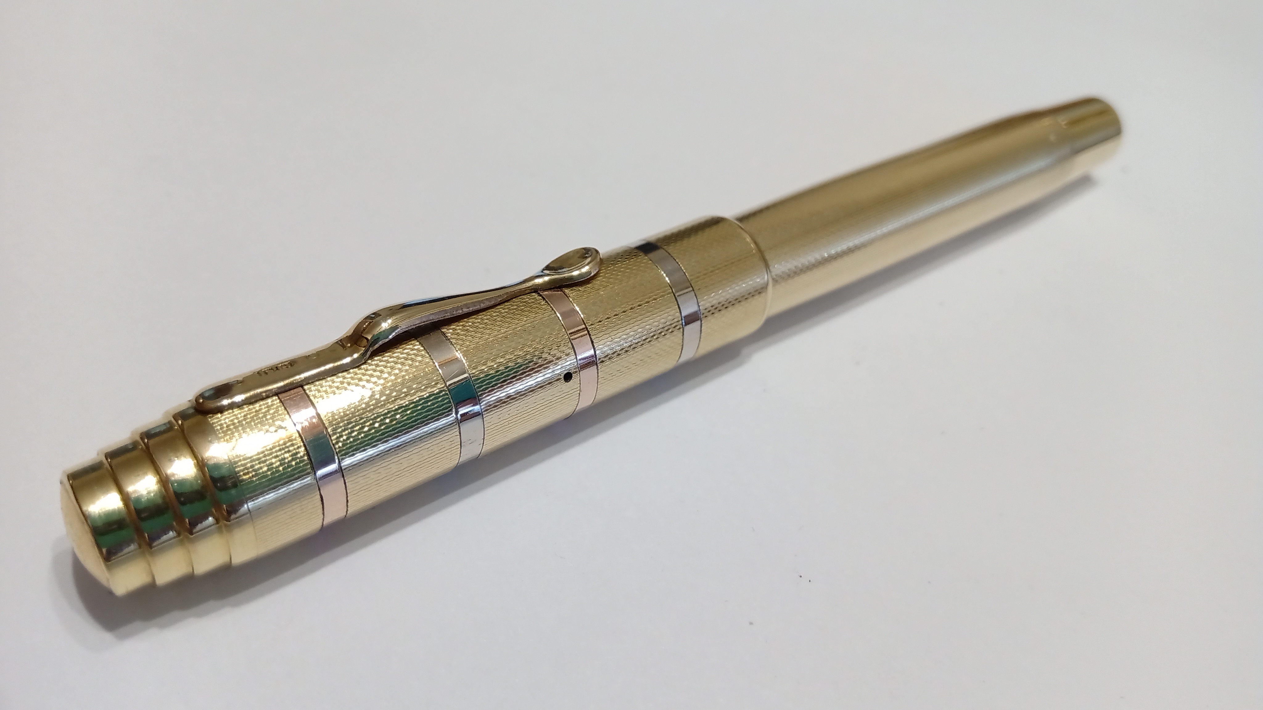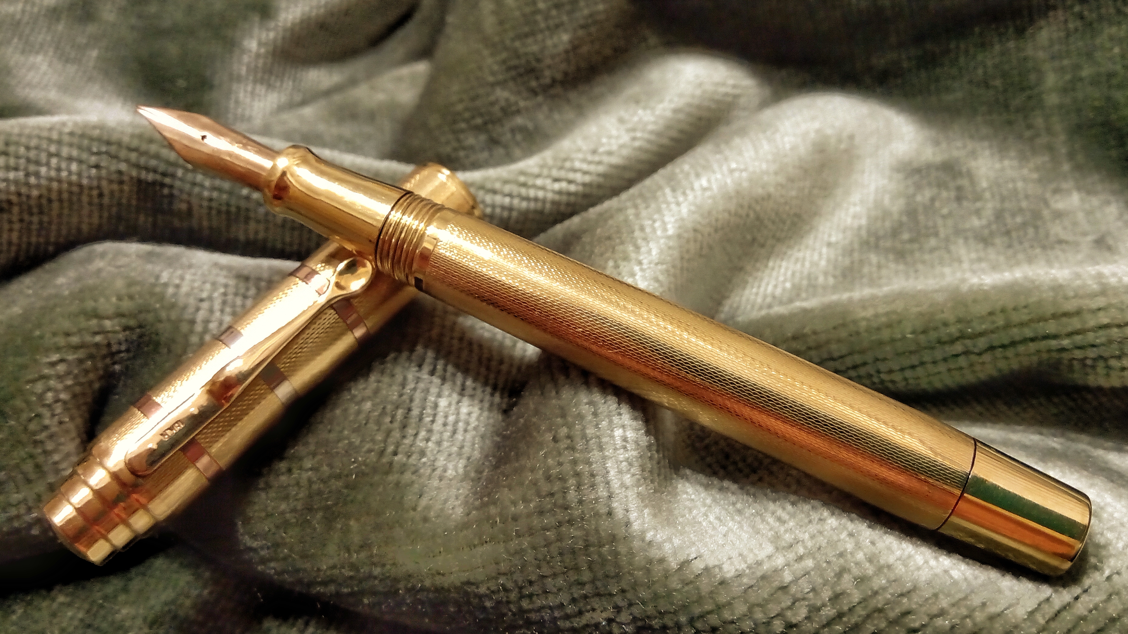 Ho quindi iniziato con un'interessante penna probabilmente realizzata artigianalmente su richiesta, più di settant'anni fa, del tipo All Metal, con caricamento a pulsante, interamente placcata in oro, con clip 18k rivettata del tipo a cucchiaio e cappuccio a vite con intarsi in rame e nichel...