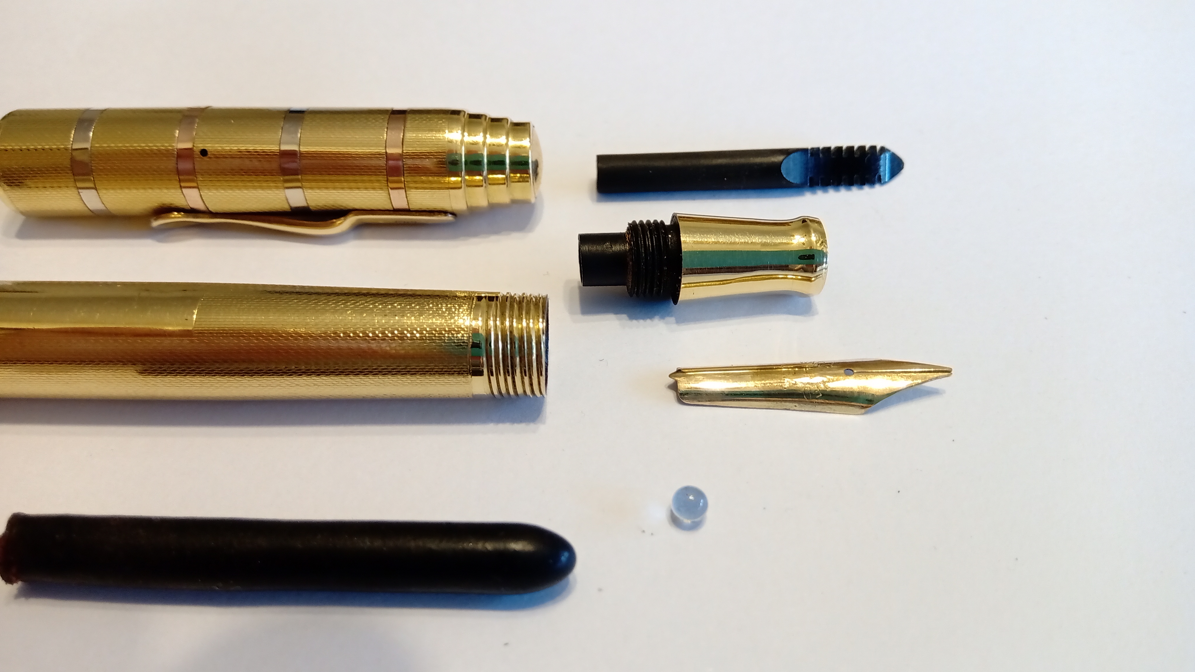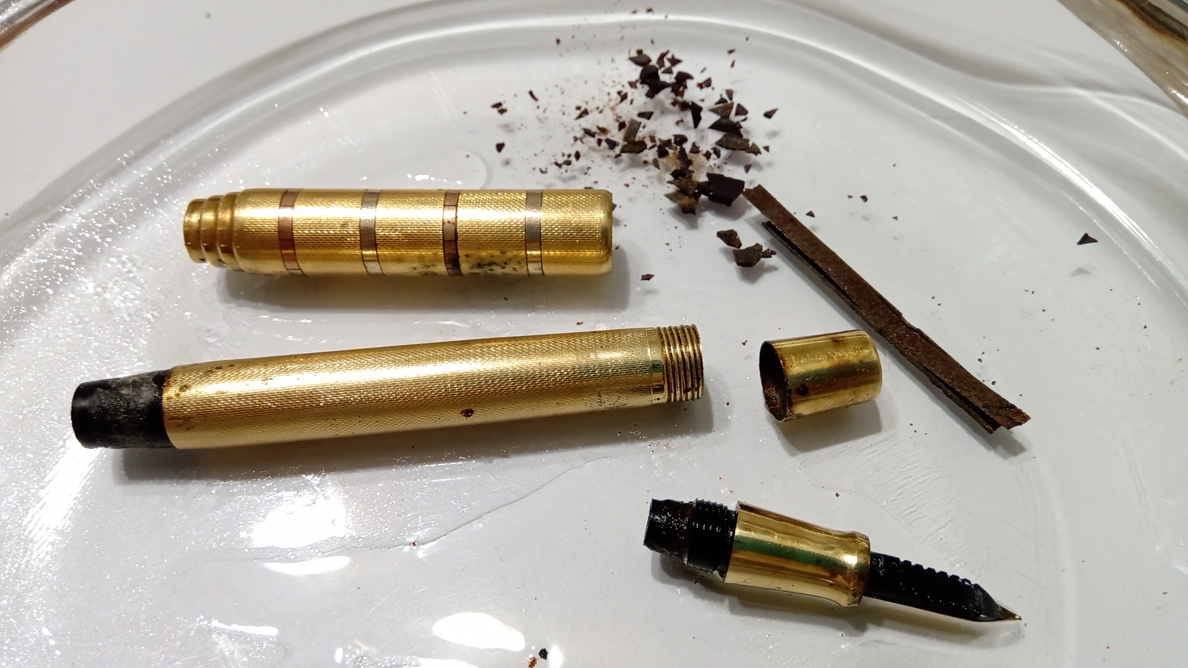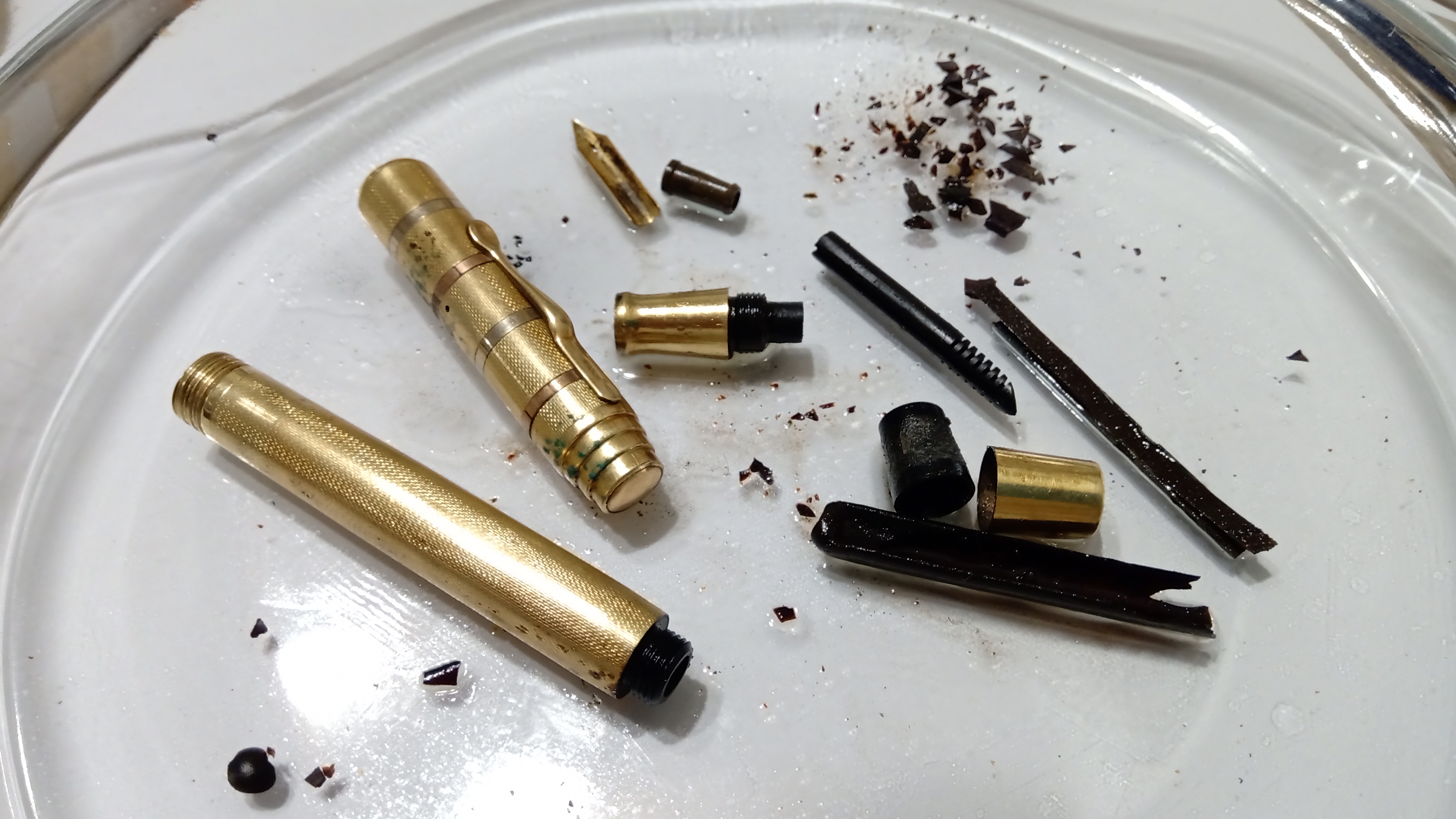 Continuando con il fusto, abbiamo finito di rimuovere il pulsante e smontato dalla impugnatura il pennino e l'alimentatore. Il sacco di lattice era completamente cristallizzato e si stava polverizzando...