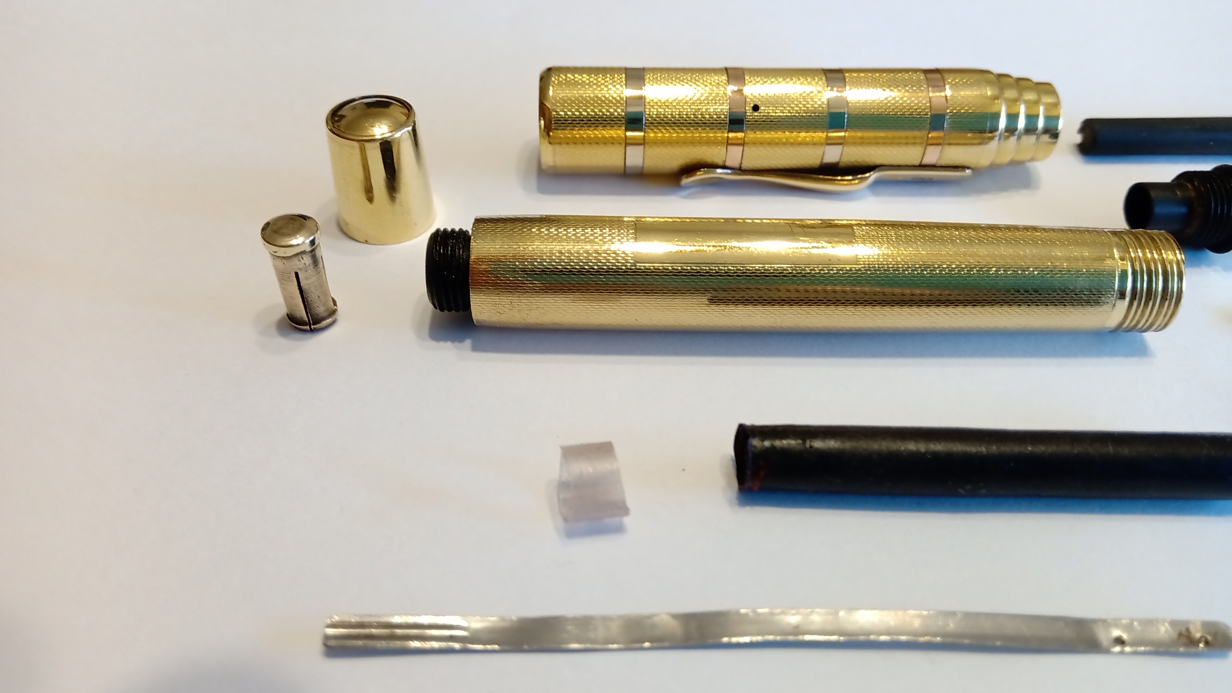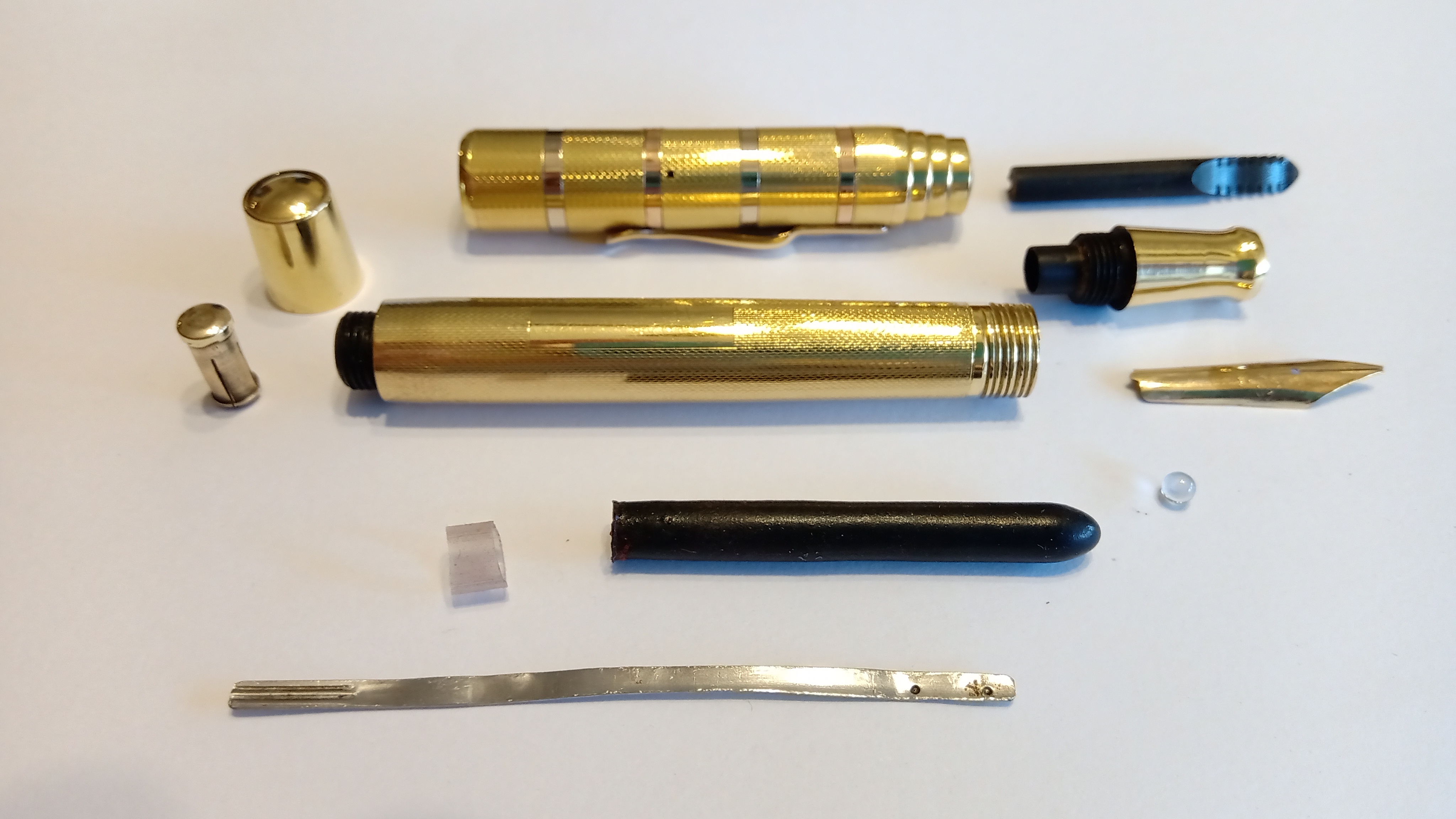 Una volta rifinite le superfici, lucidato il pulsante e la clip, rimesso a posto e cementato il rivestimento sul coperchio cieco, e scelto il sacco di inchiostro da utilizzare, abbiamo già i pezzi per iniziare l'assemblaggio...