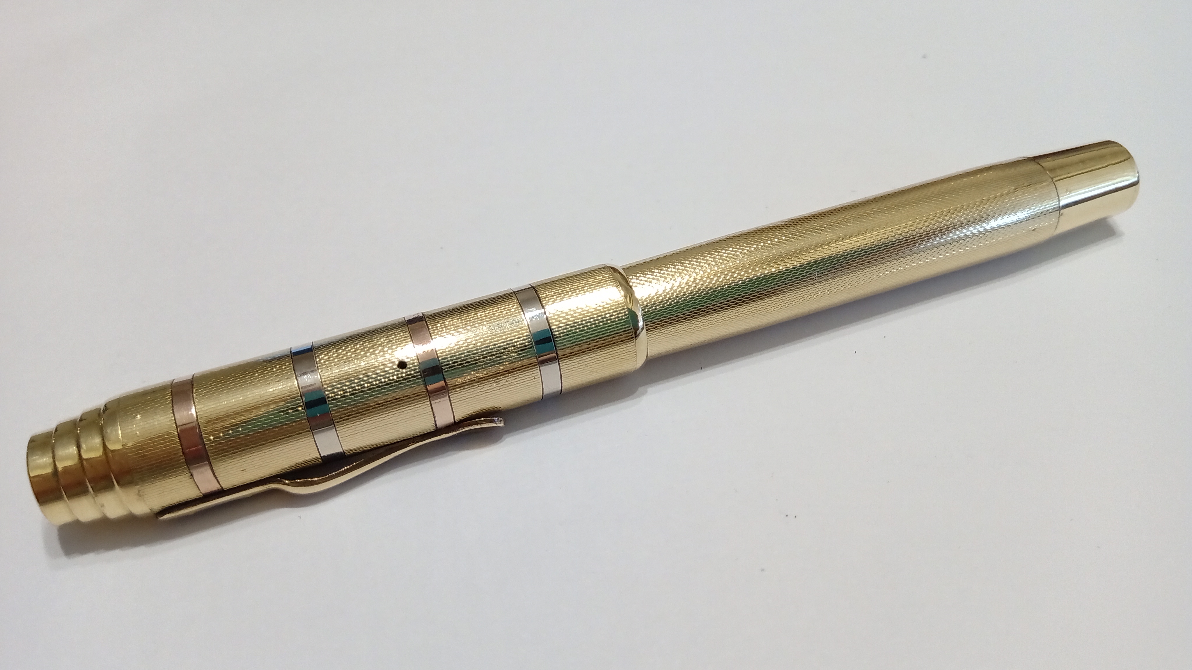 Comencé entonces por una interesante pluma probablemente fabricada artesanalmente a pedido, hace más de setenta años, del tipo All Metal, con carga a pulsante, totalmente bañada en oro, con clip 18k remachado del tipo cuchara, y un capuchón a rosca con incrustaciones en cobre y níquel...