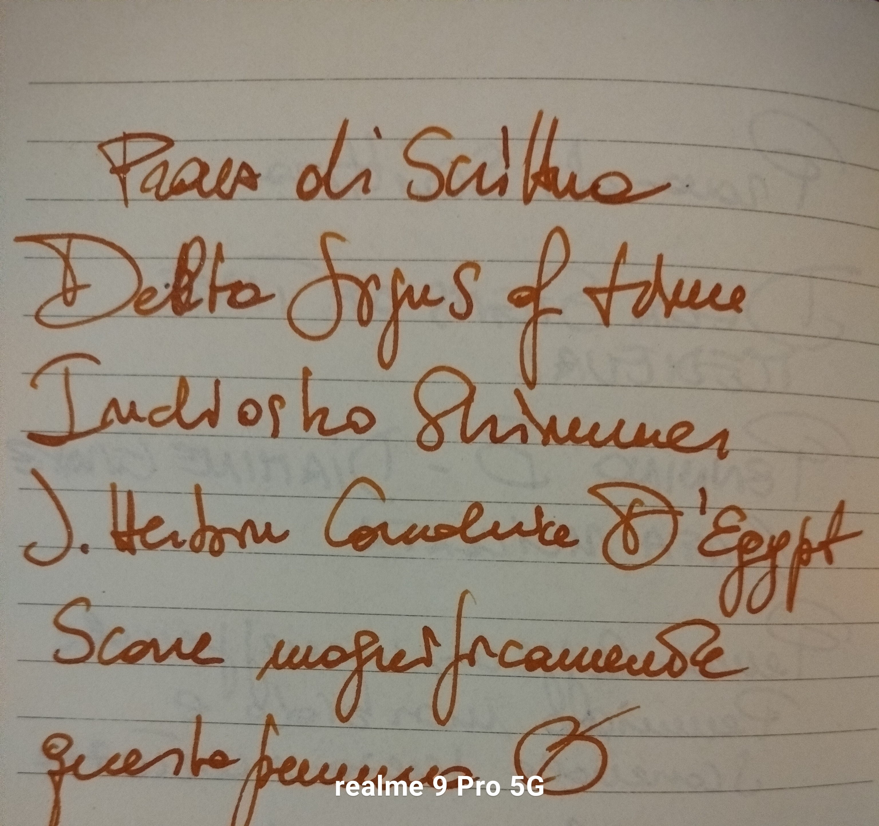 Dopo tanto tempo mi accingo nuovamente a una recensione. Si tratta del modello "Medieval" della nuova serie Segni del Tempo della Delta. La penna è contenuta in un piccolo scatolo di cartone leggero. Al suo interno troviamo anche la brochure su tutta la serie. La penna è dotata di converter. Esteticamente mi piace molto, ricorda le vetrate gotiche con il gioco di colori scuri. Ho preso un pennino B, risultato morbido e scorrevole. Penna leggera e maneggevole, della giusta lunghezza e peso, almeno per le mie mani. Il cappuccio calzato non comporta nessuno squilibrio. Allego le foto della penna e di due prove di scrittura: stessa carta, due inchiostri diversi, di cui uno shimmer lo splendido J.Herbin Cornaline d'Egypte (con tanto di particolare)