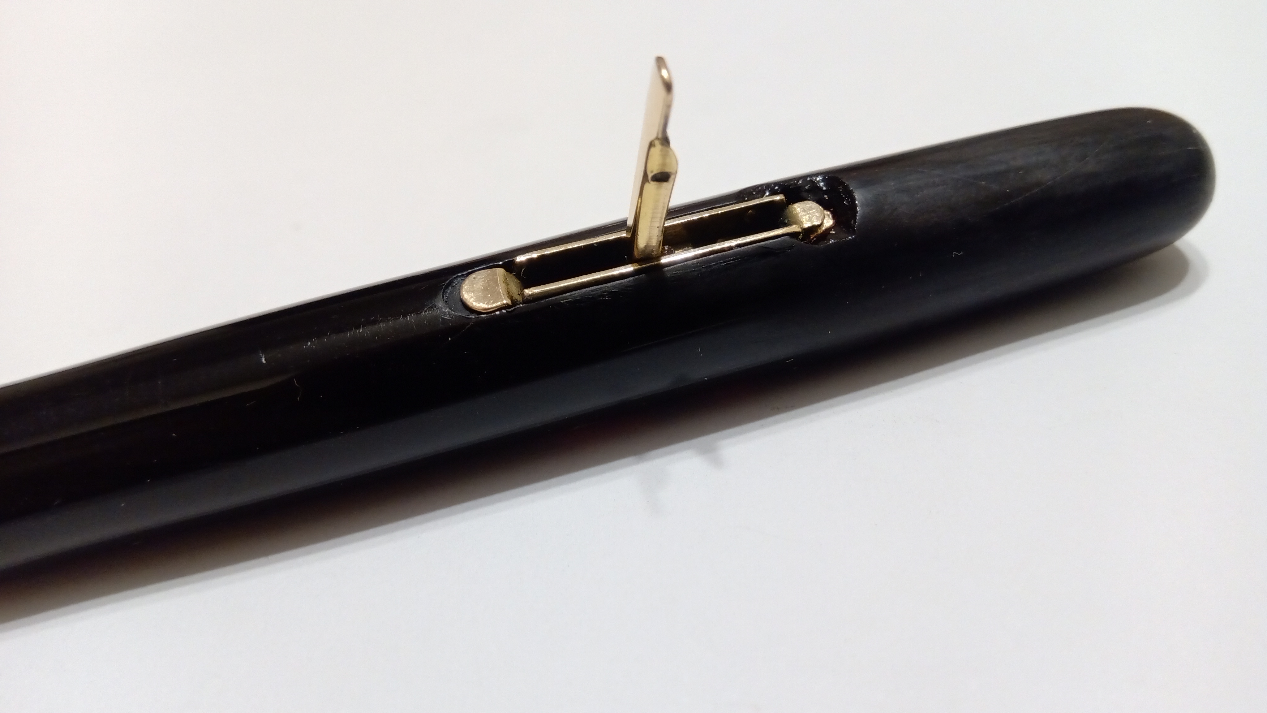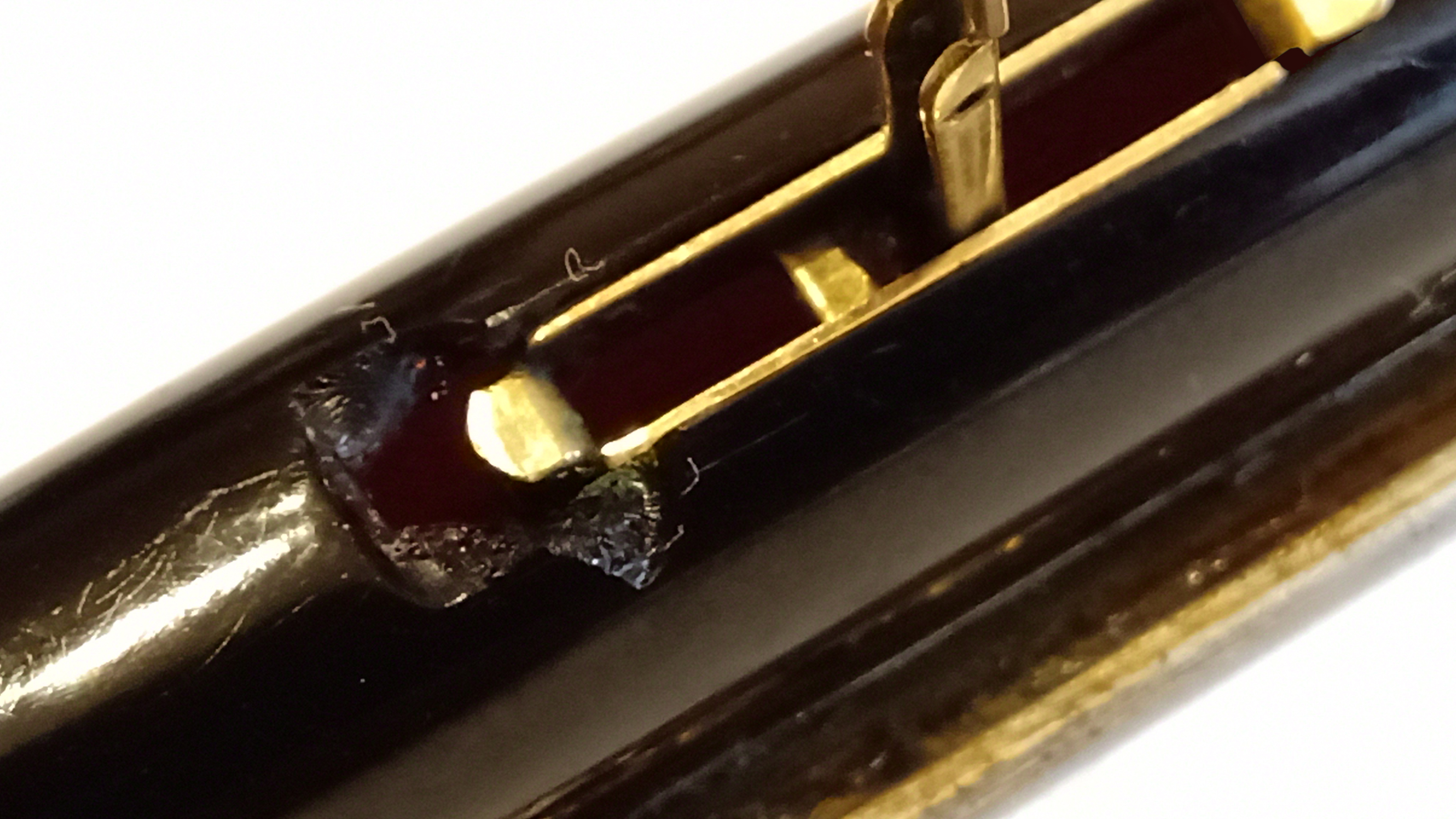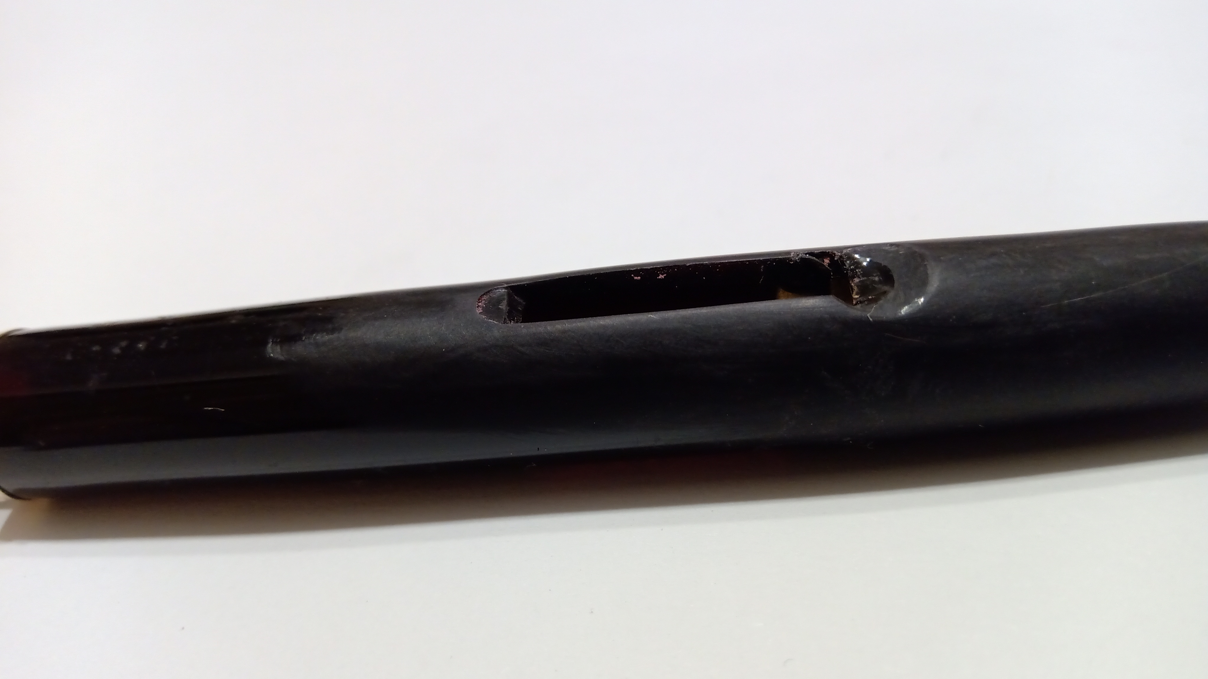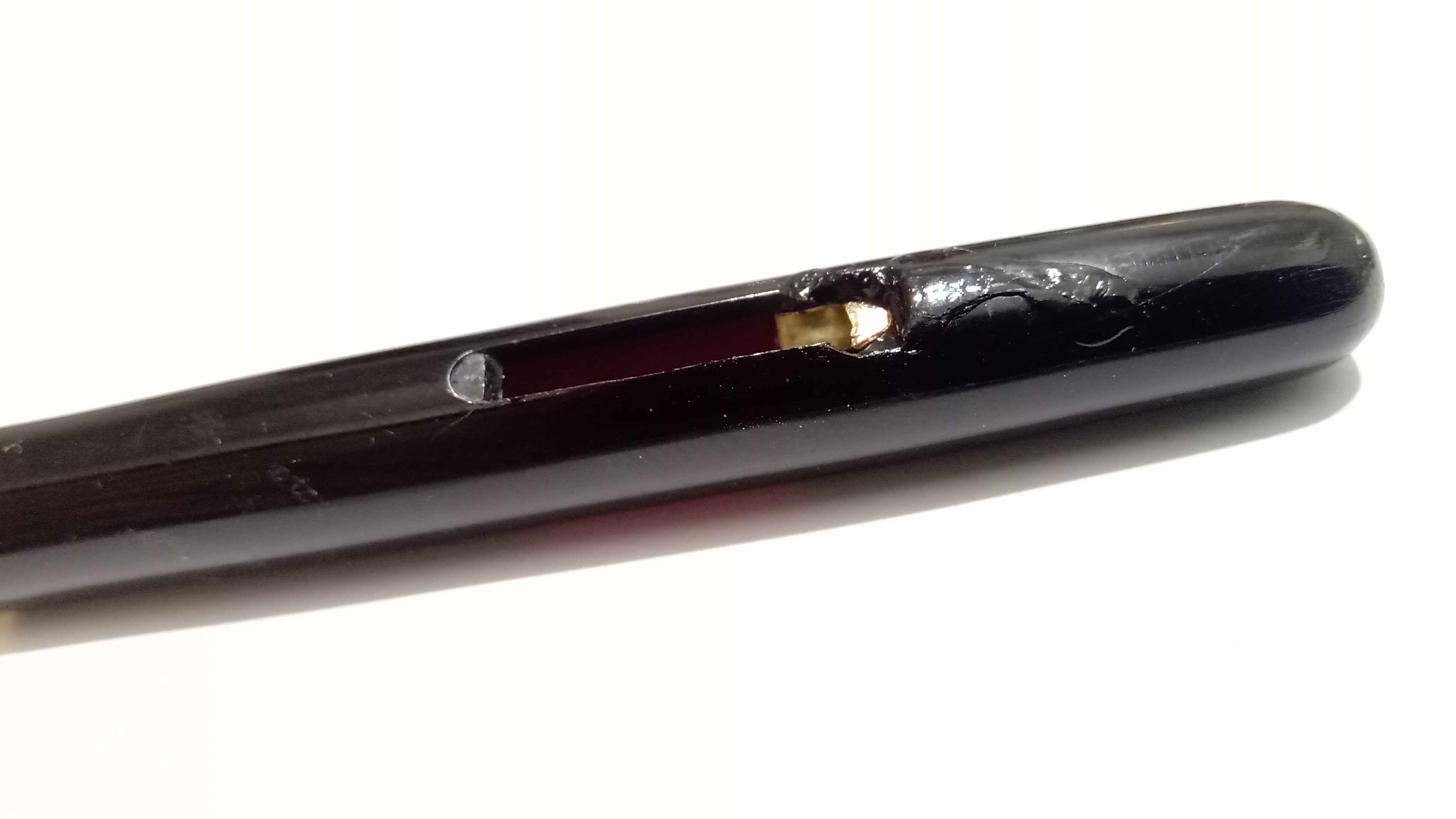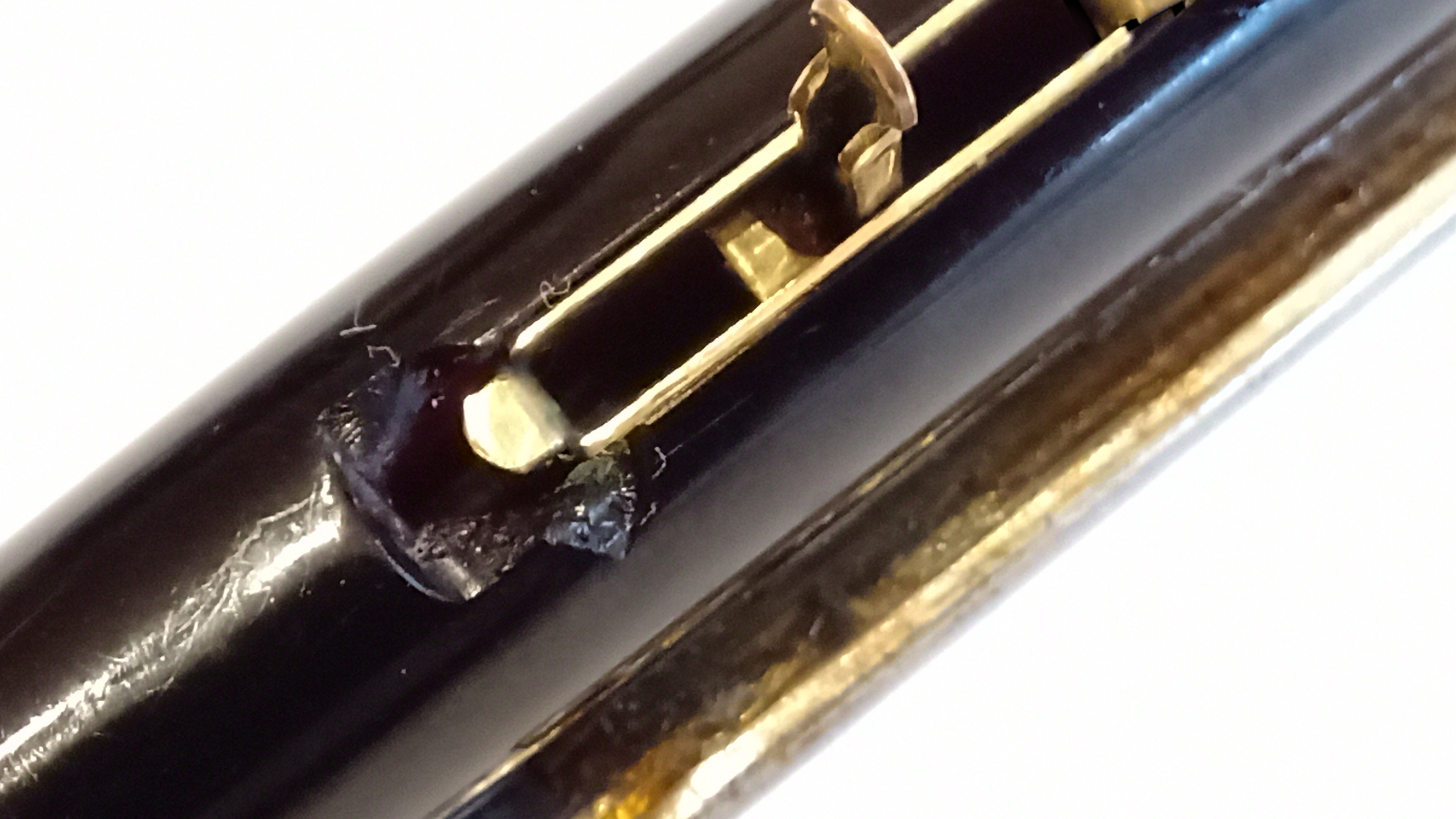 con una pequeña rotura que al subir la palanca muestra que se ha forzado el mecanismo, haciendo que la solapa de anclaje de la canasta se cargara el anclaje de celuloide del barril, y como levemente puede observarse, comenzaran también a crearse rajaduras que nacen en esos puntos de anclaje...
