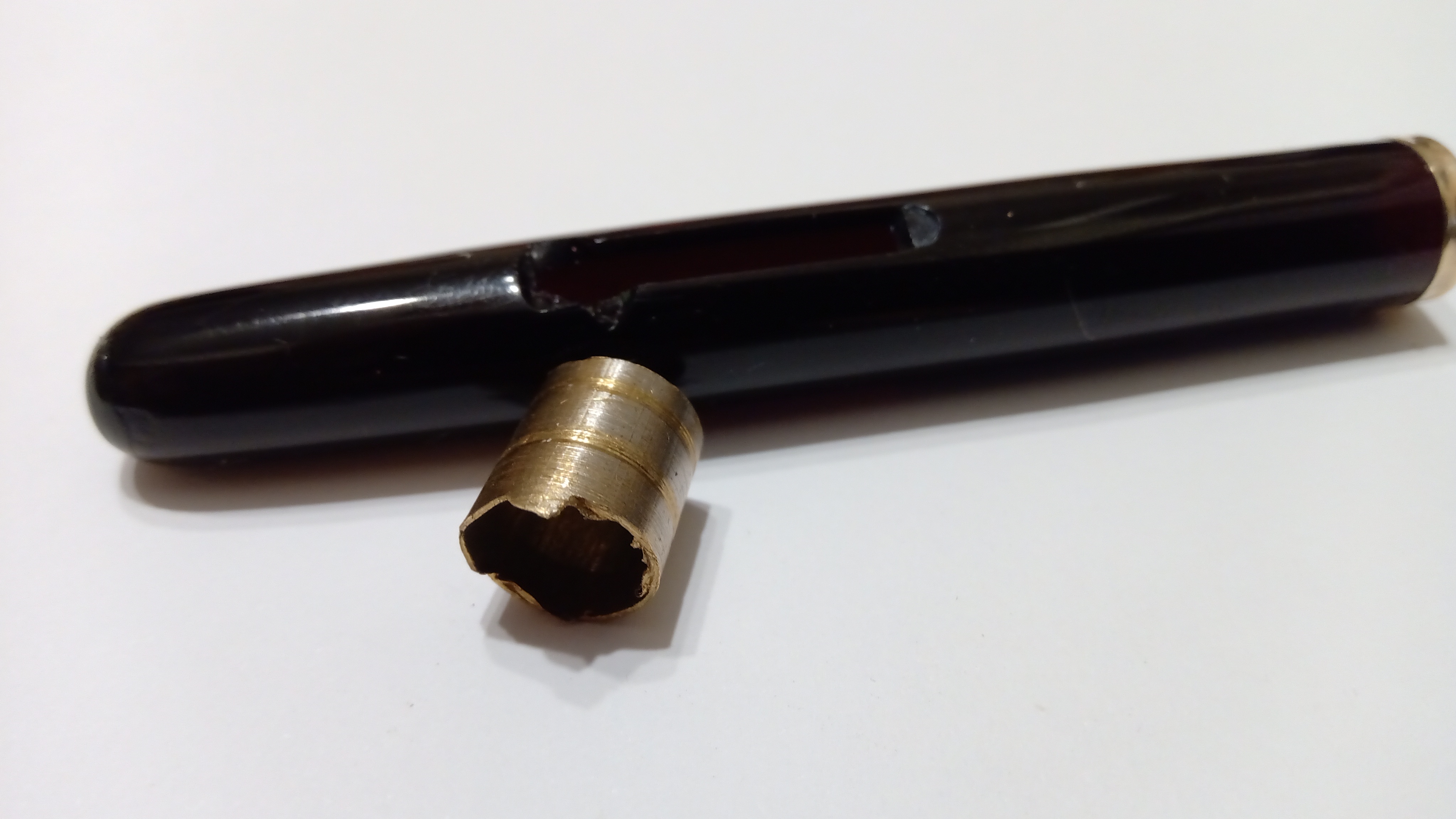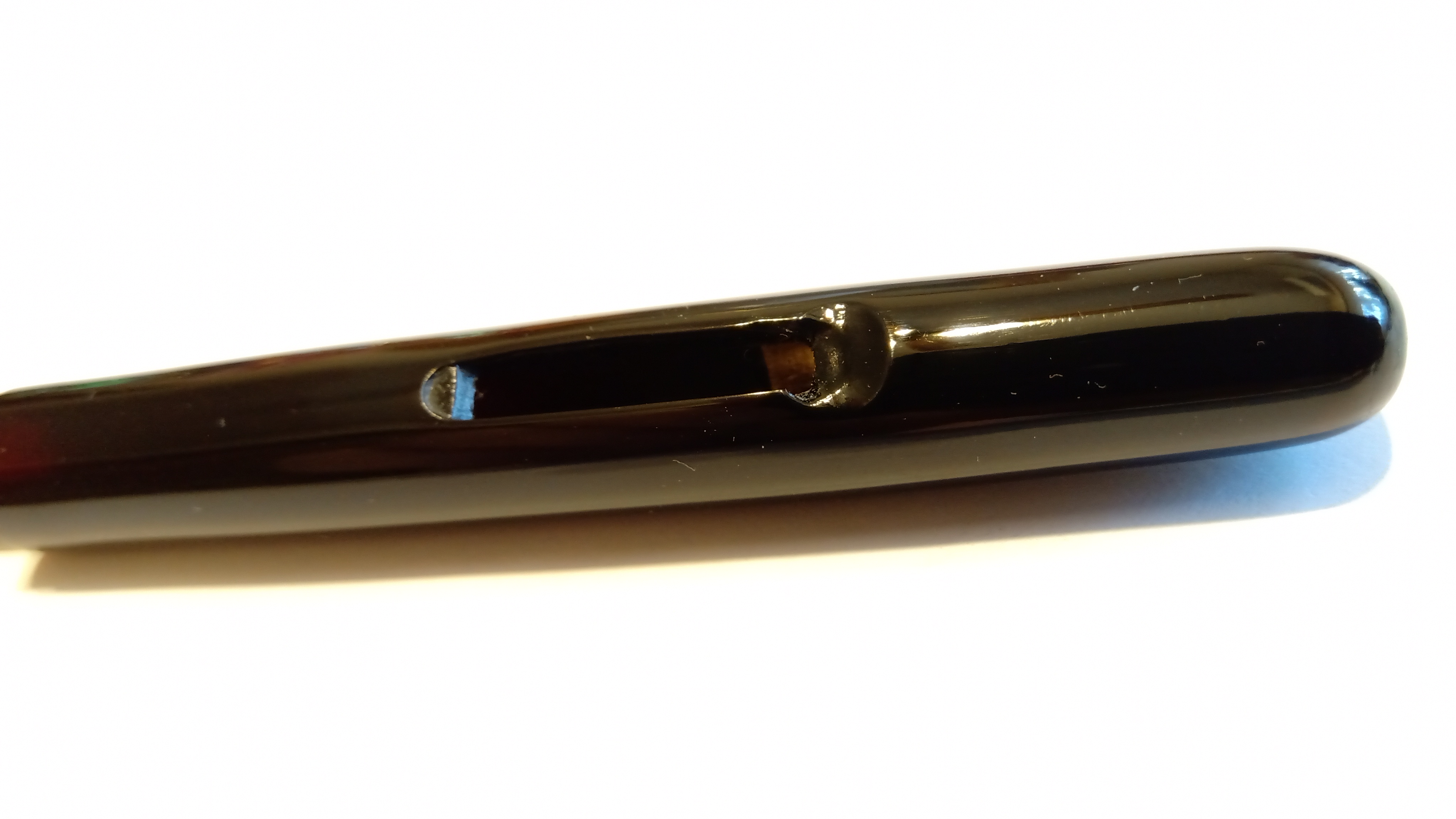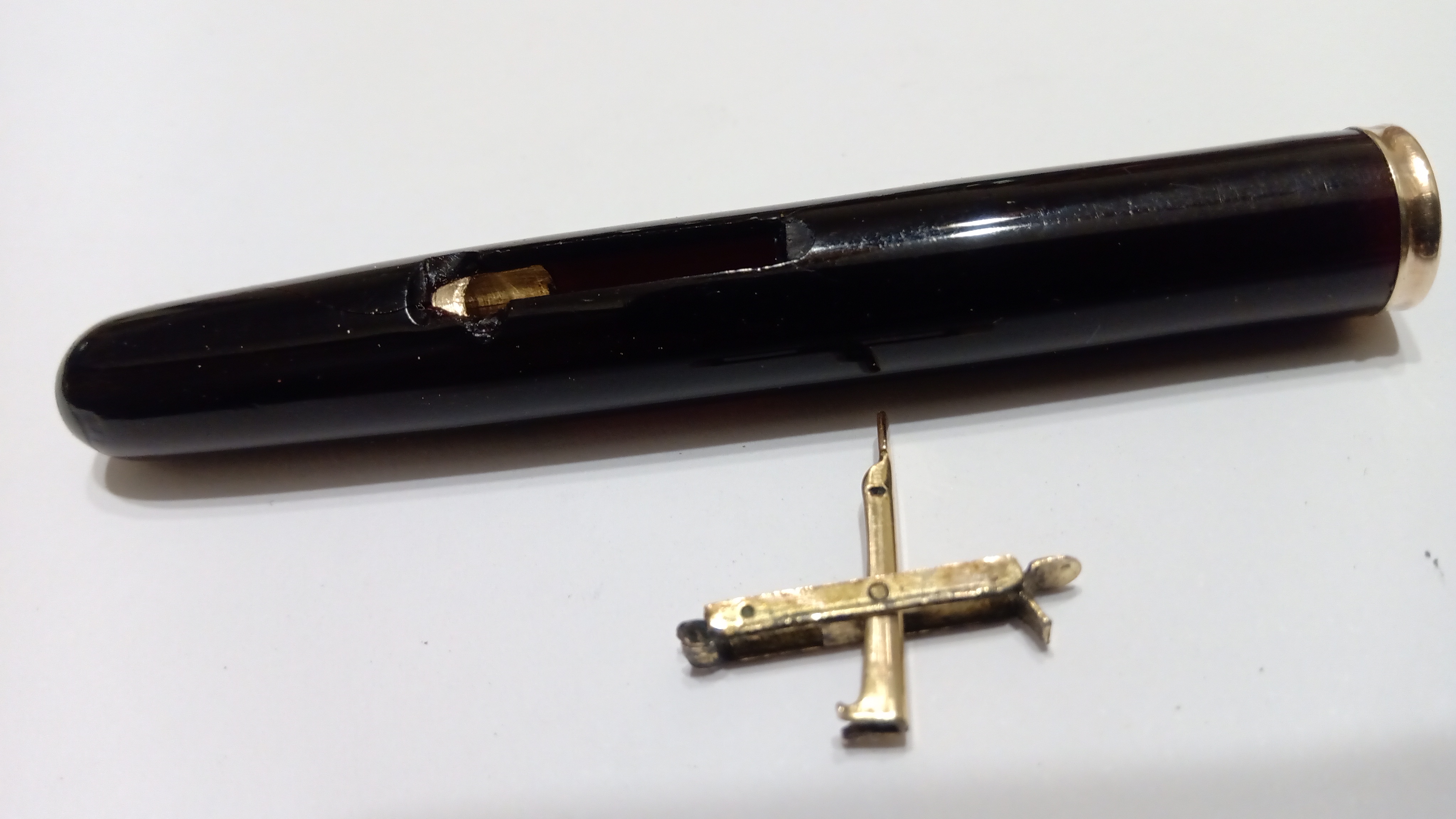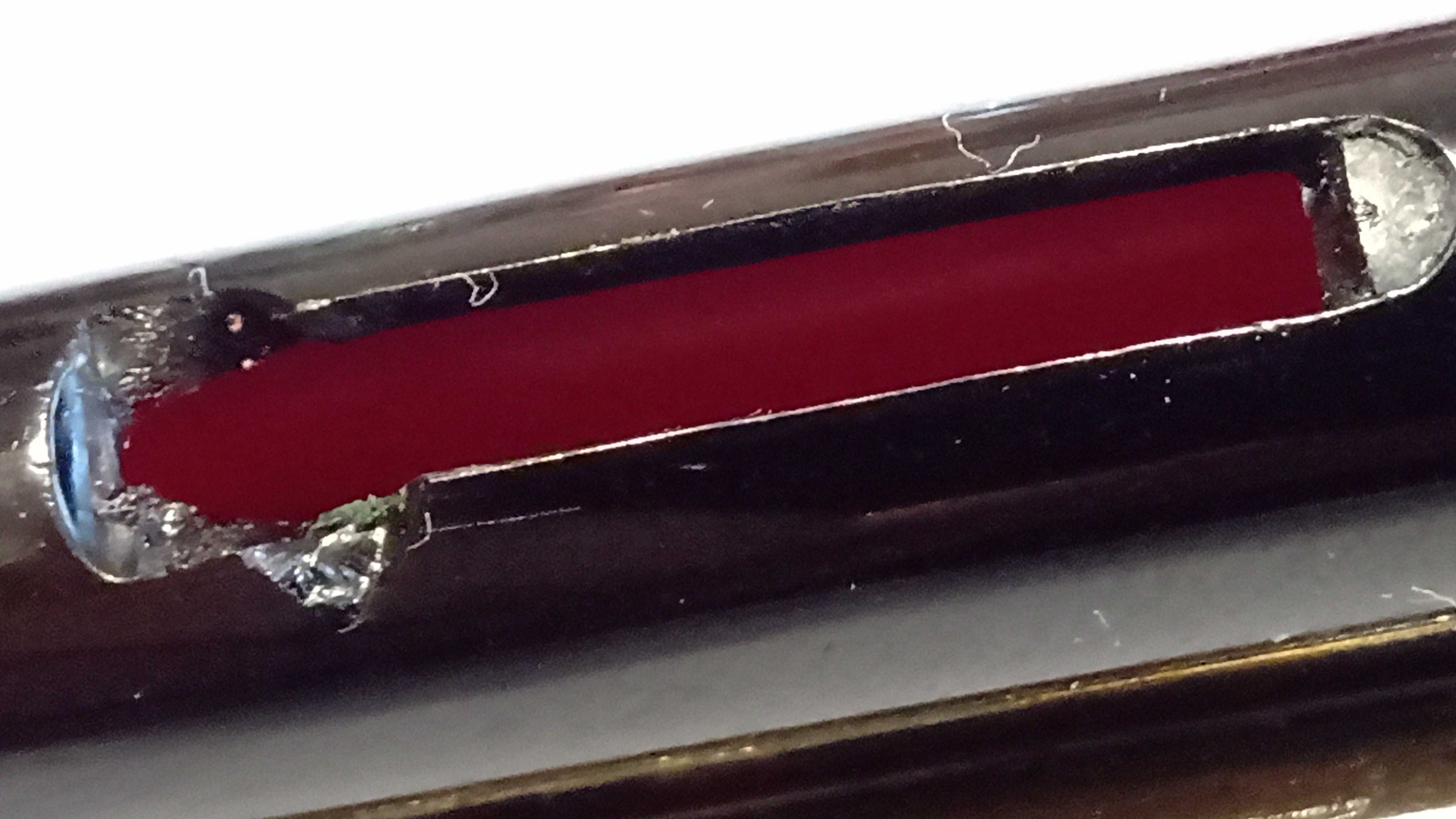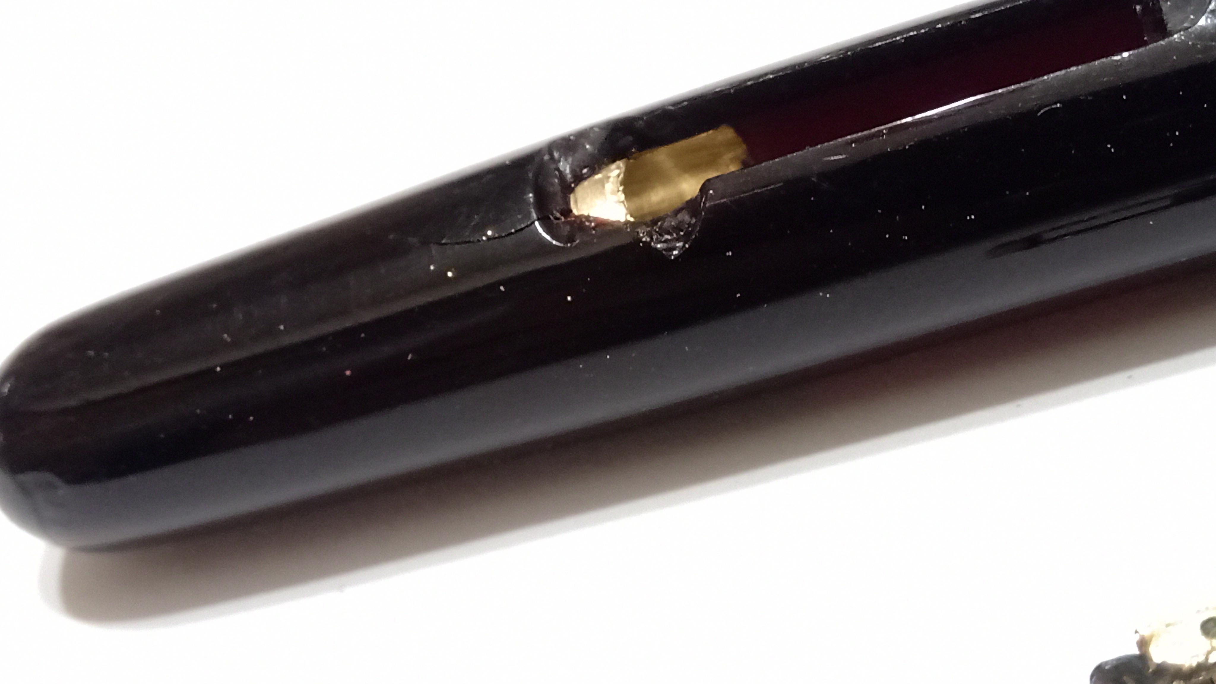 con una pequeña rotura que al subir la palanca muestra que se ha forzado el mecanismo, haciendo que la solapa de anclaje de la canasta se cargara el anclaje de celuloide del barril, y como levemente puede observarse, comenzaran también a crearse rajaduras que nacen en esos puntos de anclaje...