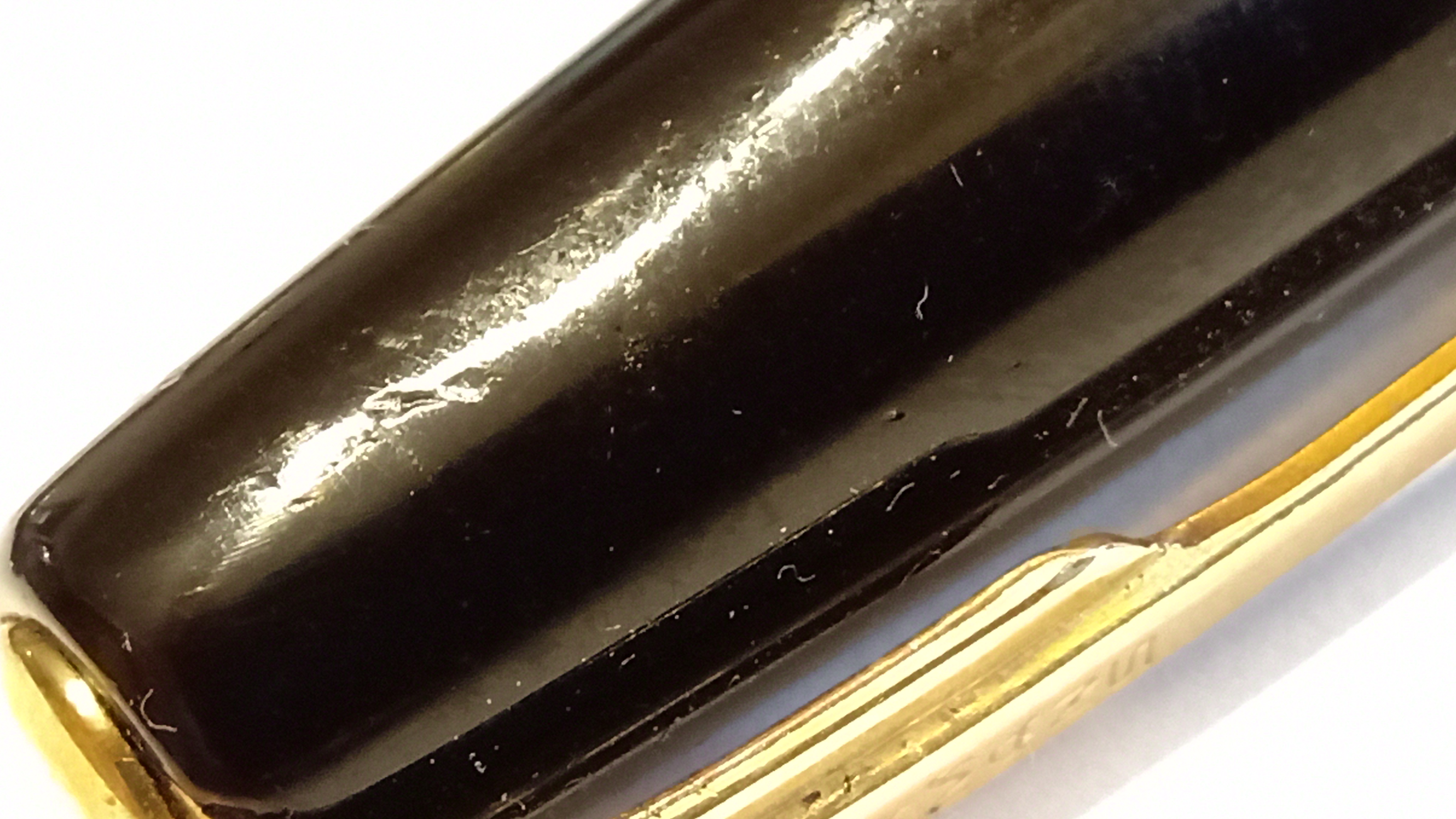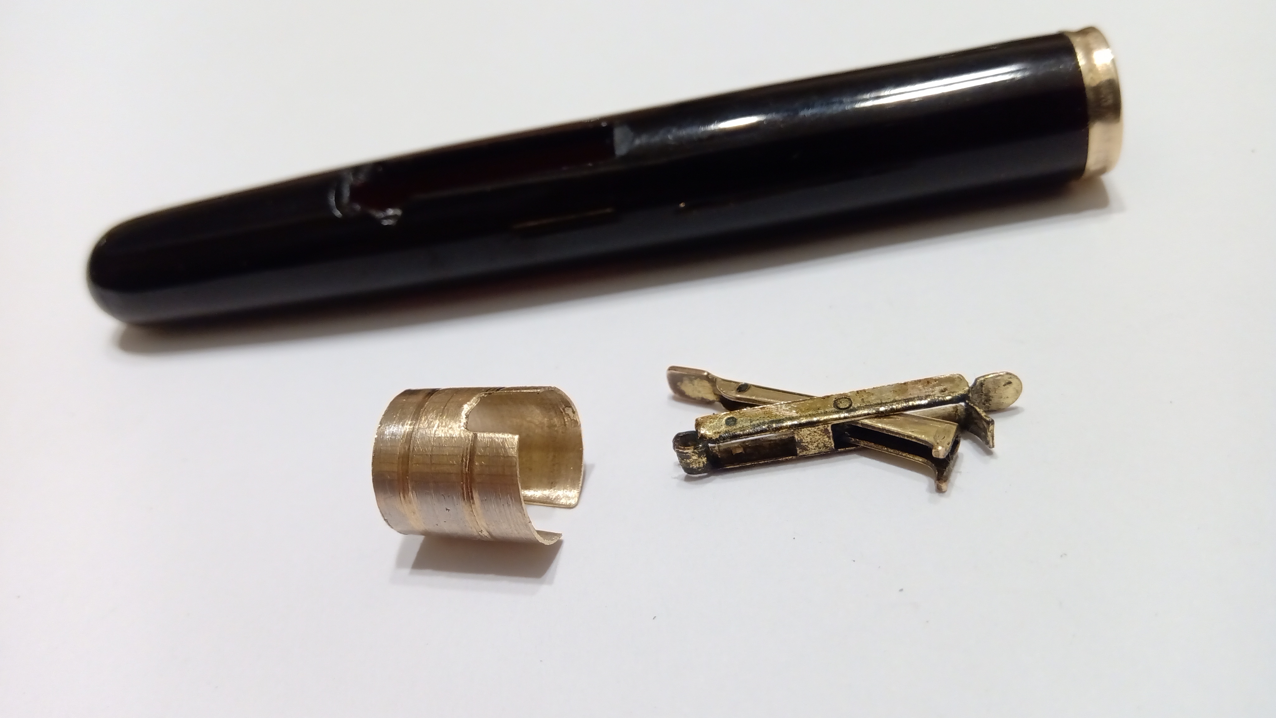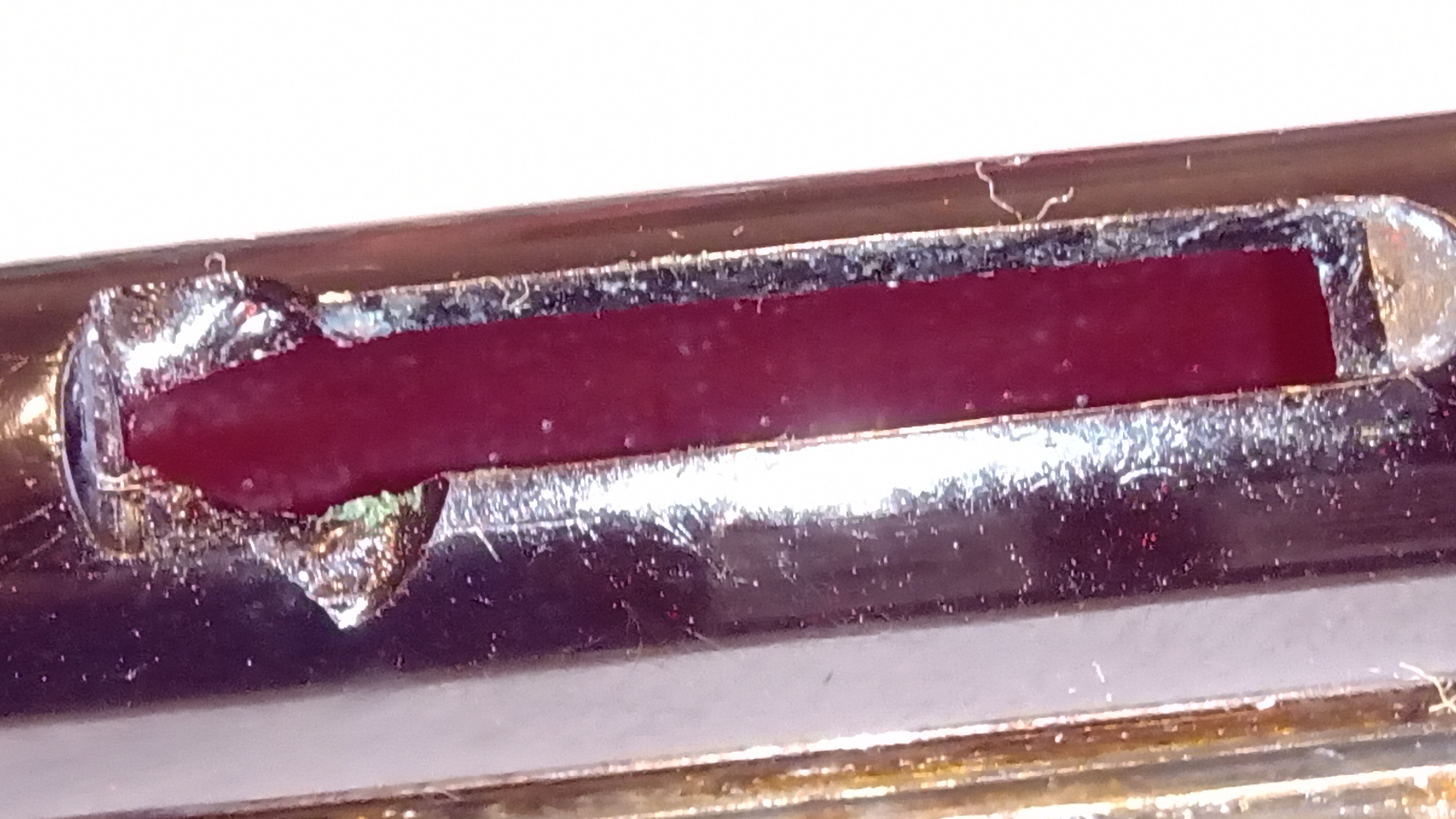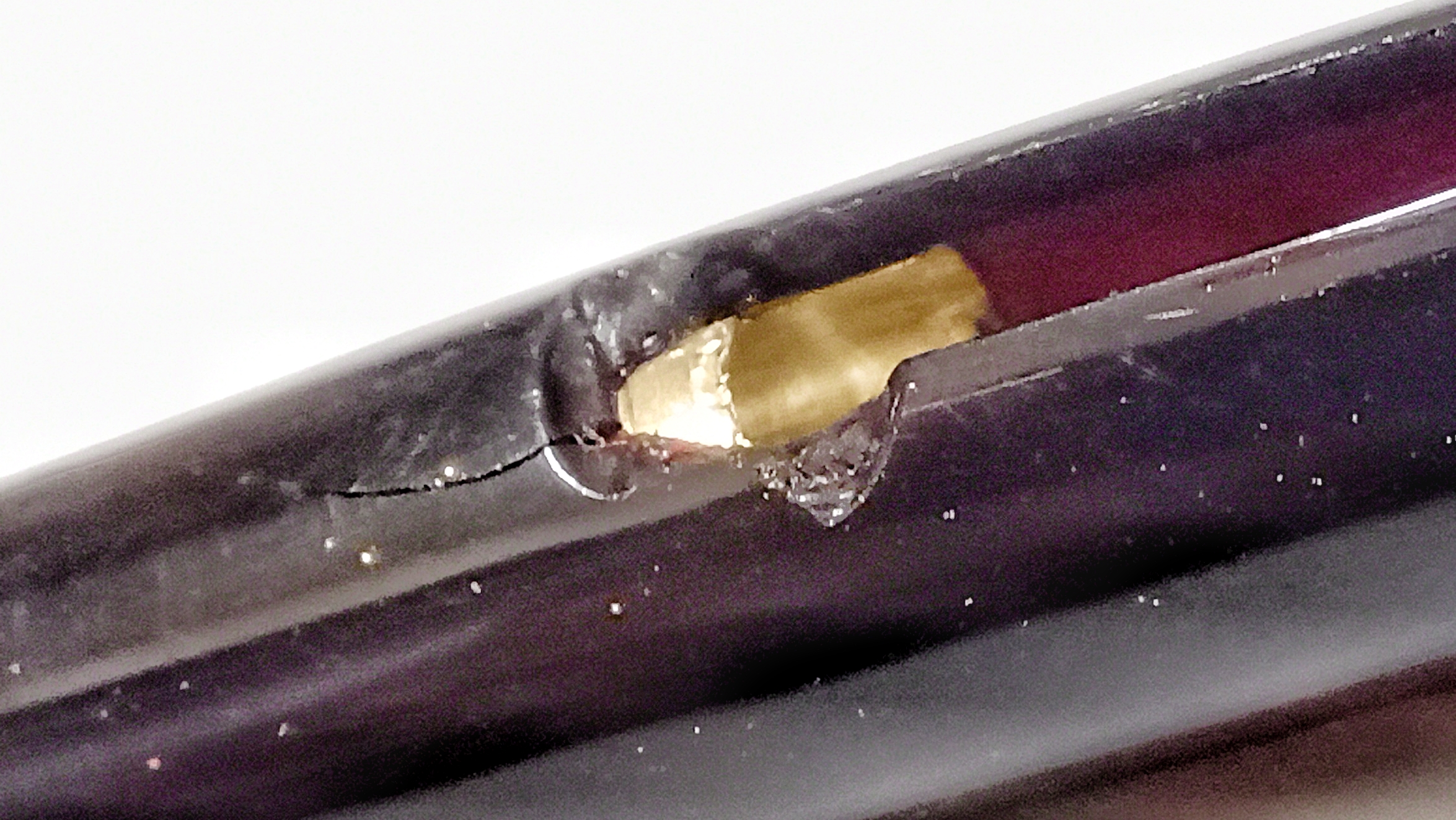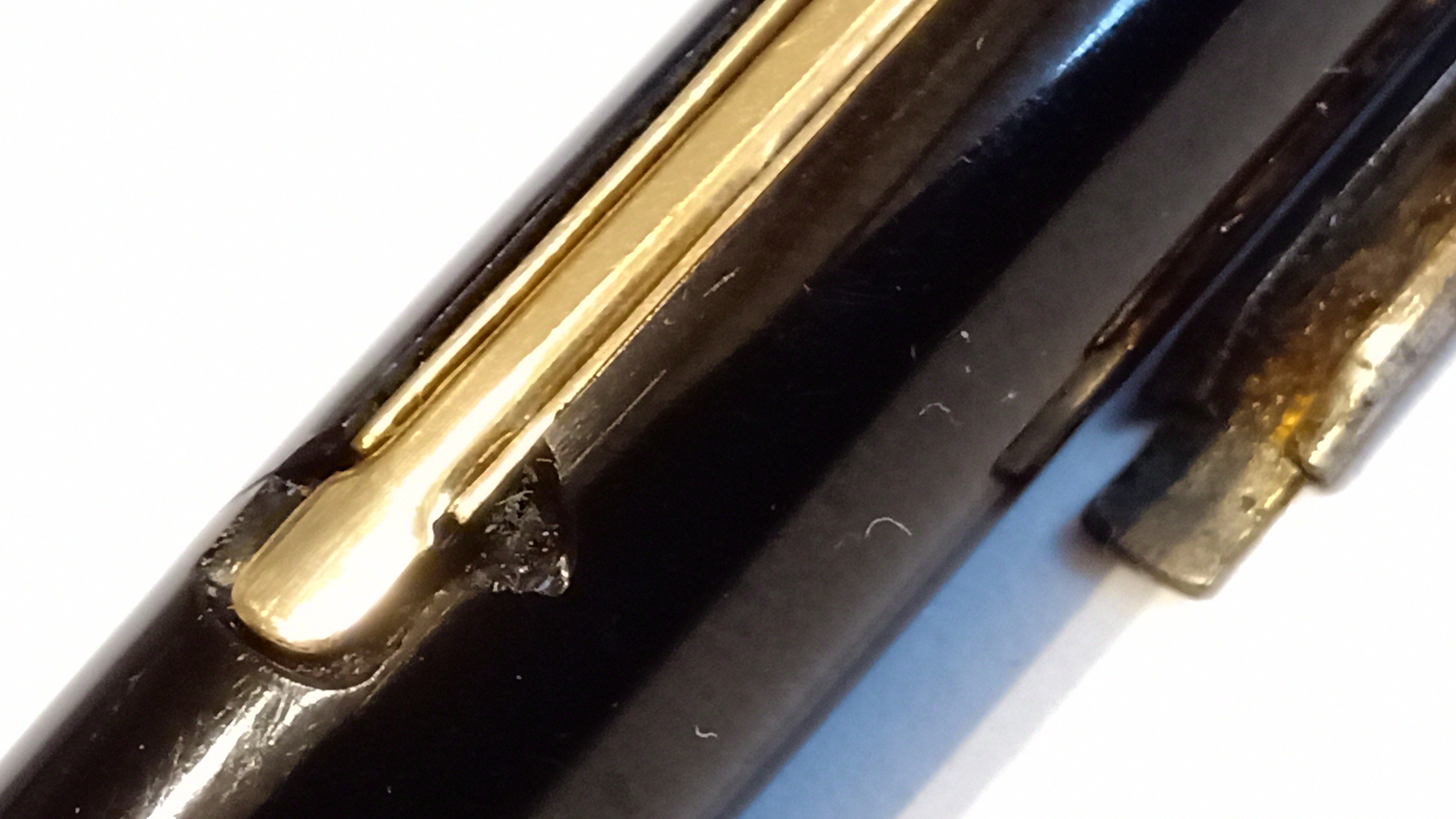 con una pequeña rotura que al subir la palanca muestra que se ha forzado el mecanismo, haciendo que la solapa de anclaje de la canasta se cargara el anclaje de celuloide del barril, y como levemente puede observarse, comenzaran también a crearse rajaduras que nacen en esos puntos de anclaje...