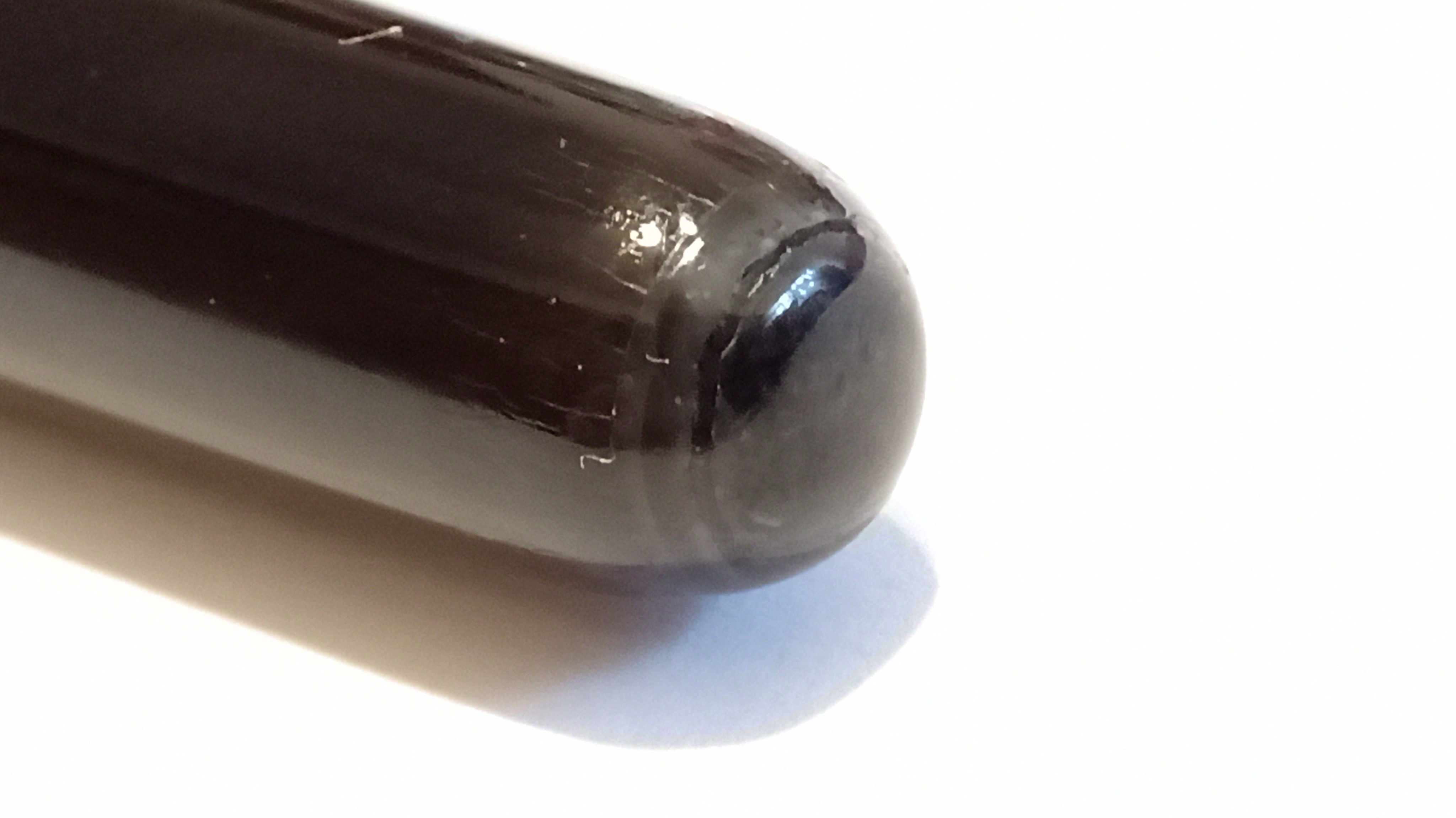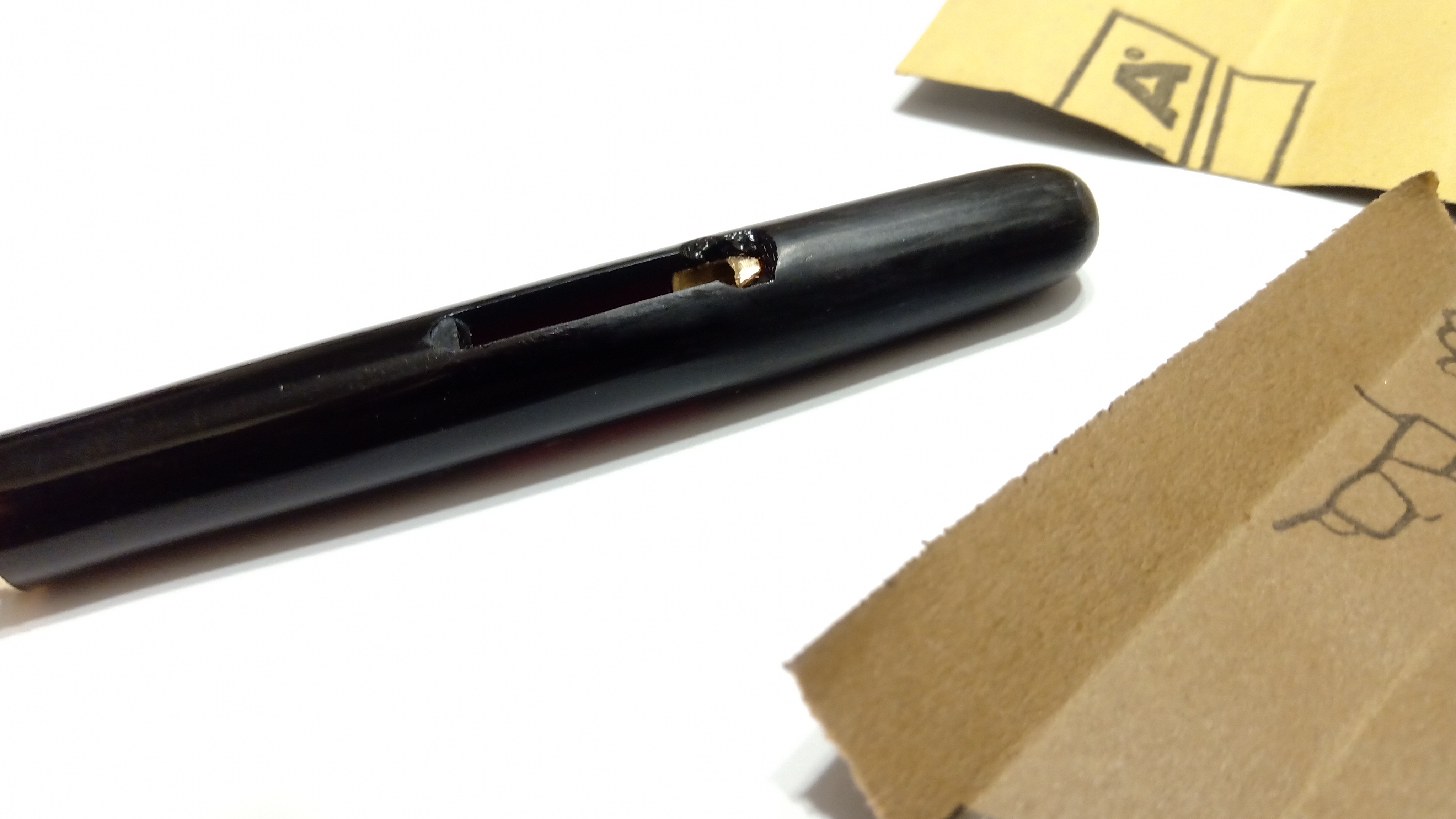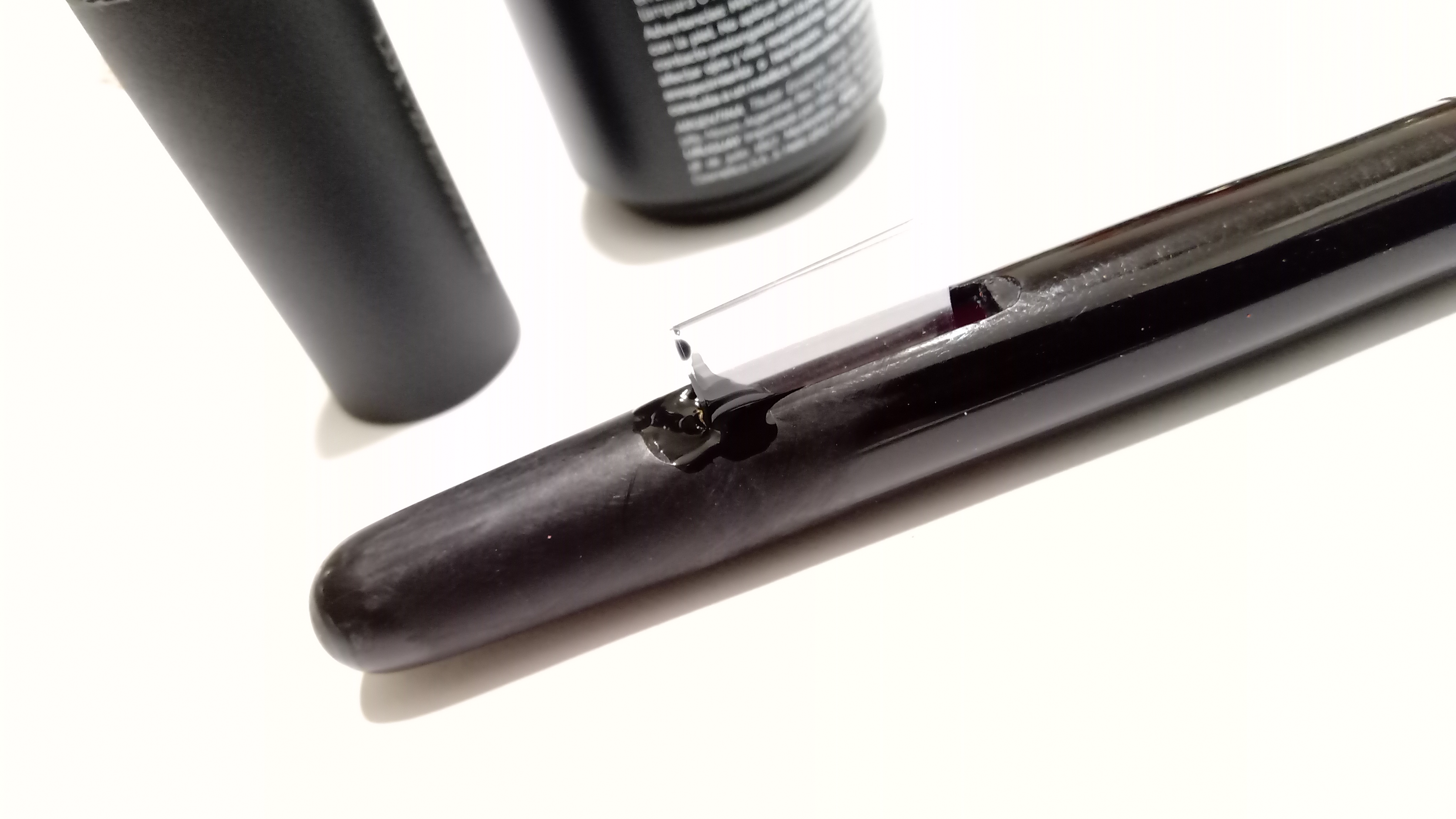 Busqué una laca acrílica automotriz de un negro caliente, ya que el celuloide original, aunque externamente se mostraba como negro, a trasluz se mostraba claramente rojizo, y dí así una suave mano con el aerosol preparado, concentrando la capa en el extremo, y con cuidado de no sepultar el imprint...