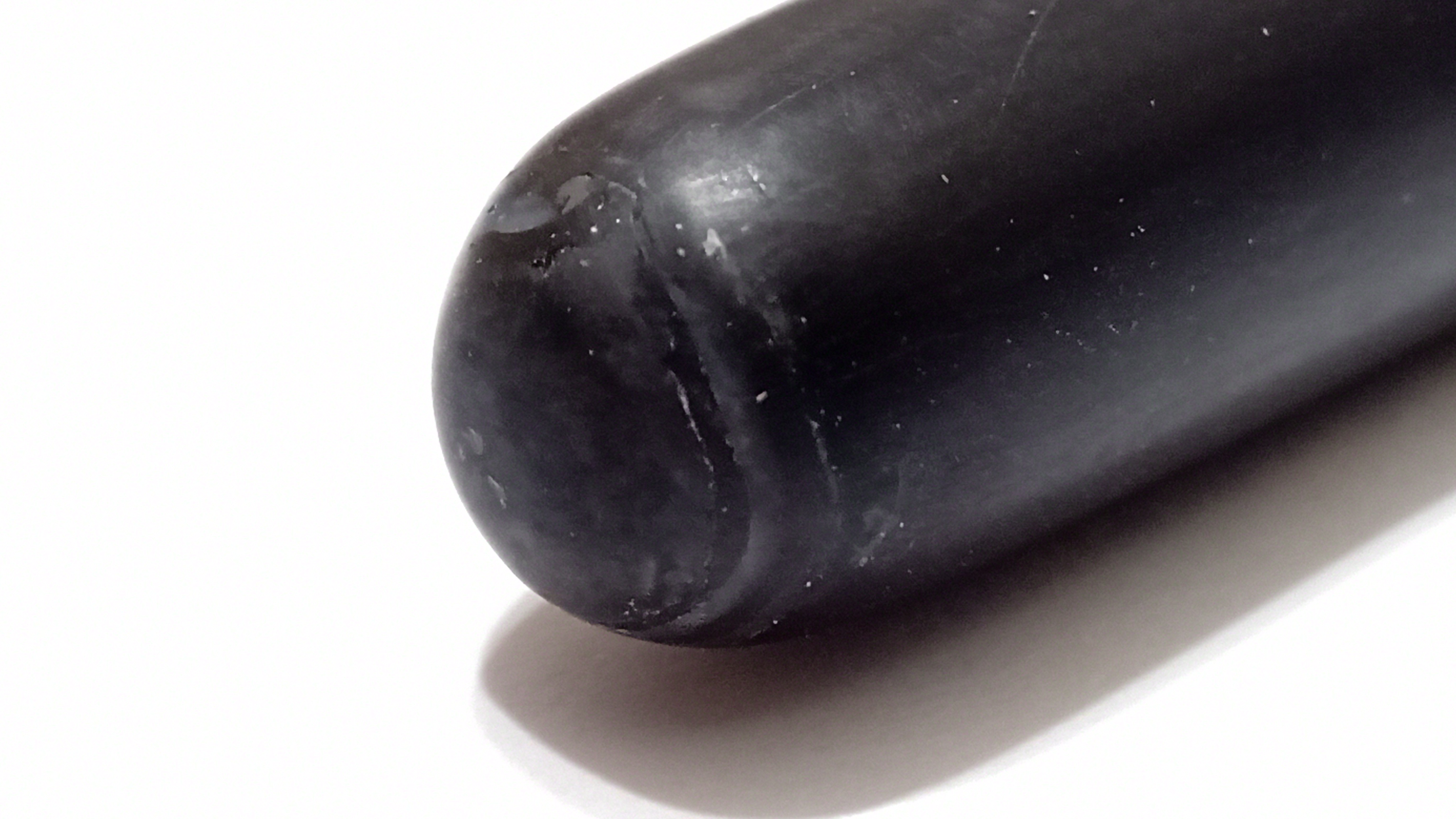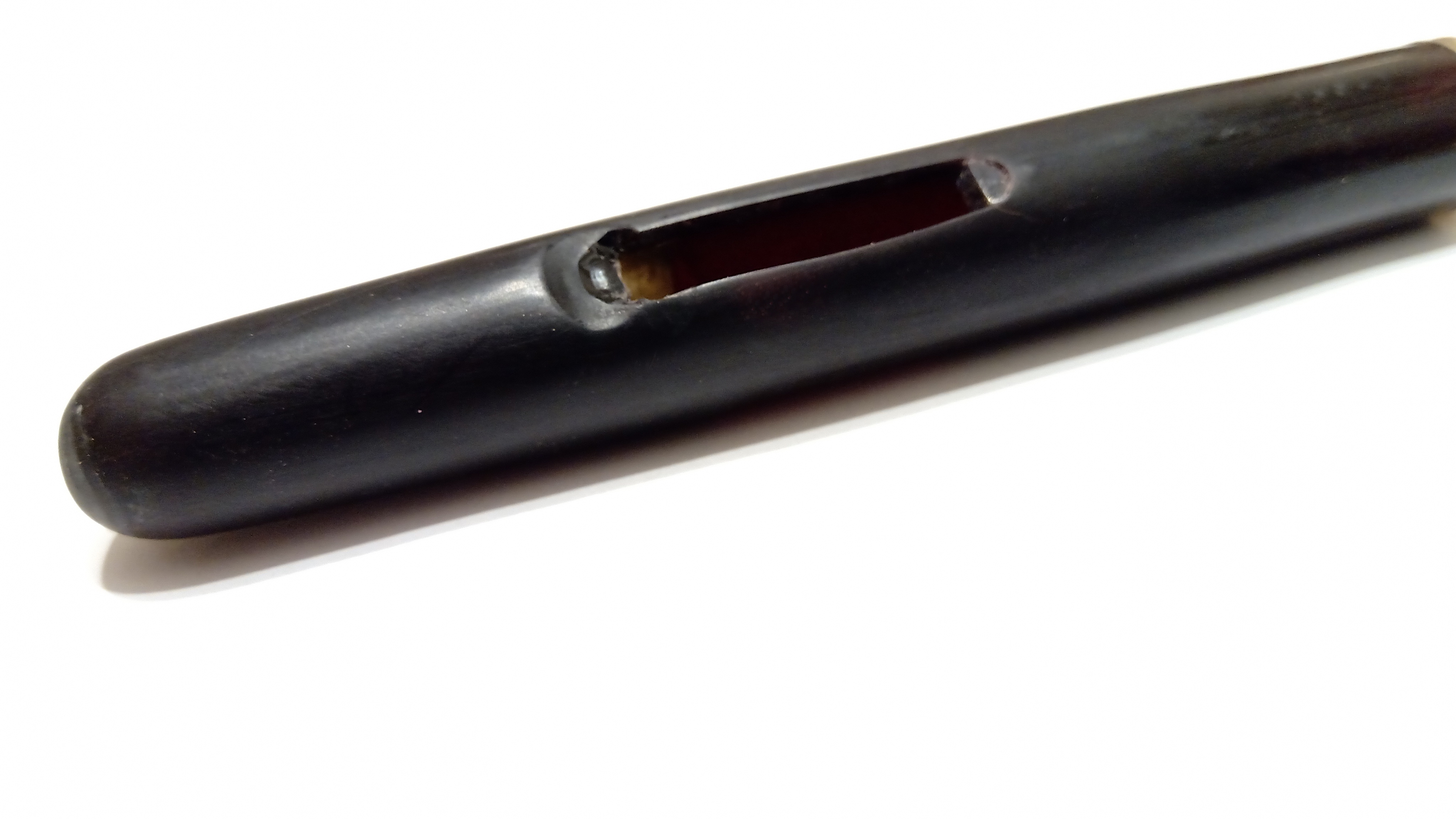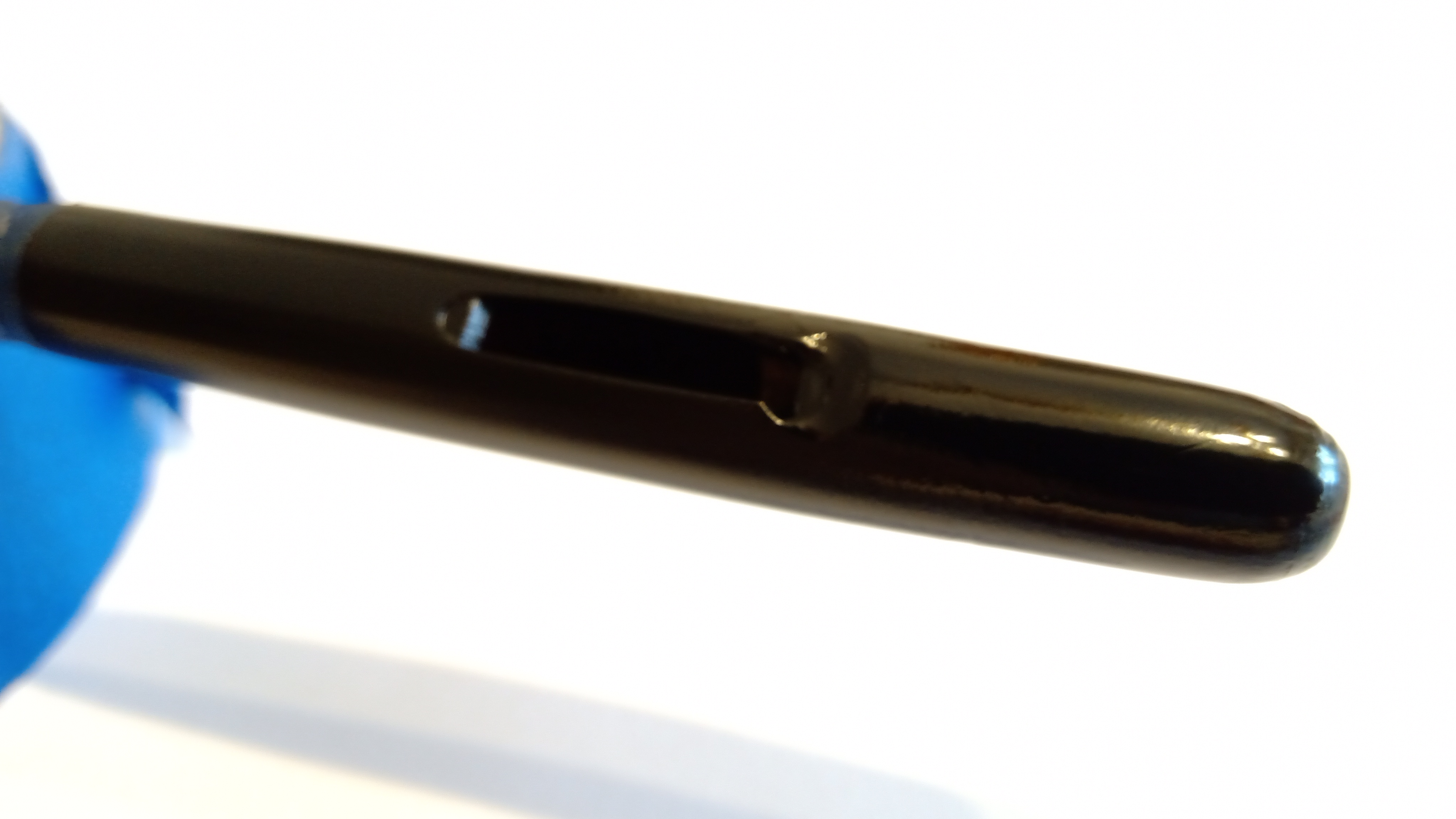 Busqué una laca acrílica automotriz de un negro caliente, ya que el celuloide original, aunque externamente se mostraba como negro, a trasluz se mostraba claramente rojizo, y dí así una suave mano con el aerosol preparado, concentrando la capa en el extremo, y con cuidado de no sepultar el imprint...
