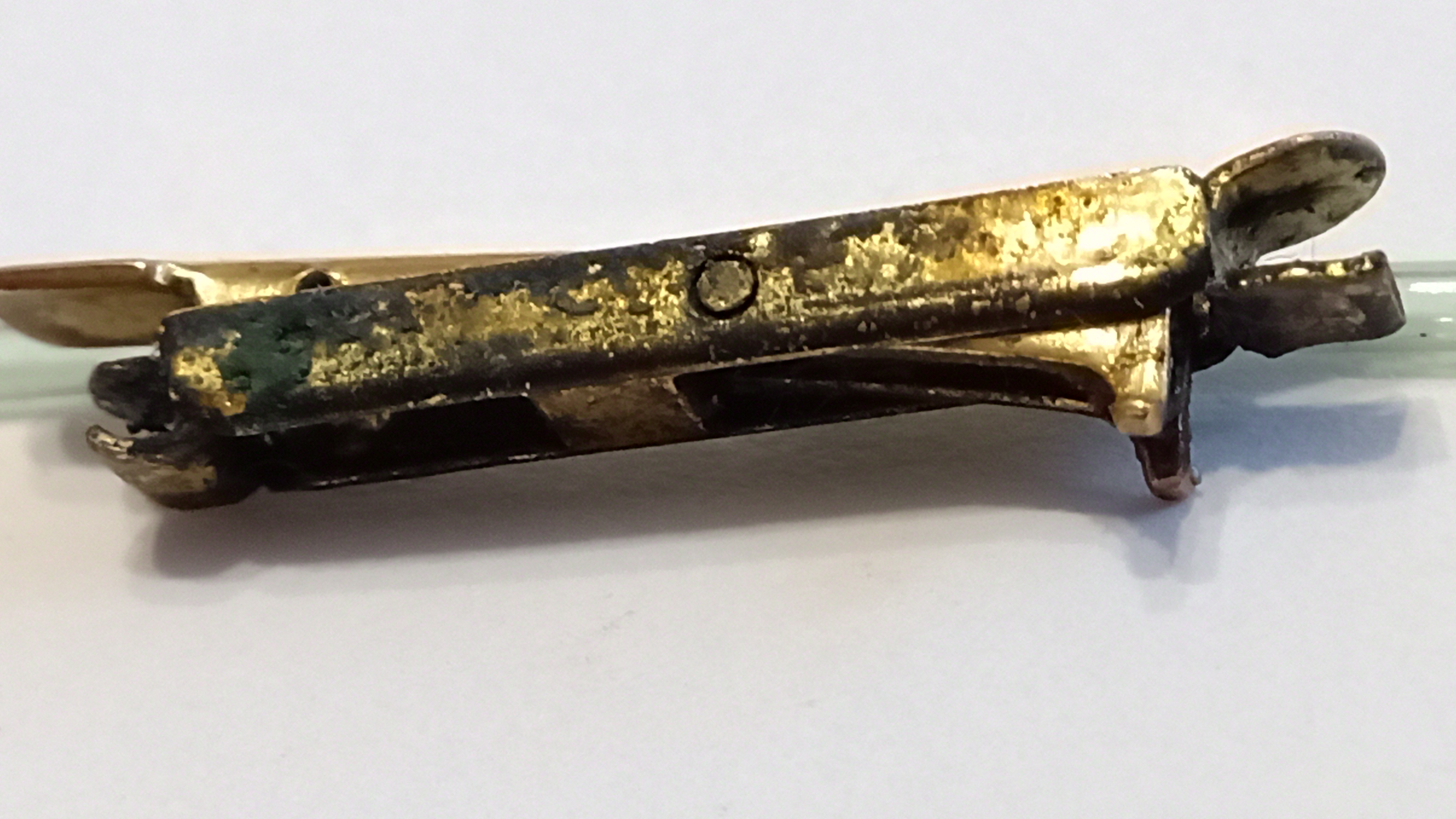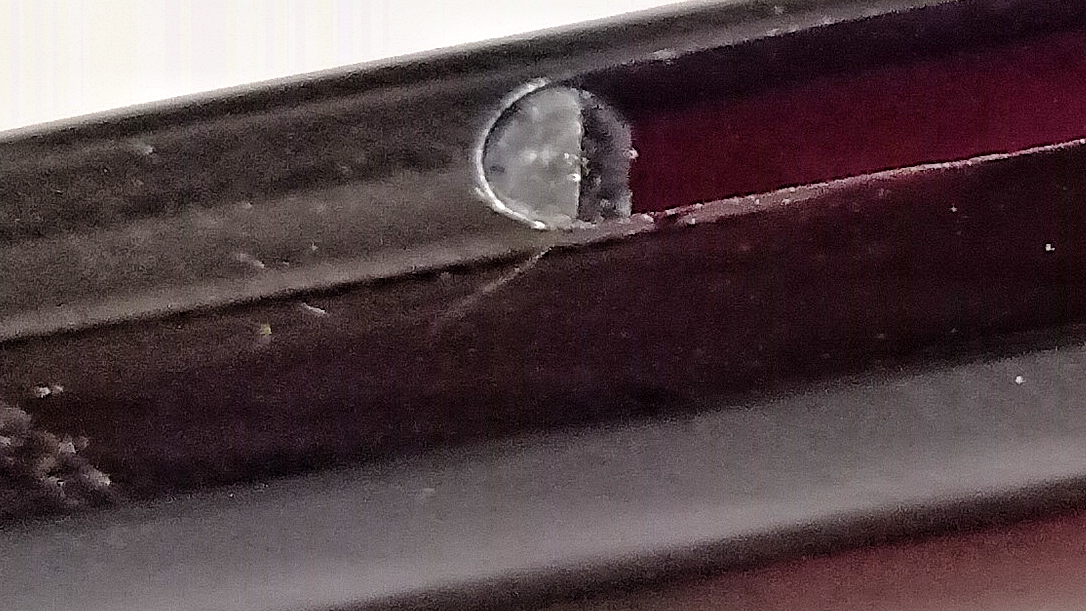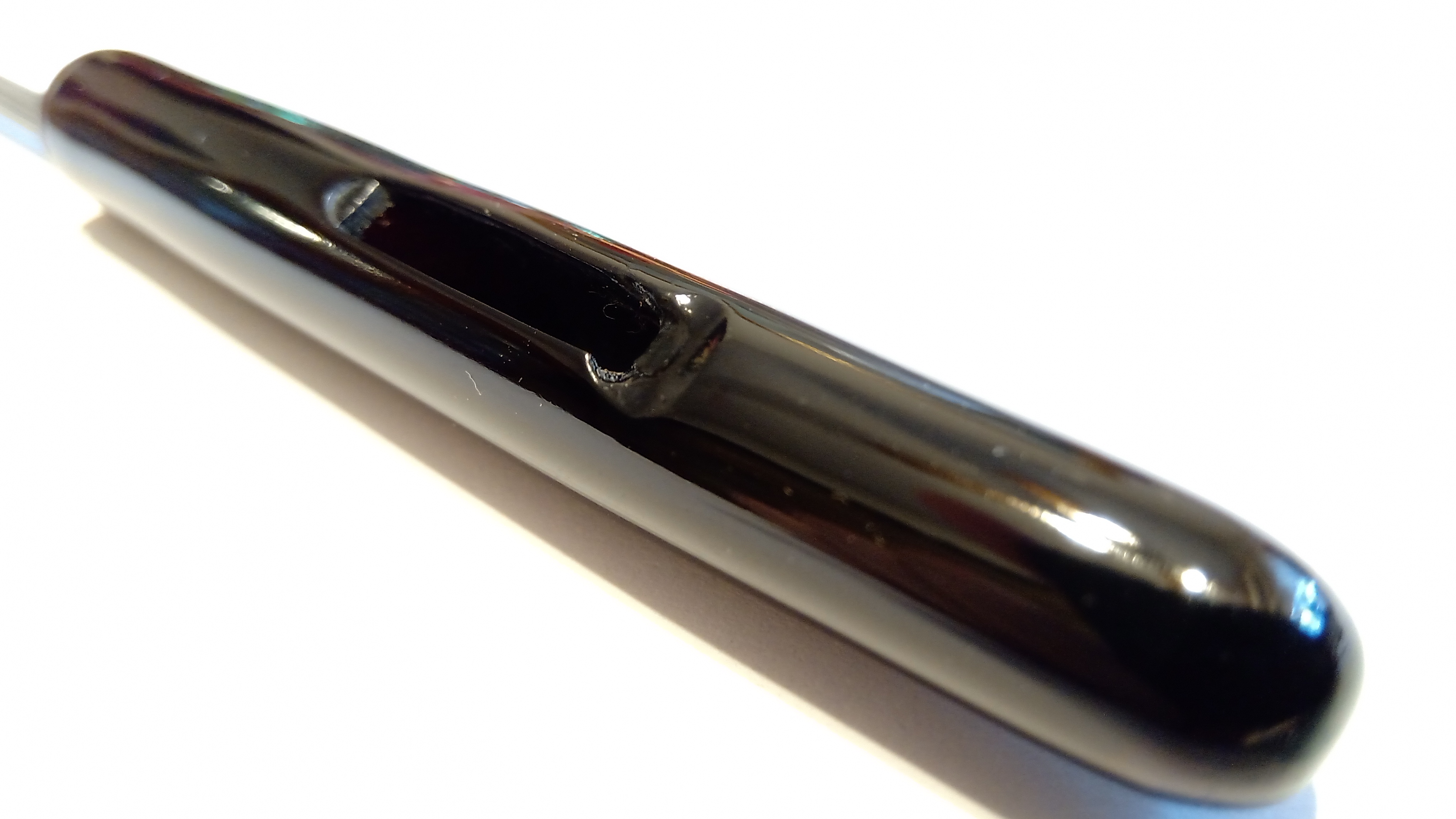 con una piccola rottura che, sollevando la leva, mostra che il meccanismo è stato forzato, facendo sì che la linguetta di ancoraggio del cestello caricasse l'ancoraggio in celluloide del fusto e, come si può leggermente osservare, cominciassero anche a formarsi delle crepe che nascono in quei punti di ancoraggio...