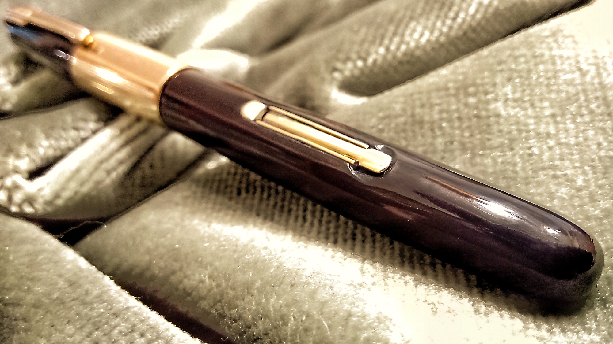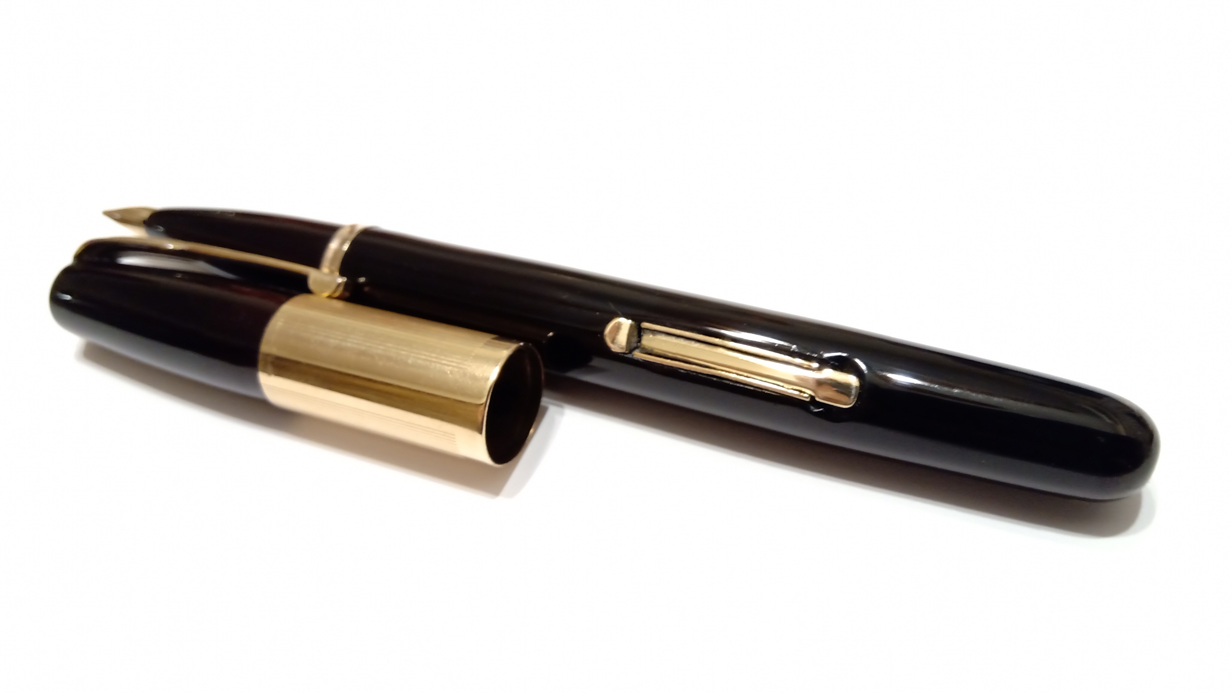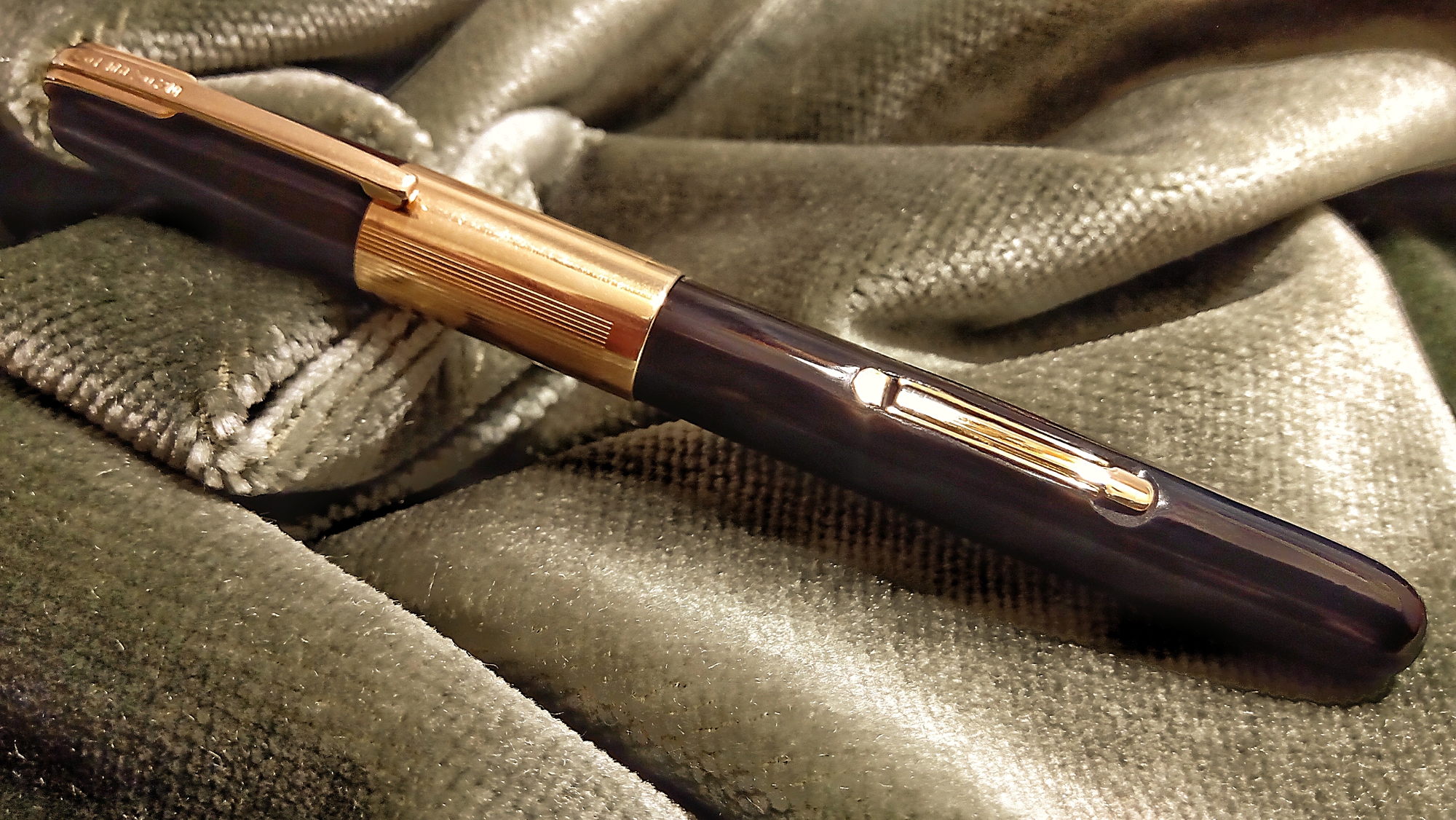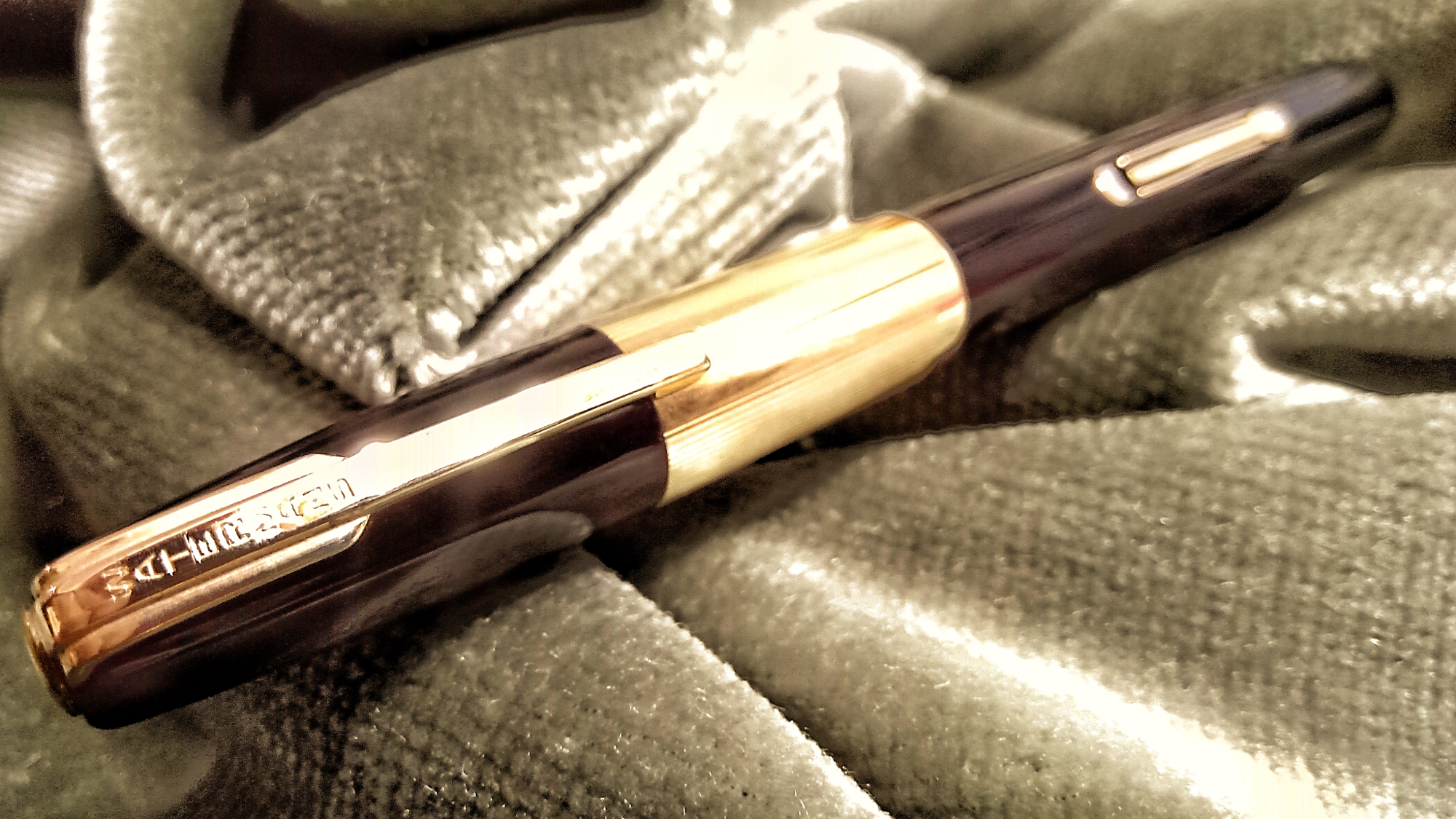 Si trattava di una Waterman's della fine degli anni '40 realizzata in celluloide, in particolare una Taperite Citation con pennino semi-hooded in oro in ottime condizioni, alimentazione a leva, con le sue parti placcate in oro in perfette condizioni...
