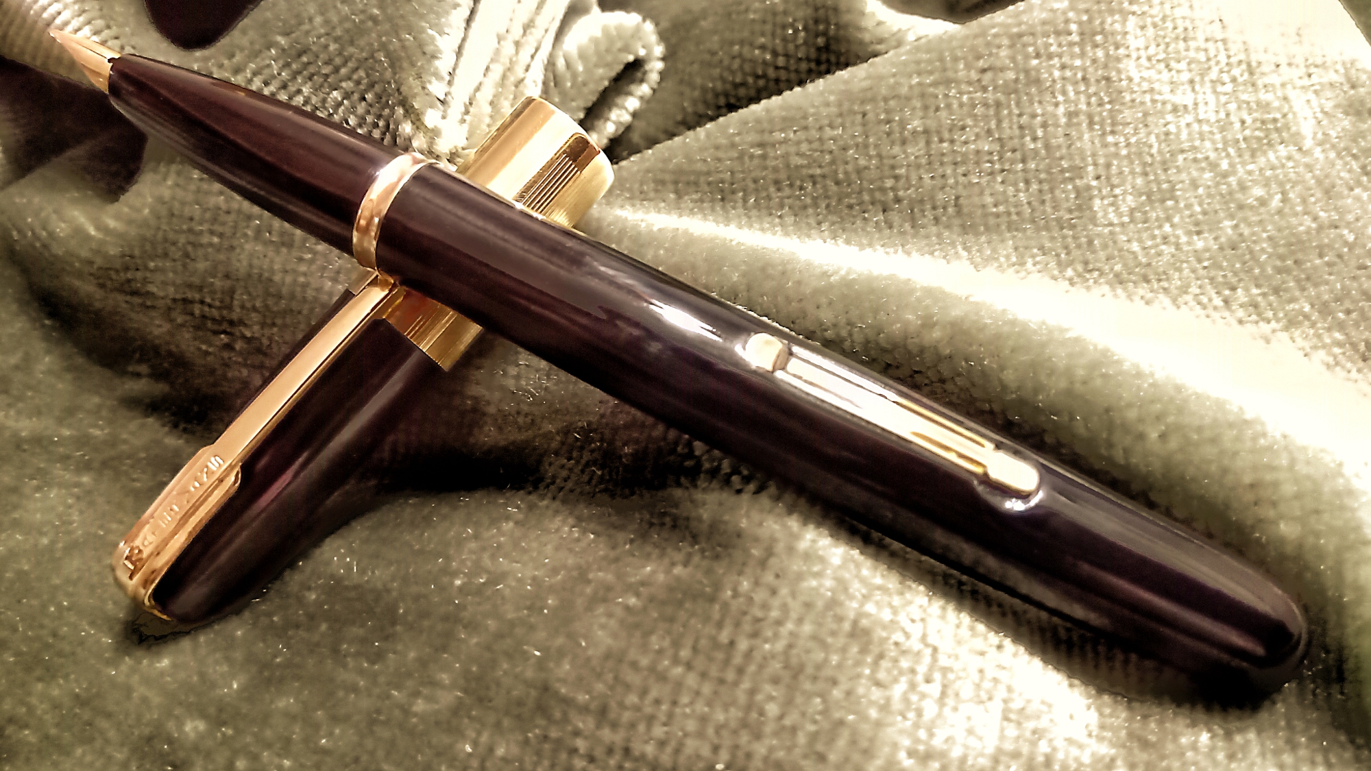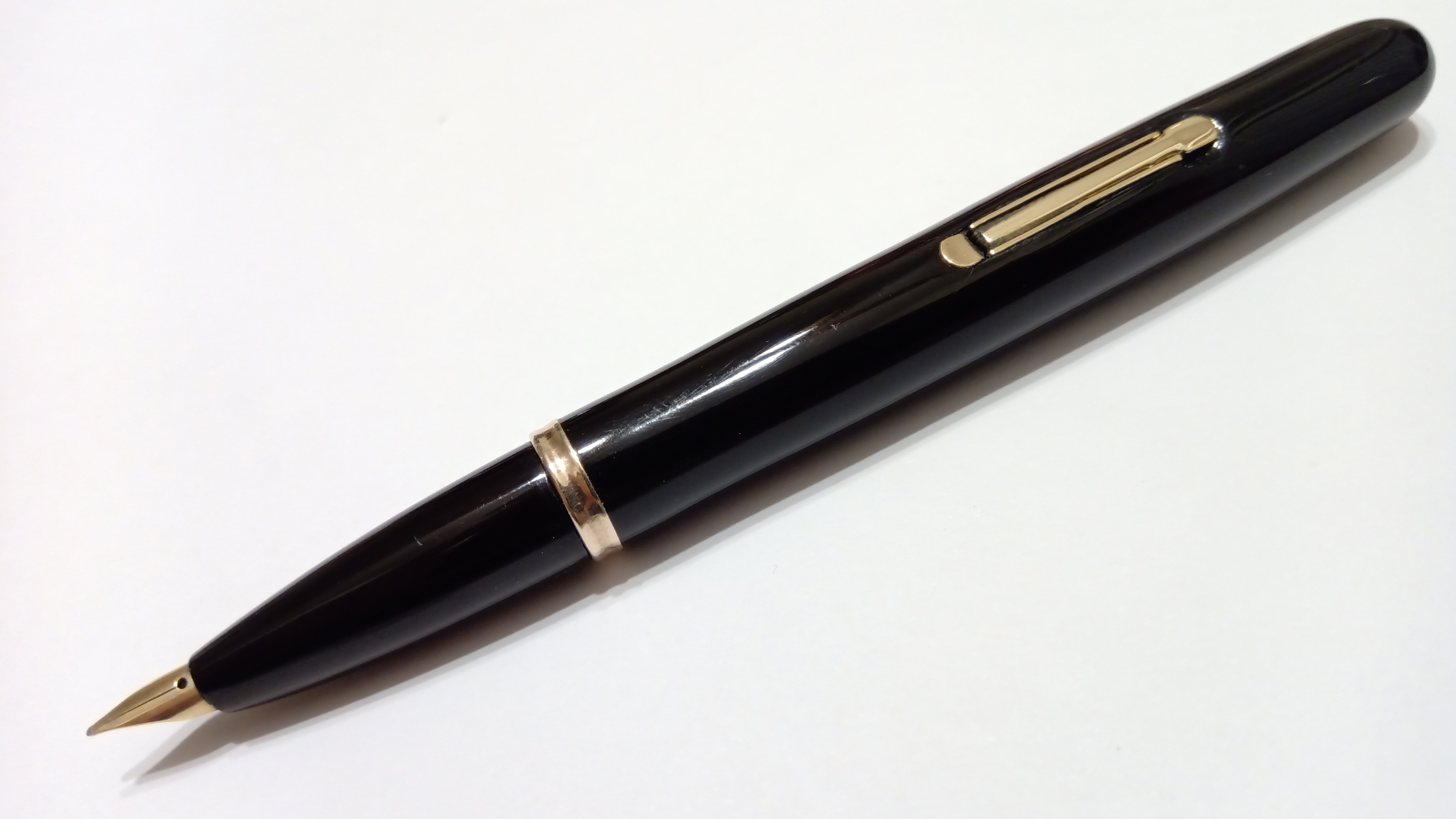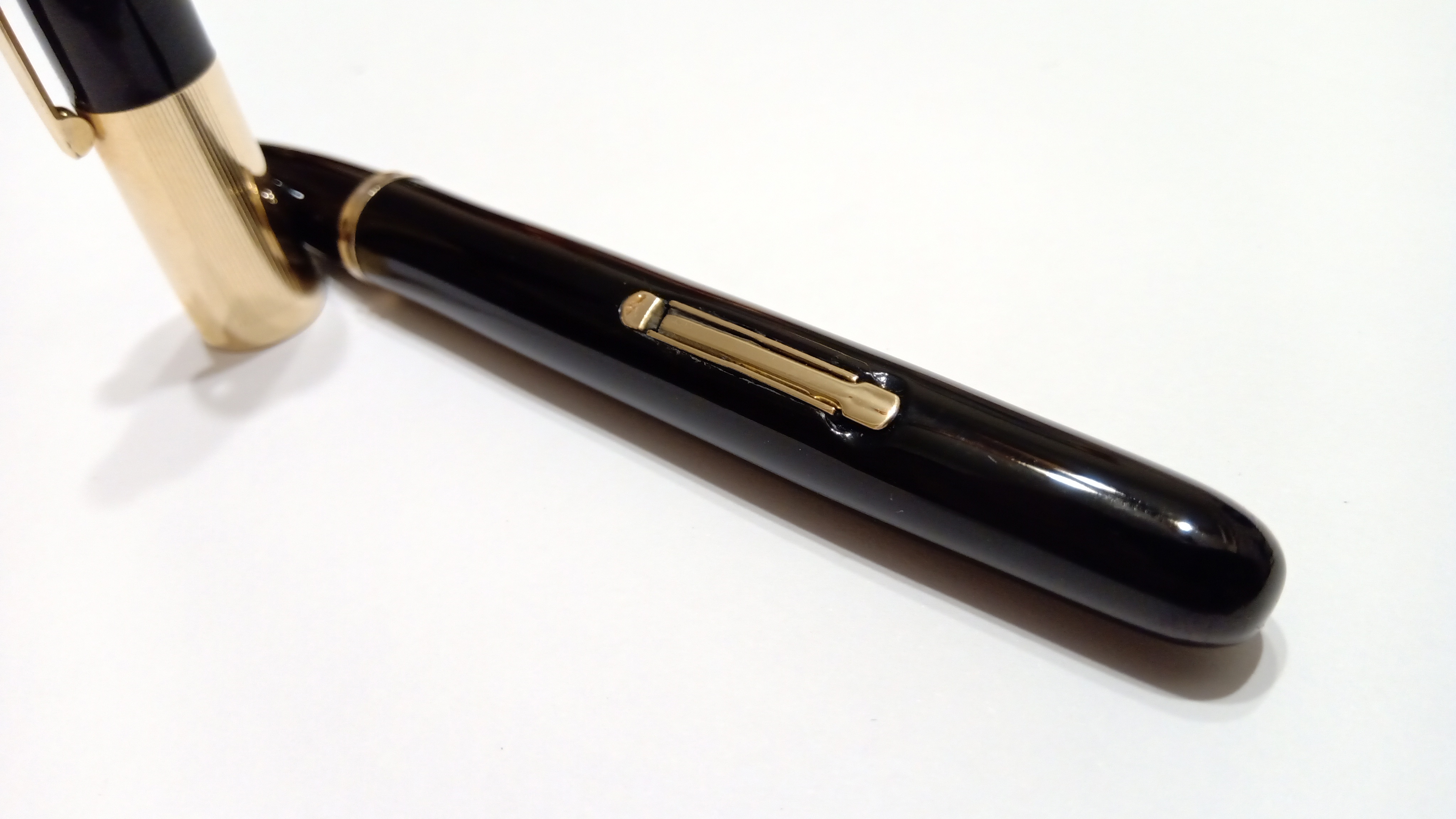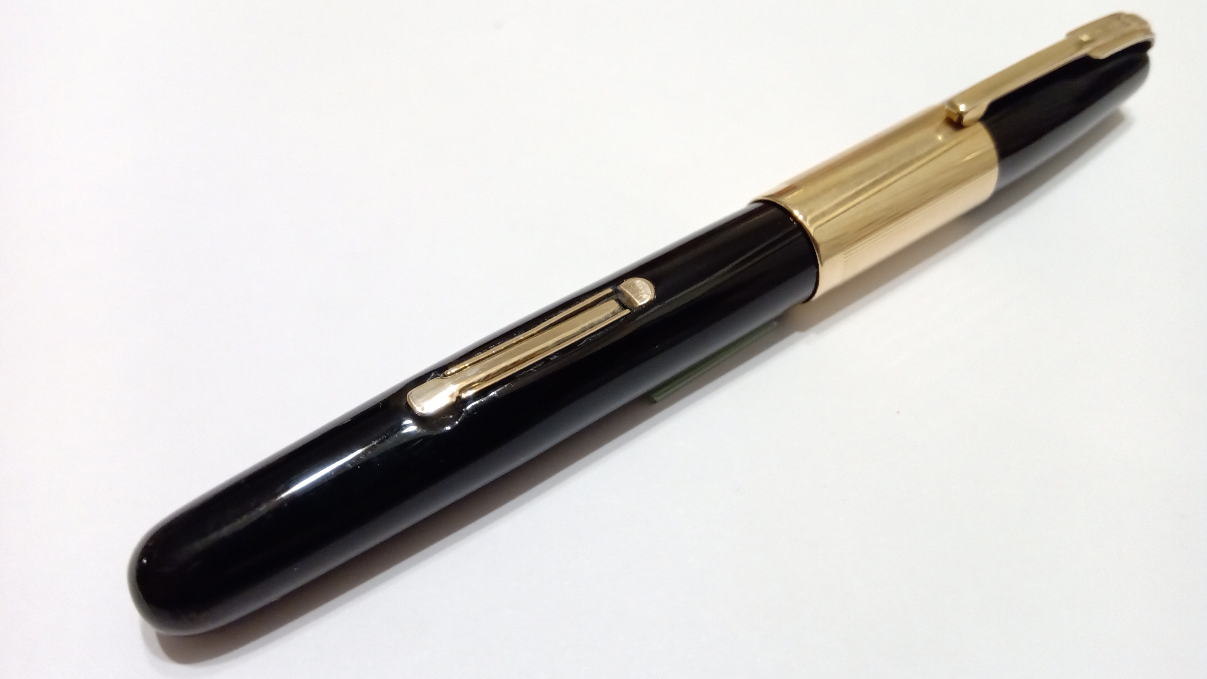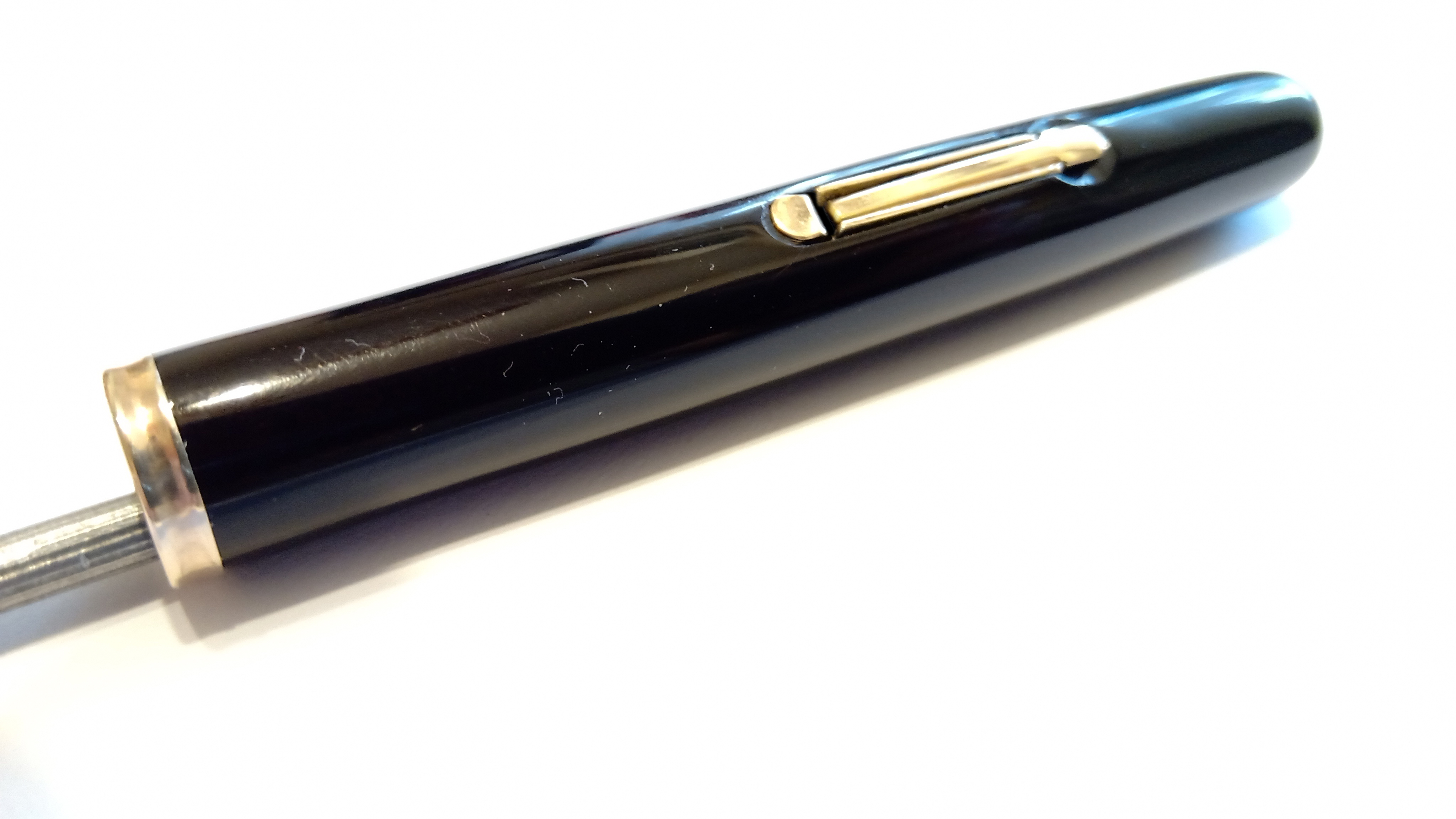 Si trattava di una Waterman's della fine degli anni '40 realizzata in celluloide, in particolare una Taperite Citation con pennino semi-hooded in oro in ottime condizioni, alimentazione a leva, con le sue parti placcate in oro in perfette condizioni...