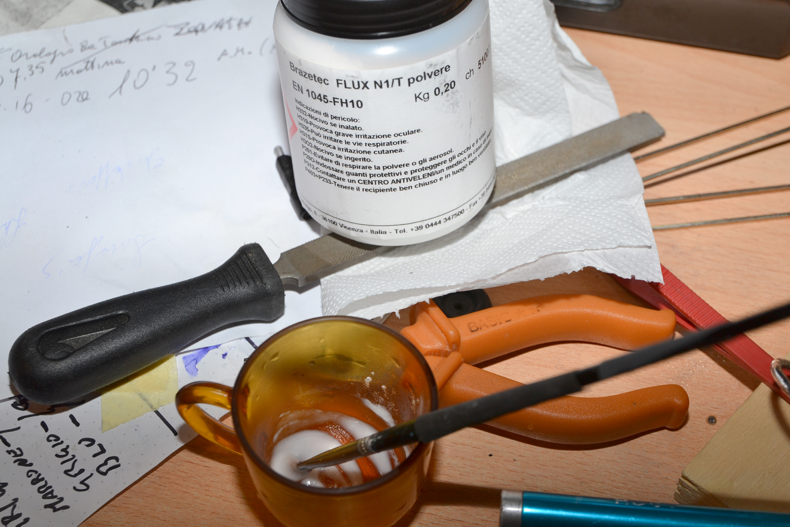 4) Barrette di Castolin per saldatura dolce, meglio quella con argento ha un punto di fusione più basso. Martellare un estremità della barretta per diminuirne il prodotto e facilitare la saldatura, staccarne un pezzetto di un 2/3 mm. assecondo della parte da saldare cospargerlo con la pastetta di borace e porlo sul punto da saldare.