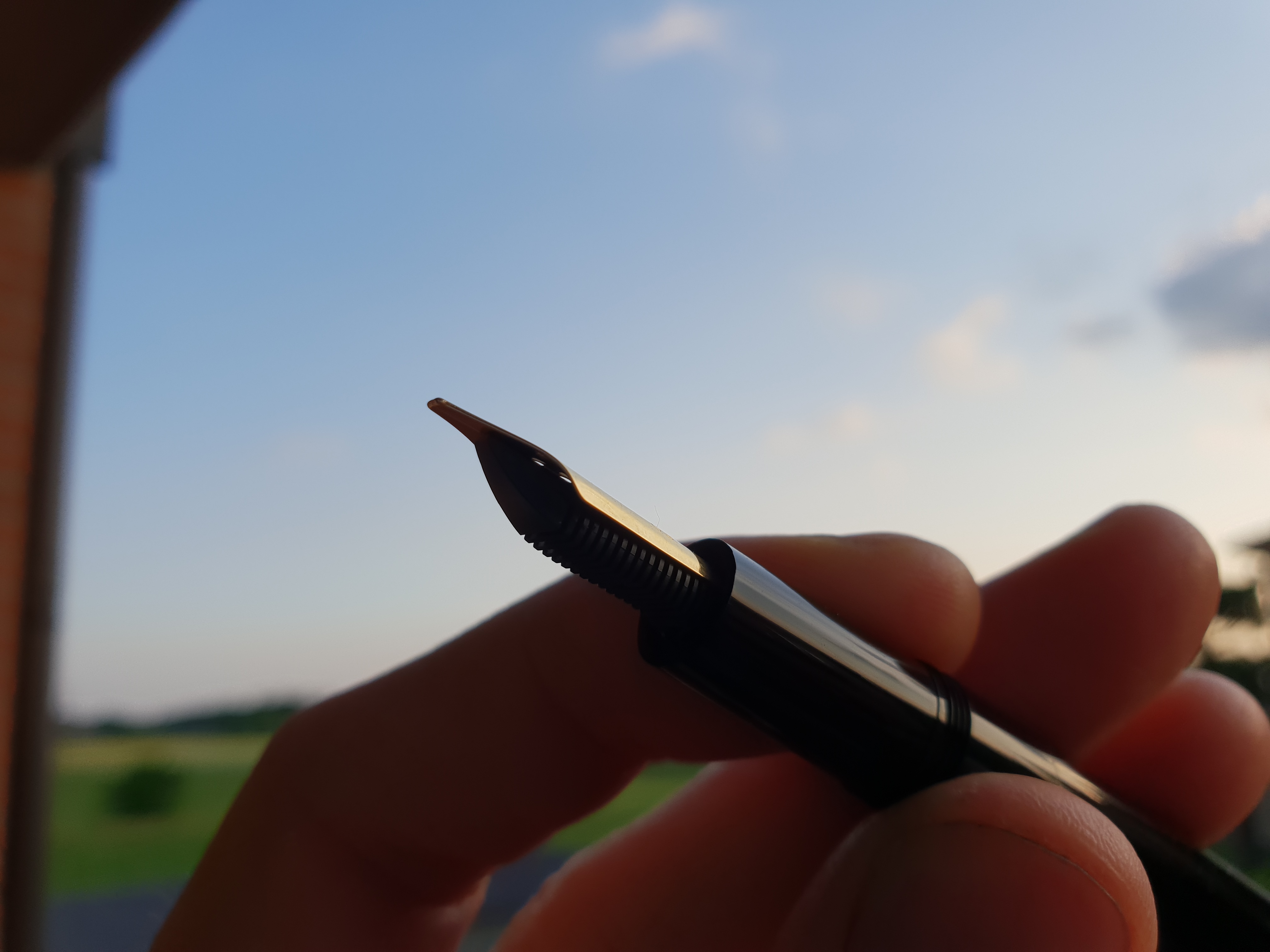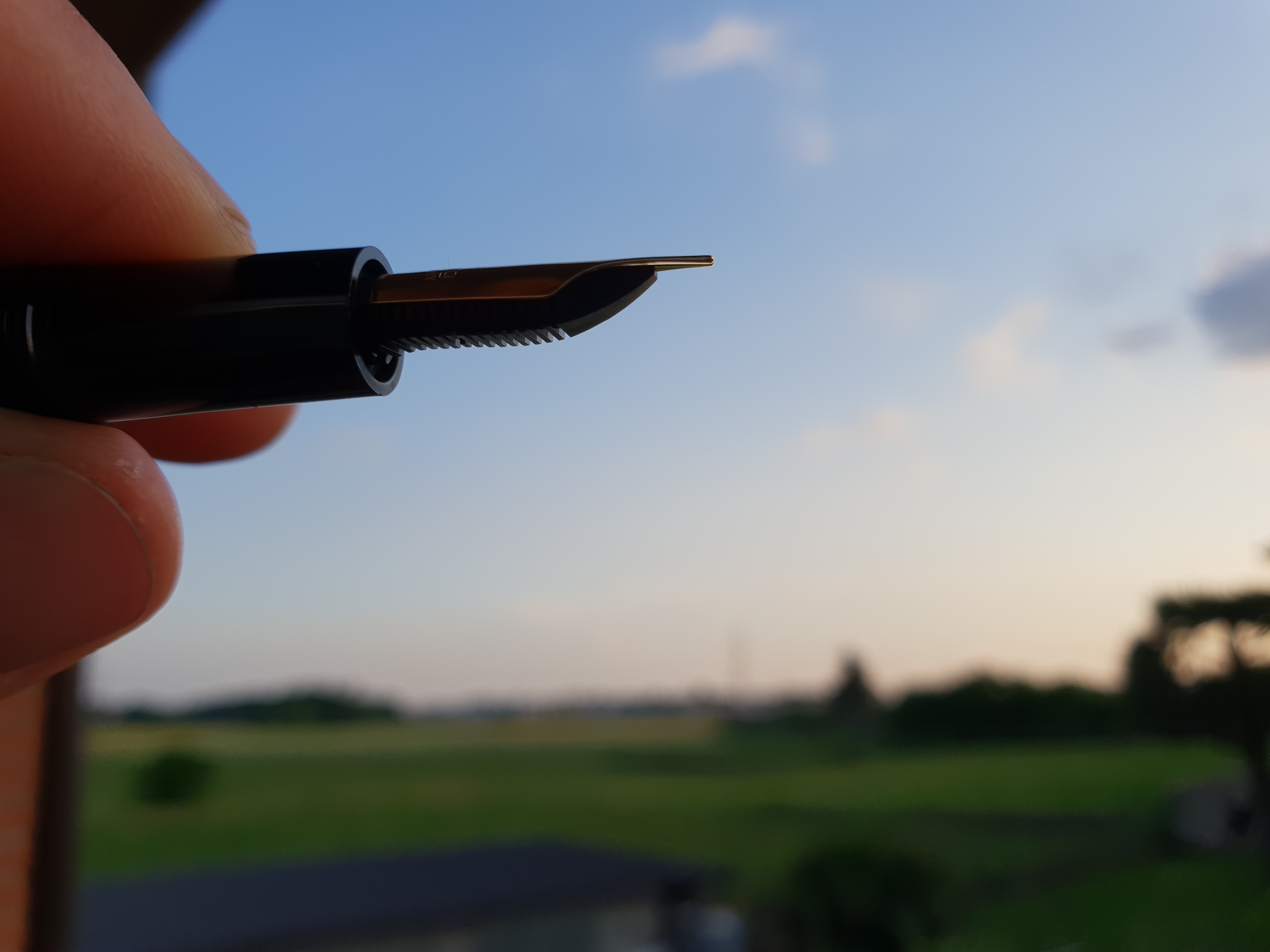 Il pennino, per quel che ho potuto provarlo ieri sera, quando è raggiunto dalla corretta quantità di inchiostro scrive liscio e scorrevole senza impuntamenti e grattamenti vari. E, ad occhio, sembra dritto(non punta eccessivamente in alto o in basso).