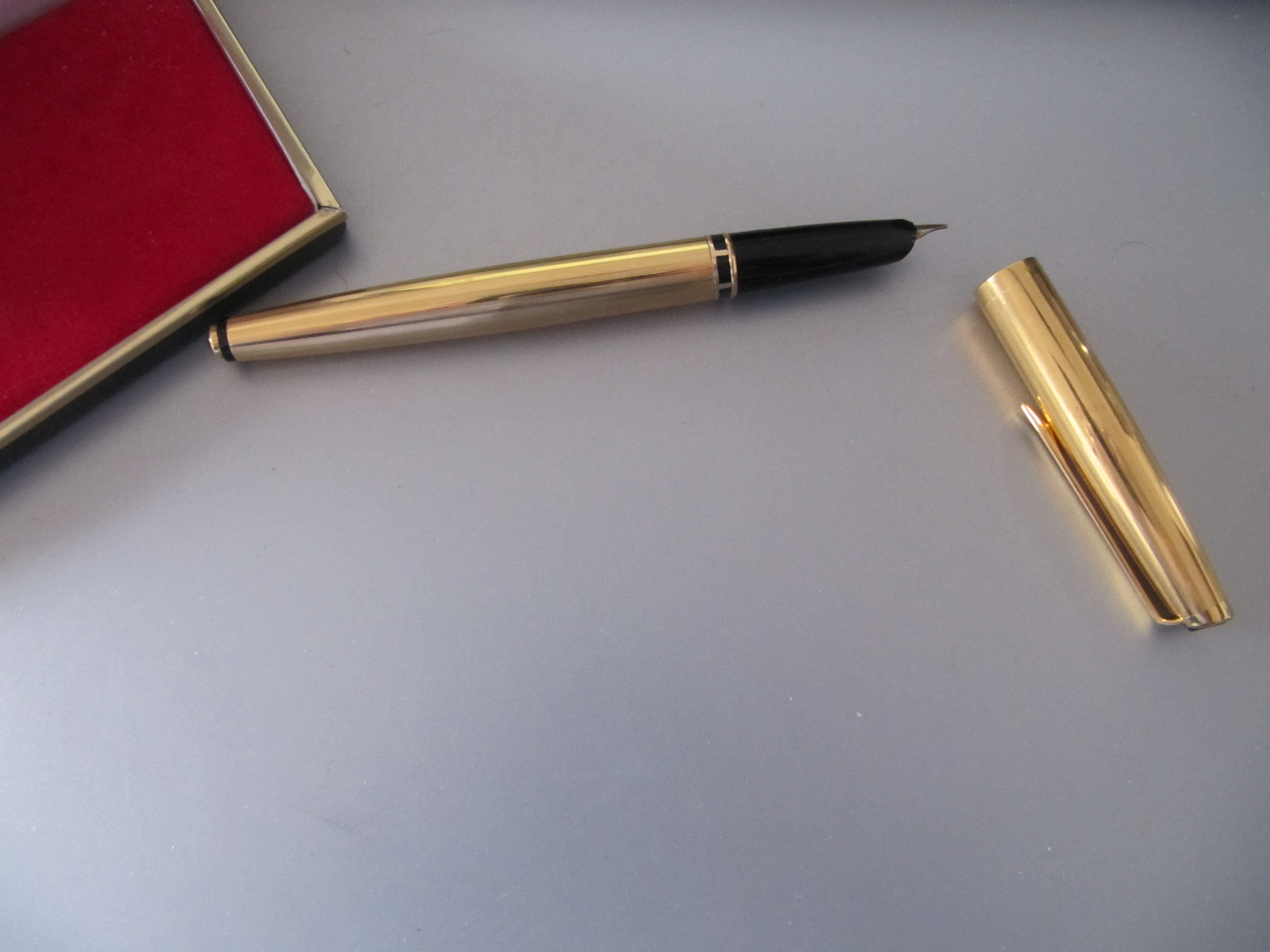 Da una mia ricerca credo di essere giunto ad una identificazione corretta. La penna è, o forse sarebbe meglio dire, dovrebbe essere una Aurora 98 GL Riserva Magica in oro che come è evidente ha il pulsante di azionamento abbassato e che se premuto dovrebbe fuoriuscire dal fusto della penna per consentirne il riempimento del serbatoio. Ho usato il condizionale poiché premendo il pulsante non torna indietro mentre quando mi è stata regalata era estratto. Toccando il pennino per cercare di rimuoverlo dall'esterno mi è rimasta nelle dita una traccia di inchiostro blu e dunque ho la certezza che in passato (oltre trent'anni fa) la penna sia stata utilizzata e da allora e sino ad oggi non è stata più ricaricata.