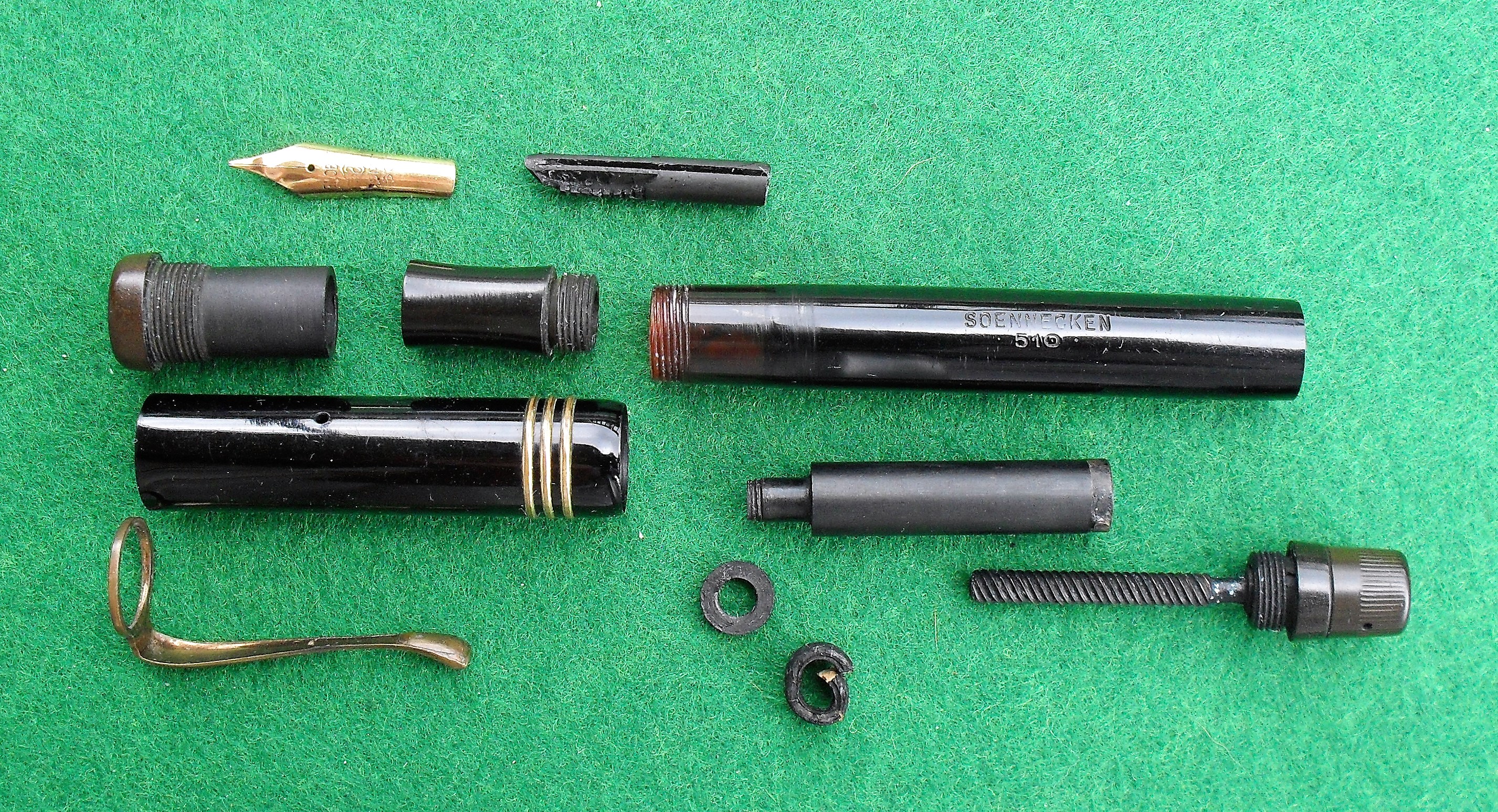 Non conosco assolutamente il marchio, se non di nome, e naturalmente, prima di cominciare il lavoro, m'informerò in proposito, cominciando dal nostro bellissimo Wiki: https://www.fountainpen.it/Soennecken_50x, che offre anche alcune fotografie preziose dei componenti interni, molto utili per capire la morfologia della penna. Per non parlare di questi topic, veramente informativi (ringrazio di cuore Max, l'autore):viewtopic.php?f=12&t=6588&hilit=soennecken+510, viewtopic.php?f=12&t=21230.