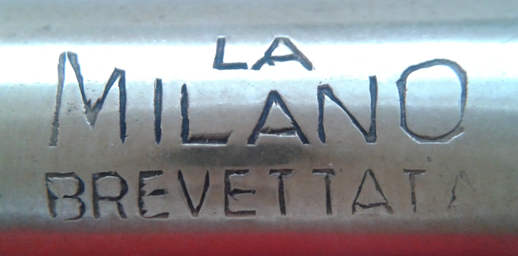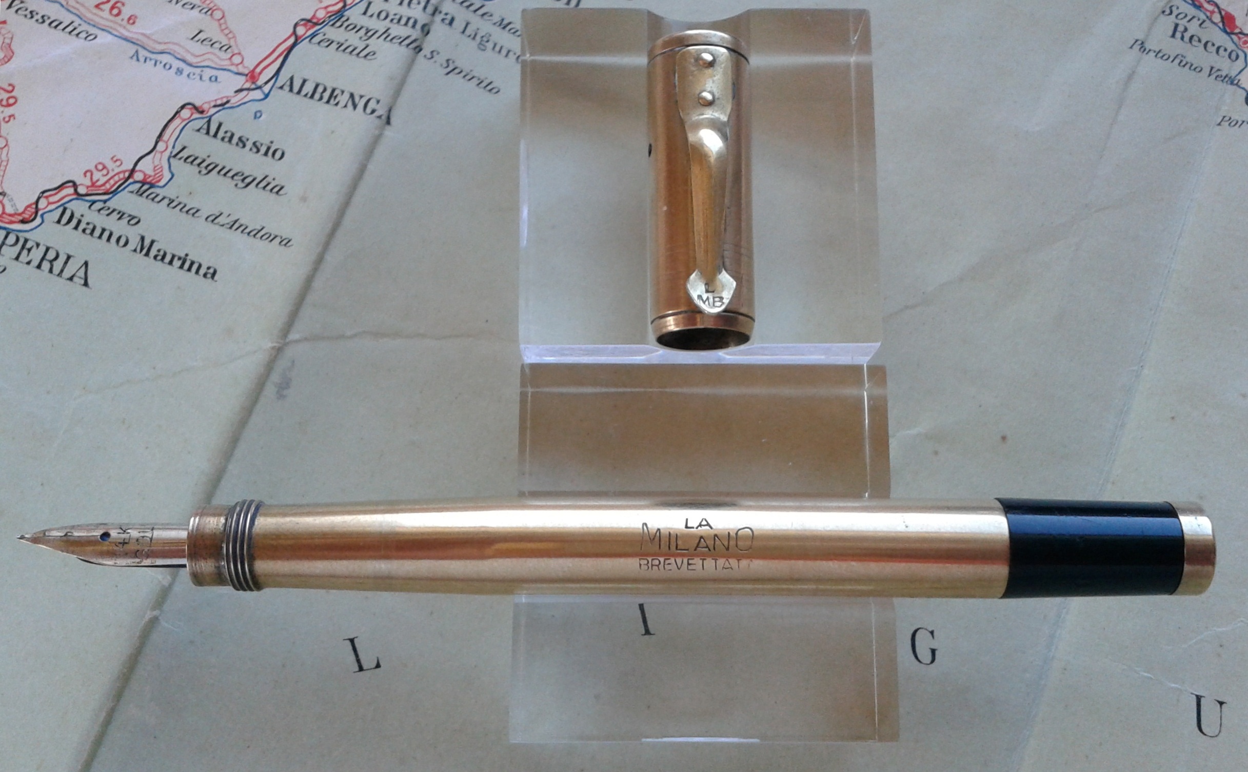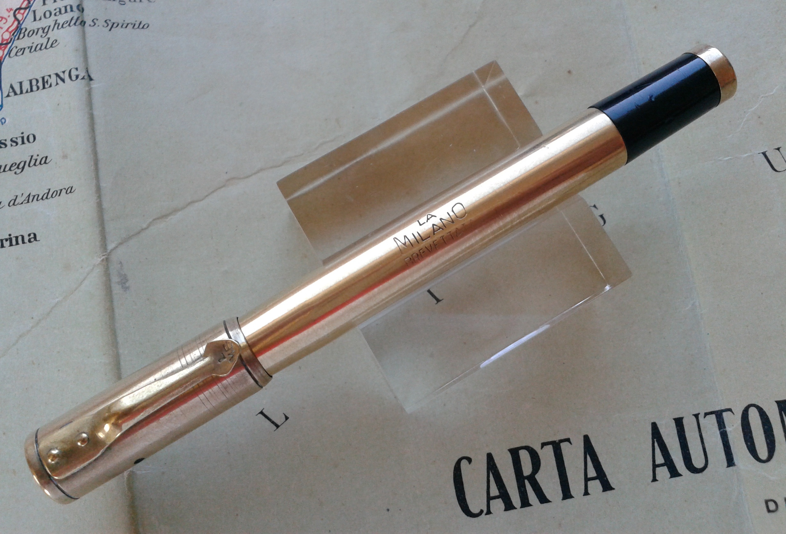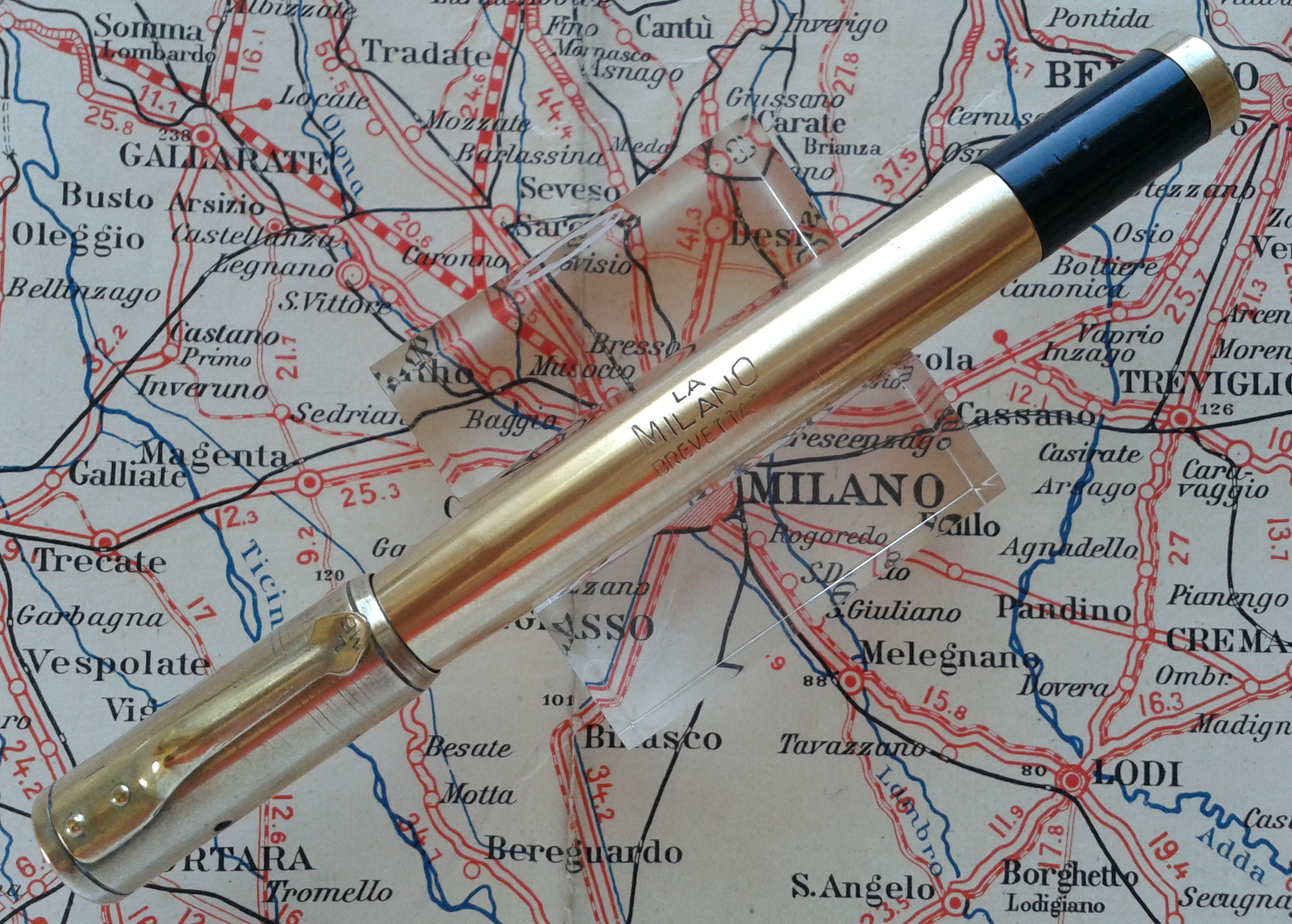 La mia scelta è caduta sulla curiosa scoperta di un recente mercatino: sotto una patina di lerciume indicibile si celava una stilografica che pareva una “chiave inglese” (solo per il peso! no, non allarmatevi, non è l’ennesima Summit nera), pareva persino una laminata senza esserlo, ma era riuscita comunque a ridestare in me il grato e mai sopito ricordo di quasi quarant’anni di vita milanese: non poteva essere altrimenti, d’altronde, poiché sul manufatto occhieggiava gagliardamente la (molto improbabile!) Marca