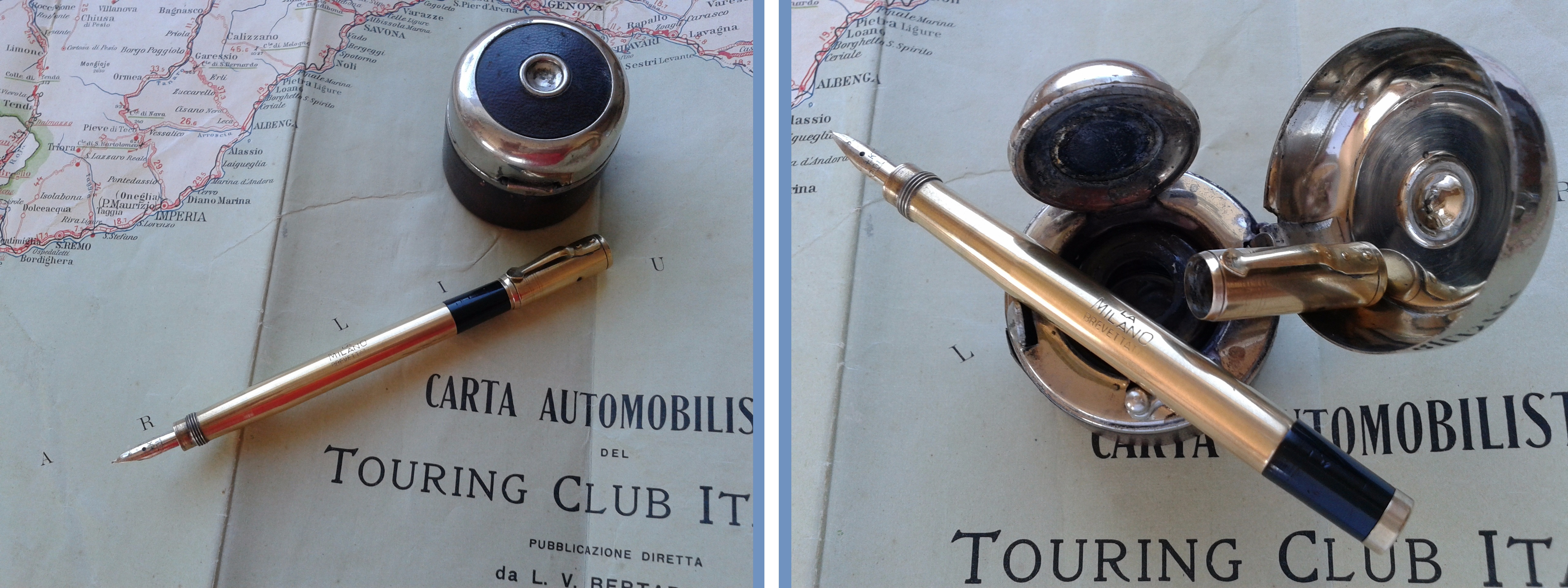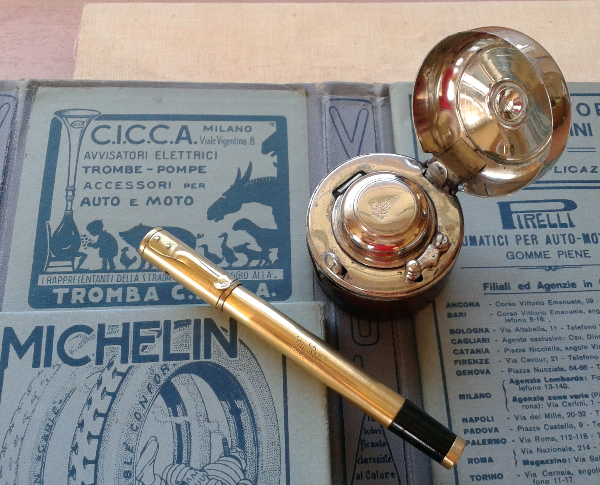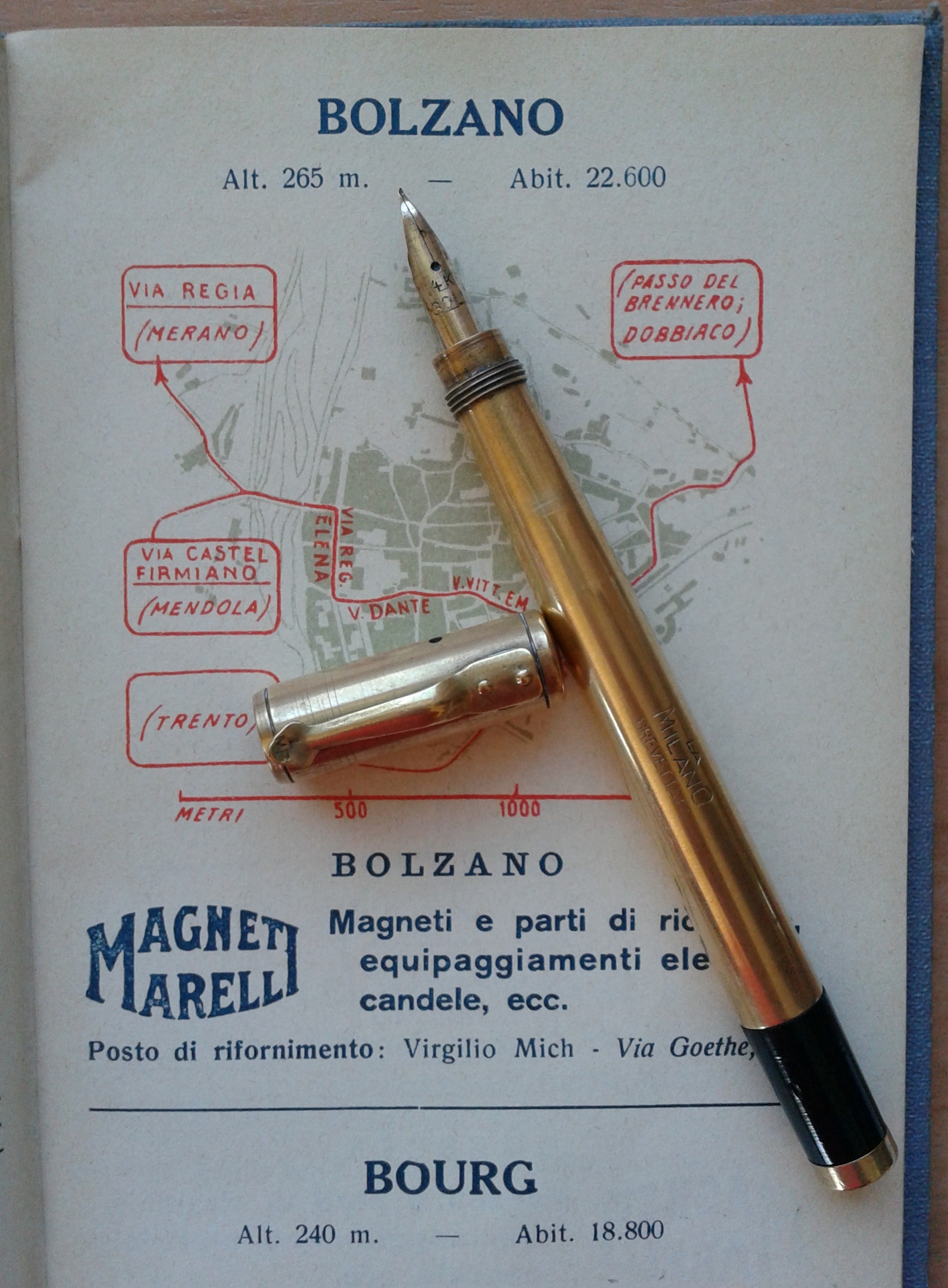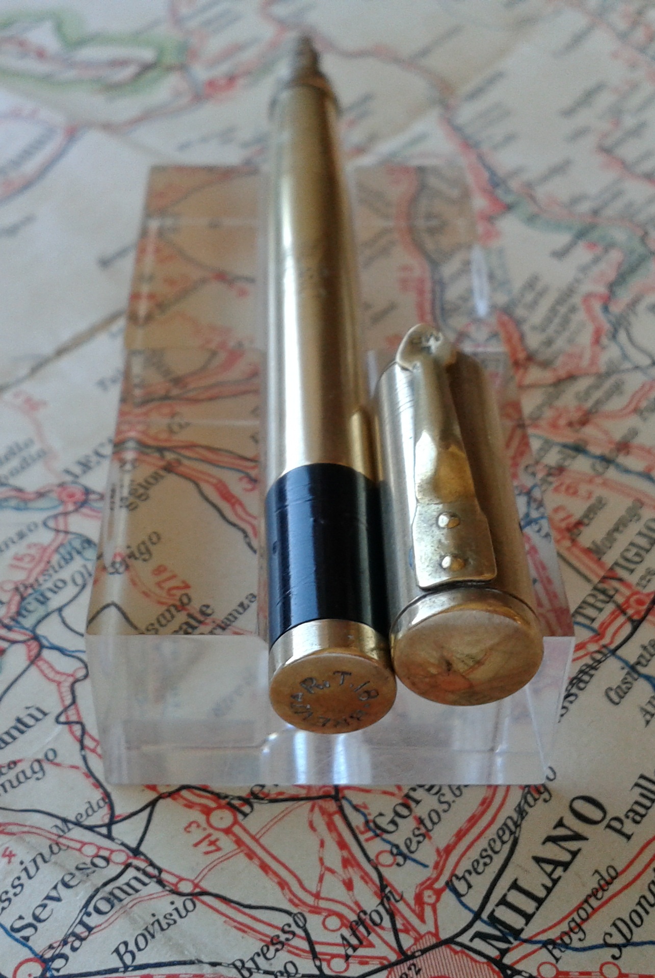 La mia scelta è caduta sulla curiosa scoperta di un recente mercatino: sotto una patina di lerciume indicibile si celava una stilografica che pareva una “chiave inglese” (solo per il peso! no, non allarmatevi, non è l’ennesima Summit nera), pareva persino una laminata senza esserlo, ma era riuscita comunque a ridestare in me il grato e mai sopito ricordo di quasi quarant’anni di vita milanese: non poteva essere altrimenti, d’altronde, poiché sul manufatto occhieggiava gagliardamente la (molto improbabile!) Marca