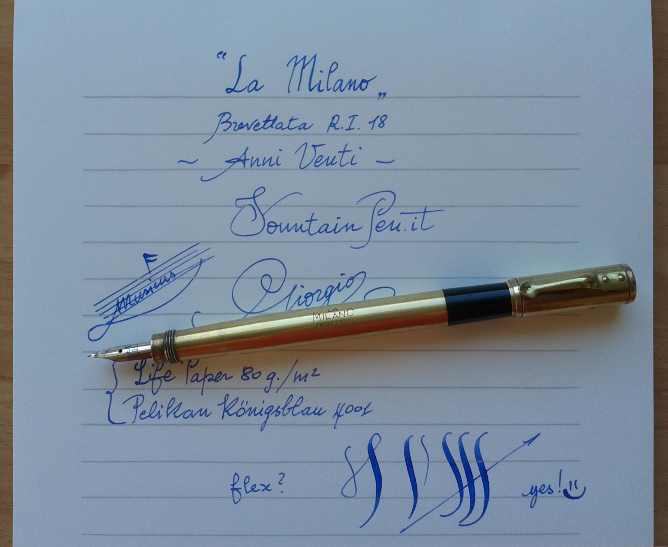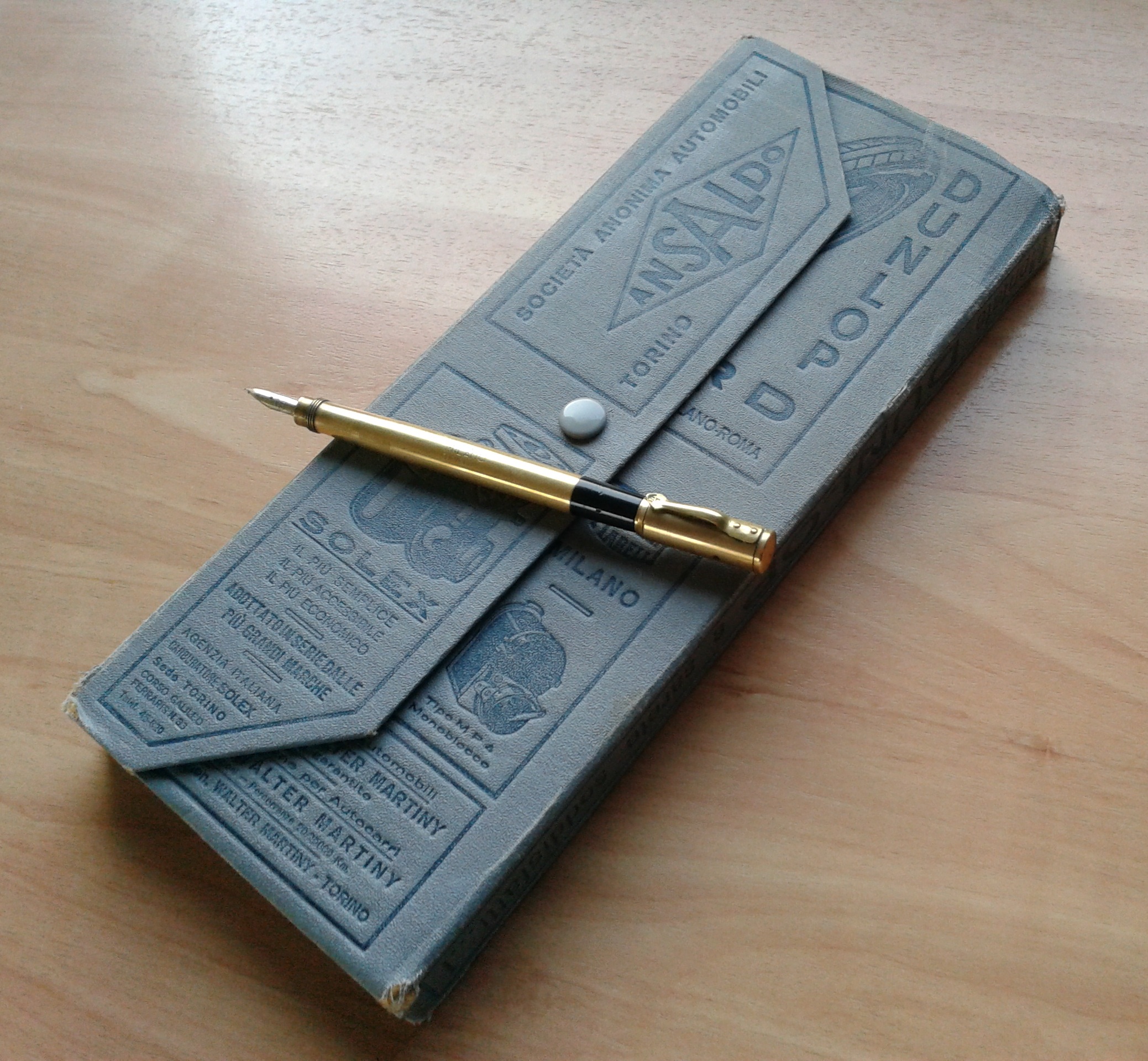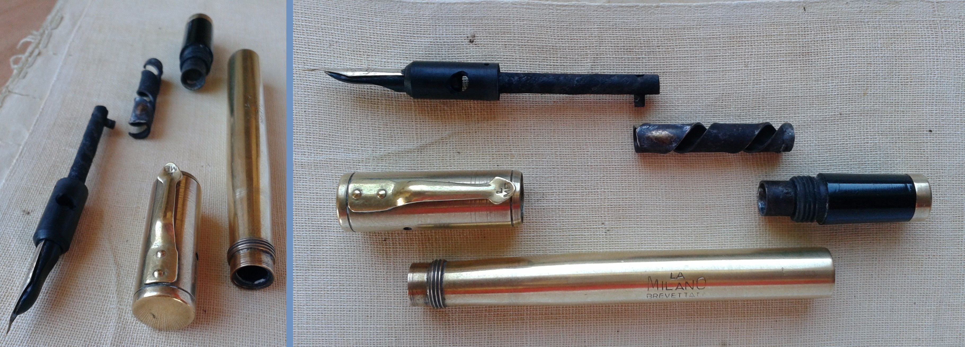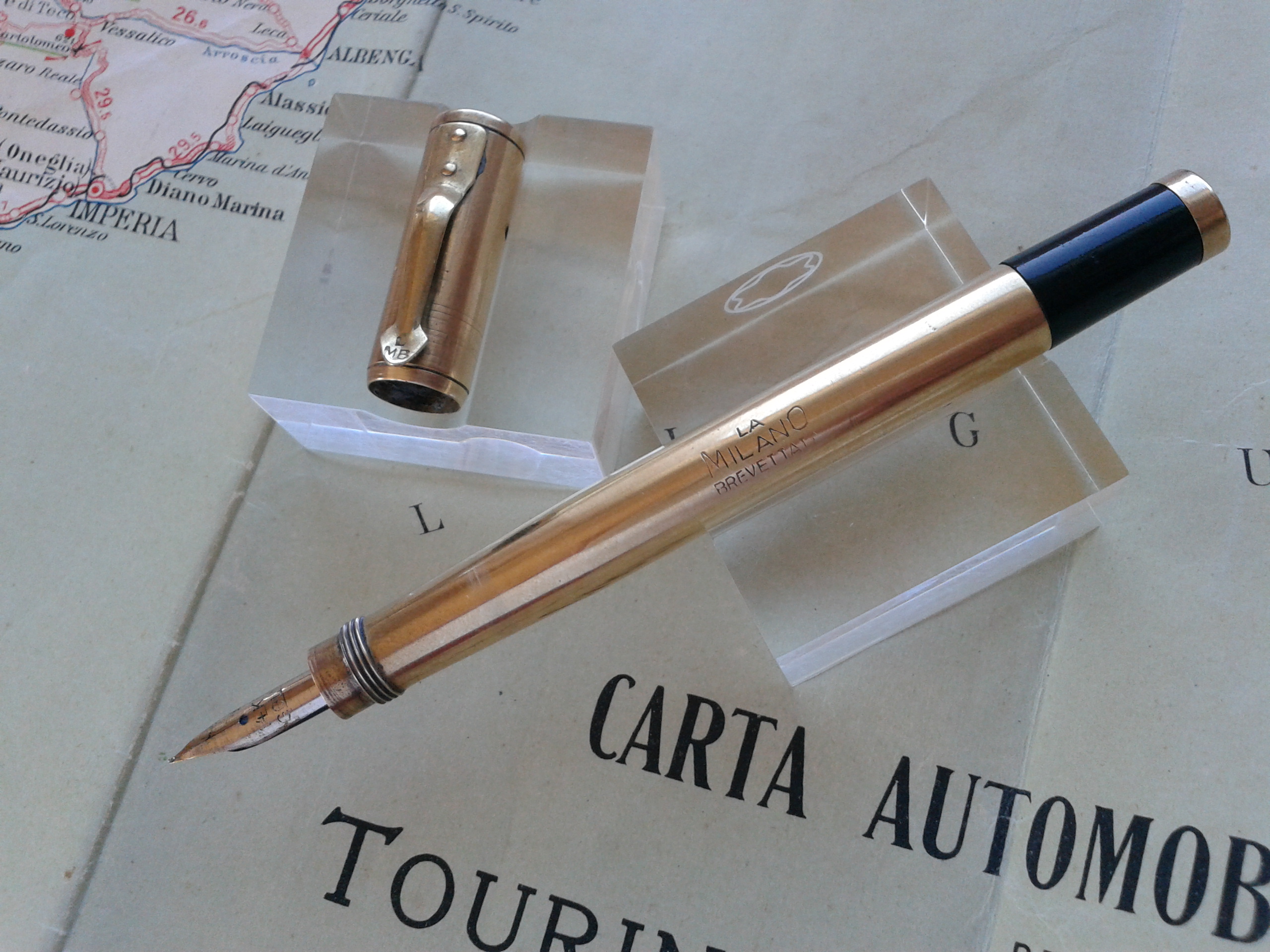 La mia scelta è caduta sulla curiosa scoperta di un recente mercatino: sotto una patina di lerciume indicibile si celava una stilografica che pareva una “chiave inglese” (solo per il peso! no, non allarmatevi, non è l’ennesima Summit nera), pareva persino una laminata senza esserlo, ma era riuscita comunque a ridestare in me il grato e mai sopito ricordo di quasi quarant’anni di vita milanese: non poteva essere altrimenti, d’altronde, poiché sul manufatto occhieggiava gagliardamente la (molto improbabile!) Marca