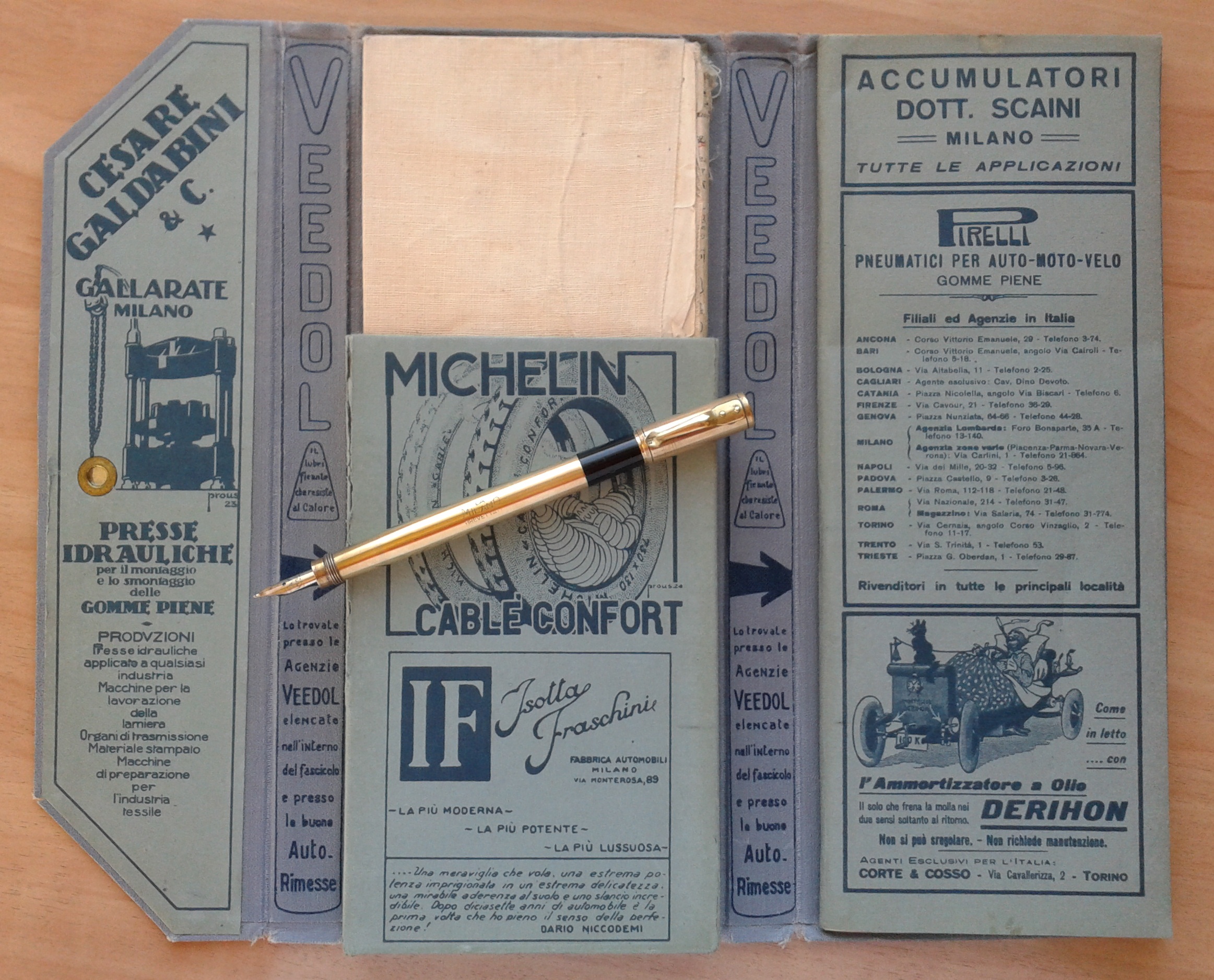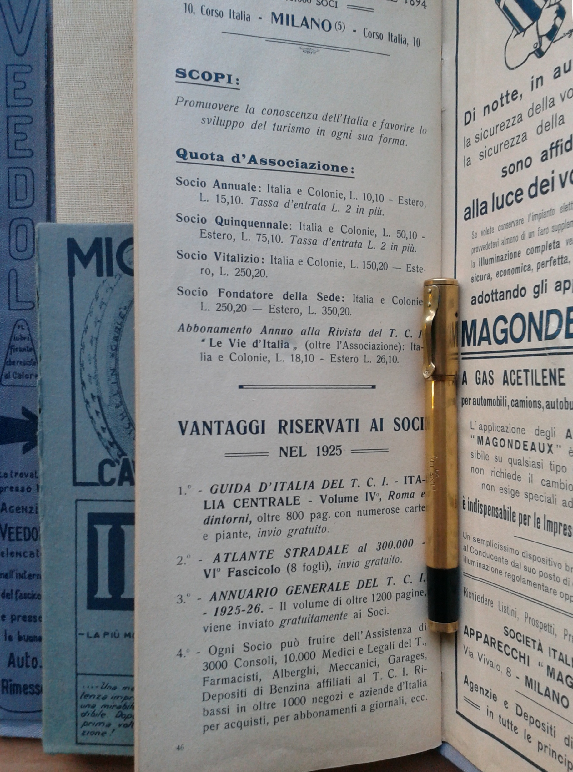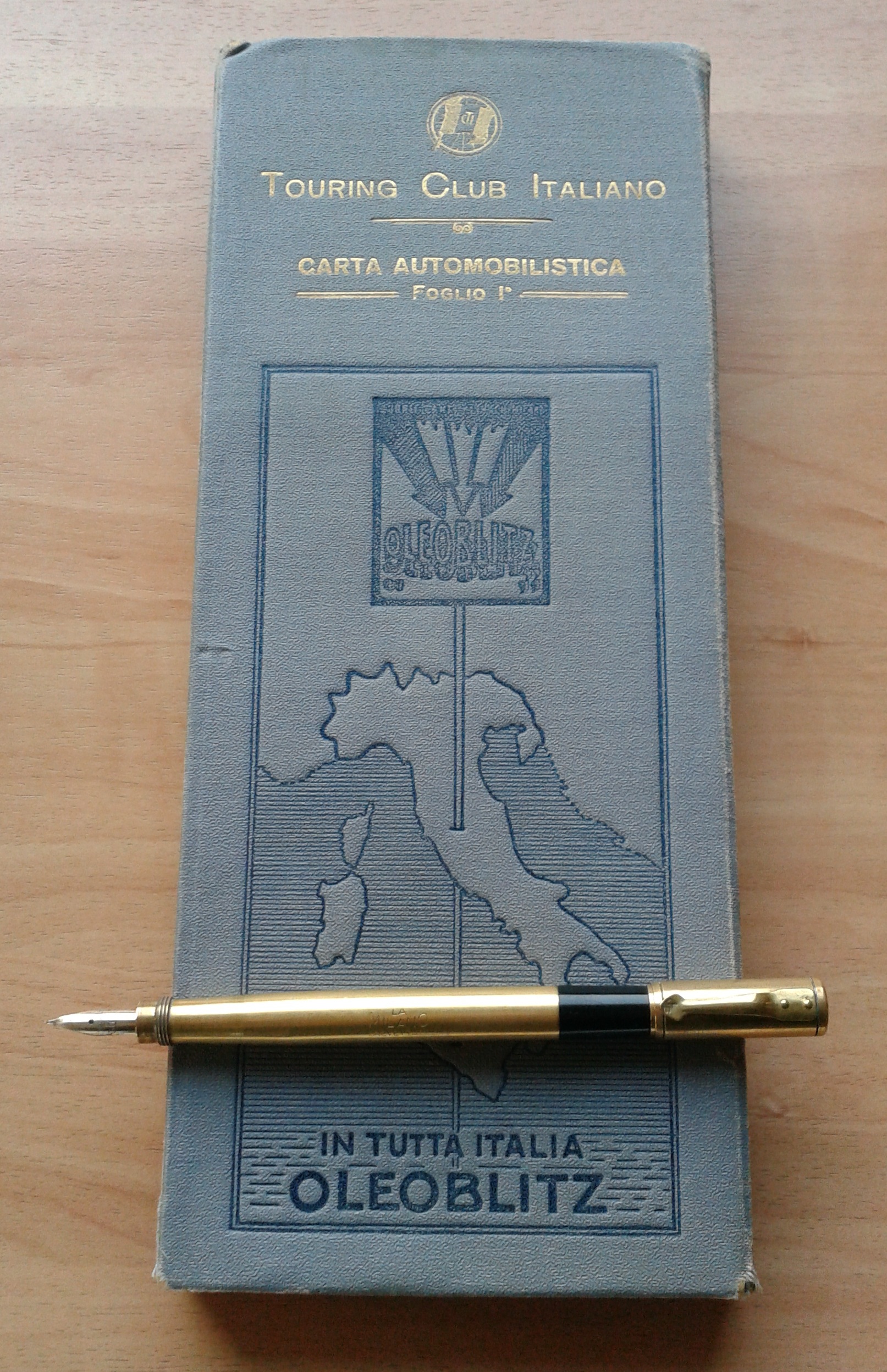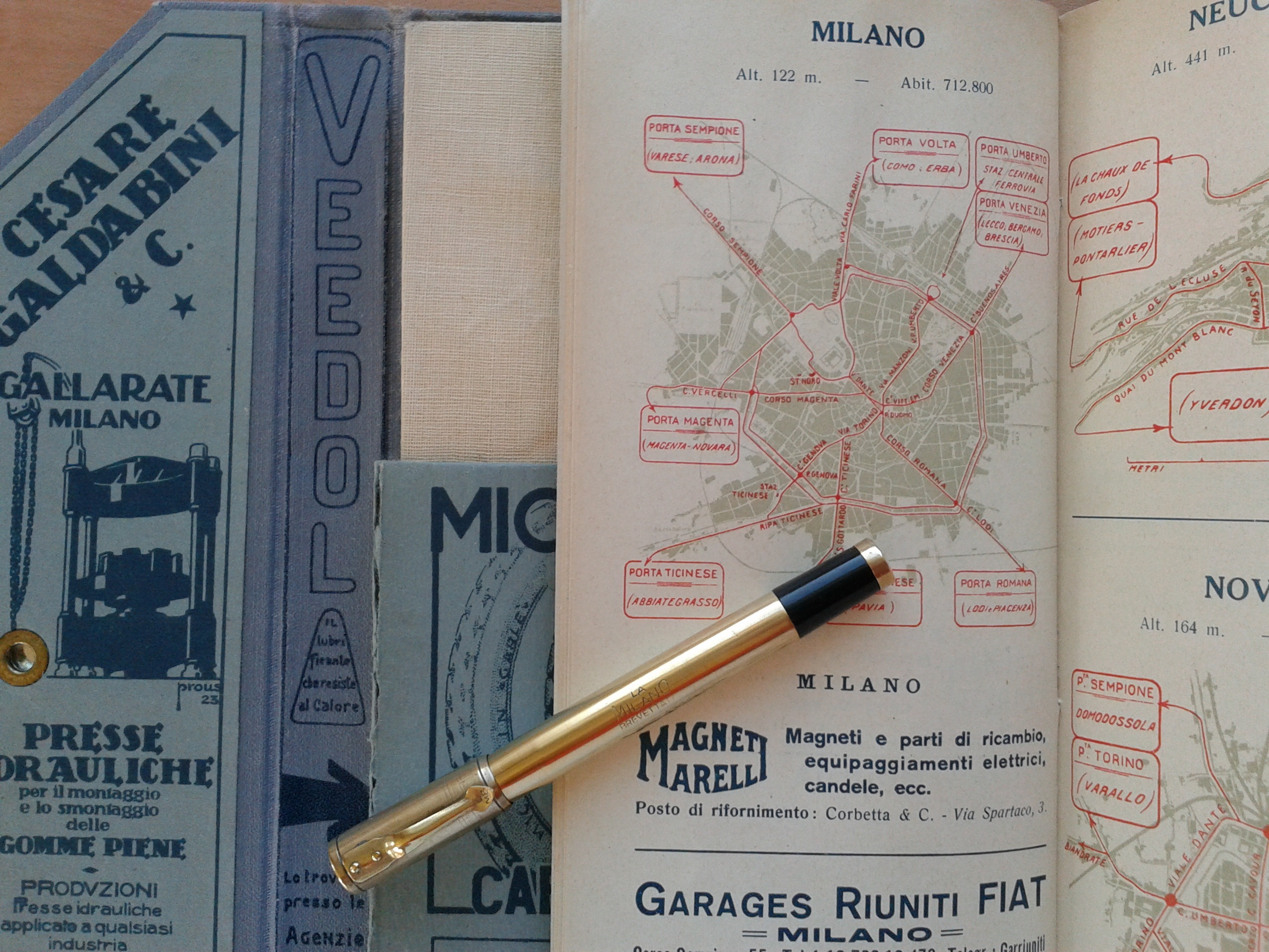 Se uno ha nel vano portaoggetti una penna d’epoca, dovrà consultare una cartina d’epoca, mi sono detto: e così ho deciso di affidarmi alla mappa del Nord Italia del Touring Club Italiano del 1925/1926 (proprio quella che fa la pubblicità della mia Isotta Fraschini), rigorosamente incollata su tela e contenuta in apposito astuccio chiuso da un bottone automatico. Ho quindi estratto il calamaio da viaggio della marina austriaca (che tanto a loro dopo la I Guerra Mondiale non sarebbe servito, che il mare non ce l’avevano nemmeno più