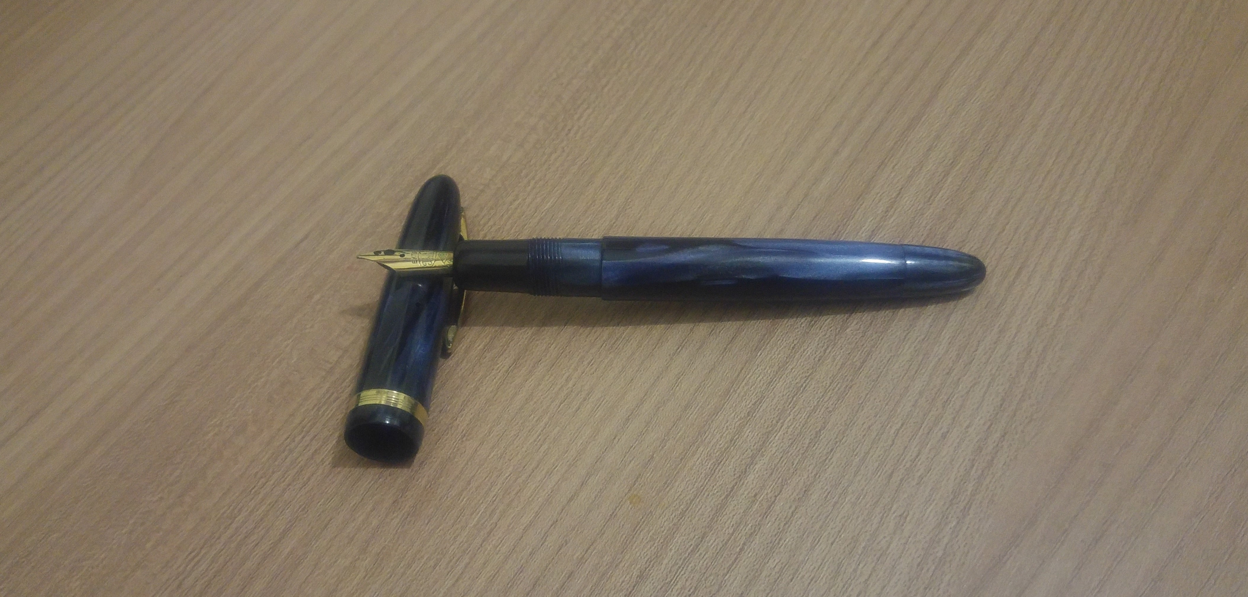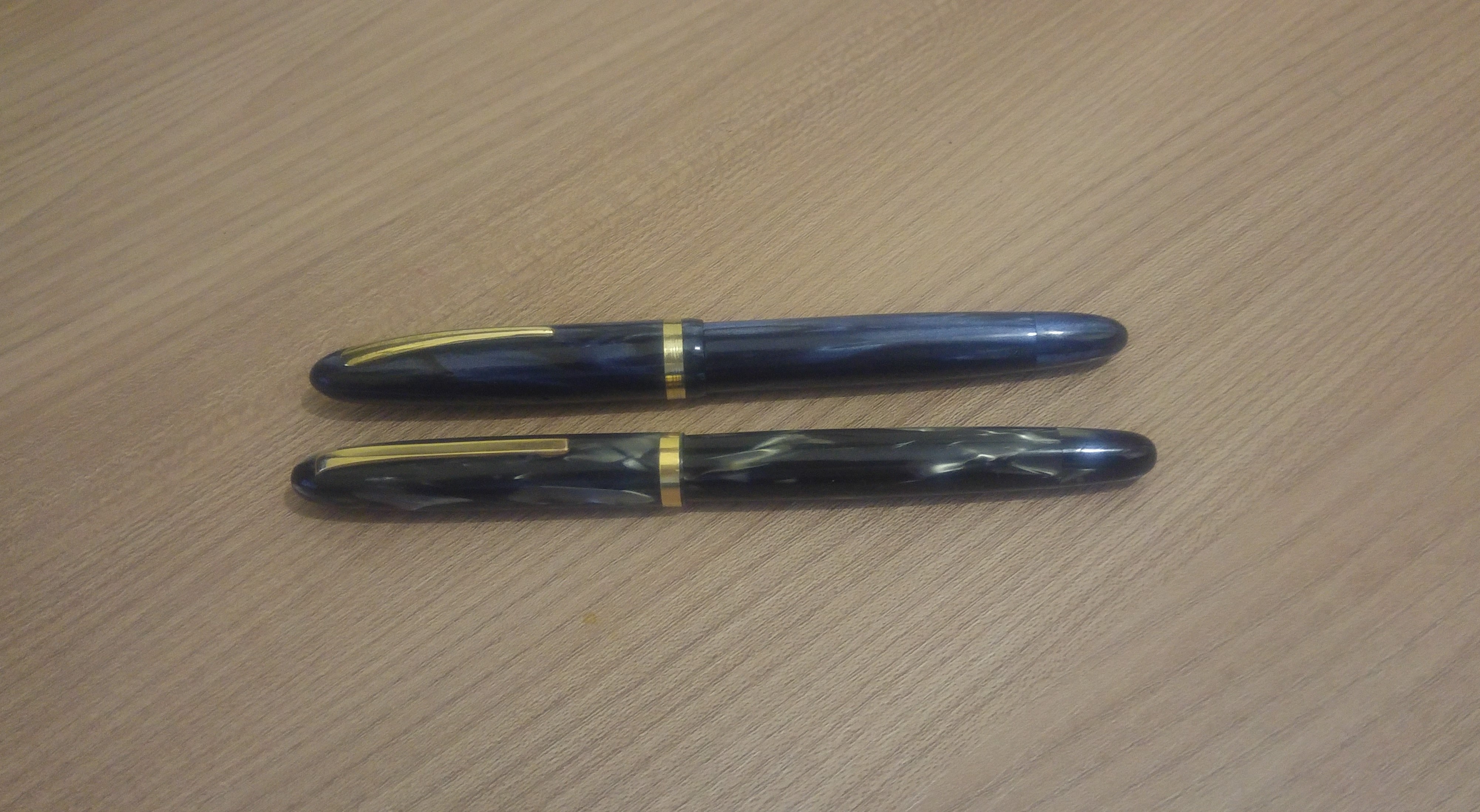 Penna che si usa tranquillamente sia con cappuccio calzato che senza, senza risentire di sbilanciamenti. Il cappuccio si rimuove in poco più di 1.5 giri e la clip è abbastanza rigida. Flusso ben regolato con un tratto Medio, pennino poco flessibile ma piacevolmente morbido. Mi ricorda molto una delle mie OMAS, una 556/S grigia madreperlata. Eccole a confronto.