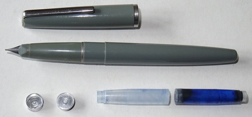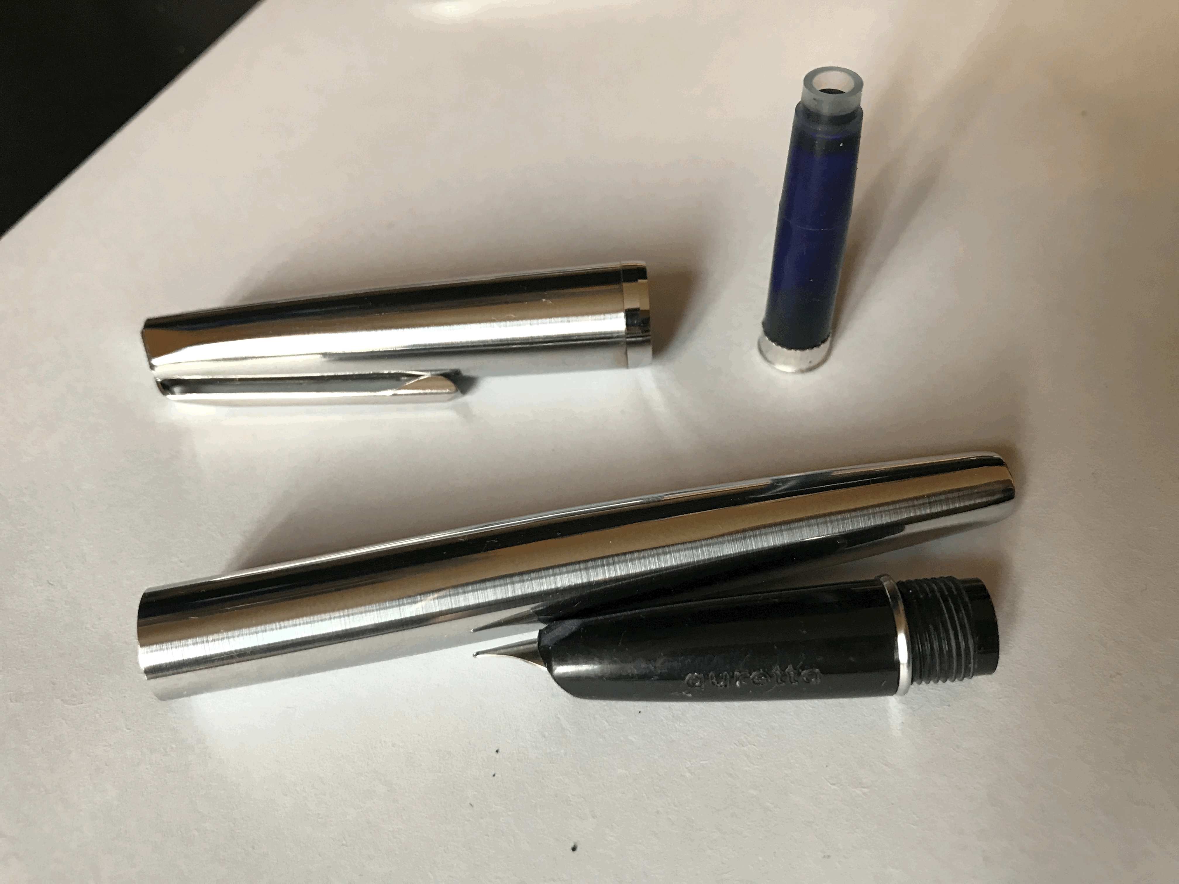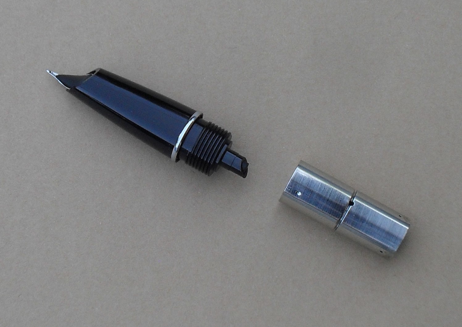 Alimentazione: a cartuccia, non ha manicotto interno in acciaio può contenere due cartucce (vedi foglio istruzioni). Inoltre una delle due in mio possesso ha ancora il campanello sul fondo del corpo della penna che segala presenza di una sola cartuccia.