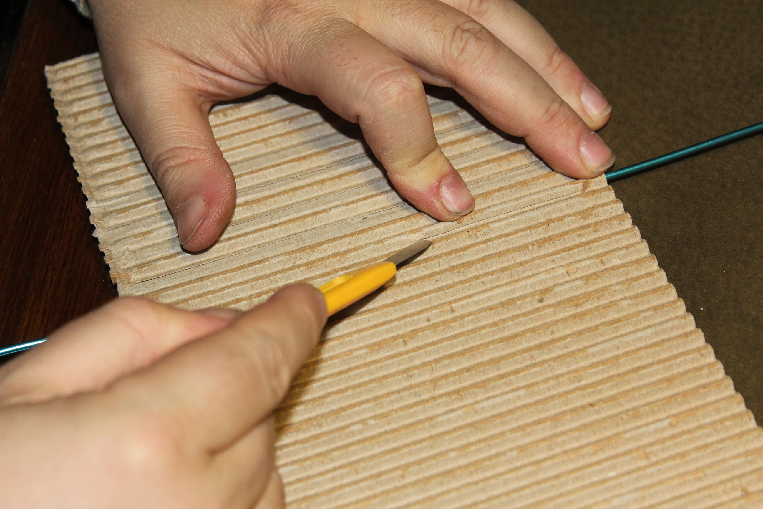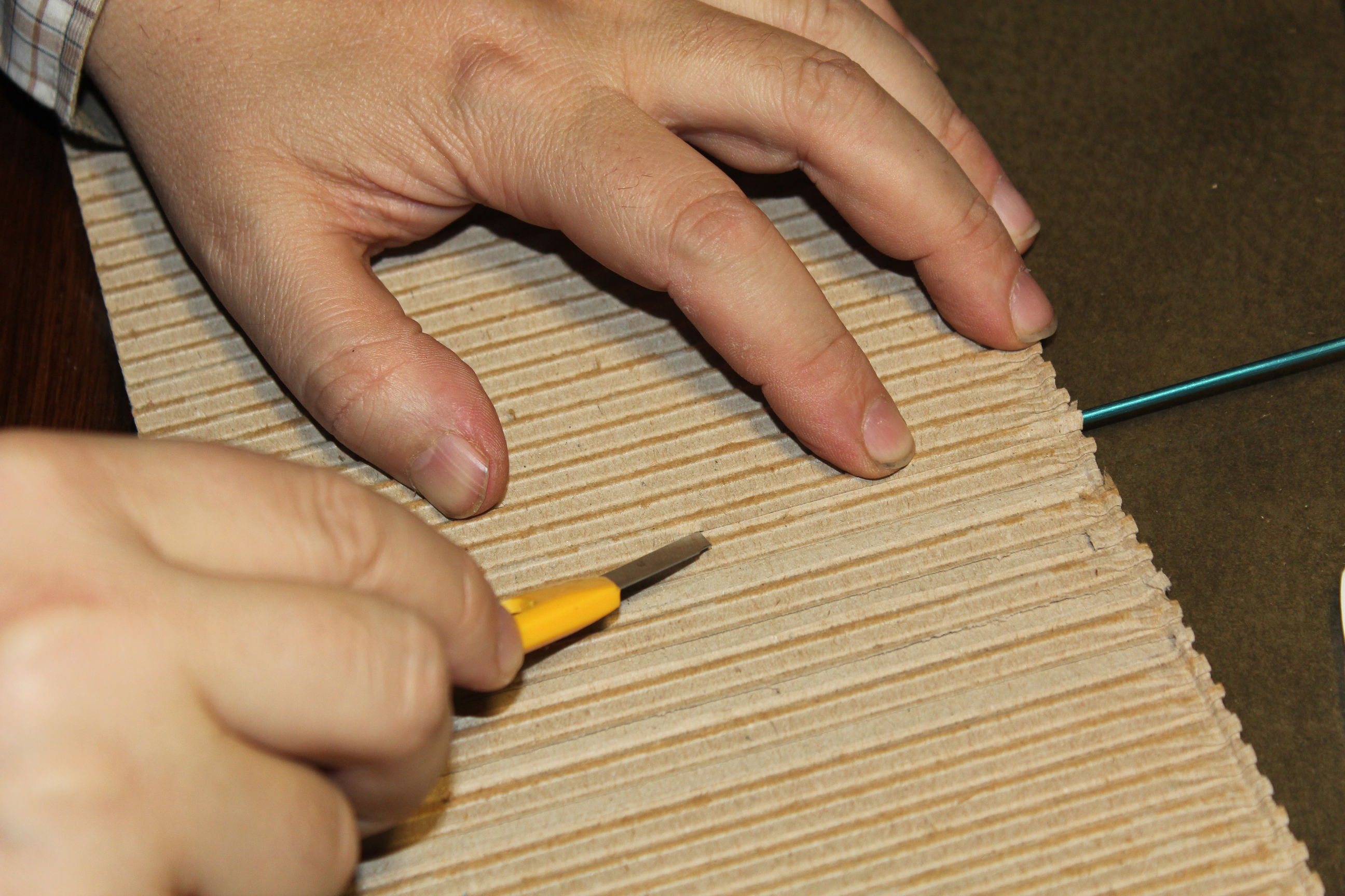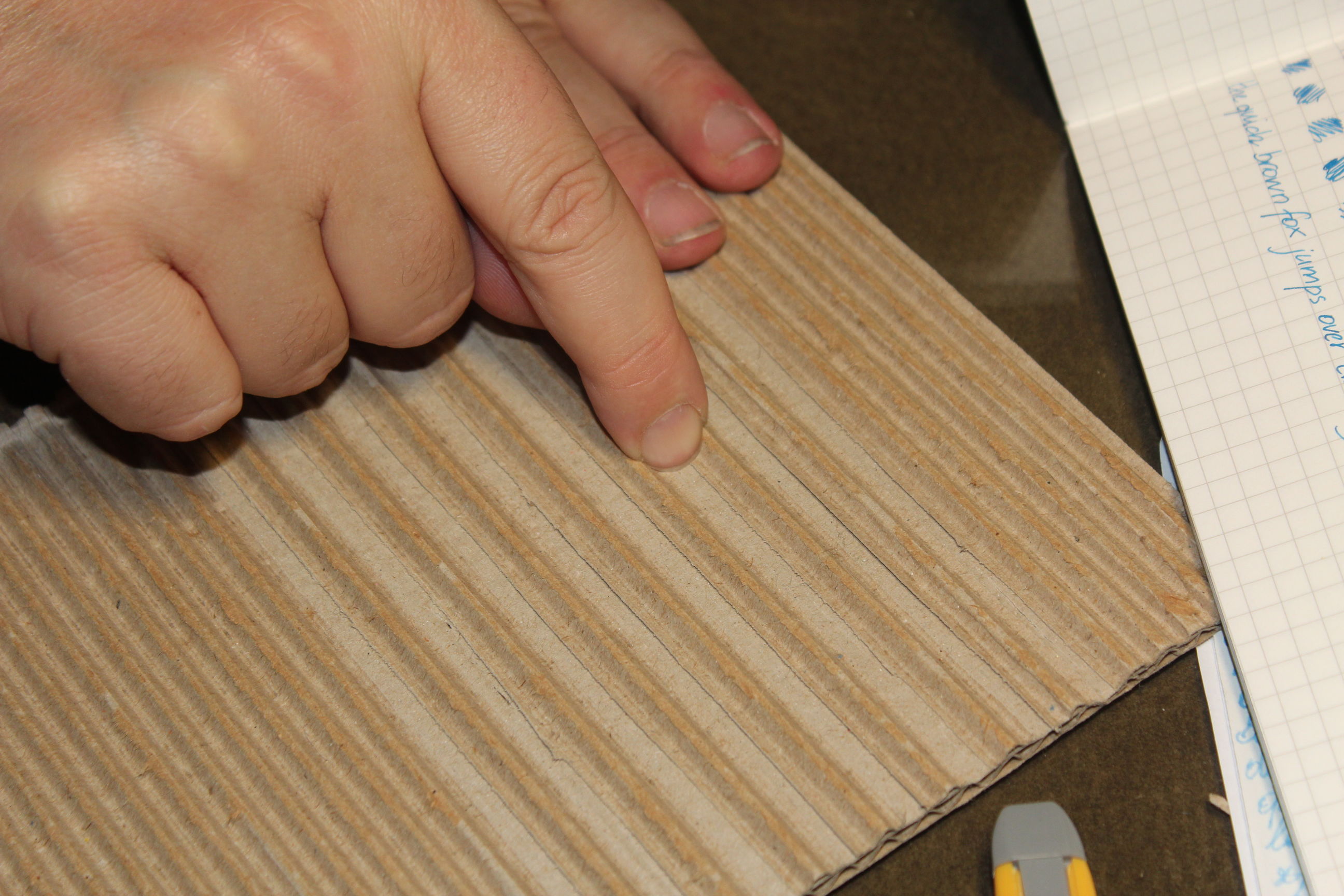 Il primo passo è rimuovere uno degli strati laterali, come illustrato nell'immagine precedente, ma se il cartone è di buona qualità non si pensi di poterlo fare semplicemente tirando, si riuscirà solo togliere uno strato superficiale, con il resto della carta che resta attaccata alle ondulazioni. Occorre aiutarsi con il trincetto per sollevando lo strato per incidere la parte di carta della copertura che quando si tira che resta a incollata all'ondulazione.