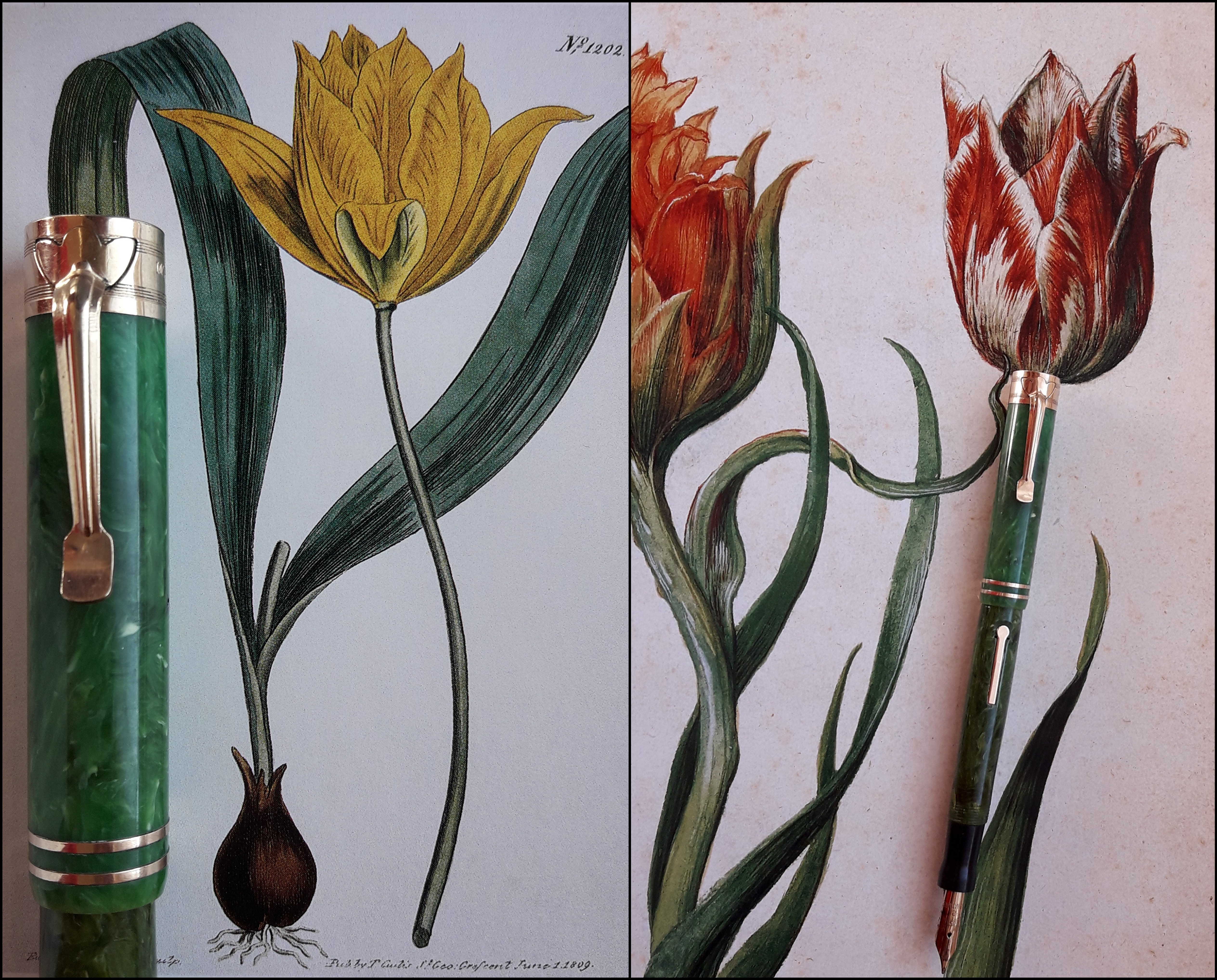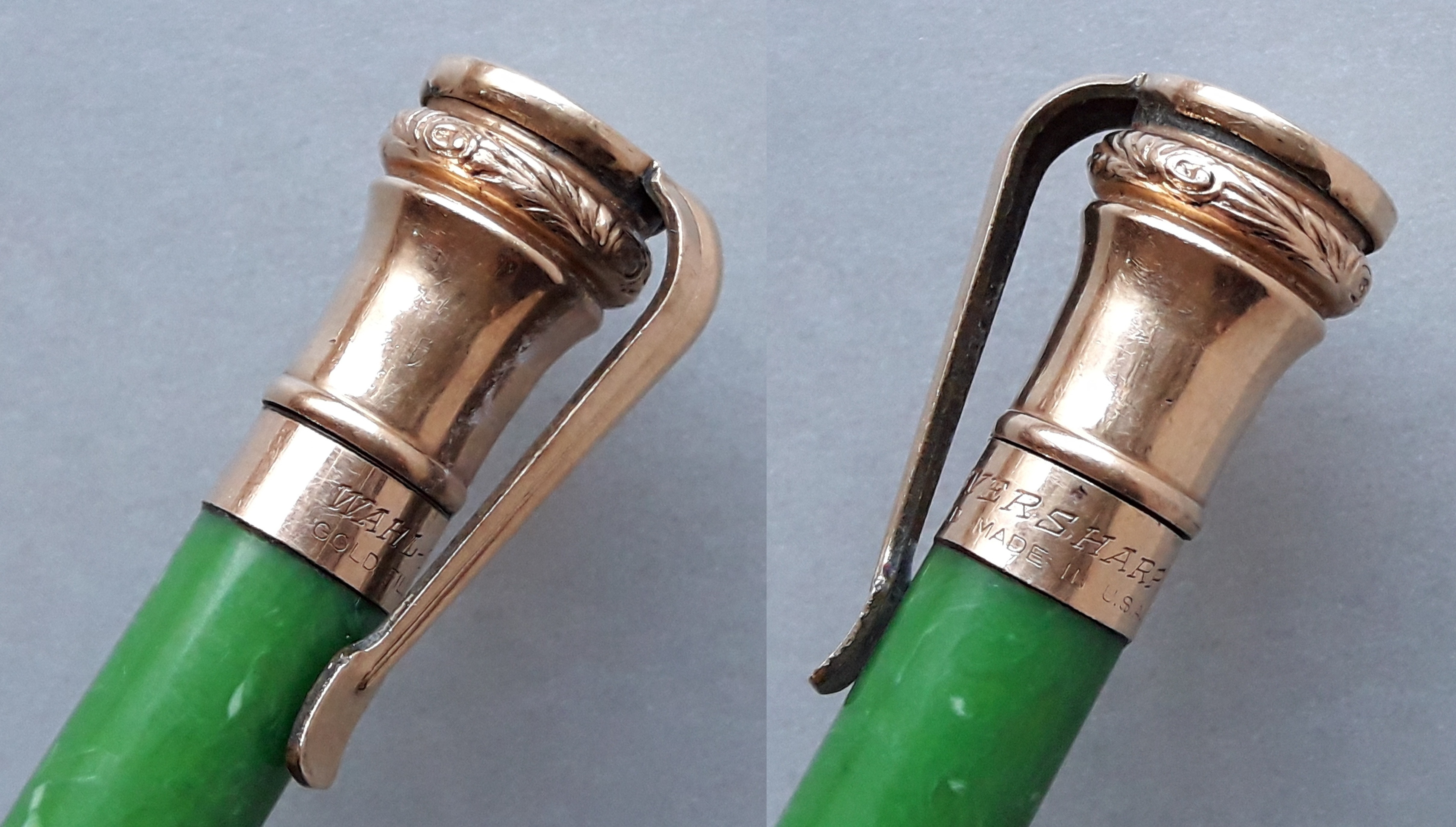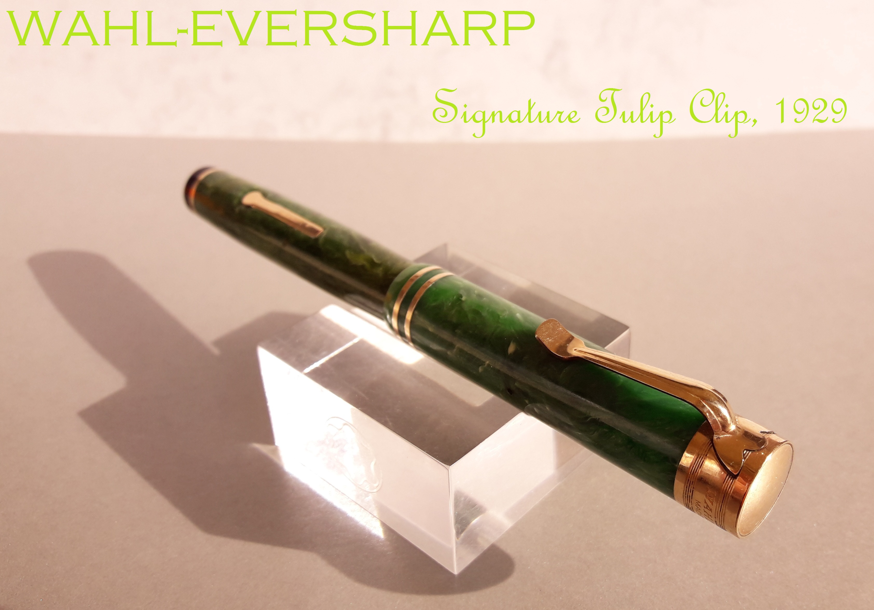 La penna veniva proposta al pubblico al prezzo di $3.50, quando la top di gamma nello stesso colore verde giada, una “Deco Band”/”Personal Point Gold Seal #6”, ne costava $7.00 (ma la Black&Pearl e la Bronze&Green, i nuovi colori, persino $8.00). La nota curiosa è che nel 1929 la Wahl decise di non riproporre anche la versione grande della Tulip Clip, con pennino #4 (prezzata a $5 nel 1928), che era un pennone micidiale (più per soldati che per studenti, direi