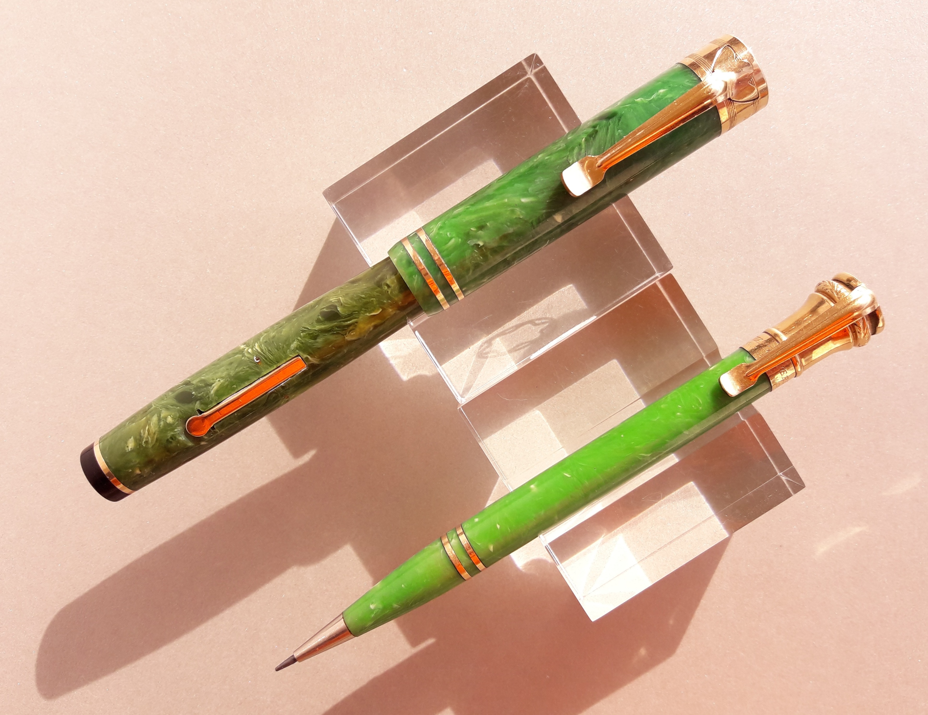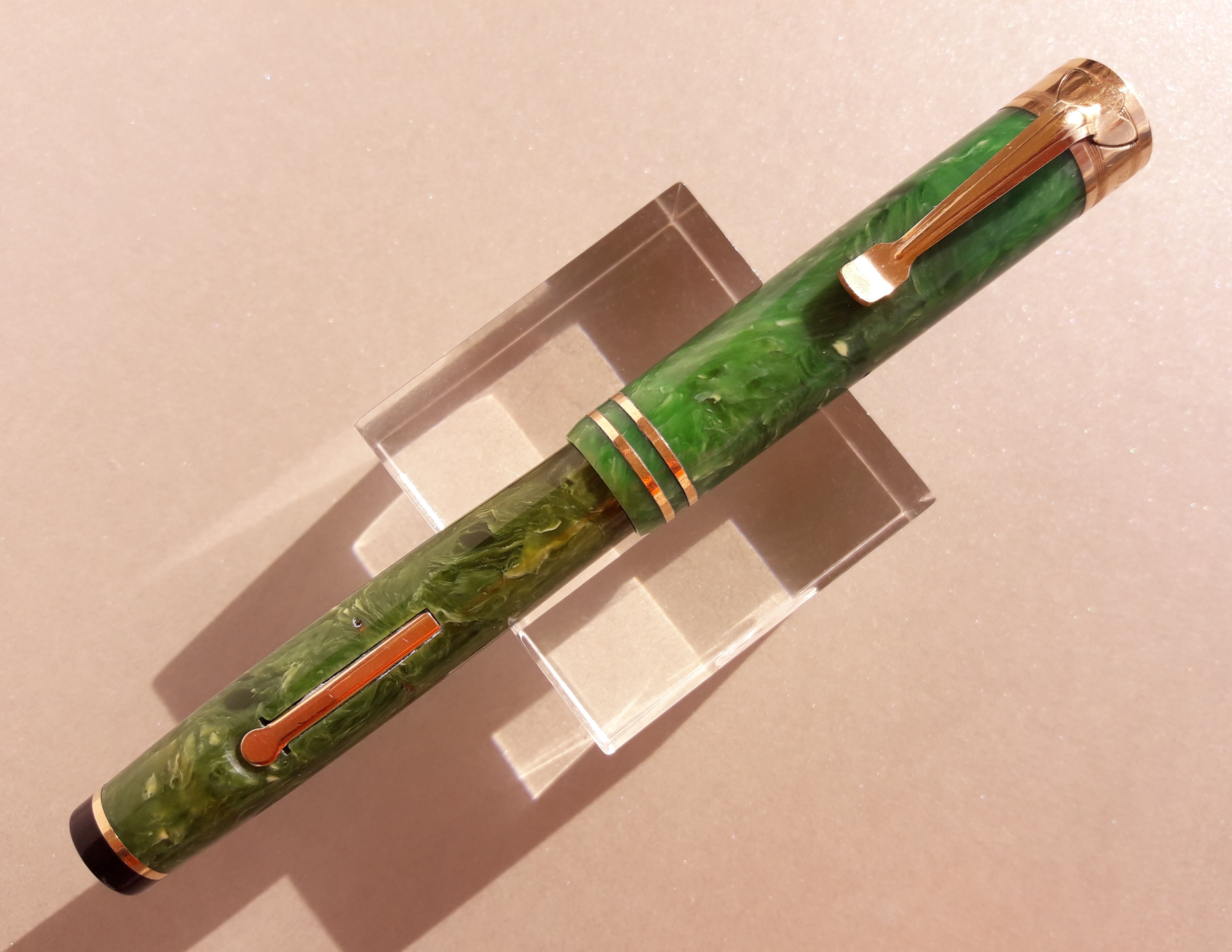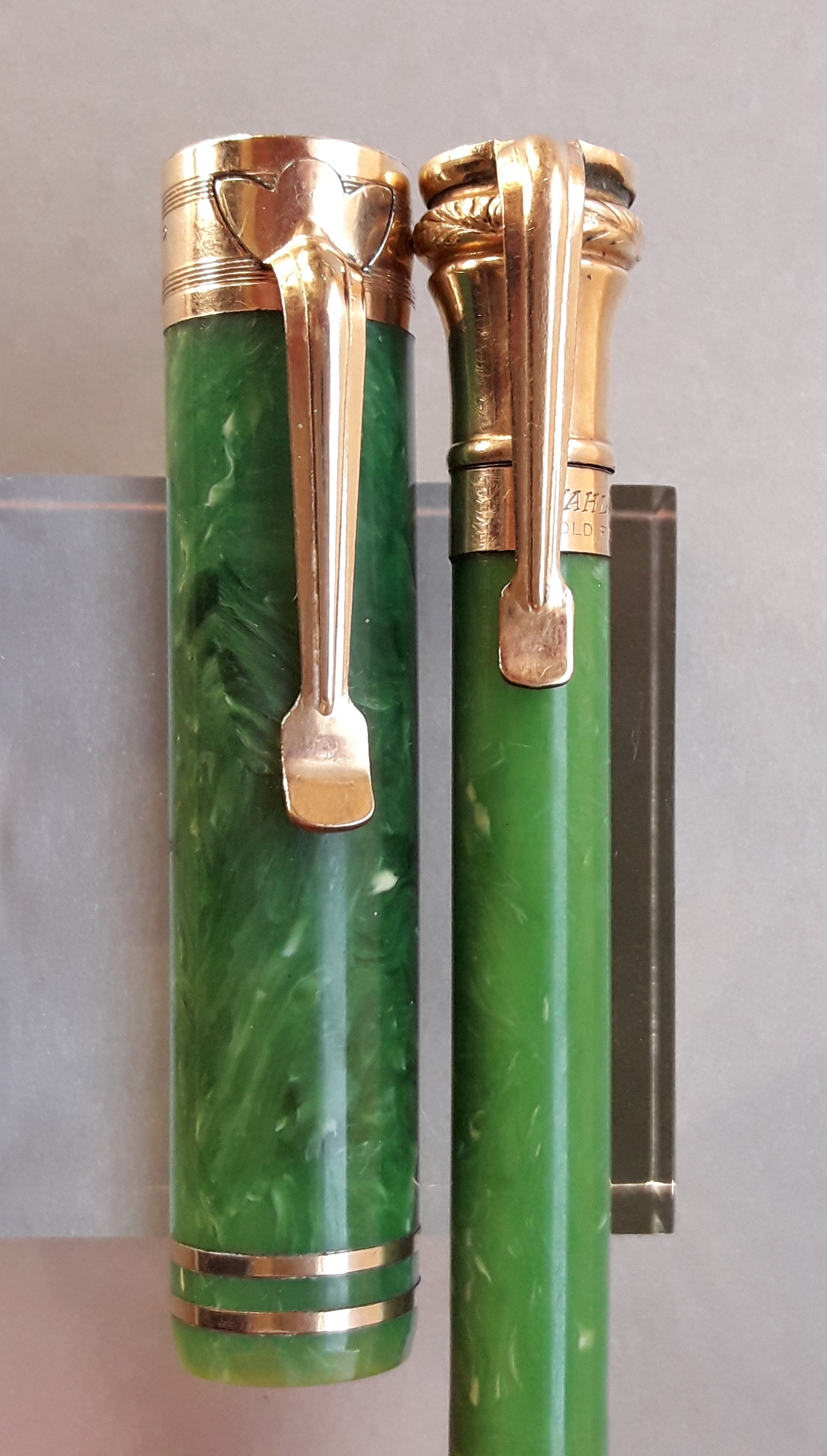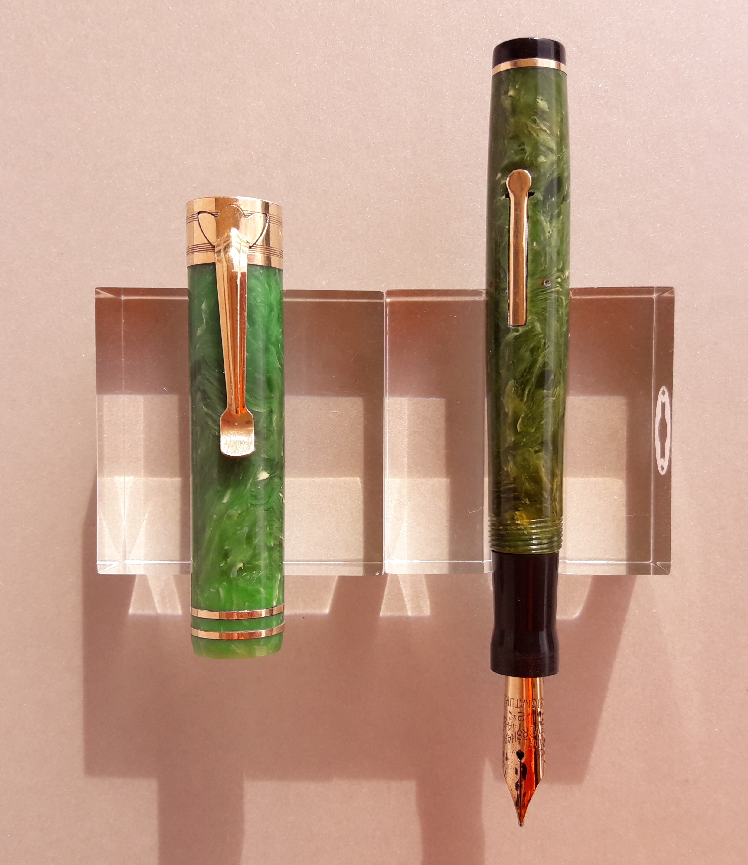 Pyroxalin”!) verde giada: viene definita “penna corta con clip militare” e raccomandata agli studenti per l’ampia scelta dei pennini e dei colori, la qualità/robustezza delle laminature in oro e la capacità della clip di rimanere saldamente fissata al quaderno o al taschino della camicia.