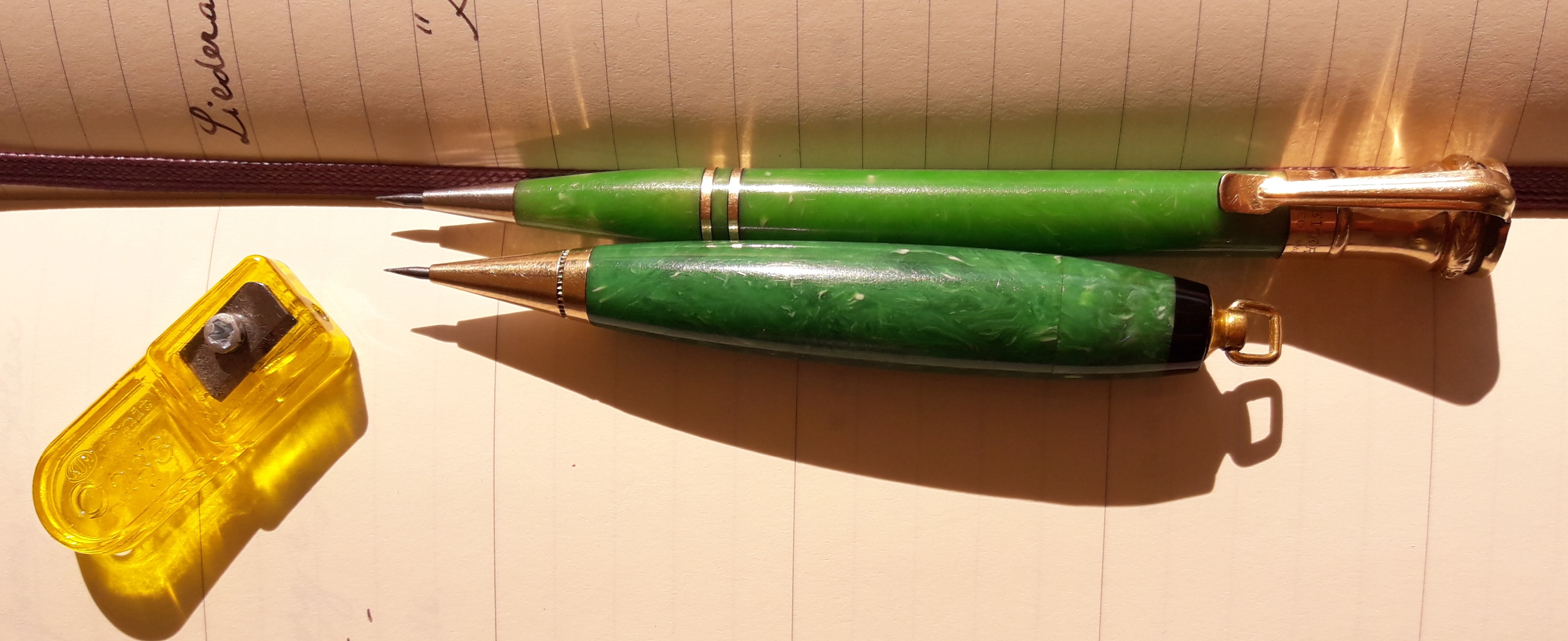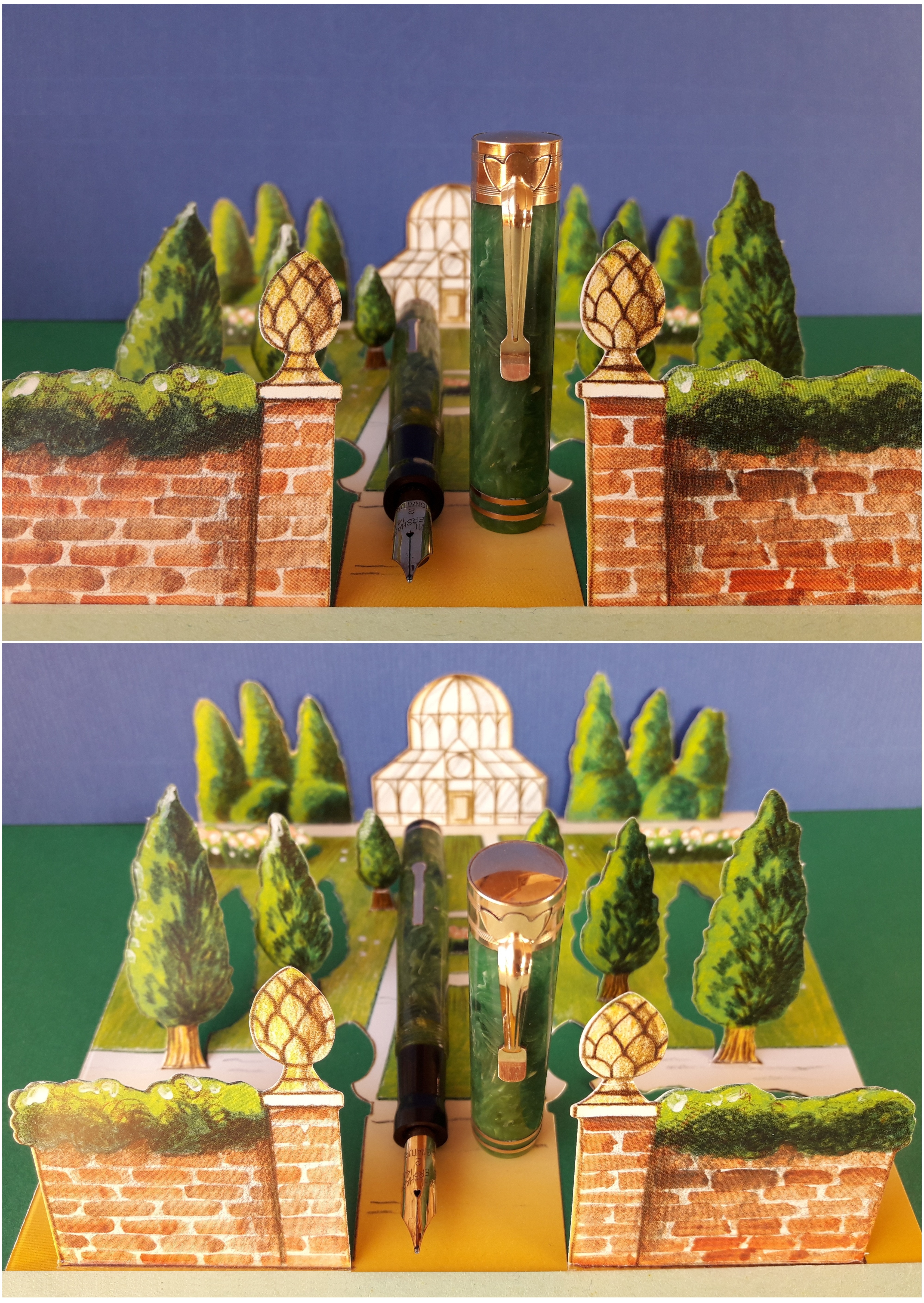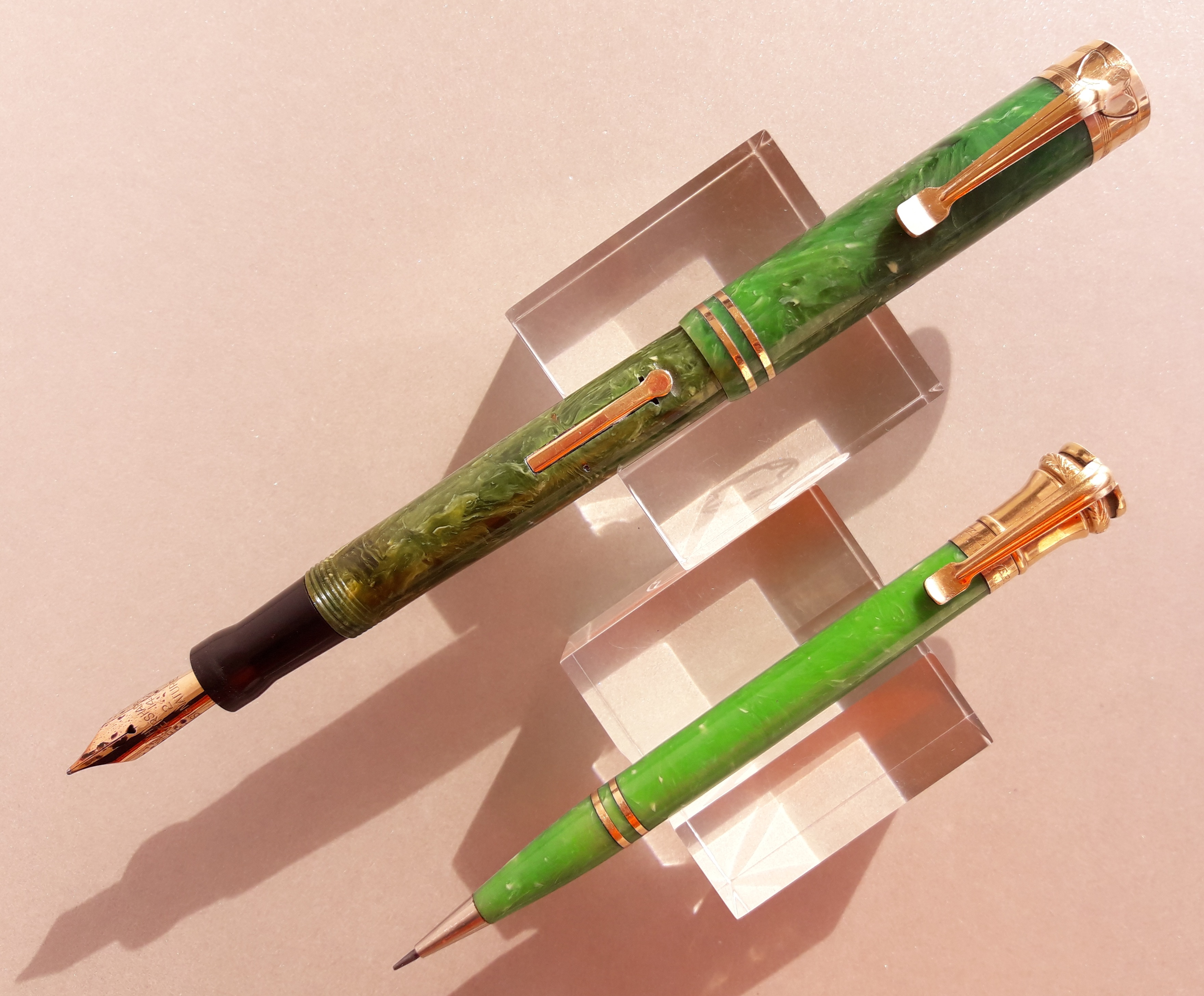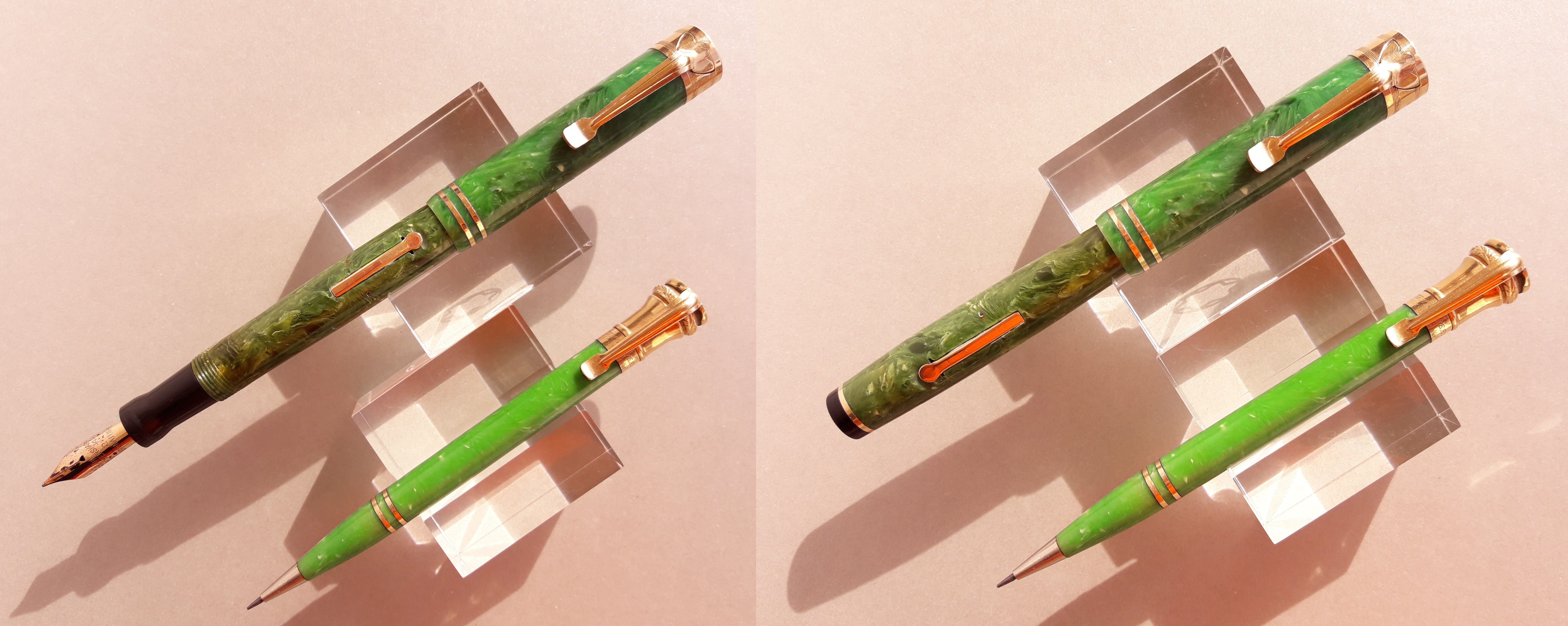 Pyroxalin”!) verde giada: viene definita “penna corta con clip militare” e raccomandata agli studenti per l’ampia scelta dei pennini e dei colori, la qualità/robustezza delle laminature in oro e la capacità della clip di rimanere saldamente fissata al quaderno o al taschino della camicia.
