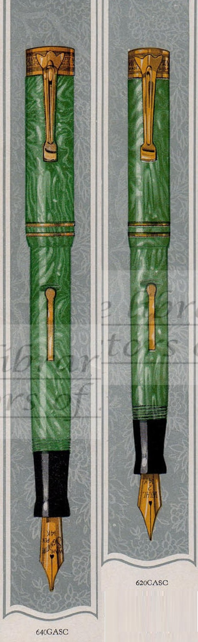 Nel 1929, quindi, con il cambio delle sigle troviamo solo la taglia corta (#2, quella in presentazione) e una penna identica che invece di essere chiamata 620GASC e avere il marchio “WAHL PEN” si chiama 6212SC ed è marchiata “WAHL-EVERSHARP”; il codice 6212SC può essere così interpretato: 6 (a questo punto forse davvero la lunghezza), 2 il pennino, 12 il colore verde giada, SC come sopra…