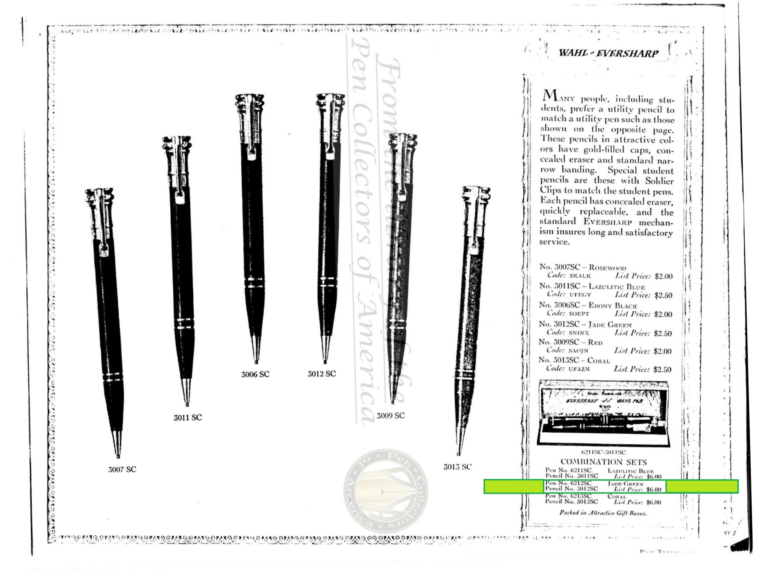 La matita meccanica, prezzata $2.50, è catalogata come 3012SC (mentre tra il 1927 e il 1928 era “3GSC”, Green Soldier Clip).