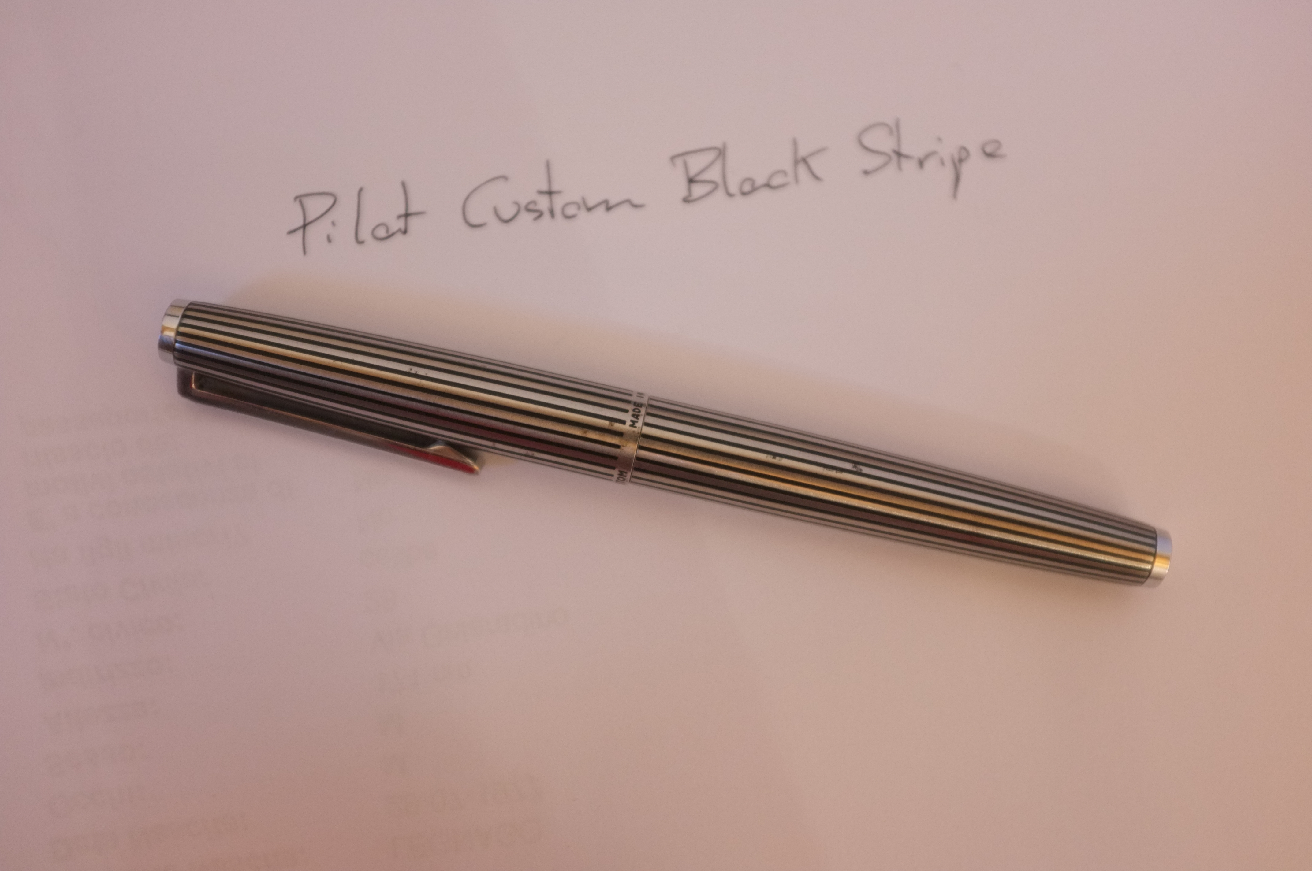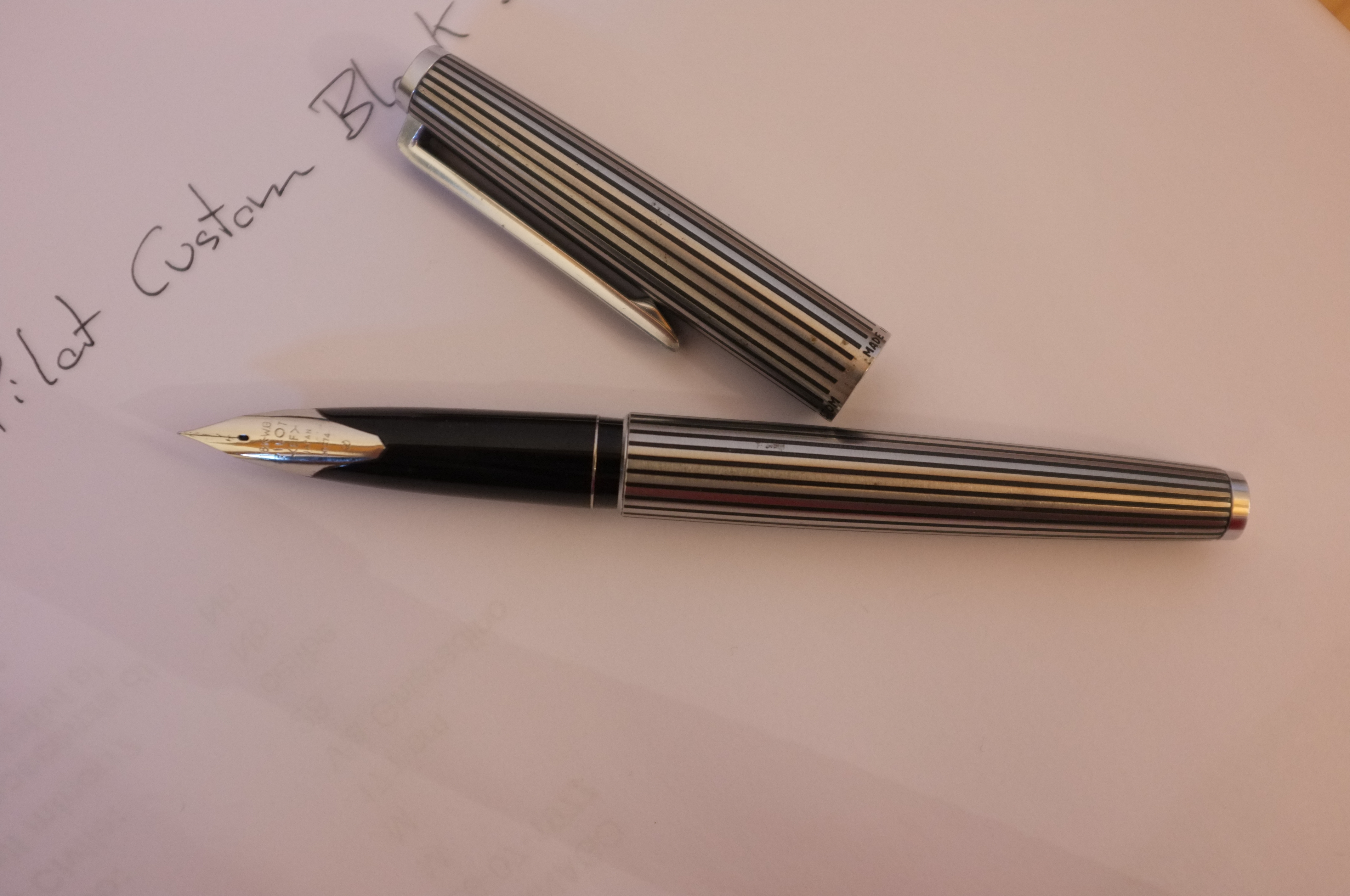 Vi presento uno dei miei ultimi acquisti, una pilot custom black stripe del 1970. Pilot negli anni 70 produsse varie penne con questa finitura, per me molto elegante, tra cui anche una VP, una penna pocket e una penna con pennino integrale (non ricordo se Murex o MYU).