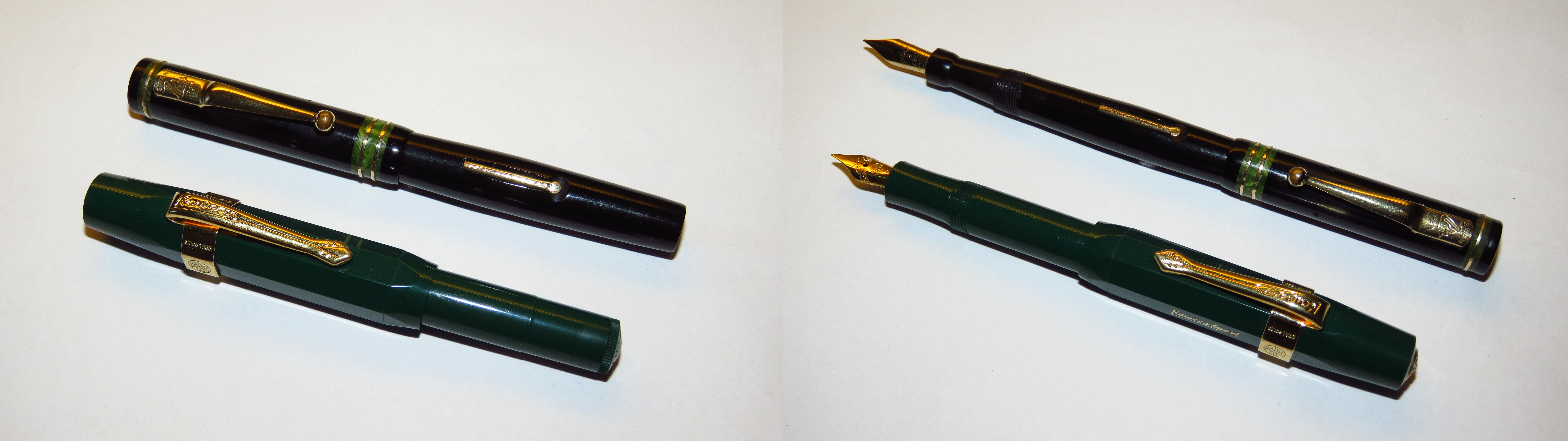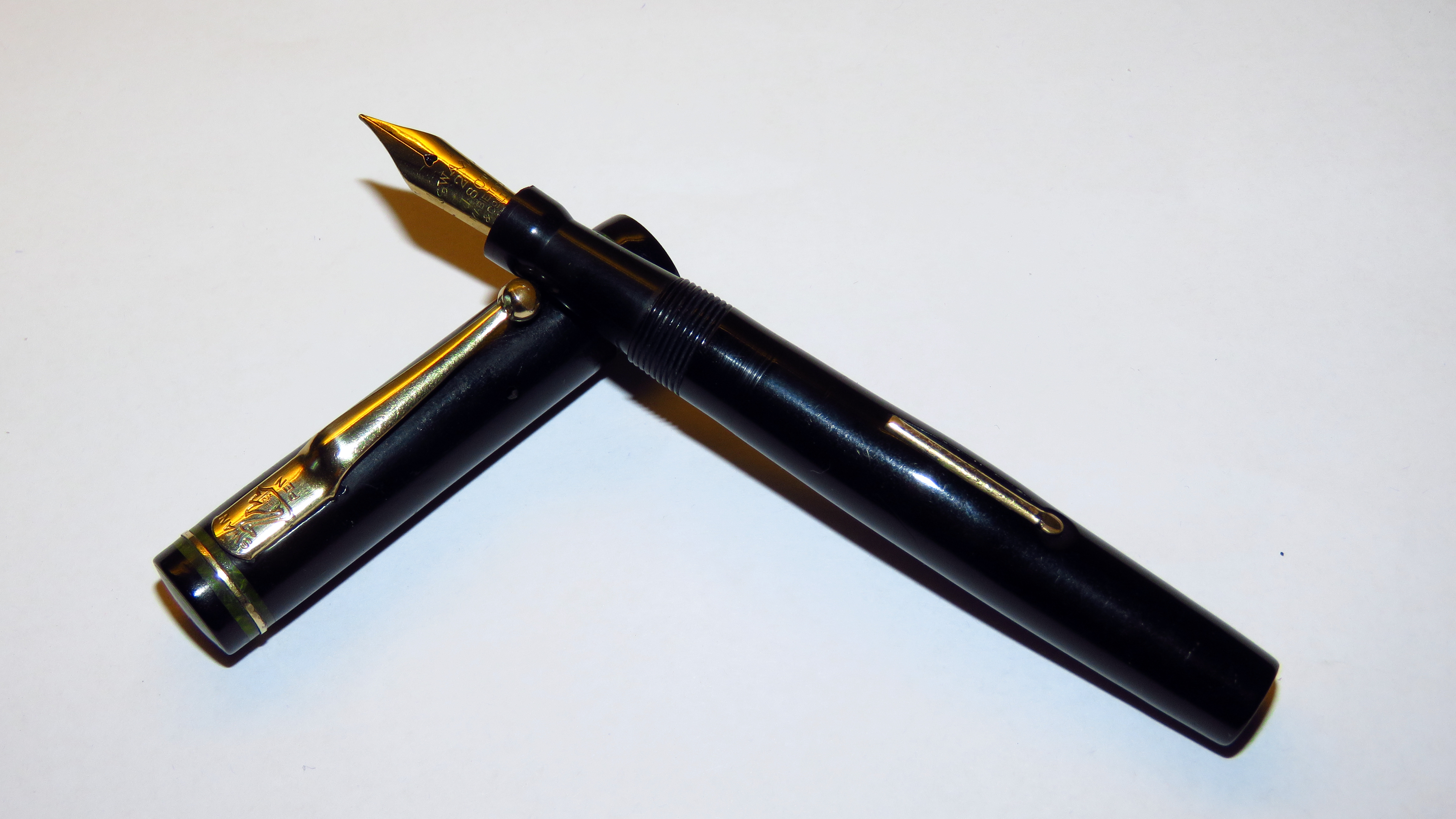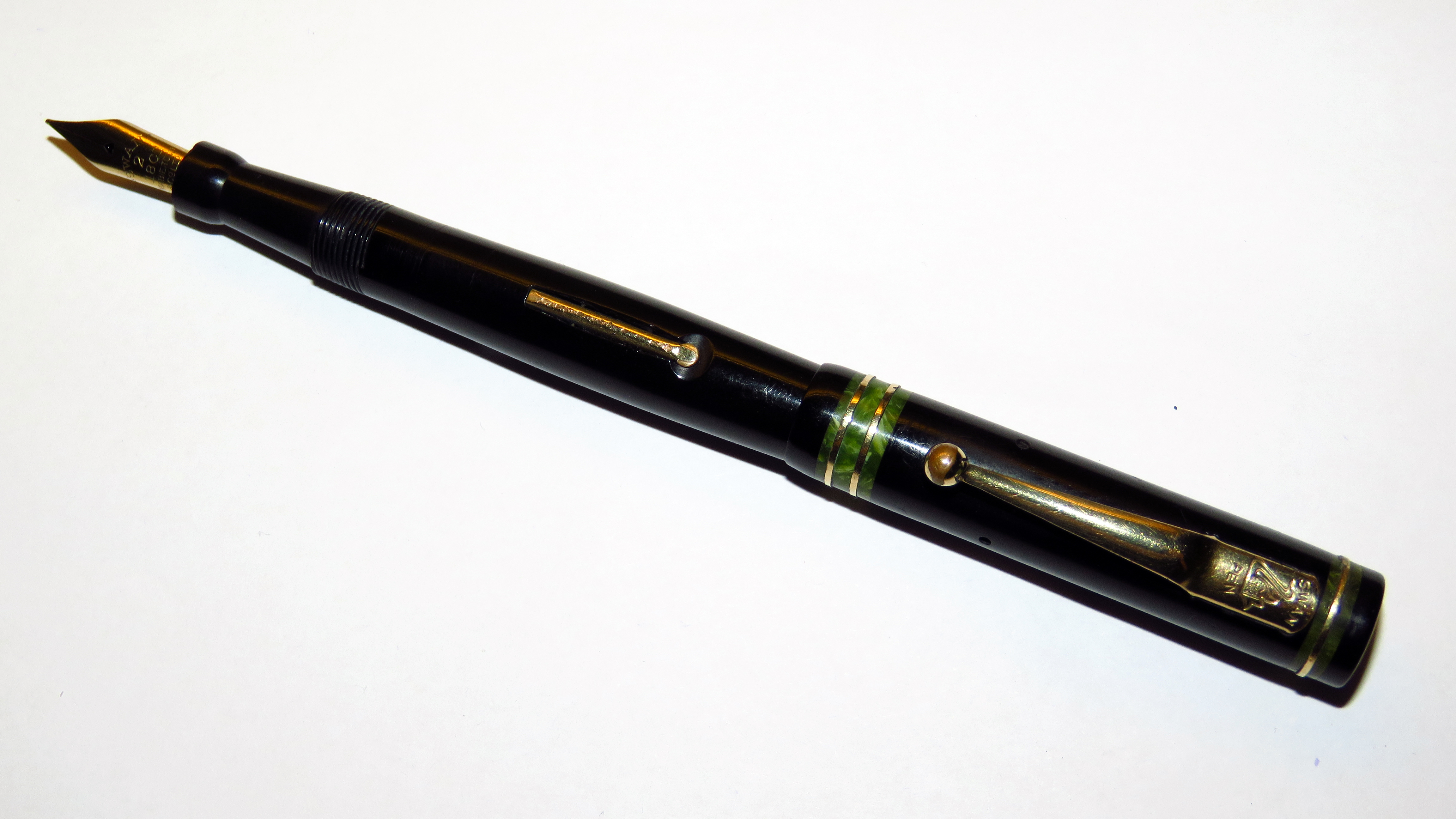 In più monta un pennino in oro a 18Ct in misura 2, cosa estremamente inusuale per la penna made in USA tanto da avermela fatta scambiare erroneamente per una "Swan" No.2B prodotta esclusivamente per il mercato francese con celluloidi di colorazioni e motivi simili ma dotata di leva laterale "a scomparsa" in ebanite nera e di misure leggermente differenti. (E' possibile vederla qui: https://www.fountainpen.it/File:1931-09 ... l-EtAl.jpg) Un ultimo piccolo dubbio che potrebbe rendere impreciso il riconoscimento della penna è la differenza tra il codice 142 e 242. La variazione della prima cifra non sta, per certo, nella misura del pennino: entrambe le serie montavano pennini misura 2.