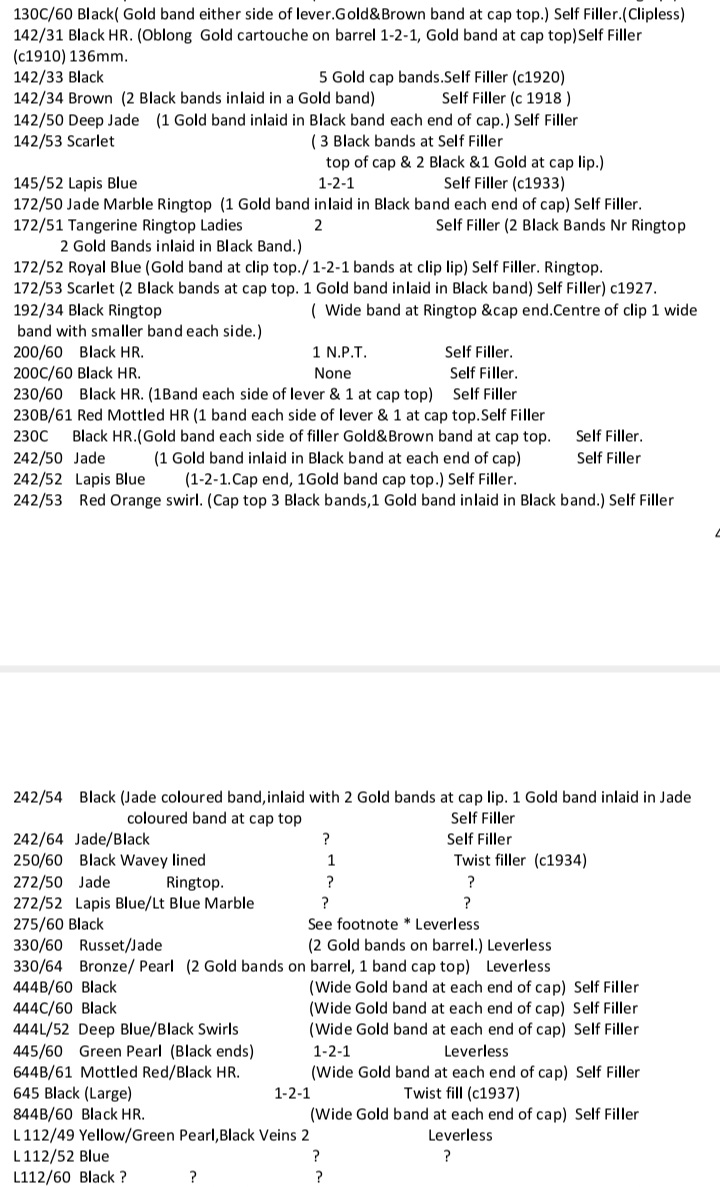 Purtroppo le notizie che ho vengono dalla raccolta di informazioni che arrivano da quei forum e dal materiale che finora ho raccolto. Però non mi è chiaro dove sta il problema del codice, per quanto risulta a me la cifra delle centinaia indica la misura del pennino, e questa mi pare abbia un n.2. Non capisco da dove viene il 142.